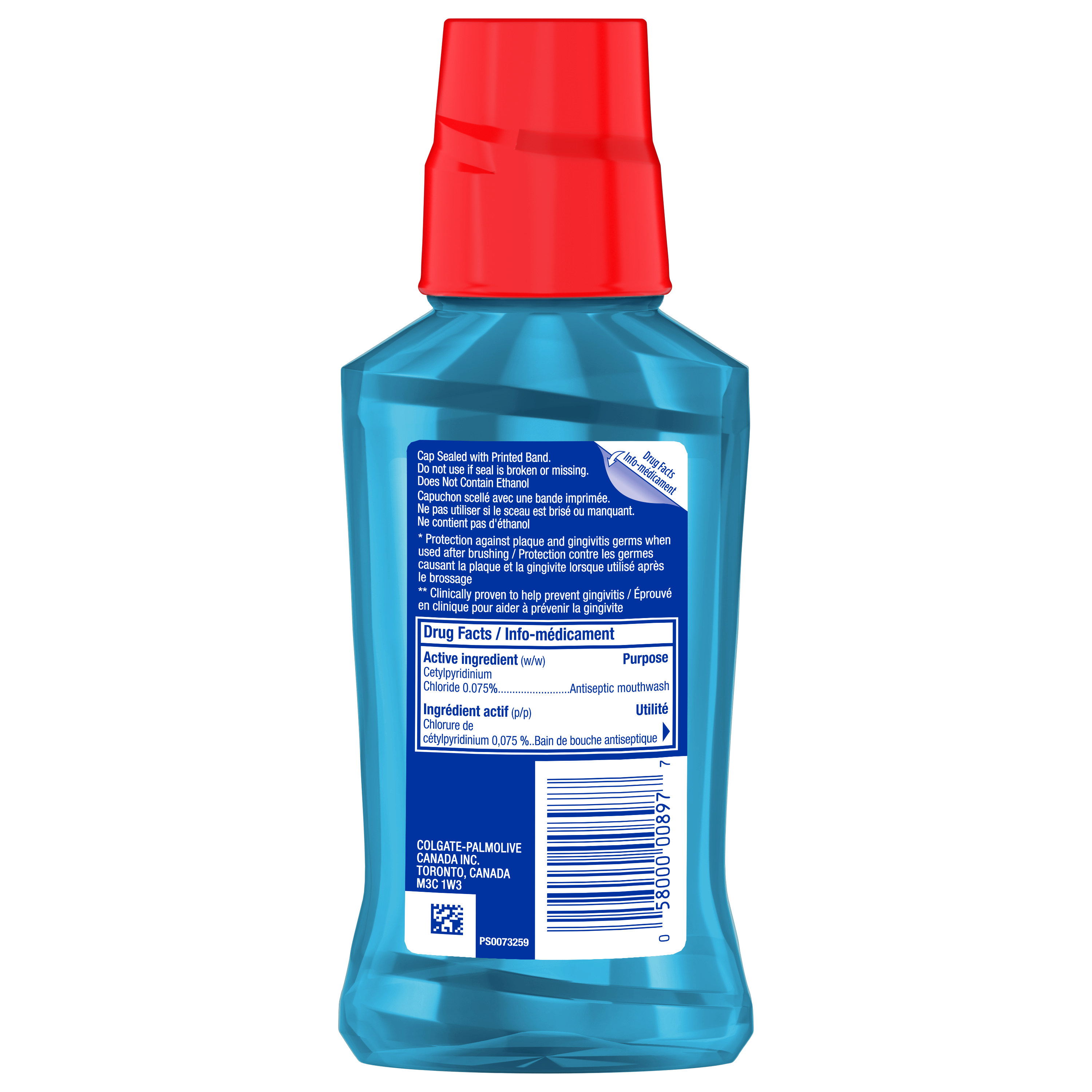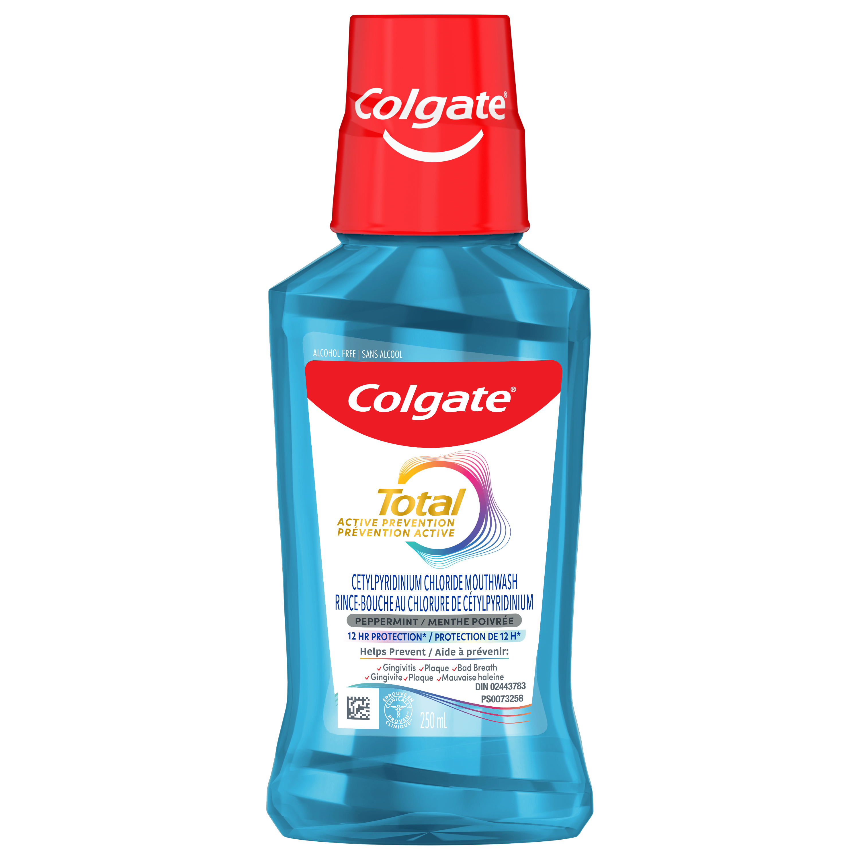 OS Walmart Bullet 1 Includes one (1) 250 mL travel size bottle of Colgate Total Active Prevention Alcohol Free Mouthwash (1), Peppermint OS Walmart Bullet 2 Colgate Total Active Prevention Non Alcohol Mouthwash (1) delivers 12-hour protection against plaque and gingivitis germs when used after brushing OS Walmart Bullet 3 This travel size peppermint flavoured non alcohol mouthwash (1) helps prevent plaque, bad breath, and gingivitis OS Walmart Bullet 4 This Colgate mouthwash contains Cetylpyridinium Chloride (CPC) and fights germs (2) for 12 hours OS Walmart Bullet 5 Colgate Total Active Prevention Alcohol Free Travel Size Mouthwash (1) also contains zinc for added freshness OS Loblaws Product Title Colgate Total Active Prevention Alcohol Free Mouthwash, 250 mL OS Loblaws Product Description Enjoy a healthy smile and fresh breath with Colgate Total Active Prevention Alcohol Free Mouthwash*. This travel size peppermint flavoured non alcohol mouthwash* delivers 12-hour protection against plaque and gingivitis germs when used after brushing. Colgate Total Active Prevention Alcohol Free Travel Size Mouthwash* also contains zinc for added freshness. Plus, this alcohol-free Colgate mouthwash is clinically proven to help prevent gingivitis. Colgate Total Active Prevention Alcohol Free Travel Mouthwash* contains Cetylpyridinium Chloride (CPC). To support your oral health, try this minty CPC mouthwash in combination with Colgate Total toothpaste and the Colgate Total Active Prevention toothbrush. *does not contain ethanol **that cause plaque and/or gingivitis when used after brushing OS Loblaws Bullet 1 Includes one (1) 250 mL travel size bottle of Colgate Total Active Prevention Alcohol Free Mouthwash*, Peppermint OS Loblaws Bullet 2 Colgate Total Active Prevention Non Alcohol Mouthwash* delivers 12-hour protection against plaque and gingivitis germs when used after brushing OS Loblaws Bullet 3 This travel size peppermint flavoured non alcohol mouthwash* helps prevent plaque, bad breath, and gingivitis OS Loblaws Bullet 4 This Colgate mouthwash contains Cetylpyridinium Chloride (CPC) and fights germs** for 12 hours OS Loblaws Bullet 5 Colgate Total Active Prevention Alcohol Free Travel Size Mouthwash* also contains zinc for added freshness