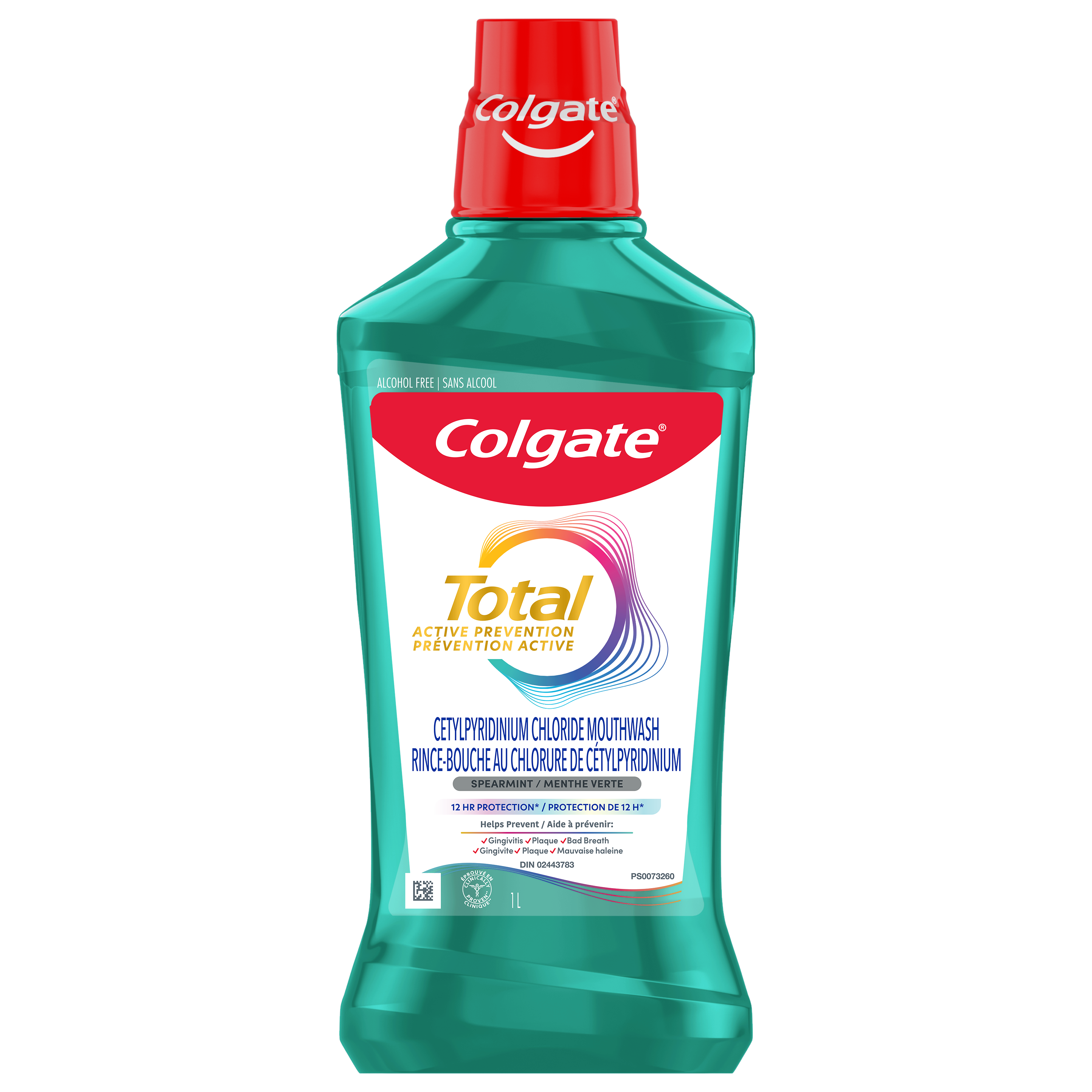 OS Walmart Bullet 1 Includes one (1) 1.0 litre bottle of Colgate Total Alcohol Free Mouthwash, Spearmint OS Walmart Bullet 2 Colgate Total Active Prevention Non Alcohol Mouthwash (1) delivers 12-hour protection against plaque and gingivitis germs when used after brushing OS Walmart Bullet 3 This spearmint flavoured non alcohol mouthwash (1) helps prevent plaque, bad breath, and gingivitis OS Walmart Bullet 4 This Colgate mouthwash contains Cetylpyridinium Chloride (CPC) and fights germs (2) for 12 hours OS Walmart Bullet 5 Colgate Total Active Prevention Alcohol Free Mouthwash (1) also contains zinc for added freshness OS Loblaws Product Title Total Active Prevention Alcohol Free Mouthwash, Spearmint OS Loblaws Product Description Enjoy a healthy smile and fresh breath with Colgate Total Alcohol Free Mouthwash*. This spearmint flavoured non alcohol mouthwash* delivers 12-hour protection against plaque and gingivitis germs when used after brushing. Colgate Total Active Prevention Alcohol Free Mouthwash* also contains zinc for added freshness. Plus, this alcohol-free Colgate mouthwash is clinically proven to help prevent gingivitis. Colgate Total Active Prevention Alcohol Free Mouthwash* contains Cetylpyridinium Chloride (CPC). To support your oral health, try this spearmint flavoured CPC mouthwash in combination with Colgate Total toothpaste and the Colgate Total Active Prevention toothbrush. *does not contain ethanol **that cause plaque and/or gingivitis when used after brushing OS Loblaws Bullet 1 Includes one (1) 1.0 litre bottle of Colgate Total Alcohol Free Mouthwash, Spearmint OS Loblaws Bullet 2 Colgate Total Active Prevention Non Alcohol Mouthwash* delivers 12-hour protection against plaque and gingivitis germs when used after brushing OS Loblaws Bullet 3 This spearmint flavoured non alcohol mouthwash* helps prevent plaque, bad breath, and gingivitis OS Loblaws Bullet 4 This Colgate mouthwash contains Cetylpyridinium Chloride (CPC) and fights germs** for 12 hours OS Loblaws Bullet 5 Colgate Total Active Prevention Alcohol Free Mouthwash* also contains zinc for added freshness