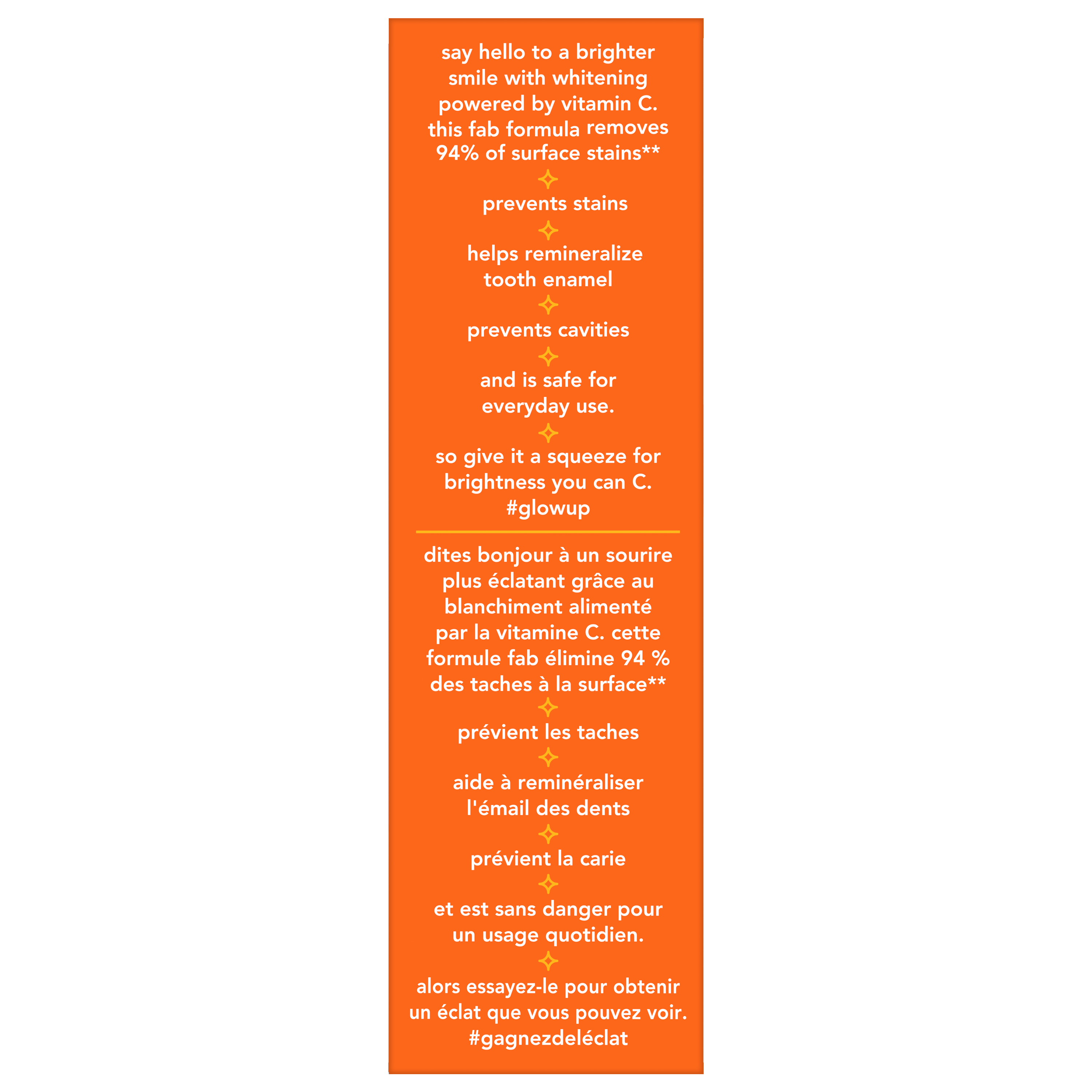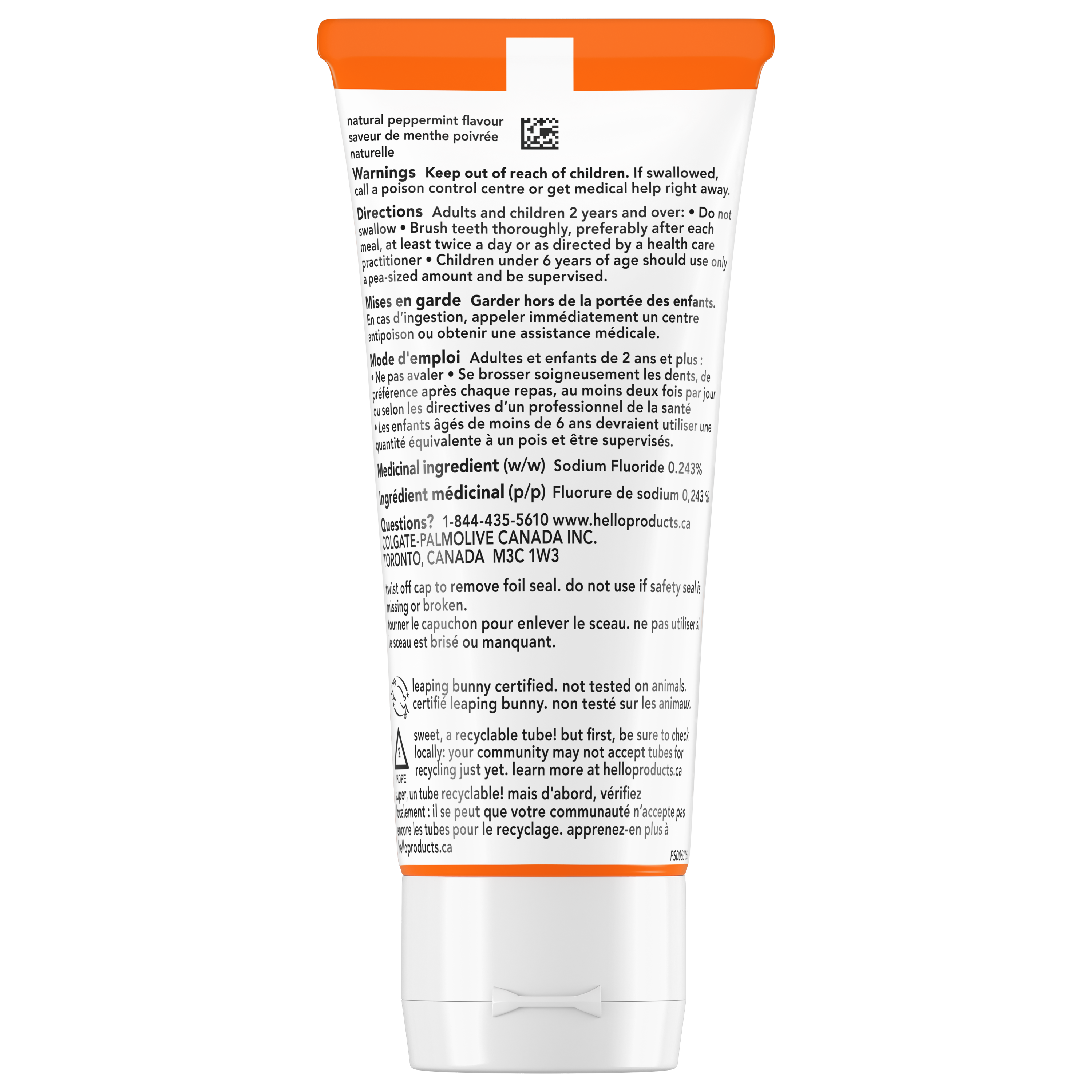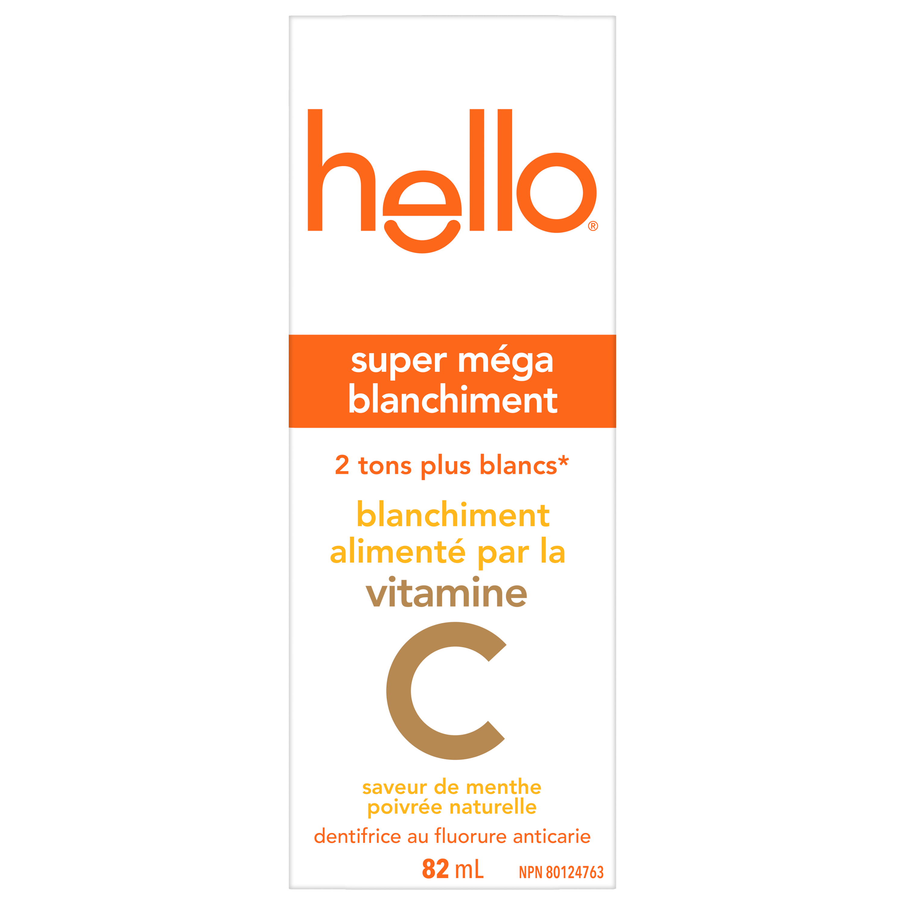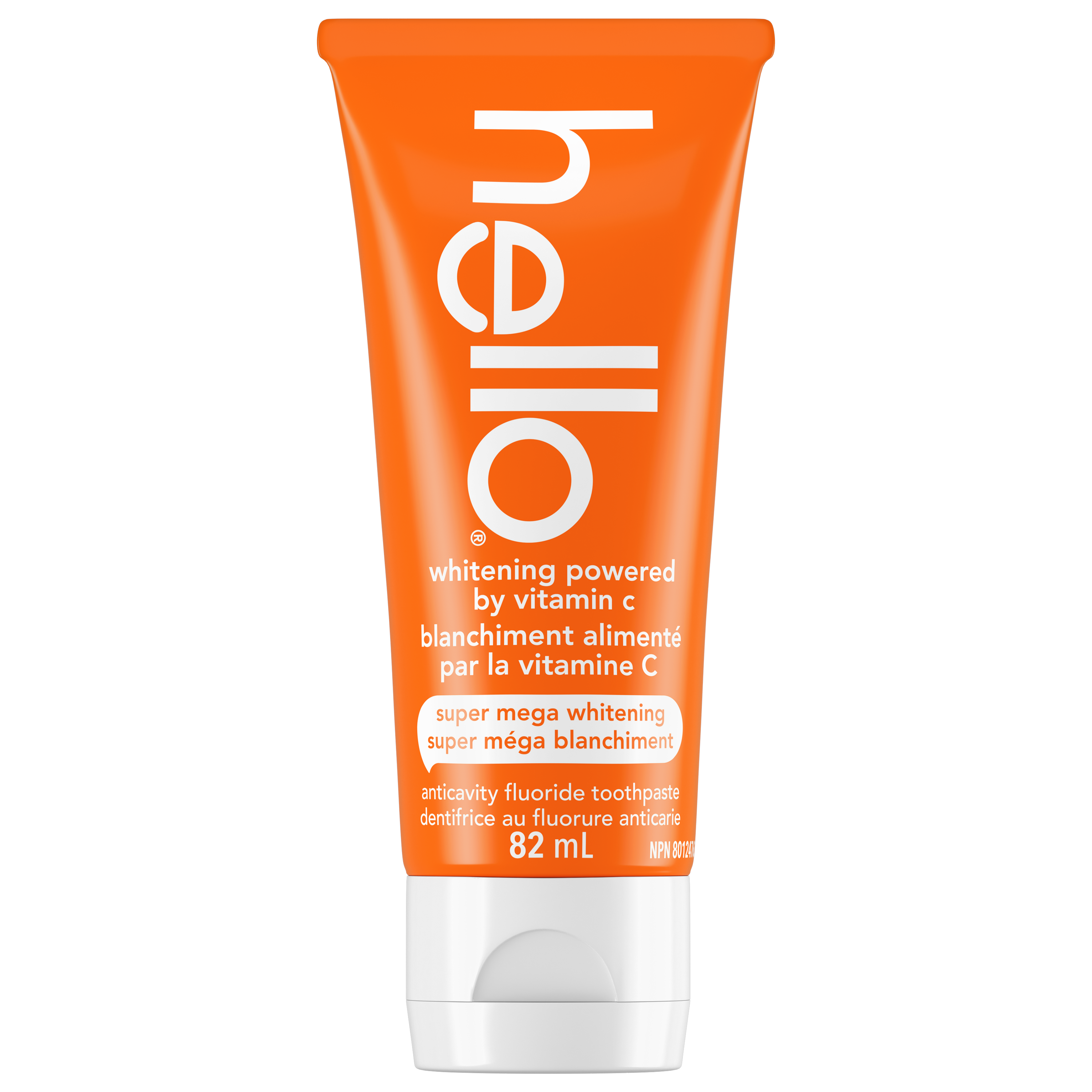 Product Title Hello Super Mega Whitening Toothpaste with Fluoride, Natural Peppermint Flavour, 82 mL Tube SKU 61046824 SKU eCommerce Name Hello Super Mega Whitening Toothpaste with Fluoride, Natural Peppermint Flavour, 82 mL Tube Consumer Unit - GTIN 00827854014201 Case - GTIN 10827854020070 Product Category Oral Care Product Sub Category Toothpaste Brand Hello Product Sub Brand Hello Adult TP Consumer Unit Gross Weight 0.142 KG / 0.313 LB Consumer Unit Net Weight 0.113 KG / 0.249 LB Consumer Unit Length 55.000 MM / 2.165 IN Consumer Unit Width 44.000 MM / 1.732 IN Consumer Unit Height 147.000 MM / 5.787 IN Consumer Unit Volume 0.356 C8 / 0.013 CF Product Title Hello Super Mega Whitening Toothpaste with Fluoride, Natural Peppermint Flavour, 82 mL Tube eCommerce Copy Say hello to a brighter smile and c ya later stains with Hello Super Mega Whitening Toothpaste with Fluoride. This whitening toothpaste for adults has a delightful Peppermint toothpaste flavour and whitens teeth up to 2 shades whiter.* This anticavity fluoride toothpaste is infused with naturally derived Vitamin C**, an alternative to peroxide for whitening teeth, and is safe for everyday use. *in 6 weeks with twice daily use **this toothpaste contains sodium ascorbyl phosphate (vitamin c) eCommerce Copy- Long Description Hello Super Mega Whitening Toothpaste with Fluoride, Natural Peppermint Flavour, 82 mL Tube Say hello to a brighter smile and c ya later stains with Hello Super Mega Whitening Toothpaste with Fluoride. This whitening toothpaste for adults has a delightful Peppermint toothpaste flavour and whitens teeth up to 2 shades whiter.* This anticavity fluoride toothpaste is infused with naturally derived Vitamin C**, an alternative to peroxide for whitening teeth, and is safe for everyday use. Whitening Powered by Vitamin C Experience whitening powered by Vitamin C with Hello Super Mega Whitening Toothpaste. This whitening, mint toothpaste freshens breath with natural peppermint flavour and removes 94% of surface stains*** so you can truly c the sparkle. Use Hello Super Mega Whitening Toothpaste with Fluoride to help remineralize tooth enamel, prevent cavities and stains, and experience 2 shades of whiter teeth.* Your Mouth Says Thank You Hello Super Mega Whitening Toothpaste is an anticavity toothpaste with fluoride that helps prevent cavities. This SLS free toothpaste also contains no peroxide, parabens, preservatives, sugar, artificial sweeteners, artificial flavours, titanium dioxide, gluten, or dyes****. Now that’s a no brainer. Plus, this stain removal whitening toothpaste is vegan, not tested on animals, and comes in a recyclable carton and tube†. C the difference yourself with the Hello Super Mega Whitening Toothpaste. *in 6 weeks with twice daily use **this toothpaste contains sodium ascorbyl phosphate (vitamin c) ***in 3 weeks with twice daily use ****natural annatto pigment provides orange color †check locally: your community may not accept tubes for recycling just yet Keywords (eCommerce) whitening toothpaste, whitening toothpaste for adults, fluoride toothpaste, mint toothpaste, peppermint toothpaste, sls free toothpaste, toothpaste with fluoride, anticavity toothpaste,
