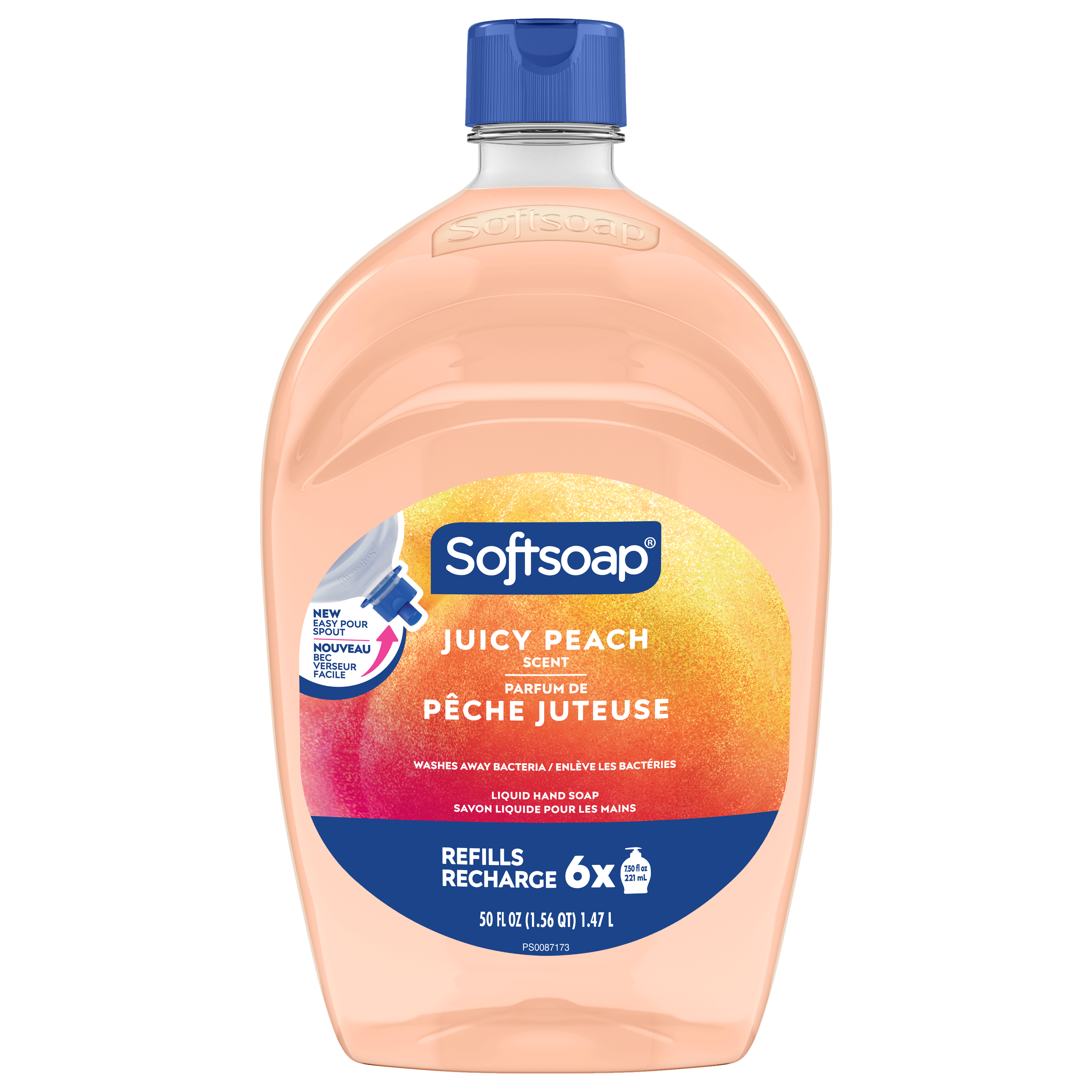 Product Title Softsoap Juicy Peach Scented, Liquid Hand Soap Refill, 1.47L SKU 61047341 SKU eCommerce Name Softsoap Juicy Peach Scented, Liquid Hand Soap Refill, 1.47L Consumer Unit - GTIN 00827854020677 Case - GTIN 10827854020674 Product Category Personal Care Product Sub Category Liquid Hand Wash Brand Softsoap Product Sub Brand Softsoap LHW Consumer Unit Gross Weight 1.574 KG / 3.471 LB Consumer Unit Net Weight 1.508 KG / 3.325 LB Consumer Unit Length 79.000 MM / 3.110 IN Consumer Unit Width 141.000 MM / 5.551 IN Consumer Unit Height 238.000 MM / 9.370 IN Consumer Unit Volume 2.651 C8 / 0.094 CF Product Title Softsoap Juicy Peach Scented, Liquid Hand Soap Refill, 1.47L Walmart Bullet 1 One 50 fl oz refill bottle of Softsoap Juicy Peach Liquid Hand Soap Walmart Bullet 2 Softsoap is the #1 liquid hand soap brand (1) Walmart Bullet 3 Our refill size bottle is perfect for keeping the handwashing experience going, with enough soap to refill six 7.5 fl oz bottles Walmart Bullet 4 Proudly formulated without parabens or phthalates, this dermatologist-tested hand soap is dedicated to safety and care Walmart Bullet 5 Versatile to use in the bathroom or as a kitchen hand soap Walmart Bullet 6 This peach hand soap washes away bacteria so you can confidently clean your hands, aligning with health care recommendations of washing hands with soap and clean running water for 20 seconds Walmart Bullet 7 Retains skin's natural moisture so you can feel good about washing your hands Walmart Bullet 9 Suitable for all ages and all skin types.