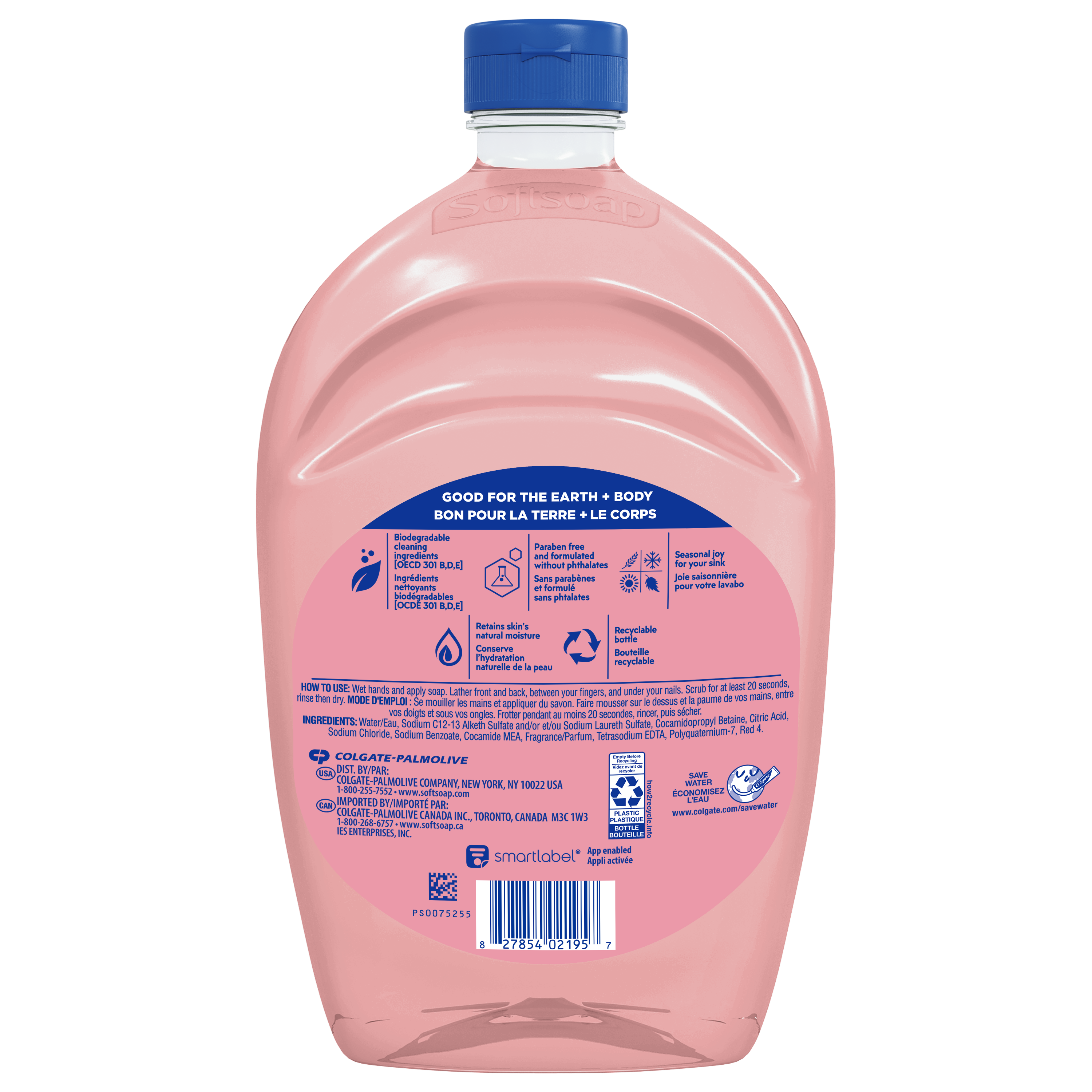 Product Title SS LHS 50F CS SP SPR SUM CHERRY SKU 61048364 SKU eCommerce Name SS LHS 50F CS SP SPR SUM CHERRY Consumer Unit - GTIN 00827854021957 Case - GTIN 10827854021954 Product Category Personal Care Product Sub Category Liquid Hand Wash Brand Softsoap Product Sub Brand Softsoap LHW Consumer Unit Gross Weight 1.577 KG / 3.477 LB Consumer Unit Net Weight 1.511 KG / 3.332 LB Consumer Unit Length 78.000 MM / 3.071 IN Consumer Unit Width 140.000 MM / 5.512 IN Consumer Unit Height 238.000 MM / 9.370 IN Consumer Unit Volume 2.599 C8 / 0.092 CF Product Title SS LHS 50F CS SP SPR SUM CHERRY Product Description Infuse your daily routine with Softsoap’s Limited Edition Cherry Blossom Scented Liquid Hand Soap. Add a touch of fun with this delightful hand soap that sparks joy with every use, turning a simple task into a cheerful moment. Softsoap is Canada's #1 Liquid Hand Soap brand (1), trusted to clean your hands since 1975. Enjoy the refreshing scent of blossoming cherry trees with our seasonal hand soap. Our refill size bottle is perfect for keeping the handwashing experience going, with enough soap to refill six 221 mL bottles. This pink hand soap will transport your senses to a freshly bloomed field or a vibrant bouquet. Our formula is pH balanced, is paraben free, and formulated without phthalates. This hand soap helps retain your skin's natural moisture after every wash. Health care agencies recommend washing hands with soap and clean running water for 20 seconds to wash away dirt and bacteria. Don't miss the chance to make every hand wash a moment of happiness; grab yours while supplies last. (1) Based in part on data reported by Nielsen through its Market Track Service for the Liquid Hand Soap Category for the 52 week period ending 9/28/24, for the All Outlet market. Copyright © 2024 Nielsen. Bullet 1 One 1.47 litre refill bottle of Softsoap Limited Edition Liquid Hand Soap, Cherry Blossom Scent Bullet 2 Softsoap is Canada's #1 Liquid Hand Soap brand (1), trusted to clean your hands since 1975 Bullet 3 Our refill size bottle is perfect for keeping the handwashing experience going, with enough soap to refill six 221 mL bottles Bullet 4 This pink hand soap will transport your senses to a blossoming cherry tree in full bloom, instantly brightening your mood Bullet 5 Versatile to use as a bathroom hand soap, kitchen hand soap, or in any other space that needs a touch of fun Bullet 6 Our formula is pH balanced, is paraben free, and formulated without phthalates OS Amazon Product Title Softsoap Limited Edition Liquid Hand Soap, Seasonal Hand Soap, Paraben Free, pH Balanced, Cherry Blossom Scent, 1.47 Litre Refill Bottle OS Amazon Product Description Infuse your daily routine with Softsoap’s Limited Edition Cherry Blossom Scented Liquid Hand Soap. Add a touch of fun with this delightful hand soap that sparks joy with every use, turning a simple task into a cheerful moment. Softsoap is Canada's #1 Liquid Hand Soap brand (1), trusted to clean your hands since 1975. Enjoy the refreshing scent of blossoming cherry trees with our seasonal hand soap. Our refill size bottle is perfect for keeping the handwashing experience going, with enough soap to refill six 221 mL bottles. This pink hand soap will transport your senses to a freshly bloomed field or a vibrant bouquet. Our formula is pH balanced, is paraben free, and formulated without phthalates. This hand soap helps retain your skin's natural moisture after every wash. Health care agencies recommend washing hands with soap and clean running water for 20 seconds to wash away dirt and bacteria. Don't miss the chance to make every hand wash a moment of happiness; grab yours while supplies last. (1) Based in part on data reported by Nielsen through its Market Track Service for the Liquid Hand Soap Category for the 52 week period ending 9/28/24, for the All Outlet market. Copyright © 2024 Nielsen. OS Amazon Bullet 1 One 1.47 litre refill bottle of Softsoap Limited Edition Liquid Hand Soap, Cherry Blossom Scent OS Amazon Bullet 2 Softsoap is Canada's #1 Liquid Hand Soap brand (1), trusted to clean your hands since 1975 OS Amazon Bullet 3 Our refill size bottle is perfect for keeping the handwashing experience going, with enough soap to refill six 221 mL bottles OS Amazon Bullet 4 This pink hand soap will transport your senses to a blossoming cherry tree in full bloom, instantly brightening your mood OS Amazon Bullet 5 Versatile to use as a bathroom hand soap, kitchen hand soap, or in any other space that needs a touch of fun OS Walmart Product Title Softsoap Limited Edition Liquid Hand Soap, Cherry Blossom, 1.47 Litre Refill OS Walmart Product Description Infuse your daily routine with Softsoap’s Limited Edition Cherry Blossom Scented Liquid Hand Soap. Add a touch of fun with this delightful hand soap that sparks joy with every use, turning a simple task into a cheerful moment. Softsoap is Canada's #1 Liquid Hand Soap brand (1), trusted to clean your hands since 1975. Enjoy the refreshing scent of blossoming cherry trees with our seasonal hand soap. Our refill size bottle is perfect for keeping the handwashing experience going, with enough soap to refill six 221 mL bottles. This pink hand soap will transport your senses to a freshly bloomed field or a vibrant bouquet. Our formula is pH balanced, is paraben free, and formulated without phthalates. This hand soap helps retain your skin's natural moisture after every wash. Health care agencies recommend washing hands with soap and clean running water for 20 seconds to wash away dirt and bacteria. Don't miss the chance to make every hand wash a moment of happiness; grab yours while supplies last. (1) Based in part on data reported by Nielsen through its Market Track Service for the Liquid Hand Soap Category for the 52 week period ending 9/28/24, for the All Outlet market. Copyright © 2024 Nielsen. OS Walmart Bullet 1 One 1.47 litre refill bottle of Softsoap Limited Edition Liquid Hand Soap, Cherry