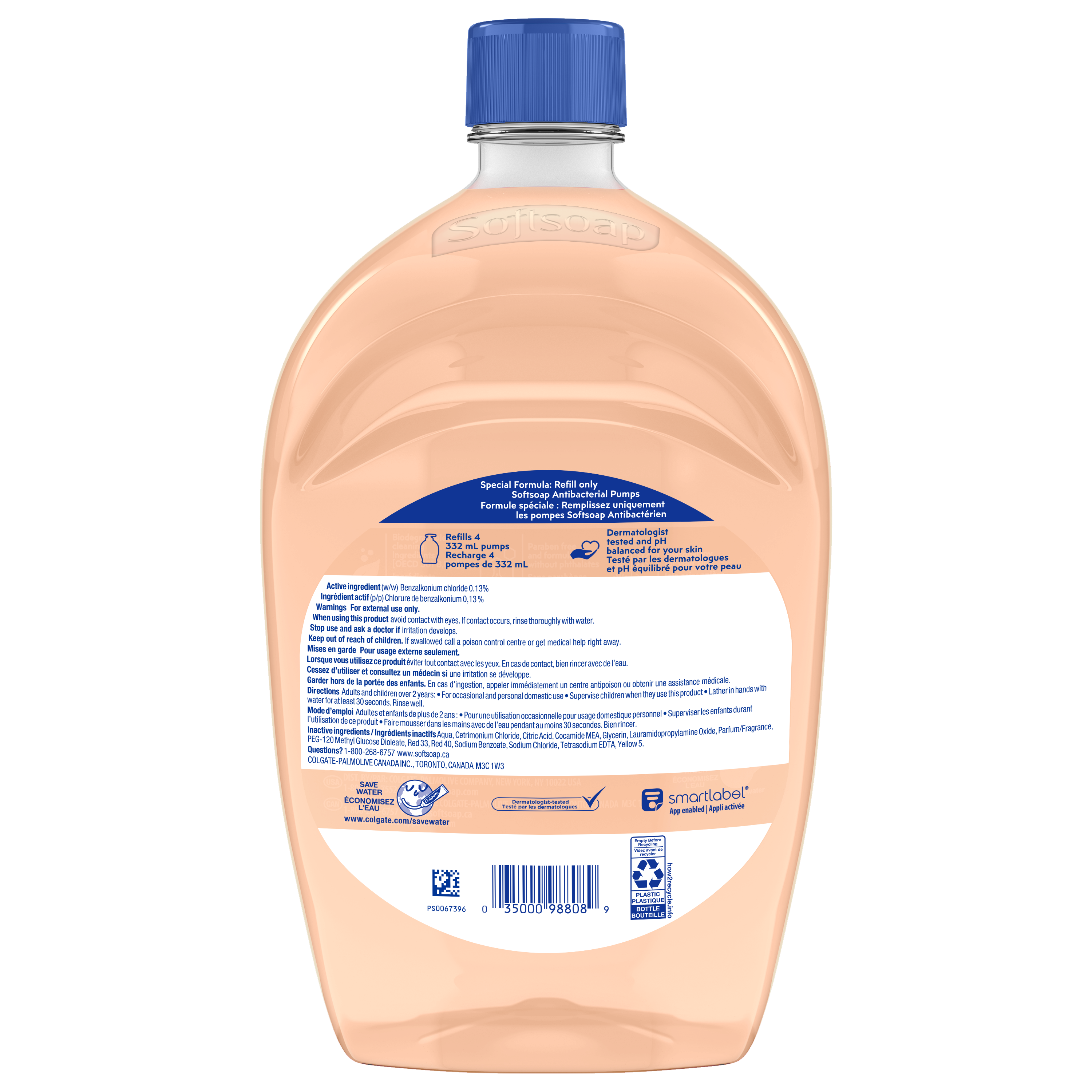 Product Title Softsoap Antibacterial Liquid Hand Soap Refill, Crisp Clean - 1.47 L SKU 61049652 SKU eCommerce Name Softsoap Antibacterial Liquid Hand Soap Refill, Crisp Clean - 1.47 L Consumer Unit - GTIN 00035000988089 Case - GTIN 10827854023019 Product Category Personal Care Product Sub Category Liquid Hand Wash Brand Softsoap Product Sub Brand Softsoap Antibacterial LHW Consumer Unit Gross Weight 1.557 KG / 3.433 LB Consumer Unit Net Weight 1.491 KG / 3.288 LB Consumer Unit Length 78.000 MM / 3.071 IN Consumer Unit Width 140.000 MM / 5.512 IN Consumer Unit Height 238.000 MM / 9.370 IN Consumer Unit Volume 2.599 C8 / 0.092 CF Product Title Softsoap Antibacterial Liquid Hand Soap Refill, Crisp Clean - 1.47 L Product Description Softsoap’s new easy pour spout is designed for a smooth, mess-free refill experience, making it easier than ever to keep your favorite Softsoap Antibacterial Liquid Hand Soap stocked and ready for use. From the #1 liquid hand soap brand (1), comes Softsoap Antibacterial Crisp Clean Liquid Hand Soap which eliminates 99.9% of bacteria (2). With a crisp clean scent, this antibacterial hand soap effectively cleans hands while infusing small moments with joy. Our liquid hand soap is enriched with moisturizers and helps protect skin’s natural barrier by retaining skin’s natural moisture. This special formula leaves skin feeling soft. This fresh kitchen hand soap is paraben free, formulated without phthalates, and dermatologist tested. Feel the joy of clean with Softsoap hand soap! (1) Based in part on data reported by Nielsen through its Market Track Service for the Liquid Hand Soap Category for the 52 week period ending 02/14/25, for the All Outlet market. Copyright © 2025 Nielsen (2) in a handwashing test vs. the following common harmful bacteria: S. aureus & E. coli eCommerce Copy Softsoap Antibacterial Liquid Hand Soap, Crisp Clean is clinically proven to eliminate 99.9% of bacteria (in a handwashing test vs. the following common harmful bacteria: s. Aureus & E. coli). Softsoap is Canada's #1 Liquid Hand Soap brand, trusted to clean your hands since 1975. eCommerce Copy- Long Description Softsoap Antibacterial Liquid Hand Soap, Crisp Clean is clinically proven to eliminate 99.9% of bacteria (in a handwashing test vs. the following common harmful bacteria: s. Aureus & E. coli). Softsoap is Canada's #1 Liquid Hand Soap brand, trusted to clean your hands since 1975. Due to its unique formula, the liquid hand soap pump should only be refilled with Softsoap Antibacterial Liquid Hand Soap. Wash hands with soap and clean running water for 20 seconds. Bullet 1 One 1.47 L refill bottle of Softsoap Antibacterial Crisp Clean Liquid Hand Soap with new easy pour spout Bullet 2 Our trusted formula is designed to eliminate 99.9% of bacteria (2), ensuring your hands are clean Bullet 3 With a crisp clean scent, this antibacterial hand soap effectively cleans hands while infusing small moments with joy Bullet 4 Our hand soap refill is mess free making it versatile to use in the bathroom or as a kitchen hand soap Bullet 5 Our orange hand soap is enriched with moisturizers and helps protect skin’s natural barrier by retaining skin’s natural moisture Bullet 6 This hand soap washes away bacteria so you can confidently clean your hands, aligning with health care recommendations to wash hands with soap and clean running water for 20 seconds Keywords (eCommerce) hand soap, liquid hand soap, antibacterial hand soap, clean hand soap, clean scent hand soap, hand soap that kills germs, gentle hand soap, kitchen hand soap, bathroom hand soap, best hand soap, softsoap, handsoap, hand soap, softsoap hand soap, softsoap antibacterial, softsoap antibacterial hand soap, antibacterial hand soap, crisp clean, softsoap crisp clean, softsoap crisp, softsoap clean, fragrance hand soap, best hand soap, best soap, best smelling hand soap, best fragrance soap, best hand soap to kill germs, best soap for killing germs, AB, soft soap, liquid hand soap OS Amazon Product Title Softsoap Crisp Clean Antibacterial Liquid Hand Soap with New Easy Pour Spout, 1.47 L Refill Bottle OS Amazon Product Description Softsoap’s new easy pour spout is designed for a smooth, mess-free refill experience, making it easier than ever to keep your favorite Softsoap Antibacterial Liquid Hand Soap stocked and ready for use. From the #1 liquid hand soap brand (1), comes Softsoap Antibacterial Crisp Clean Liquid Hand Soap which eliminates 99.9% of bacteria (2). With a crisp clean scent, this antibacterial hand soap effectively cleans hands while infusing small moments with joy. Our liquid hand soap is enriched with moisturizers and helps protect skin’s natural barrier by retaining skin’s natural moisture. This special formula leaves skin feeling soft. This fresh kitchen hand soap is paraben free, formulated without phthalates, and dermatologist tested. Feel the joy of clean with Softsoap hand soap! (1) Based in part on data reported by Nielsen through its Market Track Service for the Liquid Hand Soap Category for the 52 week period ending 02/14/25, for the All Outlet market. Copyright © 2025 Nielsen (2) in a handwashing test vs. the following common harmful bacteria: S. aureus & E. coli OS Amazon Bullet 1 One 1.47 L refill bottle of Softsoap Antibacterial Crisp Clean Liquid Hand Soap with new easy pour spout OS Amazon Bullet 2 Our trusted formula is designed to eliminate 99.9% of bacteria (2), ensuring your hands are clean OS Amazon Bullet 3 With a crisp clean scent, this antibacterial hand soap effectively cleans hands while infusing small moments with joy OS Amazon Bullet 4 Our hand soap refill is mess free making it versatile to use in the bathroom or as a kitchen hand soap OS Amazon Bullet 5 Our orange hand soap is enriched with moisturizers and helps protect skin’s natural barrier by retaining skin’s natural moisture OS Walmart Product Title Softsoap Crisp Clean Antibacterial Liquid Hand Soap, 1.47 L Refill B