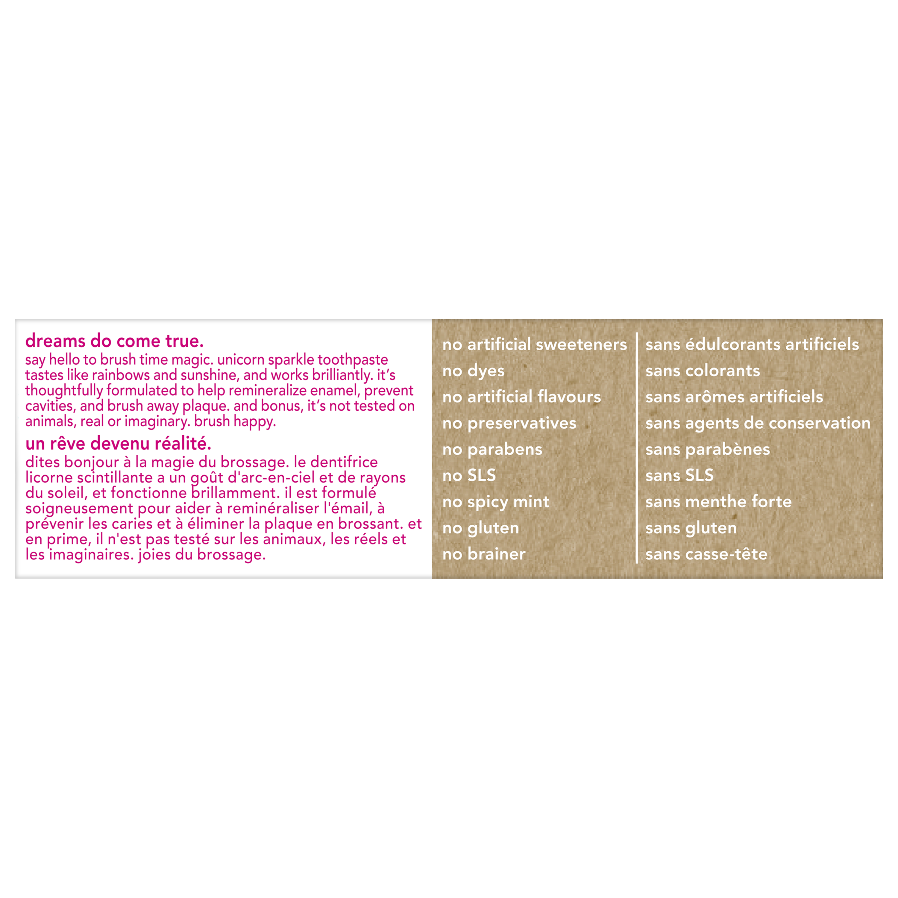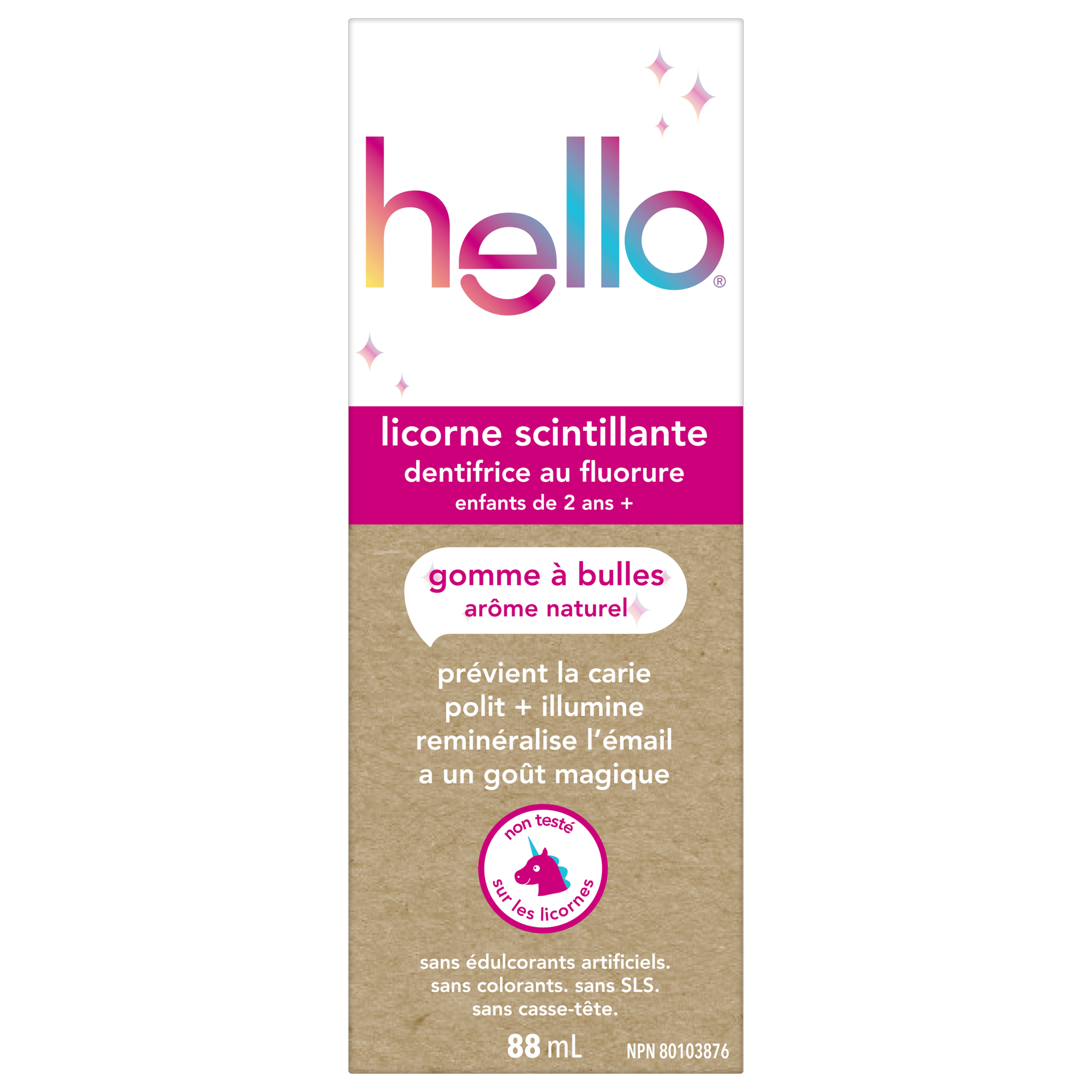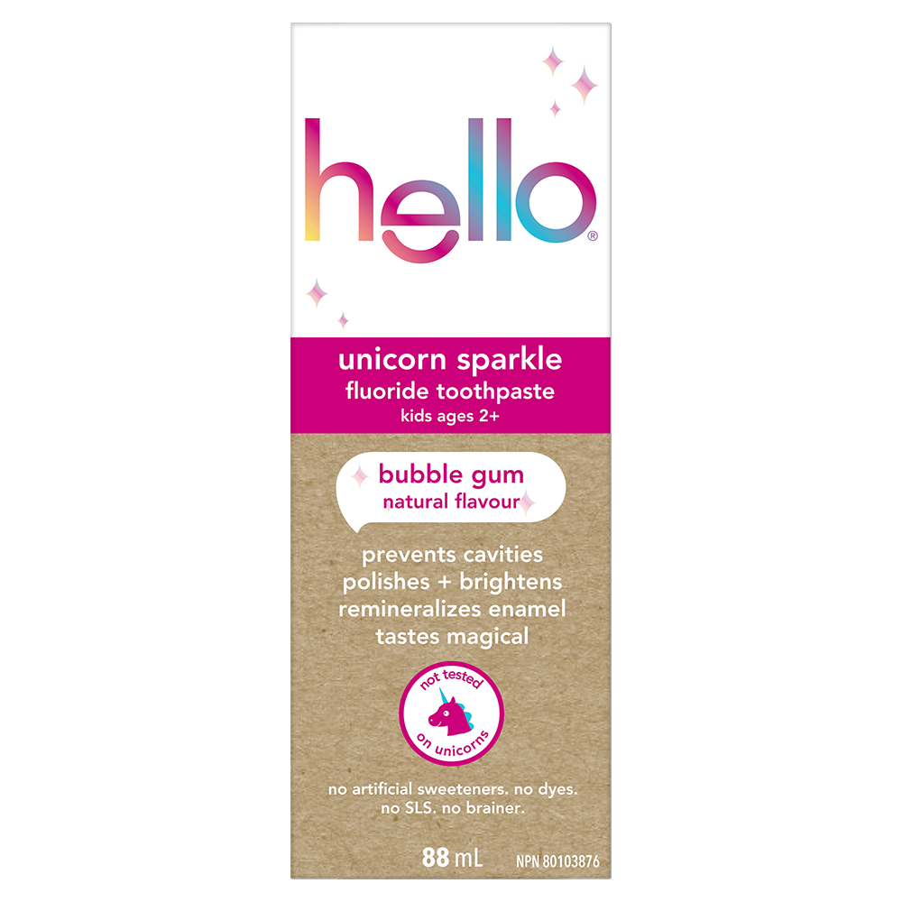 Product Title hello Unicorn Sparkle Kids Toothpaste with Fluoride, Bubble Gum Toothpaste, 88 mL Tube SKU 61050454 SKU eCommerce Name hello Unicorn Sparkle Kids Toothpaste with Fluoride, Bubble Gum Toothpaste, 88 mL Tube Consumer Unit - GTIN 00035000987433 Case - GTIN 10827854023620 Product Category Oral Care Product Sub Category Toothpaste Brand Hello Product Sub Brand Hello Kids TP Consumer Unit Gross Weight 0.113 KG / 0.249 LB Consumer Unit Net Weight 0.113 KG / 0.249 LB Consumer Unit Length 55.000 MM / 2.165 IN Consumer Unit Width 44.000 MM / 1.732 IN Consumer Unit Height 147.000 MM / 5.787 IN Consumer Unit Volume 0.356 C8 / 0.013 CF Product Title hello Unicorn Sparkle Kids Toothpaste with Fluoride, Bubble Gum Toothpaste, 88 mL Tube eCommerce Copy Say hello to brush time magic and celebrate more everyday yay with hello Unicorn Sparkle Kids Toothpaste with Fluoride. This unicorn sparkle children’s toothpaste tastes like rainbows and sparkles and works brilliantly. This kids fluoride toothpaste is safe for kids ages 2 and up and the magical bubble gum toothpaste flavour is a fun way to encourage regular brushing habits at an early age. eCommerce Copy- Long Description Say hello to brush time magic and celebrate more everyday yay with hello Unicorn Sparkle Kids Toothpaste with Fluoride. This unicorn sparkle children’s toothpaste tastes like rainbows and sparkles and works brilliantly. This kids fluoride toothpaste is safe for kids ages 2 and up and the magical bubble gum toothpaste flavour is a fun way to encourage regular brushing habits at an early age. Dreams Do Come True hello Unicorn Sparkle Kids Toothpaste with Fluoride is thoughtfully formulated with natural flavour, sparkles, and high quality sweeteners like xylitol and stevia. This kids toothpaste has a fun bubble gum taste making brushing more enjoyable. And because it’s formulated with fluoride, this children’s toothpaste can also help prevent cavities and strengthen enamel, all while brushing away plaque with brilliance and grace. Help polish and brighten your little ones teeth with hello Unicorn Sparkle Kids Fluoride Toothpaste. K(no)w Your Toothpaste We’re serious about being friendly, and about what goes into little mouths. That means making a kids toothpaste that contains no artificial sweeteners, artificial flavours, preservatives, SLS, parabens, dyes, spicy mint, and that is gluten free. Plus, this children’s toothpaste is not tested on animals, real or imaginary. Choose friendly and brush happy with hello Unicorn Sparkle Kids Toothpaste with Fluoride. Keywords (eCommerce) kids toothpaste, kids toothpaste with fluoride, toothpaste with fluoride, children’s toothpaste, kids fluoride toothpaste, bubble gum toothpaste, kid toothpaste, Children’s toothpaste, unicorn toothpaste,