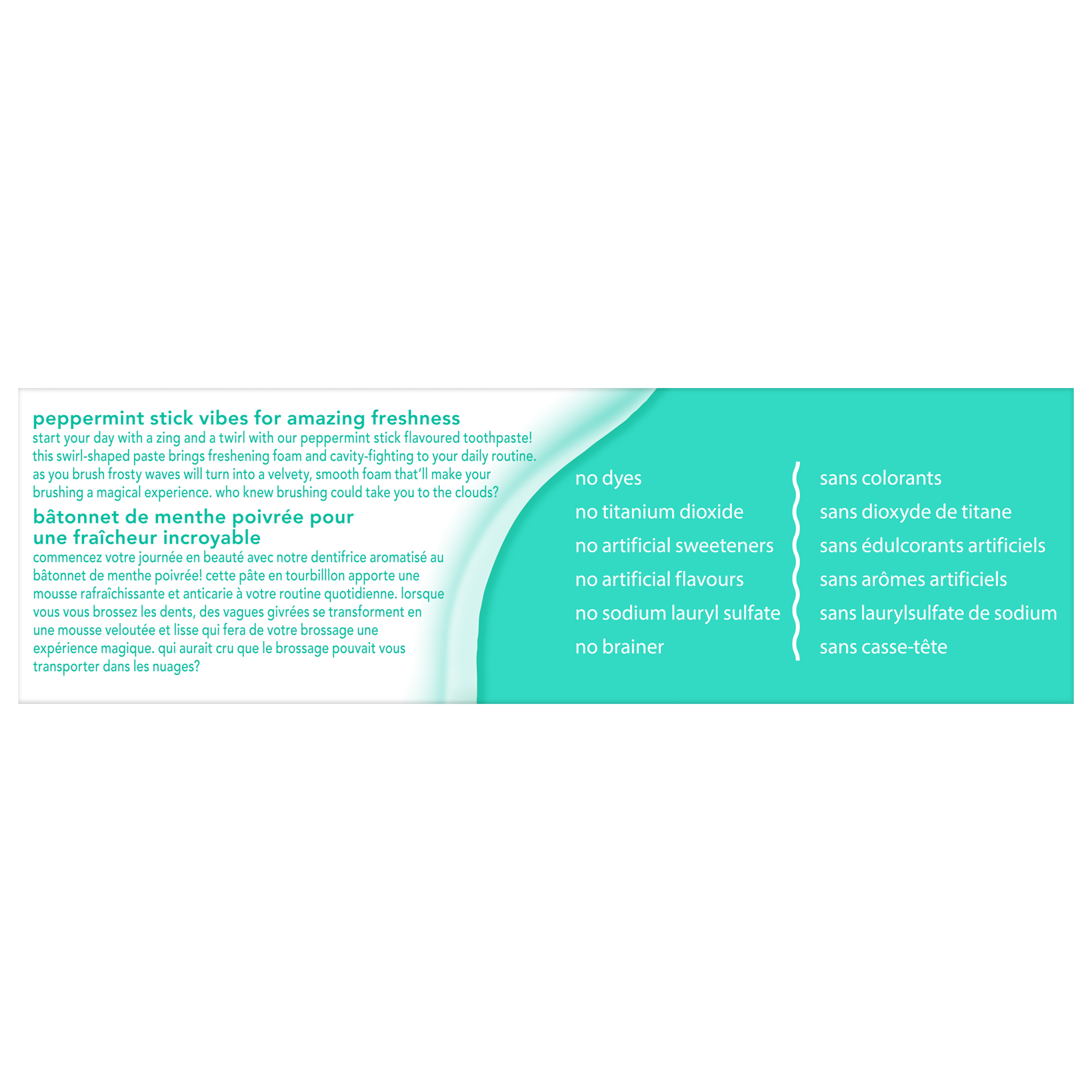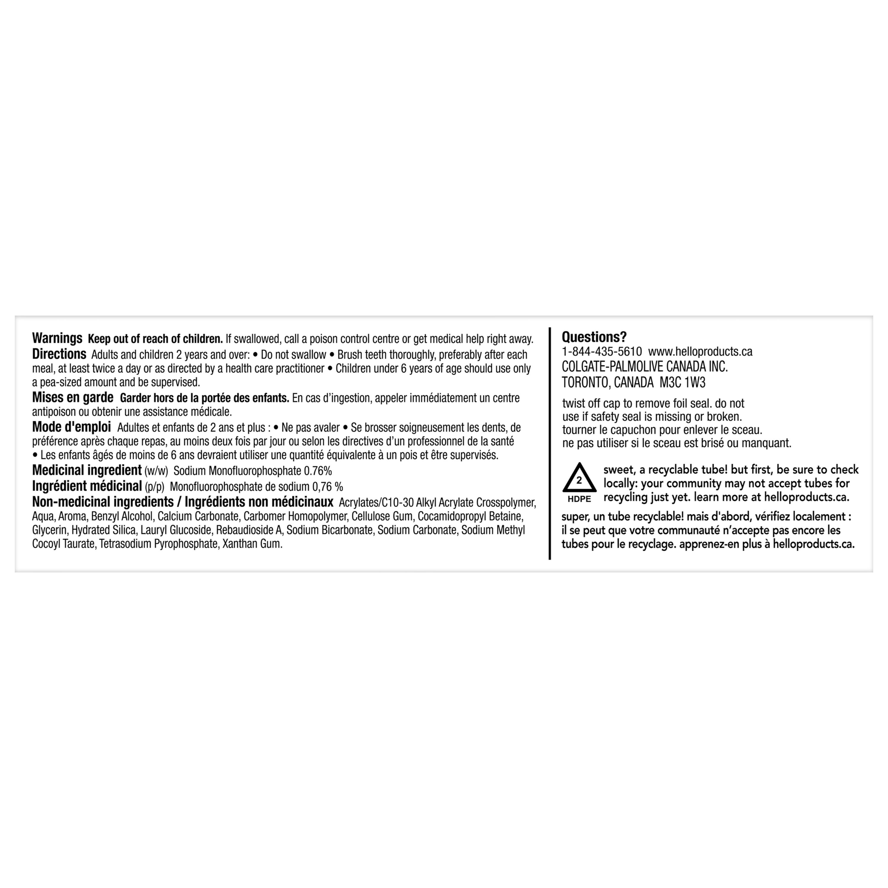 Product Title hello Whipped Fluoride Toothpaste, Minty Foam Toothpaste, Peppermint Stick Flavour, 82 mL SKU 61053377 Consumer Unit - GTIN 00827854026488 Case - GTIN 10827854026485 Product Category Oral Care Product Sub Category Toothpaste Brand hello Product Sub Brand Hello Adult TP Consumer Unit Gross Weight 0.142 KG / 0.313 LB Consumer Unit Net Weight 0.112 KG / 0.247 LB Consumer Unit Length 44.000 MM / 1.732 IN Consumer Unit Width 55.000 MM / 2.165 IN Consumer Unit Height 147.000 MM / 5.787 IN Consumer Unit Volume 0.356 C8 / 0.013 CF Product Title hello Whipped Fluoride Toothpaste, Minty Foam Toothpaste, Peppermint Stick Flavour, 82 mL Product Description Say hello to a dreamy, foamy, cavity-fighting mint toothpaste for adults that will leave your breath feeling on cloud nine with hello Whipped Peppermint Stick Flavour Adult Fluoride Toothpaste. Powered by fast foam technology, this dreamy hello toothpaste with fluoride delivers an amazing foaming texture, freshens breath, and is tough enough on cavities. Start your day with a zing and a twirl with this peppermint stick flavoured foaming toothpaste. With its unique foamy texture and playful, swirly nurdle shape, this foam toothpaste transforms daily brushing from boring to magical in seconds and delivers a lush, foamy experience with delicious peppermint flavour. If that weren’t dreamy enough, this hello mint toothpaste also uses a fluoride formula to prevent cavities. Fight cavities with style using hello Whipped Peppermint Stick Flavour Fluoride Toothpaste. hello Whipped Toothpaste is an SLS free toothpaste with fluoride that contains no dyes, no artificial flavours or sweeteners, no parabens, and no titanium dioxide. Now that’s a no-brainer. Plus, hello Whipped Foam Toothpaste is vegan, not tested on animals, and comes in a recyclable carton and tube.* *Check locally: your community may not accept tubes for recycling just yet. Bullet 1 Includes one (1) 82 mL tube of hello Whipped Peppermint Stick Flavour Adult Fluoride Toothpaste, Foaming Toothpaste Bullet 2 The unique foaming texture and swirly nurdle shape of hello Whipped Foam Toothpaste transforms your brushing from boring to magical Bullet 3 hello Whipped Peppermint Stick Flavour Fluoride Toothpaste for Adults is a dreamy mint toothpaste that’s tough enough on cavities Bullet 4 This hello fluoride toothpaste is more than just a minty thrill, it’s an out-of-this-world experience for your mouth and it freshens breath Bullet 5 This Peppermint Stick flavoured hello fluoride toothpaste contains no artificial flavours or sweeteners, SLS, titanium dioxide, parabens, or dyes Bullet 6 The hello peppermint toothpaste is a lush, foamy experience in a delish flavour that will have your breath feeling on cloud nine OS Amazon Product Title hello Whipped Peppermint Stick Flavour Fluoride Toothpaste, Minty Foam Toothpaste, SLS Free, Freshens Breath, Dreamy and Foamy Texture, Fights Cavities with Fluoride, 82 ml Tube OS Amazon Product Description Say hello to a dreamy, foamy, cavity-fighting mint toothpaste for adults that will leave your breath feeling on cloud nine with hello Whipped Peppermint Stick Flavour Adult Fluoride Toothpaste. Powered by fast foam technology, this dreamy hello toothpaste with fluoride delivers an amazing foaming texture, freshens breath, and is tough enough on cavities. Start your day with a zing and a twirl with this peppermint stick flavoured foaming toothpaste. With its unique foamy texture and playful, swirly nurdle shape, this foam toothpaste transforms daily brushing from boring to magical in seconds and delivers a lush, foamy experience with delicious peppermint flavour. If that weren’t dreamy enough, this hello mint toothpaste also uses a fluoride formula to prevent cavities. Fight cavities with style using hello Whipped Peppermint Stick Flavour Fluoride Toothpaste. hello Whipped Toothpaste is an SLS free toothpaste with fluoride that contains no dyes, no artificial flavours or sweeteners, no parabens, and no titanium dioxide. Now that’s a no-brainer. Plus, hello Whipped Foam Toothpaste is vegan, not tested on animals, and comes in a recyclable carton and tube.* *Check locally: your community may not accept tubes for recycling just yet. OS Amazon Bullet 1 WHAT’S INCLUDED: One (1) 82 mL tube of hello Whipped Peppermint Stick Flavour Fluoride Toothpaste, Foaming Toothpaste OS Amazon Bullet 2 FOAMY AND DREAMY: The unique foaming texture and swirly nurdle shape of hello Whipped Foam Toothpaste transforms your brushing from boring to magical OS Amazon Bullet 3 FIGHTS CAVITIES: hello Whipped Peppermint Stick Flavour Fluoride Toothpaste for Adults is a dreamy mint toothpaste that’s tough enough on cavities OS Amazon Bullet 4 AMAZING FLAVOR: This hello fluoride toothpaste is more than just a minty thrill, it’s an out-of-this-world experience for your mouth and it freshens breath OS Amazon Bullet 5 NO-BRAINER: This Peppermint Stick flavoured hello fluoride toothpaste contains no artificial flavours or sweeteners, SLS, titanium dioxide, parabens, or dyes OS Walmart Product Title hello Whipped Fluoride Toothpaste, Peppermint Stick, 82 mL OS Walmart Product Description Say hello to a dreamy, foamy, cavity-fighting mint toothpaste for adults that will leave your breath feeling on cloud nine with hello Whipped Peppermint Stick Flavour Adult Fluoride Toothpaste. Powered by fast foam technology, this dreamy hello toothpaste with fluoride delivers an amazing foaming texture, freshens breath, and is tough enough on cavities. Start your day with a zing and a twirl with this peppermint stick flavoured foaming toothpaste. With its unique foamy texture and playful, swirly nurdle shape, this foam toothpaste transforms daily brushing from boring to magical in seconds and delivers a lush, foamy experience with delicious peppermint flavour. If that weren’t dreamy enough, this hello mint toothpaste also uses a fluoride formula to prevent cavities. Fight cavities wit