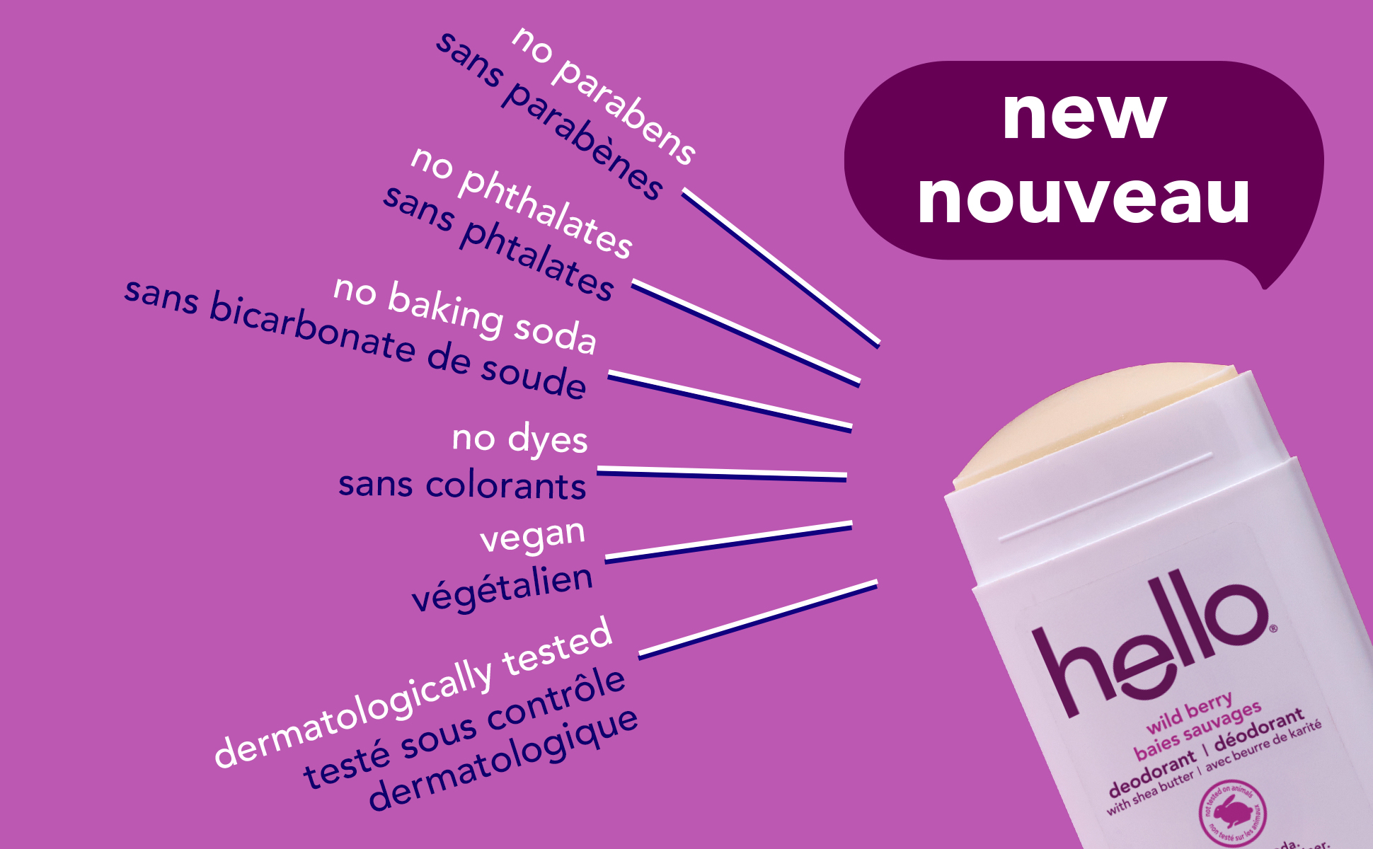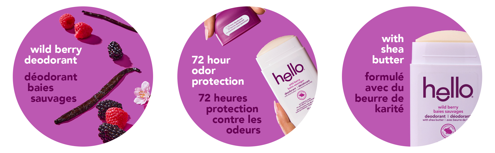 Product Title hello Wild Berry Aluminum Free Deodorant for Women and Men, 72-Hour Deodorant, Baking Soda Free, Enriched with Shea Butter, Vegan, 73 g Stick Deodorant SKU 61053588 SKU eCommerce Name Hello Wild Berry Deodorant Consumer Unit - GTIN 00827854026921 Case - GTIN 10827854026928 Product Category Personal Care Product Sub Category AP > Deo Brand hello Product Sub Brand Hello AP/Deo Consumer Unit Gross Weight 0.114 KG / 0.251 LB Consumer Unit Net Weight 0.073 KG / 0.161 LB Consumer Unit Length 30.000 MM / 1.181 IN Consumer Unit Width 58.000 MM / 2.283 IN Consumer Unit Height 125.000 MM / 4.921 IN Consumer Unit Volume 0.218 C8 / 0.008 CF Product Title hello Wild Berry Aluminum Free Deodorant for Women and Men, 72-Hour Deodorant, Baking Soda Free, Enriched with Shea Butter, Vegan, 73 g Stick Deodorant Product Description Say hello to hello Wild Berry Aluminum Free Deodorant. Stay fresh all day (and then some) with this 72-hour deodorant. Made without aluminum, parabens, phthalates, dyes, or baking soda, now that’s a no-brainer. This deodorant stick delivers an amazing scent that lasts and makes every day a little bit bolder. It blends juicy raspberry, bright mandarin, soft cherry blossom, and creamy vanilla, for a fragrance that will leave you smelling your berry best. All of our deodorants are dermatologically tested, vegan, and not tested on animals. Goodbye staining. Our deos glide easily providing even coverage. Plus, we packed it with shea butter, so your skin gets a little extra love every time you swipe. Perfect for everyday use—men, women, and teen-friendly (younger kids, ask an adult first). hello Wild Berry Aluminum Free Deodorant is bold, irresistible, and just the right amount of extra—kind of like you. eCommerce Copy- Long Description Say hello to hello Wild Berry Aluminum Free Deodorant. Stay fresh all day (and then some) with this 72-hour deodorant. Made with only 9 ingredients and no aluminum, parabens, phthalates, dyes, or baking soda, now that’s a no-brainer. This deodorant stick delivers an amazing scent that lasts and makes every day a little bit bolder. It blends juicy raspberry, bright mandarin, soft cherry blossom, and creamy vanilla, for a fragrance that will leave you smelling your berry best. All of our deodorants are dermatologically tested, vegan, and not tested on animals. Goodbye staining. Our deos glide easily providing even coverage. Plus, we packed it with shea butter, so your skin gets a little extra love every time you swipe. Perfect for everyday use—men, women, and teen-friendly (younger kids, ask an adult first). hello Wild Berry Aluminum Free Deodorant is bold, irresistible, and just the right amount of extra—kind of like you. Bullet 1 Includes one 73 g stick of hello Wild Berry Aluminum Free Deodorant for women and men Bullet 2 Made without aluminum, parabens, phthalates, dyes, or baking soda, now that’s a no-brainer Bullet 3 Stay fresh for up to 3 days—this shea butter deodorant keeps you confidently smelling great, so you can go wild Bullet 4 Juicy raspberry and mandarin with cherry blossom, peach nectar, and creamy vanilla-musk—for a fragrance that leaves you smelling your berry best Bullet 5 Dermatologically tested for peace of mind and picky-skin approved—vegan and not tested on animals Bullet 6 Perfect for everyday use—men, women, and teen-friendly (younger kids, ask an adult first) Keywords (eCommerce) deodorant for men, natural deodorant, deodorant, deodorant, deodorants, underarm deodorant for women, vegan deodorant, deo, wild berry deodorant, aluminum free deodorant OS Amazon Product Title hello Wild Berry Aluminum Free Deodorant for Women and Men, 72-Hour Deodorant, Baking Soda Free, 73 g Stick Deodorant OS Amazon Product Description Say hello to hello Wild Berry Aluminum Free Deodorant. Stay fresh all day (and then some) with this 72-hour deodorant. Made without aluminum, parabens, phthalates, dyes, or baking soda, now that’s a no-brainer. This deodorant stick delivers an amazing scent that lasts and makes every day a little bit bolder. It blends juicy raspberry, bright mandarin, soft cherry blossom, and creamy vanilla, for a fragrance that will leave you smelling your berry best. All of our deodorants are dermatologically tested, vegan, and not tested on animals. Goodbye staining. Our deos glide easily providing even coverage. Plus, we packed it with shea butter, so your skin gets a little extra love every time you swipe. Perfect for everyday use—men, women, and teen-friendly (younger kids, ask an adult first). hello Wild Berry Aluminum Free Deodorant is bold, irresistible, and just the right amount of extra—kind of like you. OS Amazon Bullet 1 WHAT'S INCLUDED: One 73 g stick of hello Wild Berry Aluminum Free Deodorant for women and men OS Amazon Bullet 2 SIMPLE FORMULA: Made without aluminum, parabens, phthalates, dyes, or baking soda, now that's a no-brainer OS Amazon Bullet 3 72-HOUR DEO: Stay fresh for up to 3 days—this shea butter deodorant keeps you confidently smelling great OS Amazon Bullet 4 SCENTS TO LOVE: Juicy raspberry and bright mandarin open this scent, followed by a heart of soft cherry blossom and peach nectar, all wrapped in a creamy base of vanilla and smooth musk—for a fragrance that leaves you smelling your berry best OS Amazon Bullet 5 DERM TESTED: Dermatologically tested for peace of mind and picky-skin approved—vegan and not tested on animals OS Walmart Product Title hello Wild Berry Aluminum Free Deodorant, Shea Butter, Vegan, 73 g Stick OS Walmart Product Description Say hello to hello Wild Berry Aluminum Free Deodorant. Stay fresh all day (and then some) with this 72-hour deodorant. Made without aluminum, parabens, phthalates, dyes, or baking soda, now that’s a no-brainer. This deodorant stick delivers an amazing scent that lasts and makes every day a little bit bolder. It blends juicy raspberry, bright mandarin, soft cherry blossom, and creamy vanilla, for a fragrance t