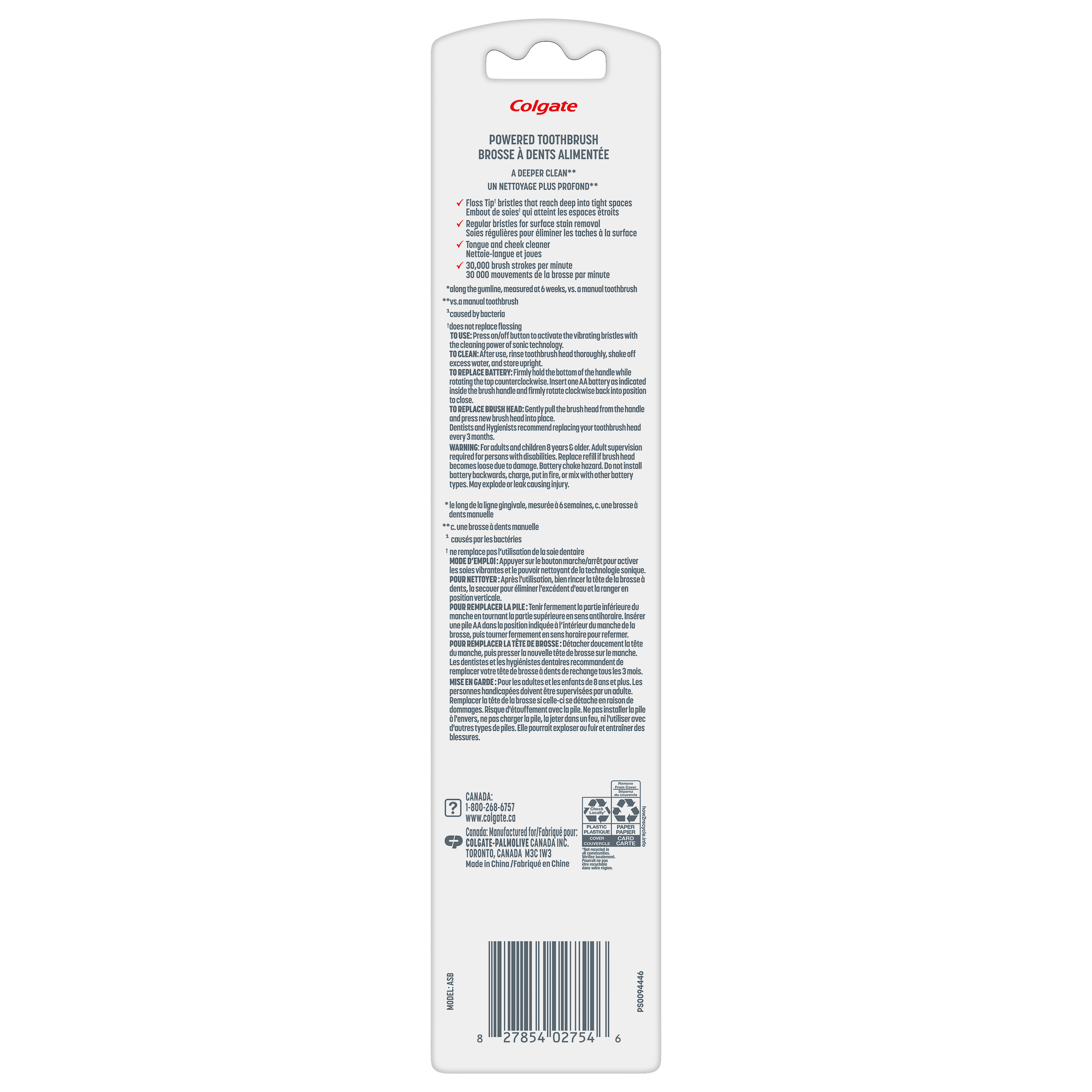 Product Title Colgate Total Adult Sonic Battery Toothbrush, Medium SKU 61054132 SKU eCommerce Name Colgate Total Adult Sonic Battery Toothbrush, Medium Consumer Unit - GTIN 00827854027546 Case - GTIN 10827854027543 Product Category Oral Care Product Sub Category Battery TB Brand Colgate Product Sub Brand Colgate 360 ASB BTB Consumer Unit Gross Weight 0.088 KG / 0.194 LB Consumer Unit Net Weight 0.072 KG / 0.159 LB Consumer Unit Length 30.000 MM / 1.181 IN Consumer Unit Width 54.000 MM / 2.126 IN Consumer Unit Height 247.000 MM / 9.724 IN Consumer Unit Volume 0.400 C8 / 0.014 CF Product Title Colgate Total Adult Sonic Battery Toothbrush, Medium Product Description Take control of your oral health using the Colgate Total Medium Bristled Adult Battery Toothbrush. This adult sonic toothbrush fights the root cause* of cavities, plaque, gingivitis, bad breath, tartar buildup**, stains,*** and delivers 100% more plaque removal. (1) The Colgate Total Adult Battery Powered Toothbrush features Medium Floss-Tip bristles (2) and regular medium toothbrush bristles that reach deep into tight spaces and help with surface stain removal. With a touch of a button, unleash the power of 30,000 brush strokes per minute with this adult battery powered toothbrush. Experience 25x more brush strokes per minute as they work to deliver a deeper clean (3) that targets the root cause* of oral health problems like gingivitis and cavities. One AA battery is included. In addition to helping tackle the root cause* of oral health problems like gingivitis and cavities, the sonic powered medium bristle toothbrush also includes a tongue and cheek cleaner. Start your journey to a confident smile using the Colgate Total Adult Battery Toothbrush. *caused by bacteria **fights tartar buildup by removing plaque ***by removing surface stains (1) along the gumline, measured at 6 weeks vs. a manual toothbrush (2) does not replace flossing (3) vs. a manual toothbrush eCommerce Copy Take control of your oral health using the Colgate Total Medium Bristled Adult Battery Toothbrush. This adult sonic toothbrush fights the root cause* of cavities, plaque, gingivitis, bad breath, tartar buildup**, stains,*** and delivers 100% more plaque removal. (1) 30,000 Brush Strokes Per Minute The Colgate Total Adult Battery Powered Toothbrush features medium Floss-Tip bristles (2) and regular medium toothbrush bristles that reach deep into tight spaces and help with surface stain removal. With a touch of a button, unleash the power of 30,000 brush strokes per minute with this adult battery powered toothbrush. Experience 25x more brush strokes per minute as they work to deliver a deeper clean (3) that targets the root cause* of oral health problems like gingivitis and cavities. One AA battery is included. A Confident Smile In addition to helping tackle the root cause* of oral health problems like gingivitis and cavities, the sonic powered medium bristle toothbrush also includes a tongue and cheek cleaner. Start your journey to a confident smile using the Colgate Total Adult Battery Toothbrush. *caused by bacteria **fights tartar buildup by removing plaque ***by removing surface stains (1) along the gumline, measured at 6 weeks vs. a manual toothbrush (2) does not replace flossing (3) vs. a manual toothbrush Bullet 1 Includes one (1) Colgate Total Adult Sonic Battery Toothbrush with Medium Toothbrush Bristles Bullet 2 This Colgate Total Battery Toothbrush delivers 100% more plaque removal along the gumline (1) Bullet 3 The sonic technology of this battery operated toothbrush enables 25X more brush strokes per minute (3) Bullet 4 This sonic toothbrush is expertly designed with Medium Floss-Tip bristles (2) that work to deliver a deeper clean (3) Bullet 5 Unleash the cleaning power of 30,000 brush strokes per minute with the Colgate Total Battery Operated Toothbrush Bullet 6 In addition to tackling the root cause* of oral health problems like gingivitis and cavities, this medium bristle toothbrush also includes a tongue and cheek cleaner OS Amazon Product Title Colgate Total Adult Sonic Battery Toothbrush, Medium Bristled Battery Toothbrush for Adults, Fights Cavities, Plaque, Gingivitis, Bad Breath, Stains, and More, 30,000 Brush Strokers Per Minute, 1 Pack OS Amazon Product Description Take control of your oral health using the Colgate Total Medium Bristled Adult Battery Toothbrush. This adult sonic toothbrush fights the root cause* of cavities, plaque, gingivitis, bad breath, tartar buildup**, stains,*** and delivers 100% more plaque removal. (1) The Colgate Total Adult Battery Powered Toothbrush features Medium Floss-Tip bristles (2) and regular medium toothbrush bristles that reach deep into tight spaces and help with surface stain removal. With a touch of a button, unleash the power of 30,000 brush strokes per minute with this adult battery powered toothbrush. Experience 25x more brush strokes per minute as they deliver a deeper clean (3) that targets the root cause* of oral health problems like gingivitis and cavities. One AA battery is included. In addition to helping tackle the root cause* of oral health problems like gingivitis and cavities, the sonic powered medium bristle toothbrush also includes a tongue and cheek cleaner. Start your journey to a confident smile using the Colgate Total Adult Battery Toothbrush. *caused by bacteria **fights tartar buildup by removing plaque ***by removing surface stains (1) along the gumline, measured at 6 weeks vs. a manual toothbrush (2) does not replace flossing (3) vs. a manual toothbrush OS Amazon Bullet 1 WHAT’S INCLUDED: One (1) Colgate Total Adult Sonic Battery Toothbrush with Medium Toothbrush Bristles OS Amazon Bullet 2 100% MORE PLAQUE REMOVAL: This Colgate Total Battery Toothbrush delivers 100% more plaque removal along the gumline (1) OS Amazon Bullet 3 25X MORE BRUSH STROKES PER MINUTE: The sonic technology of this battery operated toothbrush enables 25X more brush strokes per minute (3) OS Ama