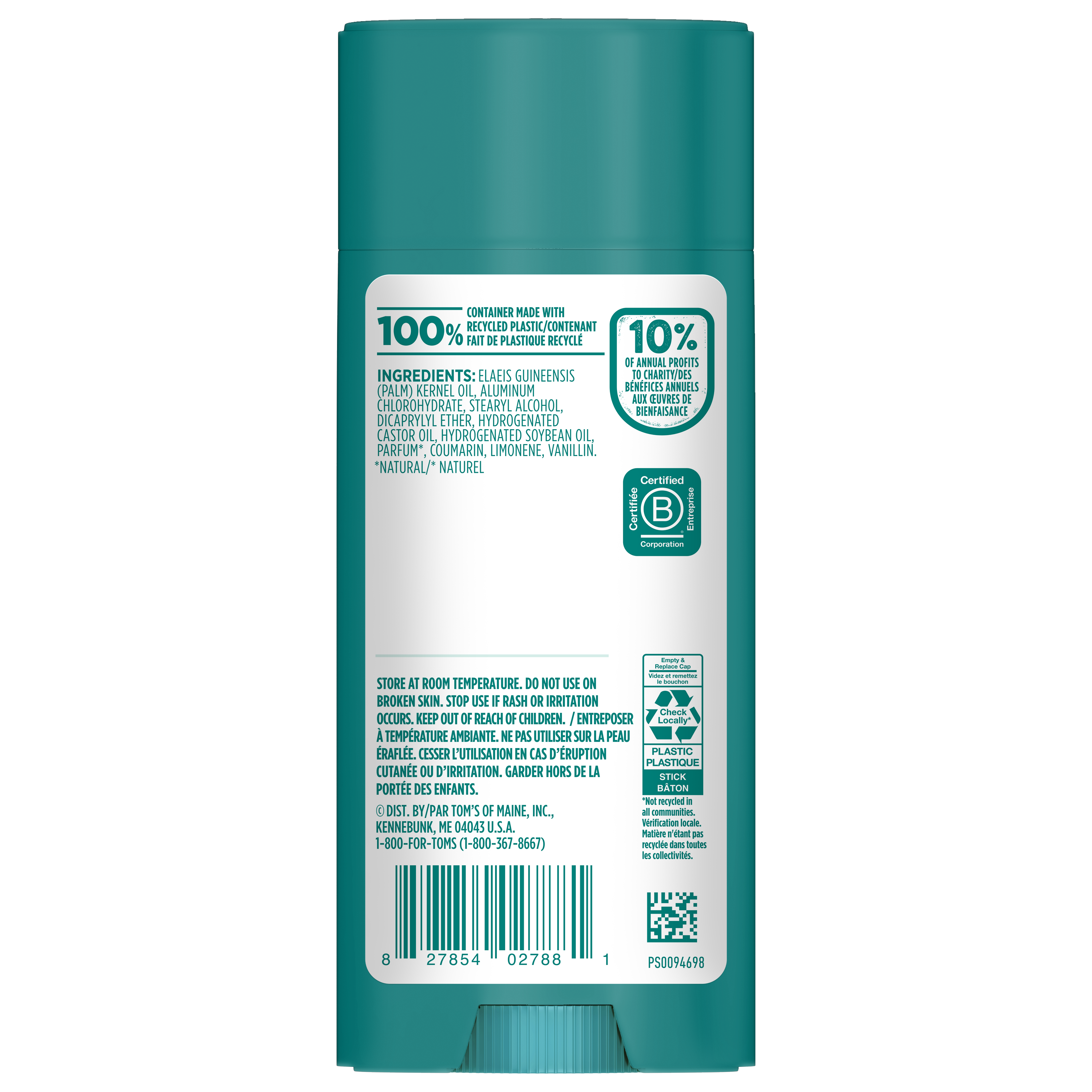 Product Title Tom’s of Maine Tropical Island Antiperspirant for Men and Women, No Artificial Fragrances, Dyes, or Preservatives, Baking Soda Free, 48-Hour Odor and Sweat Protection, 92 g SKU 61054503 SKU eCommerce Name Tom’s of Maine Tropical Island Antiperspirant for Men and Women, No Artificial Fragrances, Dyes, or Preservatives, Baking Soda Free, 48-Hour Odor and Sweat Protection, 92g Consumer Unit - GTIN 00827854027881 Case - GTIN 10827854027888 Product Category Personal Care Product Sub Category AP > Deo Brand Tom's of Maine Product Sub Brand Tom's Antiperspirant AP/Deo Consumer Unit Gross Weight 0.141 KG / 0.311 LB Consumer Unit Net Weight 0.092 KG / 0.203 LB Consumer Unit Length 33.000 MM / 1.299 IN Consumer Unit Width 56.000 MM / 2.205 IN Consumer Unit Height 139.000 MM / 5.472 IN Consumer Unit Volume 0.257 C8 / 0.009 CF Product Title Tom’s of Maine Tropical Island Antiperspirant for Men and Women, No Artificial Fragrances, Dyes, or Preservatives, Baking Soda Free, 48-Hour Odor and Sweat Protection, 92 g Product Description Tom’s of Maine Tropical Island Antiperspirant is crafted for men and women seeking reliable 48-hour odor and sweat protection. Experience a sun-kissed paradise of pineapple, coconut, and mango breezing through palm trees every time you apply. The formula is vegan, baking soda free, and paraben free, with no artificial fragrances, dyes, or preservatives; making it perfect for everyday use. Like all Tom’s of Maine products, it is not tested on animals. Our stick antiperspirant delivers long-lasting protection for active lifestyles and everyday routines. Keep this personal care product in your gym bag, travel bag, or bathroom. The 92 g container is made from 100% recycled plastic*. With Tom’s of Maine, you get protection you can count on—so you can be fresh and confident every day, no matter where life takes you. *excluding label eCommerce Copy Tom’s of Maine Tropical Island Antiperspirant is crafted for men and women seeking reliable 48-hour odor and sweat protection. Experience a sun-kissed paradise of pineapple, coconut, and mango breezing through palm trees every time you apply. The formula is vegan, baking soda free, and paraben free, with no dyes, or preservatives; making it perfect for everyday use. Made with no artificial fragrances, our stick antiperspirant delivers long-lasting protection for active lifestyles and everyday routines. *excluding label eCommerce Copy- Long Description Tom’s of Maine Tropical Island Antiperspirant is crafted for men and women seeking reliable 48-hour odor and sweat protection. Experience a sun-kissed paradise of pineapple, coconut, and mango breezing through palm trees every time you apply. The formula is vegan, baking soda free, and paraben free, with no artificial fragrances, dyes, or preservatives; making it perfect for everyday use. Like all Tom’s of Maine products, it is not tested on animals. Our stick antiperspirant delivers long-lasting protection for active lifestyles and everyday routines. Keep this personal care product in your gym bag, travel bag, or bathroom. The 92g container is made from 100% recycled plastic*. With Tom’s of Maine, you get protection you can count on—so you can be fresh and confident every day, no matter where life takes you. *excluding label Bullet 1 Includes one 92 g stick of Tom’s of Maine Tropical Island Natural Antiperspirant featuring a sun-kissed paradise of pineapple, coconut, and mango Bullet 2 Our underarm antiperspirant provides 48-hour odor and sweat protection, keeping you feeling dry and confident throughout the day Bullet 3 Tom’s of Maine Antiperspirant is dermatologist tested, contains no artificial fragrances, parabens, or baking soda, and is not tested on animals Bullet 4 We’re doing our part with a container made entirely from recycled plastic* Bullet 5 This stick antiperspirant is designed for women, men, teens, or anyone Bullet 6 Keep this personal care product in your gym bag, travel bag, or bathroom for on-the-go freshness Keywords (eCommerce) antiperspirant, stick antiperspirant, underarm antiperspirant, what is antiperspirant, sweat protection, antiperspirant for women, antiperspirant for men, dermatologist tested, 48-hour and sweat protection, not tested on animals, 100% recycled plastic, Tom’s of Maine, Tom’s of Maine antiperspirant, aluminum based, daily freshness, for women and men, for men and women, personal care products, everyday use, why use antiperspirant, keeps you confident all day, gym bag, travel bag, bathroom OS Amazon Product Title Tom’s of Maine Tropical Island Antiperspirant for Men and Women, No Artificial Fragrances, Dyes, or Preservatives, Baking Soda Free, 48-Hour Odor and Sweat Protection, 92 g OS Amazon Product Description Tom’s of Maine Tropical Island Antiperspirant is crafted for men and women seeking reliable 48-hour odor and sweat protection. Experience a sun-kissed paradise of pineapple, coconut, and mango breezing through palm trees every time you apply. The formula is vegan, baking soda free, and paraben free, with no artificial fragrances, dyes, or preservatives; making it perfect for everyday use. Like all Tom’s of Maine products, it is not tested on animals. Our stick antiperspirant delivers long-lasting protection for active lifestyles and everyday routines. Keep this personal care product in your gym bag, travel bag, or bathroom. The 92 g container is made from 100% recycled plastic*. With Tom’s of Maine, you get protection you can count on—so you can be fresh and confident every day, no matter where life takes you. *excluding label OS Amazon Bullet 1 WHAT’S INCLUDED: One 92 g stick of Tom’s of Maine Tropical Island Natural Antiperspirant made with no artificial fragrances featuring a sun-kissed paradise of pineapple, coconut, and mango breezing through palm trees OS Amazon Bullet 2 CONFIDENCE THAT LASTS: Our underarm antiperspirant provides 48-hour odor and sweat protection, keeping 