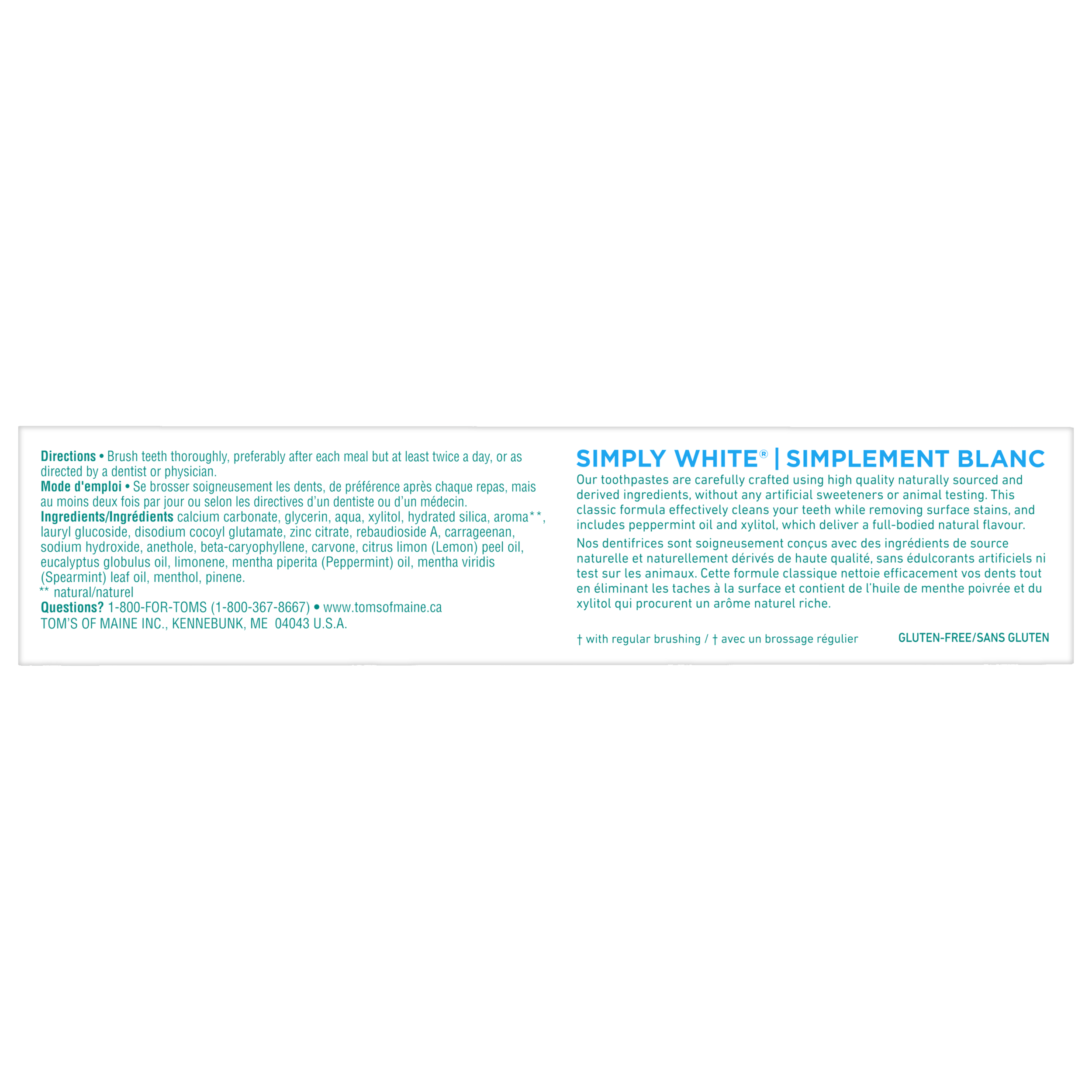 Product Title Tom’s of Maine Simply White Fluoride Free Toothpaste, Peppermint, 85 mL SKU 61054834 SKU eCommerce Name Tom's of Maine Simply White Fluoride-Free Natural Toothpaste, Peppermint, 85 mL Consumer Unit - GTIN 00077326159408 Case - GTIN 30077326159409 Product Category Oral Care Product Sub Category Toothpaste Brand Tom's Product Sub Brand Tom's Simply White TP Consumer Unit Gross Weight 0.145 KG / 0.320 LB Consumer Unit Net Weight 0.116 KG / 0.256 LB Consumer Unit Length 37.000 MM / 1.457 IN Consumer Unit Width 55.000 MM / 2.165 IN Consumer Unit Height 166.000 MM / 6.535 IN Consumer Unit Volume 0.338 C8 / 0.012 CF Product Title Tom’s of Maine Simply White Fluoride Free Toothpaste, Peppermint, 85 mL Product Description Bring back the natural beauty of your smile with Tom’s of Maine Simply White Fluoride Free Toothpaste. This fluoride free natural whitening toothpaste helps whiten teeth* and fights tartar buildup**. Plus, this mint toothpaste features an updated formula that tastes great and leaves your mouth clean and fresh with its peppermint flavour. Tom’s of Maine Simply White Mint Toothpaste is a natural toothpaste that helps whiten teeth by removing surface stains. The specially designed formula can even help fight tartar buildup with regular brushing. Freshen breath and help whiten teeth* with Tom’s of Maine Simply White Fluoride Free Toothpaste. Tom's of Maine Simply White Toothpaste is a gluten free toothpaste with no SLS, no artificial flavours or sweeteners, and has not been tested on animals. Now that’s something you can feel good about. *by removing surface stains **with regular brushing eCommerce Copy Dentifrice sans fluorure Simplement blanc de Tom's of Maine, menthe poivrée, 85 mL Retrouvez la beauté naturelle de votre sourire avec le dentifrice sans fluorure Simplement blanc de Tom's of Maine. Ce dentifrice blanchissant naturel sans fluorure aide à blanchir les dents* et combat l’accumulation de tartre**. De plus, il est proposé dans une saveur rafraîchissante de dentifrice à la menthe poivrée pour que votre haleine reste fraîche pendant le brossage. *en éliminant les taches à la surface **avec un brossage régulier eCommerce Copy- Long Description Dentifrice sans fluorure Simplement blanc de Tom's of Maine, menthe poivrée, 85 mL Retrouvez la beauté naturelle de votre sourire avec le dentifrice sans fluorure Simplement blanc de Tom's of Maine. Ce dentifrice blanchissant naturel sans fluorure aide à blanchir les dents* et combat l’accumulation de tartre**. De plus, il est proposé dans une saveur rafraîchissante de dentifrice à la menthe poivrée pour que votre haleine reste fraîche pendant le brossage. Dentifrice sans fluorure pour le blanchiment dentaire Le dentifrice à la menthe Simplement blanc de Tom's of Maine est un dentifrice naturel qui aide à blanchir les dents en éliminant les taches à la surface. La formule spécialement conçue peut même aider à combattre l'accumulation de tartre avec un brossage régulier. Rafraîchissez l'haleine et aidez à blanchir les dents* avec le dentifrice sans fluorure Simplement blanc de Tom's of Maine. Un dentifrice dont on peut se réjouir Le dentifrice Simplement blanc de Tom's of Maine est un dentifrice sans gluten qui est exempt d’arômes, d’édulcorants et de colorants artificiels, et qui n’a pas été testé sur les animaux. Voilà une chose dont on peut se réjouir. *en éliminant les taches à la surface **avec un brossage régulier Bullet 1 Includes one (1) 85mL tube of Tom’s of Maine Simply White Fluoride Free Toothpaste, Peppermint Toothpaste Bullet 2 This natural whitening toothpaste helps whiten teeth by removing surface stains Bullet 3 The peppermint toothpaste features an updated formula that tastes great and leaves your mouth clean and fresh Bullet 4 Tom’s of Maine Simply White Fluoride Free Toothpaste fights tartar buildup with regular brushing Bullet 5 This teeth whitening toothpaste is formulated without fluoride and helps gently whiten teeth by removing surface stains when brushing Bullet 6 Contains no SLS, artificial flavours or sweeteners, and has not been tested on animals Keywords (eCommerce) dentifrice à la menthe dentifrice blanchissant naturel dentifrice sans fluorure dentifrice blanchissant dentifrice à la menthe poivrée emballage de dentifrice OS Amazon Product Title Tom’s of Maine Simply White Fluoride Free Toothpaste, 1 Pack, Natural Whitening Toothpaste with No SLS, Helps Remove Surface Stains and Tartar, Peppermint, 85 mL OS Amazon Product Description Bring back the natural beauty of your smile with Tom’s of Maine Simply White Fluoride Free Toothpaste. This fluoride free natural whitening toothpaste helps whiten teeth* and fights tartar buildup**. Plus, this mint toothpaste features an updated formula that tastes great and leaves your mouth clean and fresh with its peppermint flavour. Tom’s of Maine Simply White Mint Toothpaste is a natural toothpaste that helps whiten teeth by removing surface stains. The specially designed formula can even help fight tartar buildup with regular brushing. Freshen breath and help whiten teeth* with Tom’s of Maine Simply White Fluoride Free Toothpaste. Tom's of Maine Simply White Toothpaste is a gluten free toothpaste with no SLS, no artificial flavours or sweeteners, and has not been tested on animals. Now that’s something you can feel good about. *by removing surface stains **with regular brushing OS Amazon Bullet 1 WHAT’S INCLUDED: One (1) 85mL tube of Tom’s of Maine Simply White Fluoride Free Toothpaste, Peppermint Toothpaste OS Amazon Bullet 2 NATURALLY WHITENS TEETH: This natural whitening toothpaste helps whiten teeth by removing surface stains OS Amazon Bullet 3 REVAMPED FLAVOUR: This peppermint toothpaste features an updated formula that tastes great and leaves your mouth clean and fresh OS Amazon Bullet 4 FIGHTS TARTAR: Tom’s of Maine Simply White Fluoride Free Toothpaste fights tart