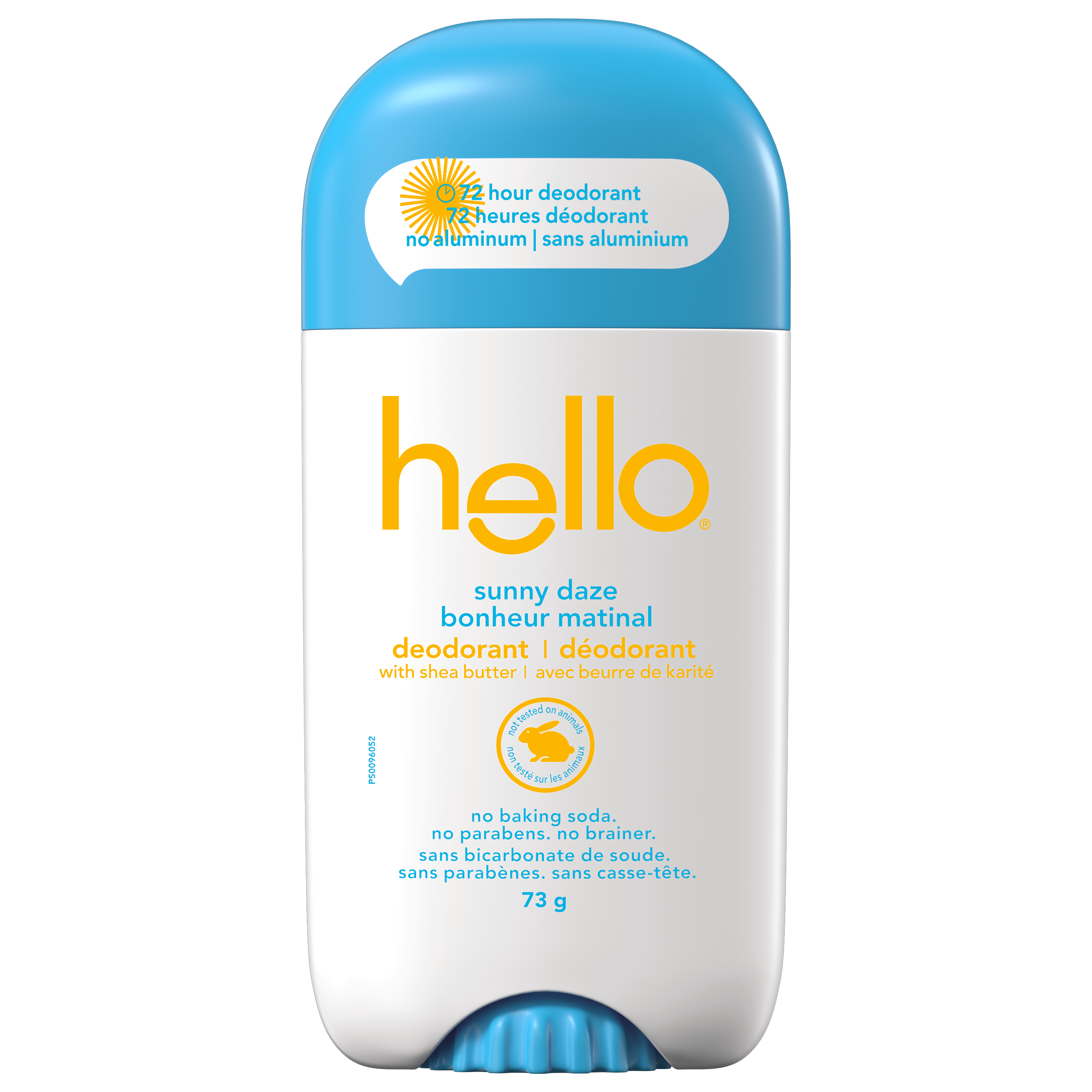 Product Title hello Sunny Daze Aluminum Free Deodorant for Women and Men with Shea Butter, 24-Hour Freshness, Baking Soda Free Deodorant, Dermatologically Tested, 73 g Deodorant Stick SKU 61055410 SKU eCommerce Name hello Sunny Daze Aluminum Free Deodorant for Women and Men with Shea Butter, 24-Hour Freshness, Baking Soda Free Deodorant, Dermatologically Tested, 73 g Deodorant Stick Consumer Unit - GTIN 00827854019503 Case - GTIN 10827854029073 Product Category Personal Care Product Sub Category AP > Deo Brand Hello Product Sub Brand Hello AP/Deo Consumer Unit Gross Weight 0.123 KG / 0.271 LB Consumer Unit Net Weight 0.123 KG / 0.271 LB Consumer Unit Length 30.000 MM / 1.181 IN Consumer Unit Width 58.000 MM / 2.283 IN Consumer Unit Height 125.000 MM / 4.921 IN Consumer Unit Volume 0.218 C8 / 0.008 CF Product Title hello Sunny Daze Aluminum Free Deodorant for Women and Men with Shea Butter, 24-Hour Freshness, Baking Soda Free Deodorant, Dermatologically Tested, 73 g Deodorant Stick eCommerce Copy Say hello to hello Sunny Daze Aluminum Free Deodorant. A bright, refreshing mix of citrus, white tea, and a hint of warm vanilla will leave you smelling like sunshine. Our 24-hour deodorant with shea butter is dermatologically tested and naturally scented to keep you feeling fresh all day. Say goodbye to aluminum, baking soda, parabens, and dyes. Plus, it glides on easily for a smooth application and won’t stain your clothes. Choose friendly with a deodorant that's not tested on animals and vegan for happy underarms. Anything less would be the pits. eCommerce Copy- Long Description Say hello to hello Sunny Daze Aluminum Free Deodorant. A bright, refreshing mix of citrus, white tea, and a hint of warm vanilla will leave you smelling like sunshine. Our 24-hour deodorant with shea butter is dermatologically tested and naturally scented to keep you feeling fresh all day. Say goodbye to aluminum, baking soda, parabens, and dyes. Plus, it glides on easily for a smooth application and won’t stain your clothes. Choose friendly with a deodorant that's not tested on animals and vegan for happy underarms. Anything less would be the pits. Keywords (eCommerce) deodorant for women, deodorant for men, natural deodorant, deodorant, natural deodorizing, deodorants, underarm deodorant for women, vegan deodorant, deo, natural deodorant, aluminum free deodorant, hello deo, deodorant for women, naturally scented deodorant, shea butter, deodorant stick, underarm deodorant, dermatologically tested deodorant, sensitive skin, 24 hour deodorant