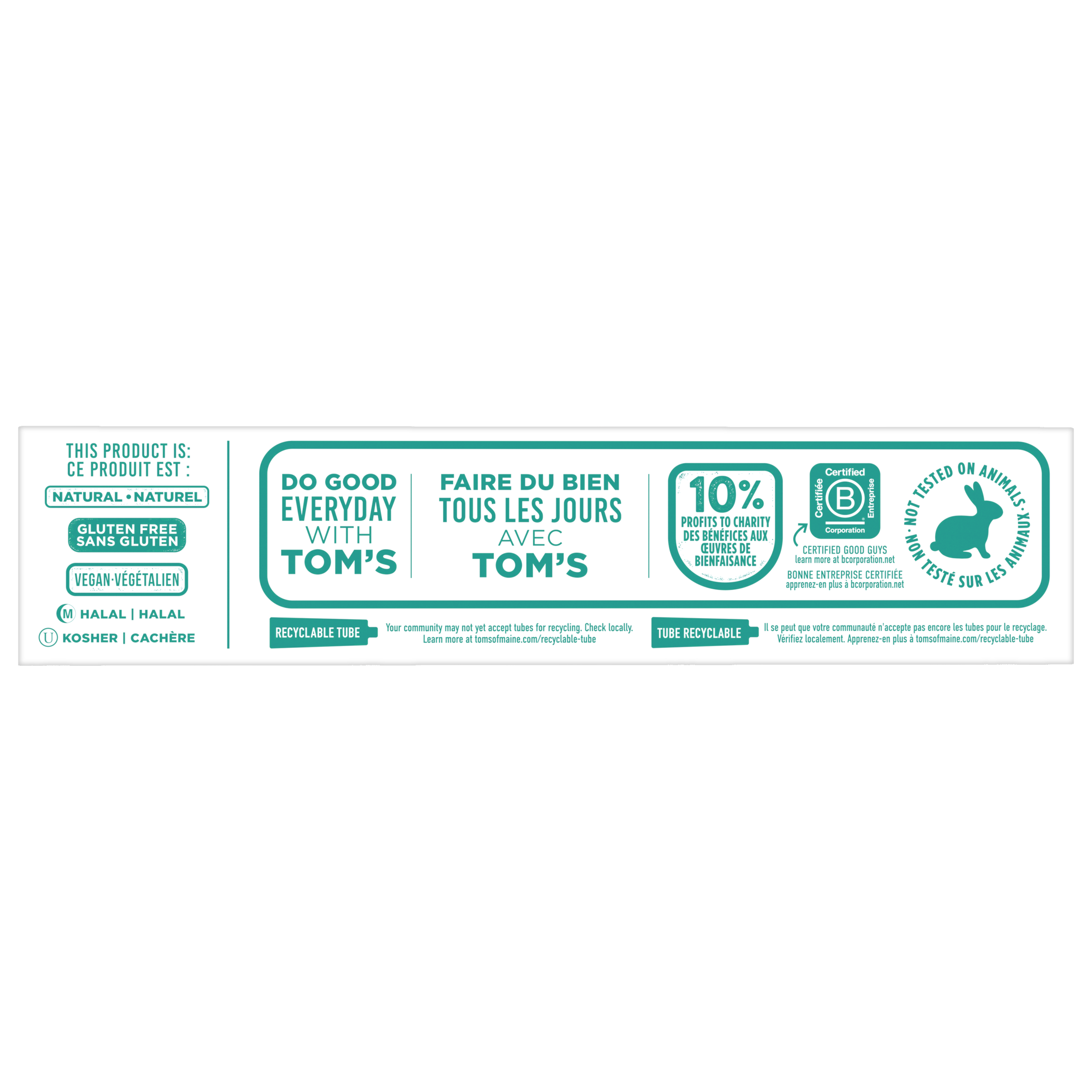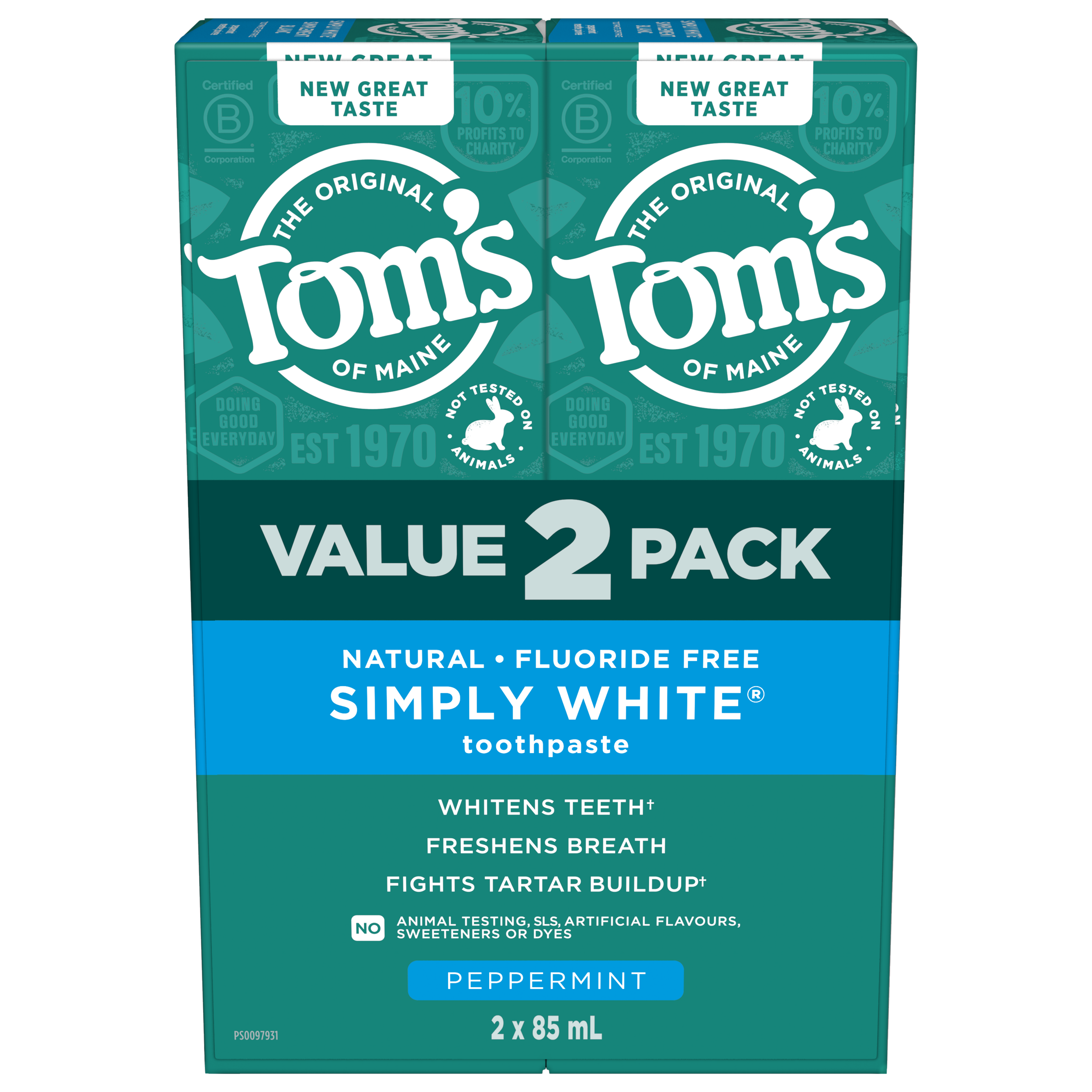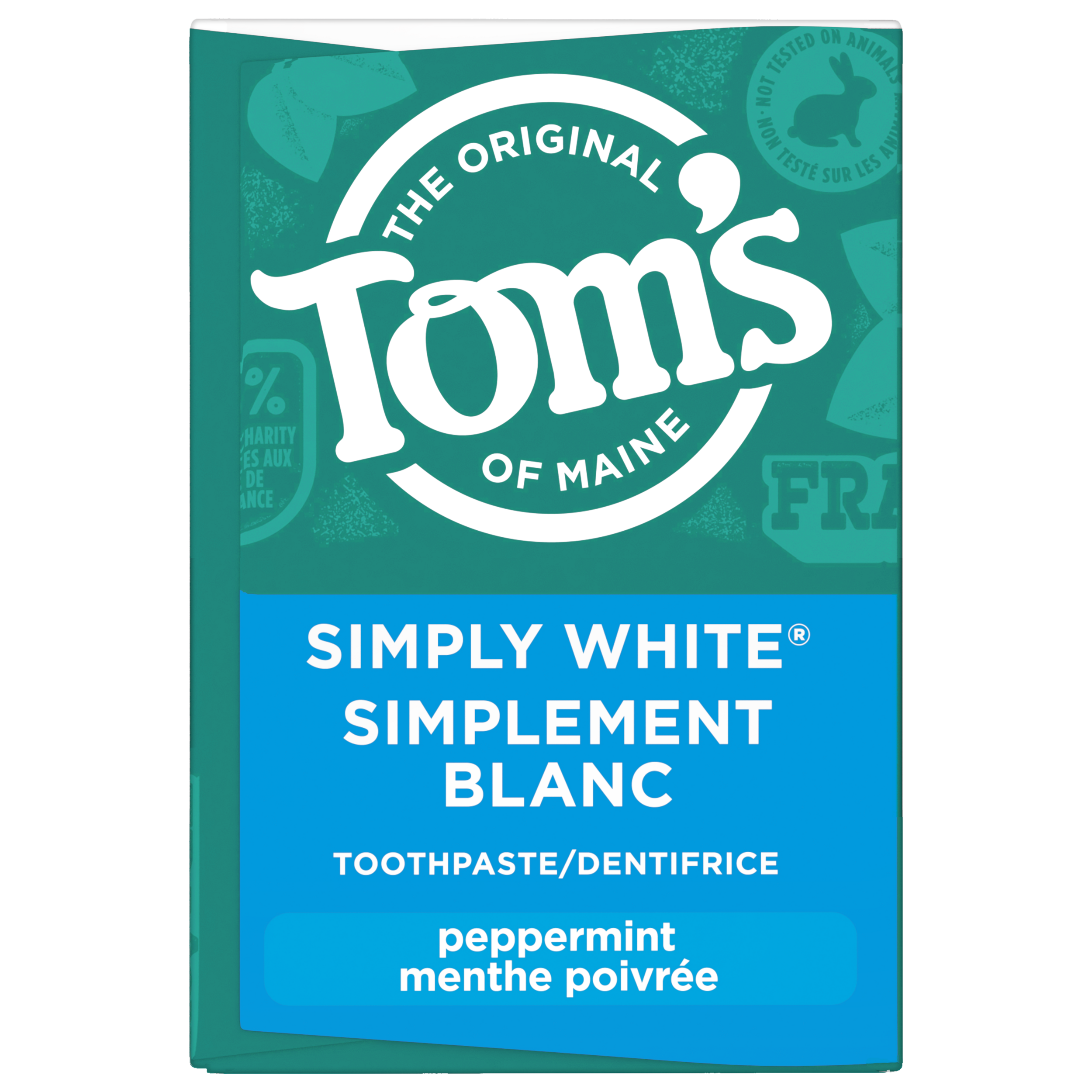 Product Title Tom’s of Maine Simply White Fluoride Free Toothpaste, Peppermint, 2 Pack, 85 mL SKU 61055647 SKU eCommerce Name Tom's of Maine Simply White Fluoride-Free Natural Toothpaste, Peppermint, 85 mL (2 Pack) Consumer Unit - GTIN 00077326142622 Case - GTIN 10077326142629 Product Category Oral Care Product Sub Category Toothpaste Brand Tom's Product Sub Brand Tom's Simply White TP Consumer Unit Gross Weight 0.340 KG / 0.750 LB Consumer Unit Net Weight 0.263 KG / 0.580 LB Consumer Unit Length 37.000 MM / 1.457 IN Consumer Unit Width 110.000 MM / 4.331 IN Consumer Unit Height 166.000 MM / 6.535 IN Consumer Unit Volume 0.676 C8 / 0.024 CF Product Title Tom’s of Maine Simply White Fluoride Free Toothpaste, Peppermint, 2 Pack, 85 mL Product Description Bring back the natural beauty of your smile with Tom’s of Maine Simply White Fluoride Free Toothpaste. This fluoride free natural whitening toothpaste pack helps whiten teeth* and fights tartar buildup**. Plus, this mint toothpaste features an updated formula that tastes great and leaves your mouth clean and fresh with its peppermint flavour. Tom’s of Maine Simply White Mint Toothpaste is a natural toothpaste that helps whiten teeth by removing surface stains. The specially designed formula can even help fight tartar buildup with regular brushing. Freshen breath and help whiten teeth* with Tom’s of Maine Simply White Fluoride Free Toothpaste. Tom's of Maine Simply White Toothpaste is a gluten free toothpaste with no SLS, no artificial flavours or sweeteners, and has not been tested on animals. Now that’s something you can feel good about. *by removing surface stains **with regular brushing eCommerce Copy Emballage de dentifrice sans fluorure Simplement blanc de Tom's of Maine, menthe poivrée, 170 mL Retrouvez la beauté naturelle de votre sourire avec l’emballage de dentifrice sans fluorure Simplement blanc de Tom's of Maine. Cet emballage double de dentifrice blanchissant naturel sans fluorure aide à blanchir les dents* et combat l’accumulation de tartre**. De plus, il est proposé dans une saveur rafraîchissante de dentifrice à la menthe poivrée pour que votre haleine reste fraîche pendant le brossage. *en éliminant les taches à la surface **avec un brossage régulier eCommerce Copy- Long Description Emballage de dentifrice sans fluorure Simplement blanc de Tom's of Maine, menthe poivrée, 170 mL Retrouvez la beauté naturelle de votre sourire avec l’emballage de dentifrice sans fluorure Simplement blanc de Tom's of Maine. Cet emballage double de dentifrice blanchissant naturel sans fluorure aide à blanchir les dents* et combat l’accumulation de tartre**. De plus, il est proposé dans une saveur rafraîchissante de dentifrice à la menthe poivrée pour que votre haleine reste fraîche pendant le brossage. Dentifrice sans fluorure pour le blanchiment dentaire Le dentifrice à la menthe Simplement blanc de Tom's of Maine est un dentifrice naturel qui aide à blanchir les dents en éliminant les taches à la surface. La formule spécialement conçue peut même aider à combattre l'accumulation de tartre avec un brossage régulier. Rafraîchissez l'haleine et aidez à blanchir les dents* avec le dentifrice sans fluorure Simplement blanc de Tom's of Maine. Un dentifrice dont on peut se réjouir Le dentifrice Simplement blanc de Tom's of Maine est un dentifrice sans gluten qui est exempt d’arômes, d’édulcorants et de colorants artificiels et qui n’a pas été testé sur les animaux. Voilà une chose dont on peut se réjouir. *en éliminant les taches à la surface **avec un brossage régulier Bullet 1 Includes two (2) 85mL tubes of Tom’s of Maine Simply White Fluoride Free Toothpaste, Peppermint Toothpaste Bullet 2 This natural whitening toothpaste pack helps whiten teeth by removing surface stains Bullet 3 The double peppermint toothpaste pack features an updated formula that tastes great and leaves your mouth clean and fresh Bullet 4 Tom’s of Maine Simply White Fluoride Free Toothpaste fights tartar buildup with regular brushing Bullet 5 This teeth whitening toothpaste is formulated without fluoride and helps gently whiten teeth by removing surface stains when brushing Bullet 6 Contains no SLS, artificial flavours or sweeteners, and has not been tested on animals Keywords (eCommerce) dentifrice à la menthe dentifrice blanchissant naturel dentifrice sans fluorure dentifrice blanchissant dentifrice à la menthe poivrée emballage de dentifrice OS Amazon Product Title Tom’s of Maine Simply White Fluoride Free Toothpaste, 2 Pack, Natural Whitening Toothpaste with No SLS, Helps Remove Surface Stains and Tartar, Peppermint, 85 mL OS Amazon Product Description Bring back the natural beauty of your smile with Tom’s of Maine Simply White Fluoride Free Toothpaste. This fluoride free natural whitening toothpaste pack helps whiten teeth* and fights tartar buildup**. Plus, this mint toothpaste features an updated formula that tastes great and leaves your mouth clean and fresh with its peppermint flavour. Tom’s of Maine Simply White Mint Toothpaste is a natural toothpaste that helps whiten teeth by removing surface stains. The specially designed formula can even help fight tartar buildup with regular brushing. Freshen breath and help whiten teeth* with Tom’s of Maine Simply White Fluoride Free Toothpaste. Tom's of Maine Simply White Toothpaste is a gluten free toothpaste with no SLS, no artificial flavours or sweeteners, and has not been tested on animals. Now that’s something you can feel good about. *by removing surface stains **with regular brushing OS Amazon Bullet 1 WHAT’S INCLUDED: Two (1) 85mL tubes of Tom’s of Maine Simply White Fluoride Free Toothpaste, Peppermint Toothpaste OS Amazon Bullet 2 NATURALLY WHITENS TEETH: This natural whitening toothpaste pack helps whiten teeth by removing surface stains OS Amazon Bullet 3 REVAMPED FLAVOUR: This double peppermint toothpaste pack features an upd