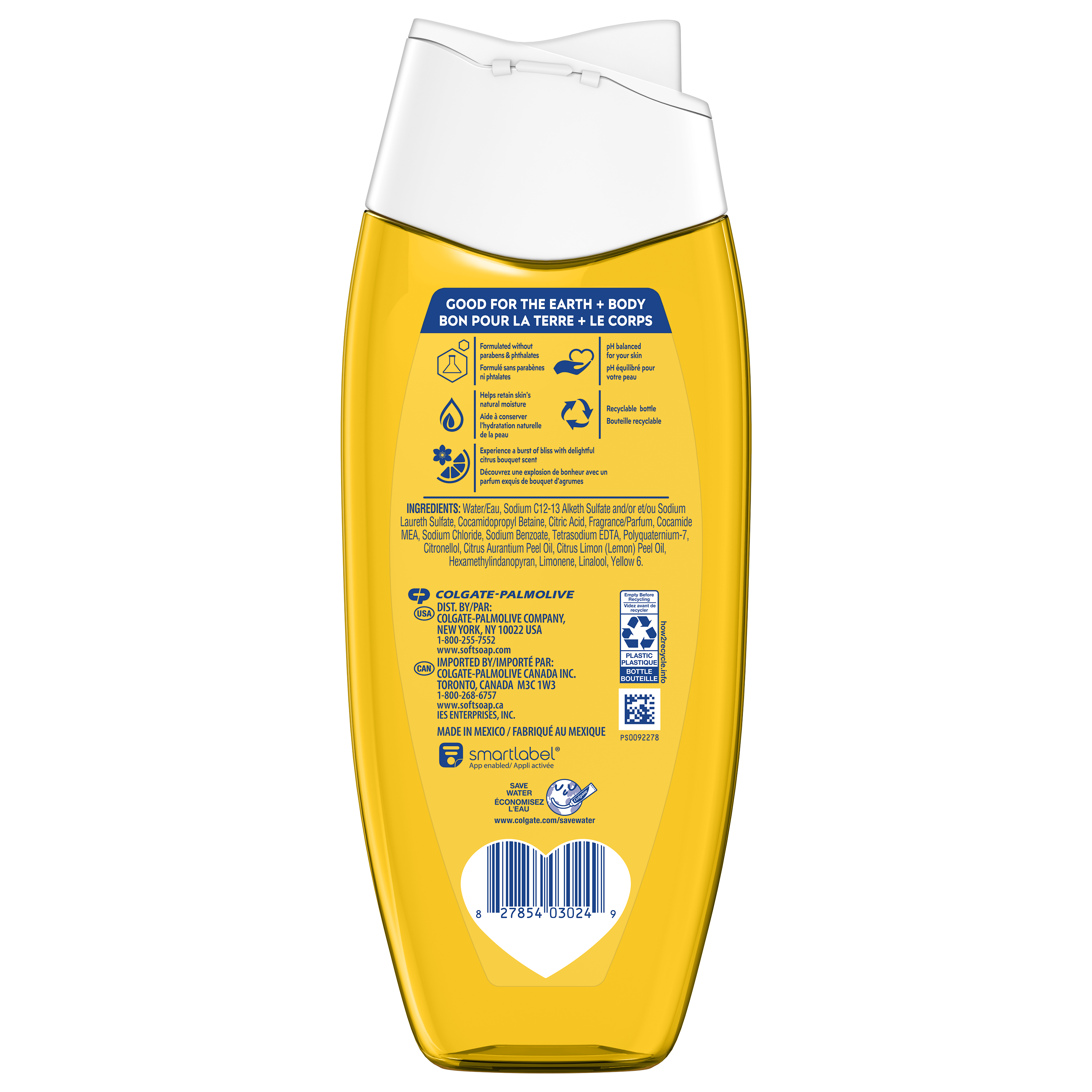 Product Title Softsoap Energizing Citrus Bouquet Body Wash SKU 61056989 SKU eCommerce Name Softsoap Energizing Citrus Bouquet Body Wash Consumer Unit - GTIN 00827854030249 Case - GTIN 10827854030246 Product Category Personal Care Product Sub Category Body Wash Brand Softsoap Product Sub Brand Softsoap BW Consumer Unit Gross Weight 0.436 KG / 0.961 LB Consumer Unit Net Weight 0.399 KG / 0.880 LB Consumer Unit Length 36.000 MM / 1.417 IN Consumer Unit Width 83.000 MM / 3.268 IN Consumer Unit Height 215.000 MM / 8.465 IN Consumer Unit Volume 0.642 C8 / 0.023 CF Product Title Softsoap Energizing Citrus Bouquet Body Wash Product Description Experience a burst of bliss every day with Softsoap Citrus Bouquet Moisturizing pH balanced Body Wash. Awaken your senses with uplifting fruit and floral fragrances as you feel the joy of clean. This body wash brings freshness to every shower, leaving your skin feeling revitalized. This moisturizing pH balanced body wash helps retain your skin’s natural moisture. Softsoap body wash is moisturizing, making it a great choice for kids and adults alike. Formulated without parabens and phthalates. Whether you’re searching for an orange body wash, a shower gel, or simply want a refreshing personal care product, Softsoap’s got you covered! Bullet 1 Includes one 390mL bottle of Softsoap Moisturizing pH balanced Body Wash, Citrus Bouquet Scent Bullet 2 This body wash helps retain your skin’s natural moisture, making it perfect for daily use Bullet 3 Awaken your senses with uplifting fruit and floral fragrances, delivering a refreshing start to your day Bullet 4 This body wash for women provides cleansing, leaving your skin feeling fresh, smooth, and beautifully scented Bullet 5 Formulated without parabens and phthalates Bullet 6 Whether you’re searching for an orange body wash, a shower gel, or simply want a refreshing personal care product, Softsoap’s got you covered OS Amazon Product Title Softsoap Moisturizing Body Wash, pH Balanced, Paraben Free, Body Wash and Shower Gel, Citrus Bouquet Scent, 390 mL OS Amazon Product Description Experience a burst of bliss every day with Softsoap Citrus Bouquet Moisturizing pH balanced Body Wash. Awaken your senses with uplifting fruit and floral fragrances as you feel the joy of clean. This body wash brings freshness to every shower, leaving your skin feeling revitalized. This moisturizing pH balanced body wash helps retain your skin’s natural moisture. Softsoap body wash is moisturizing, making it a great choice for kids and adults alike. Formulated without parabens and phthalates. Whether you’re searching for an orange body wash, a shower gel, or simply want a refreshing personal care product, Softsoap’s got you covered! OS Amazon Bullet 1 Includes one 390mL bottle of Softsoap Moisturizing pH balanced Body Wash, Citrus Bouquet Scent OS Amazon Bullet 2 This body wash helps retain your skin’s natural moisture, making it perfect for daily use OS Amazon Bullet 3 Awaken your senses with uplifting fruit and floral fragrances, delivering a refreshing start to your day OS Amazon Bullet 4 This body wash for women provides cleansing, leaving your skin feeling fresh, smooth, and beautifully scented OS Amazon Bullet 5 Formulated without parabens and phthalates OS Walmart Product Title Softsoap Moisturizing Body Wash, pH Balanced, Citrus Bouquet Scent, 390 mL OS Walmart Product Description Experience a burst of bliss every day with Softsoap Citrus Bouquet Moisturizing pH balanced Body Wash. Awaken your senses with uplifting fruit and floral fragrances as you feel the joy of clean. This body wash brings freshness to every shower, leaving your skin feeling revitalized. This moisturizing pH balanced body wash helps retain your skin’s natural moisture. Softsoap body wash is moisturizing, making it a great choice for kids and adults alike. Formulated without parabens and phthalates. Whether you’re searching for an orange body wash, a shower gel, or simply want a refreshing personal care product, Softsoap’s got you covered! OS Walmart Bullet 1 Includes one 390mL bottle of Softsoap Moisturizing pH balanced Body Wash, Citrus Bouquet Scent OS Walmart Bullet 2 This body wash helps retain your skin’s natural moisture, making it perfect for daily use OS Walmart Bullet 3 Awaken your senses with uplifting fruit and floral fragrances, delivering a refreshing start to your day OS Walmart Bullet 4 This body wash for women provides cleansing, leaving your skin feeling fresh, smooth, and beautifully scented OS Walmart Bullet 5 Formulated without parabens and phthalates OS Walmart Bullet 6 Whether you’re searching for an orange body wash, a shower gel, or simply want a refreshing personal care product, Softsoap’s got you covered OS Walmart Bullet 7 Softsoap brings joy to everyday moments through body wash solutions that provide a burst of sensorial bliss Walmart Bullet 9 Suitable for all ages and all skin types. OS Loblaws Product Title Softsoap Moisturizing Body Wash, Citrus Bouquet Scent, 390 mL OS Loblaws Product Description Experience a burst of bliss every day with Softsoap Citrus Bouquet Moisturizing pH balanced Body Wash. Awaken your senses with uplifting fruit and floral fragrances as you feel the joy of clean. This body wash brings freshness to every shower, leaving your skin feeling revitalized. This moisturizing pH balanced body wash helps retain your skin’s natural moisture. Softsoap body wash is moisturizing, making it a great choice for kids and adults alike. Formulated without parabens and phthalates. Whether you’re searching for an orange body wash, a shower gel, or simply want a refreshing personal care product, Softsoap’s got you covered! OS Loblaws Bullet 1 Includes one 390mL bottle of Softsoap Moisturizing pH balanced Body Wash, Citrus Bouquet Scent OS Loblaws Bullet 2 This body wash helps retain your skin’s natural moisture, making it perfect for daily use OS Loblaws Bullet 3 Awaken your senses w