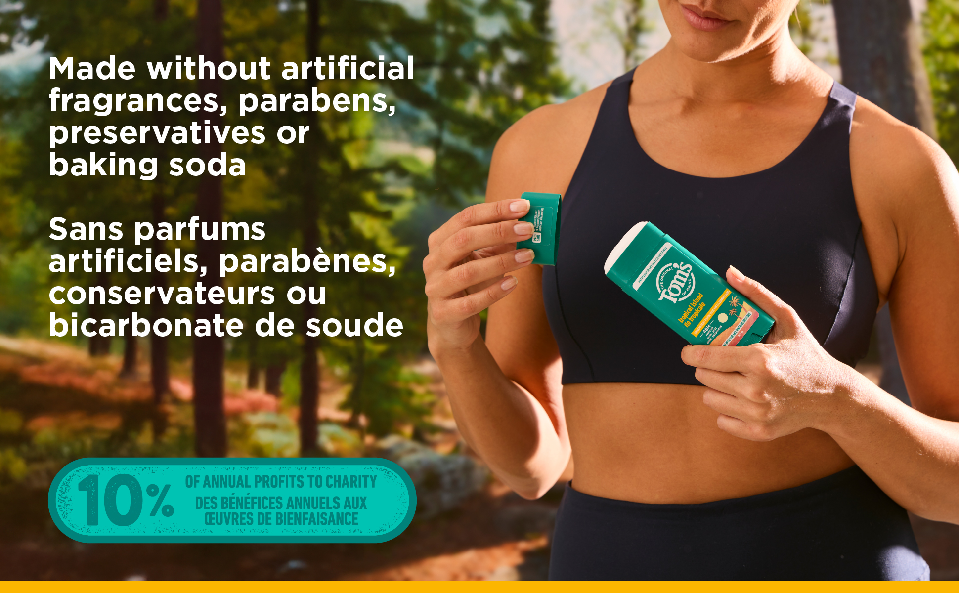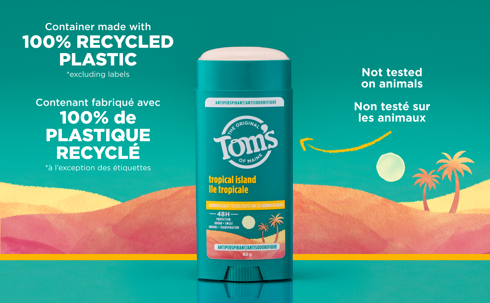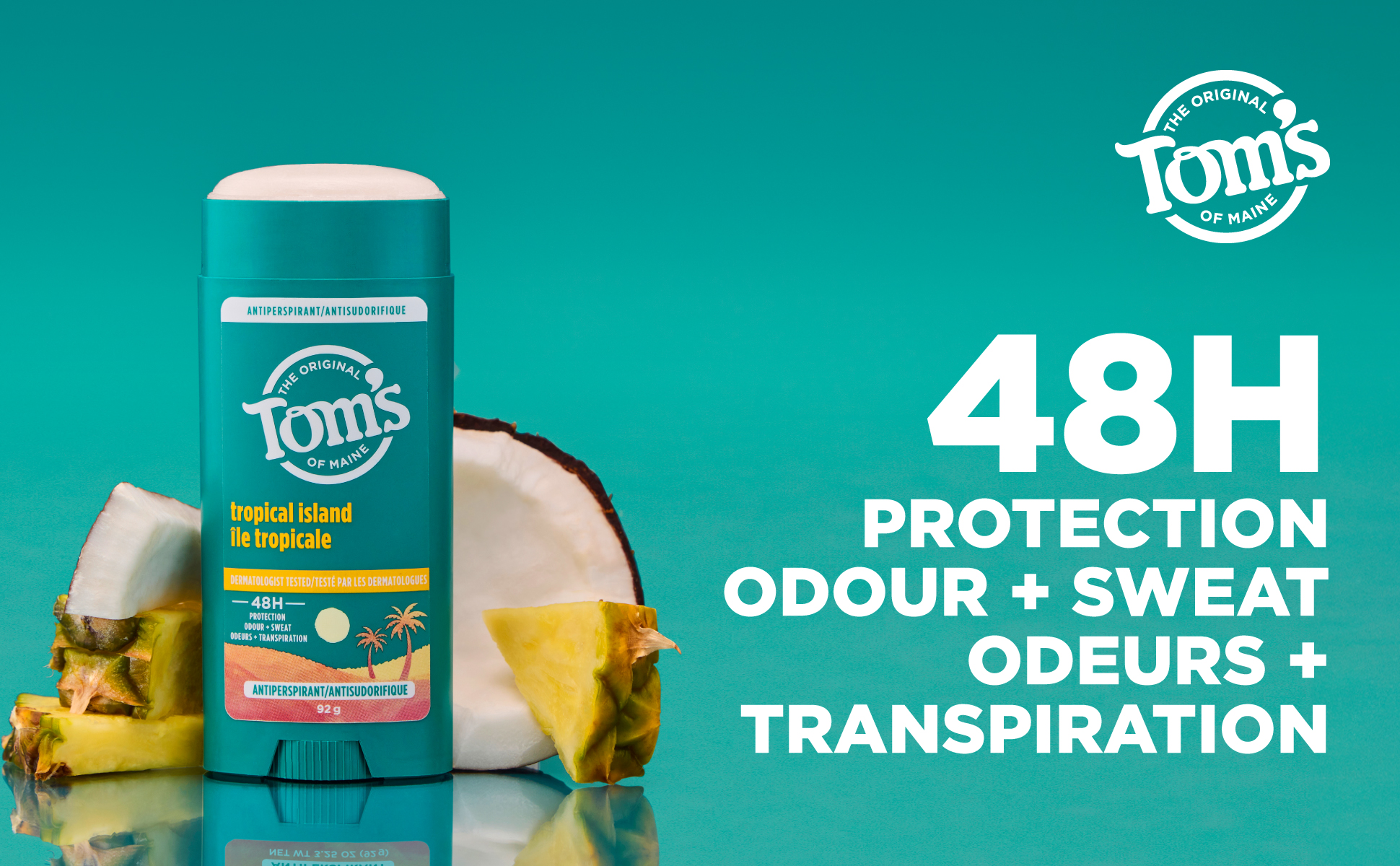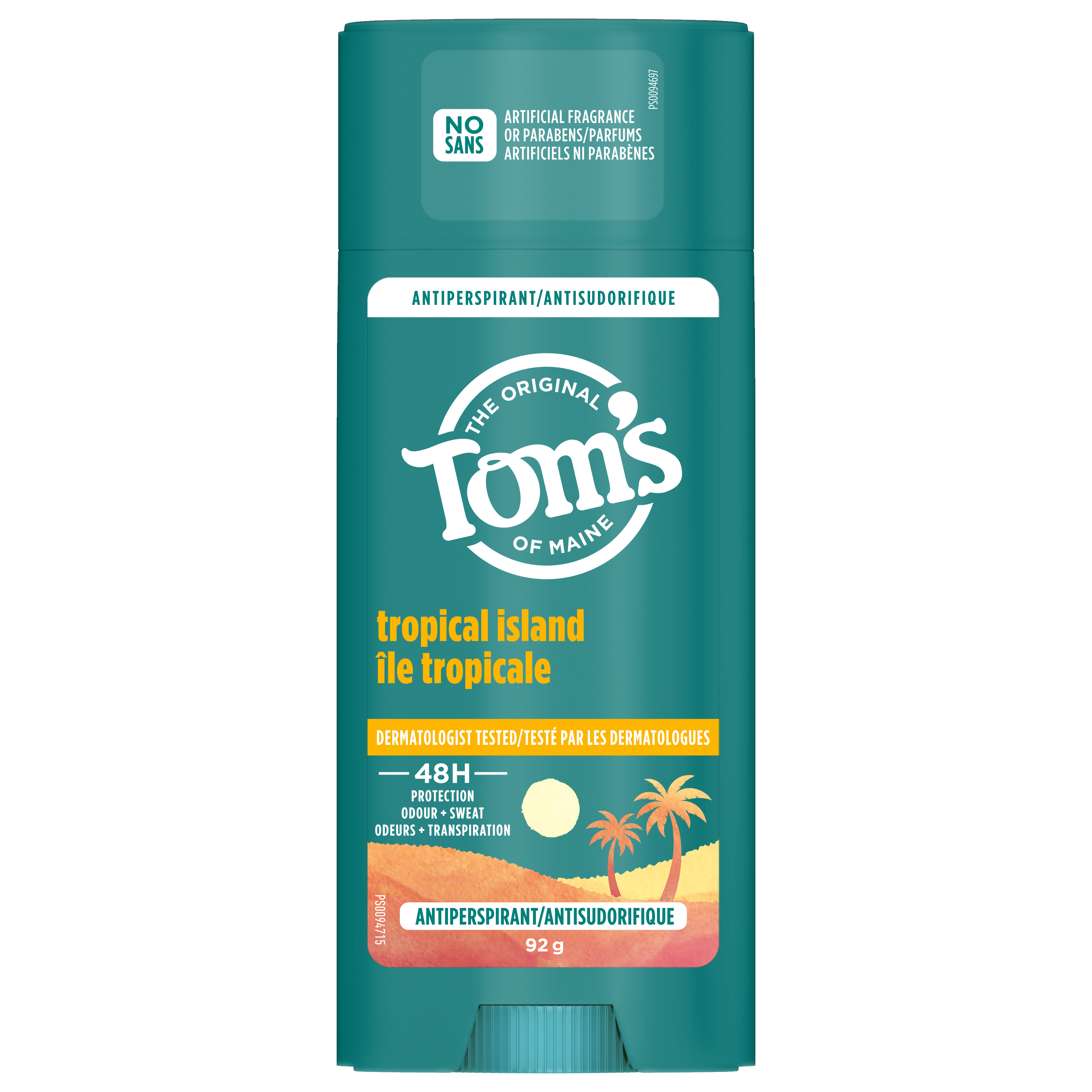 Product Title Tom’s of Maine Tropical Island Antiperspirant for Men and Women, No Artificial Fragrances, Dyes, or Preservatives, Baking Soda Free, 48-Hour Odor and Sweat Protection, 92g SKU 61058010 SKU eCommerce Name Tom’s of Maine Tropical Island Antiperspirant for Men and Women, No Artificial Fragrances, Dyes, or Preservatives, Baking Soda Free, 48-Hour Odor and Sweat Protection, 3.25 oz Consumer Unit - GTIN 00827854027881 Case - GTIN 10827854031243 Product Category Personal Care Product Sub Category AP > Deo Brand Tom's of Maine Product Sub Brand Tom's Antiperspirant AP/Deo Consumer Unit Gross Weight 0.145 KG / 0.320 LB Consumer Unit Net Weight 0.133 KG / 0.293 LB Consumer Unit Length 56.000 MM / 2.205 IN Consumer Unit Width 33.000 MM / 1.299 IN Consumer Unit Height 139.000 MM / 5.472 IN Consumer Unit Volume 0.257 C8 / 0.009 CF Product Title Tom’s of Maine Tropical Island Antiperspirant for Men and Women, No Artificial Fragrances, Dyes, or Preservatives, Baking Soda Free, 48-Hour Odor and Sweat Protection, 92g eCommerce Copy Tom’s of Maine Tropical Island Antiperspirant is crafted for men and women seeking reliable 48-hour odor and sweat protection. Experience a sun-kissed paradise of pineapple, coconut, and mango breezing through palm trees every time you apply. The formula is vegan, baking soda free, and paraben free, with no dyes, or preservatives; making it perfect for everyday use. Made with no artificial fragrances, our stick antiperspirant delivers long-lasting protection for active lifestyles and everyday routines. *excluding label eCommerce Copy- Long Description Tom’s of Maine Tropical Island Antiperspirant is crafted for men and women seeking reliable 48-hour odor and sweat protection. Experience a sun-kissed paradise of pineapple, coconut, and mango breezing through palm trees every time you apply. The formula is vegan, baking soda free, and paraben free, with no artificial fragrances, dyes, or preservatives; making it perfect for everyday use. Like all Tom’s of Maine products, it is not tested on animals. Our stick antiperspirant delivers long-lasting protection for active lifestyles and everyday routines. Keep this personal care product in your gym bag, travel bag, or bathroom. The 92g container is made from 100% recycled plastic*. With Tom’s of Maine, you get protection you can count on—so you can be fresh and confident every day, no matter where life takes you. *excluding label Keywords (eCommerce) antiperspirant, stick antiperspirant, underarm antiperspirant, what is antiperspirant, sweat protection, antiperspirant for women, antiperspirant for men, dermatologist tested, 48-hour and sweat protection, not tested on animals, 100% recycled plastic, Tom’s of Maine, Tom’s of Maine antiperspirant, aluminum based, daily freshness, for women and men, for men and women, personal care products, everyday use, why use antiperspirant, keeps you confident all day, gym bag, travel bag, bathroom OS Walmart Product Title Tom’s of Maine Tropical Island Antiperspirant for Men and Women, Baking Soda Free, 92 g OS Walmart Product Description Tom’s of Maine Tropical Island Antiperspirant is crafted for men and women seeking reliable 48-hour odor and sweat protection. Experience a sun-kissed paradise of pineapple, coconut, and mango breezing through palm trees every time you apply. The formula is vegan, baking soda free, and paraben free, with no artificial fragrances, dyes, or preservatives; making it perfect for everyday use. Like all Tom’s of Maine products, it is not tested on animals. Our stick antiperspirant delivers long-lasting protection for active lifestyles and everyday routines. Keep this personal care product in your gym bag, travel bag, or bathroom. The 3.25 oz container is made from 100% recycled plastic*. With Tom’s of Maine, you get protection you can count on—so you can be fresh and confident every day, no matter where life takes you. *excluding label OS Walmart Bullet 1 Includes one 92 g stick of Tom’s of Maine Tropical Island Natural Antiperspirant featuring a sun-kissed paradise of pineapple, coconut, and mango OS Walmart Bullet 2 Our underarm antiperspirant provides 48-hour odor and sweat protection, keeping you feeling dry and confident throughout the day OS Walmart Bullet 3 Tom’s of Maine Antiperspirant is dermatologist tested, contains no artificial fragrances, parabens, or baking soda, and is not tested on animals OS Walmart Bullet 4 We’re doing our part with a container made entirely from recycled plastic* OS Walmart Bullet 5 This stick antiperspirant is designed for women, men, teens, or anyone seeking gentle care
