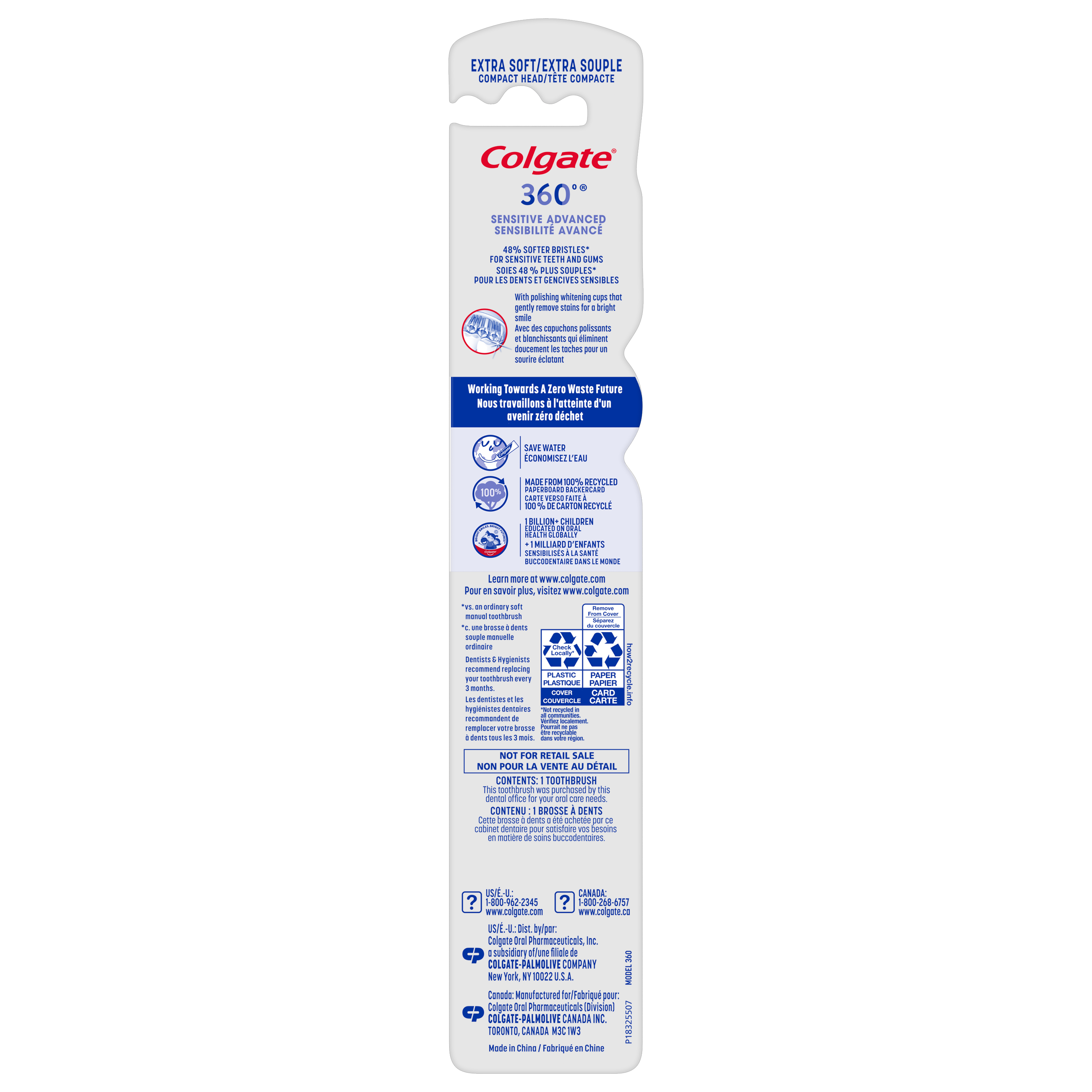 Product Title Colgate* 360°* Enamel Health Extra Soft Toothbrush SKU 732032 SKU eCommerce Name Colgate* 360°* Enamel Health Extra Soft Toothbrush Consumer Unit - GTIN 00038341320327 Case - GTIN 10038341320324 Product Category Oral Care Product Sub Category Manual TB Brand Colgate Product Sub Brand Colgate 360 Man TB Consumer Unit Gross Weight 0.031 KG / 0.068 LB Consumer Unit Net Weight 0.015 KG / 0.033 LB Consumer Unit Length 25.000 MM / 0.984 IN Consumer Unit Width 42.000 MM / 1.654 IN Consumer Unit Height 229.000 MM / 9.016 IN Consumer Unit Volume 240.450 C8 / 8.491 CF Product Title Colgate* 360°* Enamel Health Extra Soft Toothbrush eCommerce Copy Colgate* 360°* Enamel Health Extra Soft Toothbrush helps to protect enamel and gums while gently removing surface stains. eCommerce Copy- Long Description Colgate* 360°* Enamel Health Extra Soft Toothbrush helps to protect enamel and gums while gently removing surface stains. It features 48% softer bristles (vs. an ordinary soft manual toothbrush), a cheek and tongue cleaner, and polishing cups to help gently remove stains. Plus, raised cleaning tips help get into hard-to-reach places. Walmart Bullet 1 Extra soft bristles Walmart Bullet 2 Compact head Walmart Bullet 3 48% softer bristles (vs. an ordinary soft manual toothbrush) Walmart Bullet 4 Helps protect enamel surfaces and gums Walmart Bullet 5 Cheek and tongue cleaner Walmart Bullet 6 Polishing cups help to gently remove stains Walmart Bullet 7 Raised cleaning tips help get into hard-to-reach-places