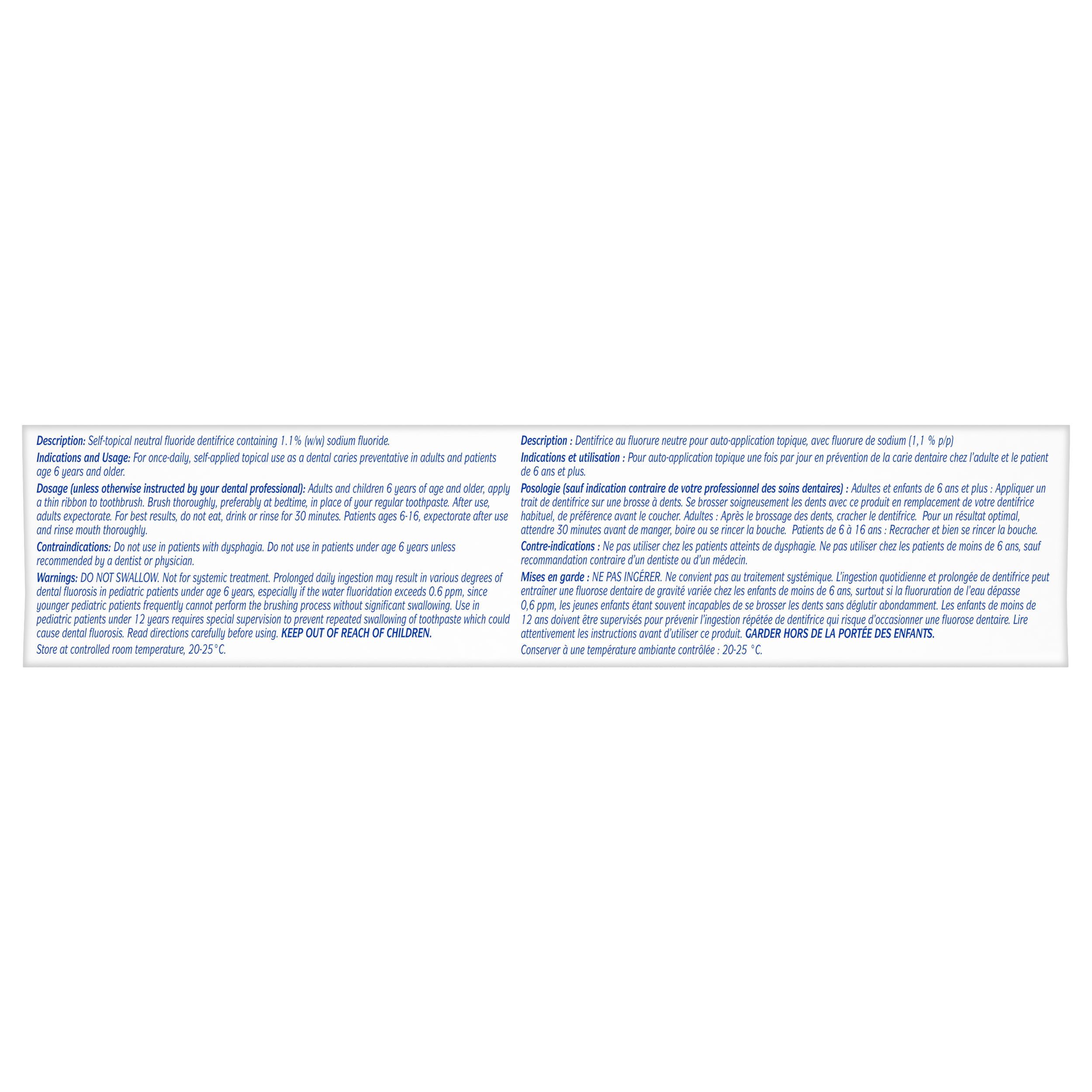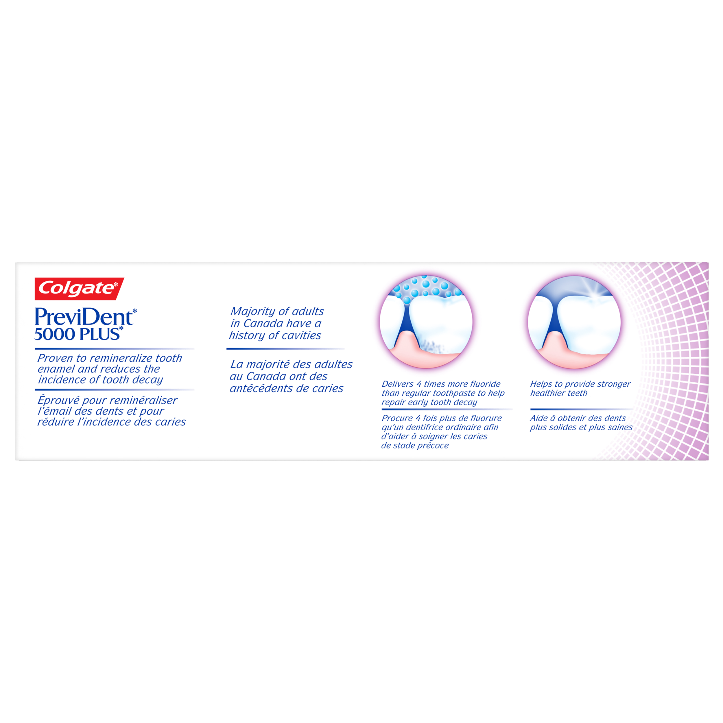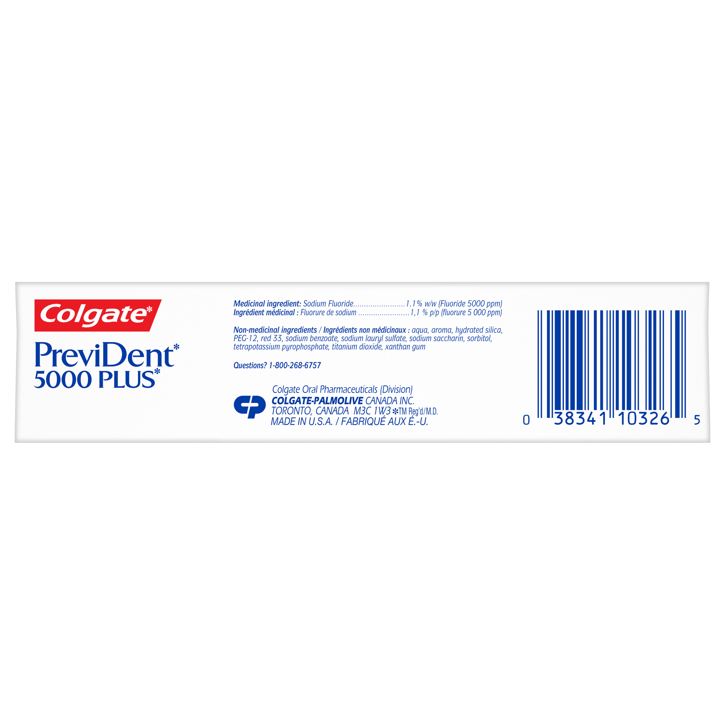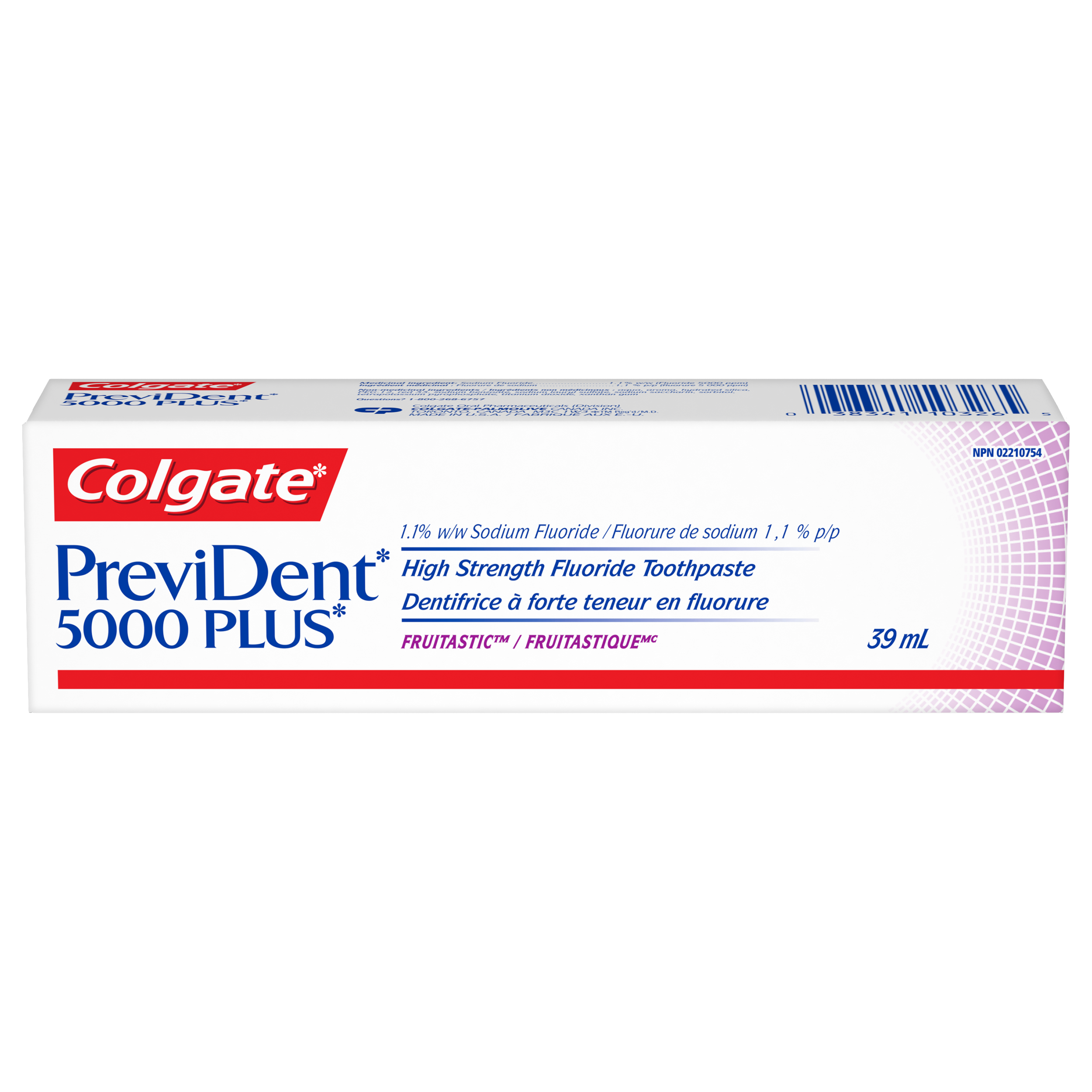 Product Title Colgate® PreviDent 5000 PLUS, Fruitastic, 39 mL SKU 733410 SKU eCommerce Name Colgate® PreviDent 5000 PLUS, Fruitastic, 39 mL Consumer Unit - GTIN 00038341103265 Case - GTIN 00038341334102 Product Category Oral Care Product Sub Category PP High Fluoride Brand Colgate Product Sub Brand Colgate PreviDent Toothpaste HF PP Consumer Unit Gross Weight 0.081 KG / 0.179 LB Consumer Unit Net Weight 0.050 KG / 0.110 LB Consumer Unit Length 35.000 MM / 1.378 IN Consumer Unit Width 151.000 MM / 5.945 IN Consumer Unit Height 43.000 MM / 1.693 IN Consumer Unit Volume 0.227 C8 / 0.008 CF Product Title Colgate® PreviDent 5000 PLUS, Fruitastic, 39 mL eCommerce Copy Self-topical neural fluoride dentifrice containing 1.1% (w/w) sodium fluoride. OS Amazon Product Title Colgate PreviDent Plus High Fluoride Toothpaste, Liquid Gel Toothpaste with Enhanced Fluoride Formula, Helps Reverse Early Tooth Decay, Fruitastic, 39 mL OS Amazon Product Description Colgate PreviDent Plus is a high strength fluoride toothpaste designed to protect teeth from acid erosion. Available in a great-tasting Fruitastic toothpaste flavour, this liquid gel sodium fluoride toothpaste contains 4X the fluoride found in regular fluoride toothpaste for cavity protection. The Colgate PreviDent Plus Sodium Fluoride Toothpaste uses an enhanced fluoride formulation that helps reverse the tooth decay process at the earliest stage before it can become a cavity. Plus, this fluoride toothpaste also helps remineralize your tooth enamel. Help reverse early tooth decay using the Colgate PreviDent Plus Fruitastic Toothpaste. Colgate PreviDent Plus High Fluoride Toothpaste is a liquid gel toothpaste. The liquid gel form helps disperse fluoride quickly while you brush. For fast-release fluoride and cavity protection, choose the Colgate PreviDent Plus Fruitastic Toothpaste. OS Amazon Bullet 1 Includes one (1) 39 mL bottle of Colgate PreviDent Plus High Fluoride Toothpaste, Fruitastic flavour OS Amazon Bullet 2 Colgate PreviDent Plus Fluoride Toothpaste uses a fast-release liquid gel formula that gets where it needs to go fast to help with cavity prevention OS Amazon Bullet 3 Comes in a fruity Fruitastic flavour and uses a high strength fluoride formula that helps reverse the tooth decay process at the earliest stage OS Amazon Bullet 4 This liquid gel toothpaste protects from acid erosion and helps remineralize tooth enamel OS Amazon Bullet 5 Colgate PreviDent Plus contains 4X the fluoride found in regular fluoride toothpaste for cavity protection OS Walmart Product Title Colgate PreviDent Plus High Fluoride Toothpaste, Fruitastic, 39 mL OS Walmart Product Description Colgate PreviDent Plus High Fluoride Toothpaste, Fruitastic, 39 mL Colgate PreviDent Plus is a high strength fluoride toothpaste designed to protect teeth from acid erosion. Available in a great-tasting Fruitastic toothpaste flavour, this liquid gel sodium fluoride toothpaste contains 4X the fluoride found in regular fluoride toothpaste for cavity protection. Helps Reverse Tooth Decay The Colgate PreviDent Plus Sodium Fluoride Toothpaste uses an enhanced fluoride formulation that helps reverse the tooth decay process at the earliest stage before it can become a cavity. Plus, this fluoride toothpaste also helps remineralize your tooth enamel. Help reverse early tooth decay using the Colgate PreviDent Plus Fruitastic Toothpaste. Fast-Release Gel Formula Colgate PreviDent Plus High Fluoride Toothpaste is a liquid gel toothpaste. The liquid gel form helps disperse fluoride quickly while you brush. For fast-release fluoride and cavity protection, choose the Colgate PreviDent Plus Fruitastic Toothpaste. OS Walmart Bullet 1 Includes one (1) 39 mL bottle of Colgate PreviDent Plus High Fluoride Toothpaste, Fruitastic flavour OS Walmart Bullet 2 Colgate PreviDent Plus Fluoride Toothpaste uses a fast-release liquid gel formula that gets where it needs to go fast to help with cavity prevention OS Walmart Bullet 3 Comes in a fruity Fruitastic flavour and uses a high strength fluoride formula that helps reverse the tooth decay process at the earliest stage OS Walmart Bullet 4 This liquid gel toothpaste protects from acid erosion and helps remineralize tooth enamel OS Walmart Bullet 5 Colgate PreviDent Plus contains 4X the fluoride found in regular fluoride toothpaste for cavity protection Walmart Bullet 1 One-step procedure, better patient compliance Walmart Bullet 2 Therapeutic decay prevention safe for exposed root surfaces OS Loblaws Product Title PreviDent Plus High Fluoride Toothpaste, Fruitastic OS Loblaws Product Description Colgate PreviDent Plus is a high strength fluoride toothpaste designed to protect teeth from acid erosion. Available in a great-tasting Fruitastic toothpaste flavour, this liquid gel sodium fluoride toothpaste contains 4X the fluoride found in regular fluoride toothpaste for cavity protection. The Colgate PreviDent Plus Sodium Fluoride Toothpaste uses an enhanced fluoride formulation that helps reverse the tooth decay process at the earliest stage before it can become a cavity. Plus, this fluoride toothpaste also helps remineralize your tooth enamel. Help reverse early tooth decay using the Colgate PreviDent Plus Fruitastic Toothpaste. Colgate PreviDent Plus High Fluoride Toothpaste is a liquid gel toothpaste. The liquid gel form helps disperse fluoride quickly while you brush. OS Loblaws Bullet 1 Includes one (1) 39 mL bottle of Colgate PreviDent Plus High Fluoride Toothpaste, Fruitastic flavour OS Loblaws Bullet 2 Colgate PreviDent Plus Fluoride Toothpaste uses a fast-release liquid gel formula that gets where it needs to go fast to help with cavity prevention OS Loblaws Bullet 3 Comes in a fruity Fruitastic flavour and uses a high strength fluoride formula that helps reverse the tooth decay process at the earliest stage OS Loblaws Bullet 4 This liquid gel toothpaste protects from acid erosion and helps remineralize tooth enamel OS Loblaws Bullet 5 Colgate Pr