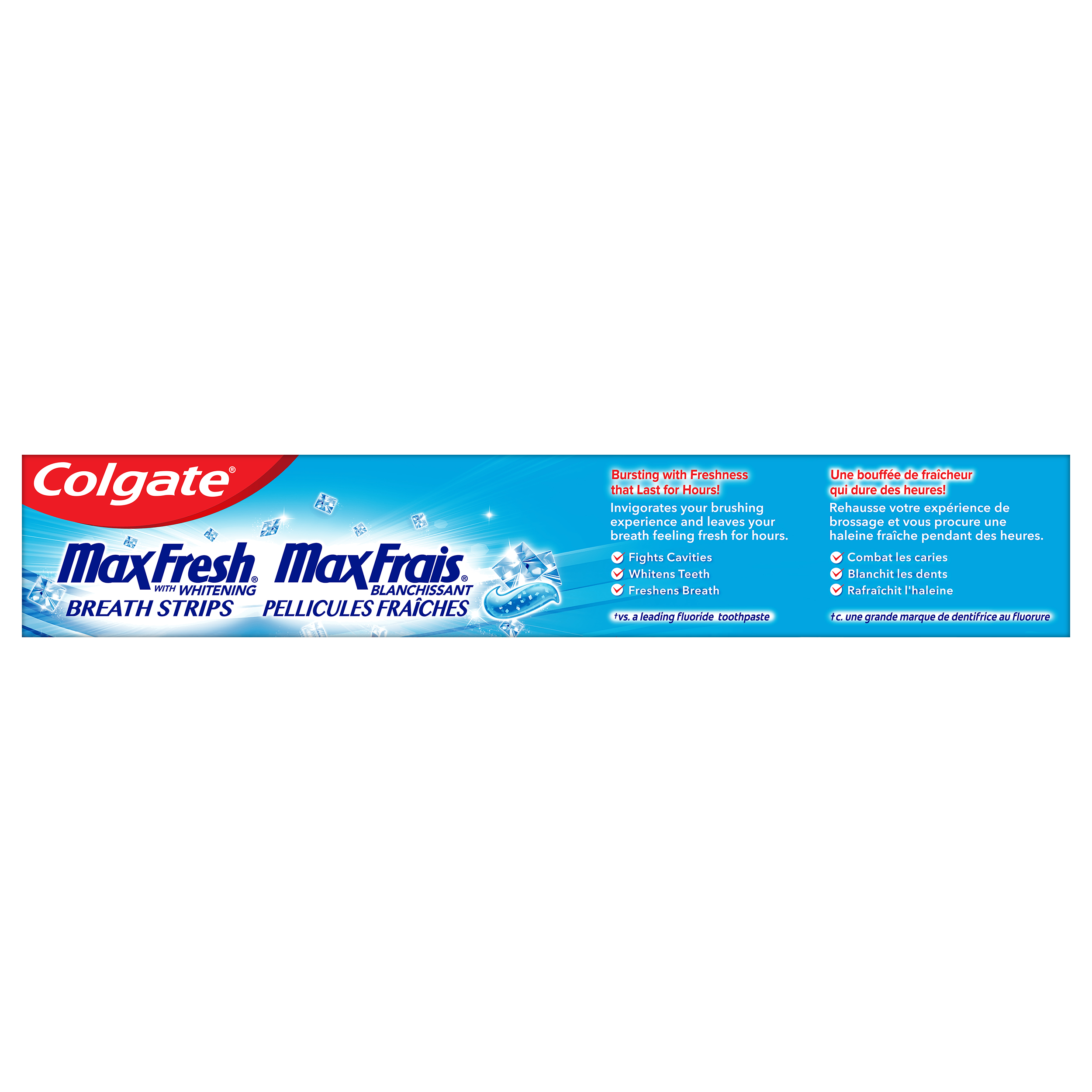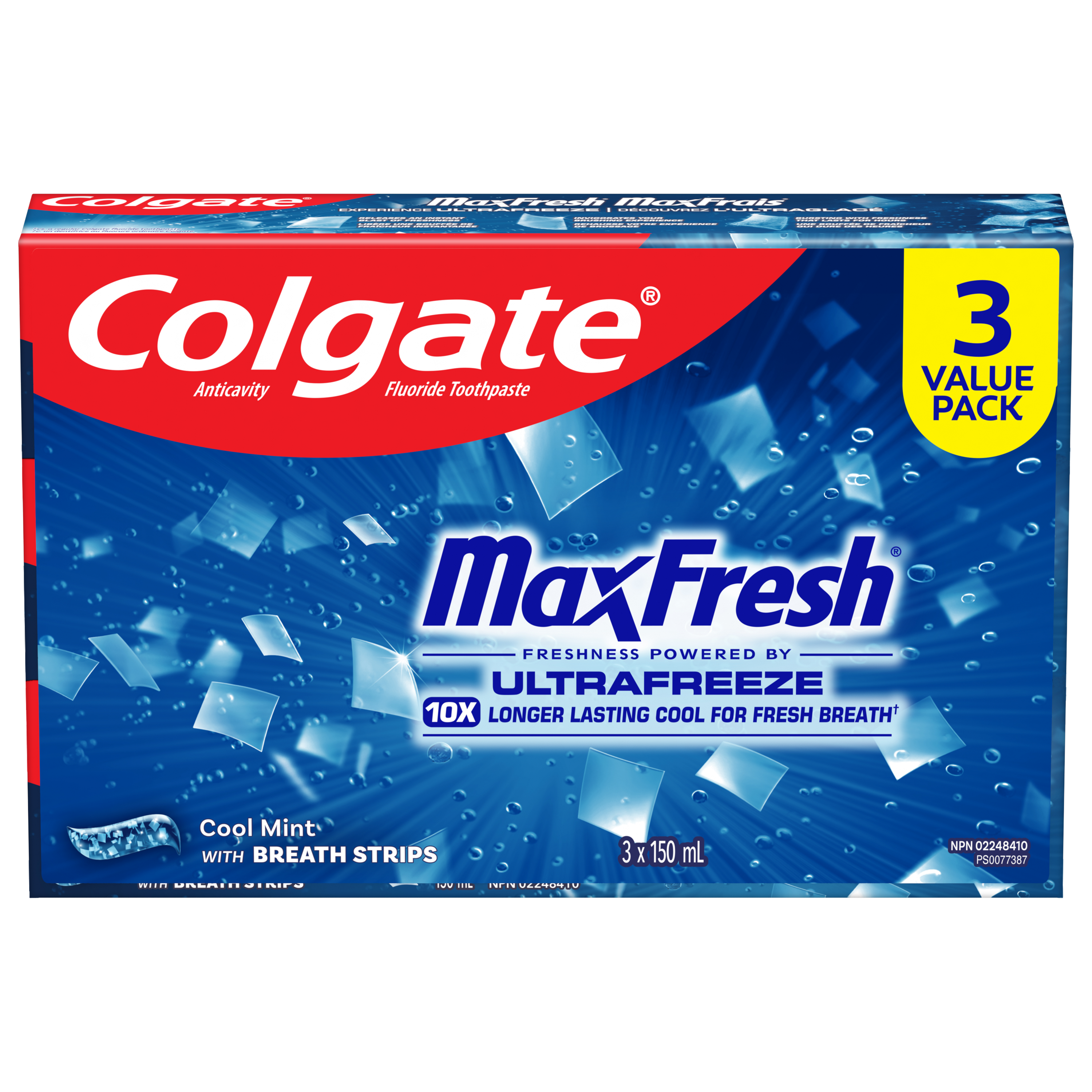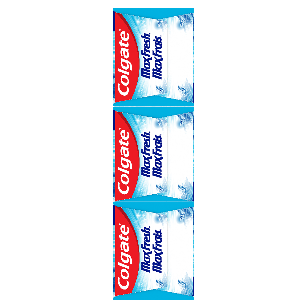 Product Title Colgate Max Fresh Cool Mint Toothpaste 150 mL (3 pack) SKU CA00833A SKU eCommerce Name Colgate Max Fresh Cool Mint Toothpaste 150 mL (3 pack) Consumer Unit - GTIN 00058000142312 Case - GTIN 10058000142319 Product Category Oral Care Product Sub Category Toothpaste Brand Colgate Product Sub Brand Colgate Max Fresh TP Consumer Unit Gross Weight 0.693 KG / 1.528 LB Consumer Unit Net Weight 0.617 KG / 1.360 LB Consumer Unit Length 43.000 MM / 1.693 IN Consumer Unit Width 233.000 MM / 9.173 IN Consumer Unit Height 155.000 MM / 6.102 IN Consumer Unit Volume 1.529 C8 / 0.054 CF Product Title Colgate Max Fresh Cool Mint Toothpaste 150 mL (3 pack) Product Description Release an instant blast of freshness with Colgate MaxFresh Cool Mint Toothpaste. Powered by Ultrafreeze, this invigorating mint toothpaste pack offers 10X longer-lasting cool for fresh breath*. This minty breath freshener toothpaste, with hundreds of mini breath strips, is bursting with freshness that lasts for hours. Colgate MaxFresh Toothpaste comes in a refreshing Cool Mint flavour that invigorates the brushing experience. However, it’s more than just a toothpaste for bad breath, Colgate MaxFresh Cool Mint Toothpaste is also a fluoride toothpaste and helps prevent cavities. With its refreshing Cool Mint flavour and hundreds of mini breath strips, Colgate MaxFresh Toothpaste leaves your breath feeling fresh for hours. Plus, the fluoride-based formula helps fight cavities. Get long-lasting fresh breath with Colgate MaxFresh Toothpaste. *vs. a regular Colgate fluoride toothpaste eCommerce Copy Colgate Max Fresh Toothpaste with Breath Strips and a great Cool Mint flavor fights cavities, whitens teeth, and freshens breath. eCommerce Copy- Long Description You can breathe confidently with Colgate Max Fresh Toothpaste with Breath Strips and a great Cool Mint flavor. Our unique toothpaste formula is packed with hundreds of mini breath strips and unleashes a powerful rush of freshness for long-lasting fresh breath. Colgate Max Fresh Toothpaste with Breath Strips invigorates your brushing experience and leaves your breath feeling fresh for hours. Plus, it fights cavities and whitens teeth leaving you with a healthy smile. Bullet 1 Includes three (3) 150 mL tubes of Colgate MaxFresh Cool Mint Toothpaste Bullet 2 Powered by Ultrafreeze, Colgate MaxFresh Toothpaste provides 10X longer-lasting cool for fresh breath* Bullet 3 Fluoride toothpaste formula helps fight cavities Bullet 4 This minty breath freshener toothpaste pack, with hundreds of mini breath strips, is bursting with freshness that lasts for hours Bullet 5 Release an instant blast of freshness with Colgate MaxFresh Cool Mint Toothpaste for Bad Breath Keywords (eCommerce) tooth paste, toothpastes, paste, best whitening, strips, cavity protection, great taste, halitosis, teeth, tooth wash, clean, stain removal, bleach, healthy, affordable, at home, bad breath, easy, fast, home remedies, do it yourself, dental stain removal, over the counter, noticeable, beautiful, long lasting, refreshing, lightens, freshen, keeps, gel, pearly OS Amazon Product Title Colgate MaxFresh Cool Mint Toothpaste for Bad Breath, Breath Freshener Toothpaste with Fluoride and Hundreds of Mini Breath Strips, Leaves Mouth Feeling Refreshed for Hours, 3 Pack, 150 mL OS Amazon Product Description Release an instant blast of freshness with Colgate MaxFresh Cool Mint Toothpaste. Powered by Ultrafreeze, this invigorating mint toothpaste pack offers 10X longer-lasting cool for fresh breath*. This minty breath freshener toothpaste, with hundreds of mini breath strips, is bursting with freshness that lasts for hours. Colgate MaxFresh Toothpaste comes in a refreshing Cool Mint flavour that invigorates the brushing experience. However, it’s more than just a toothpaste for bad breath, Colgate MaxFresh Cool Mint Toothpaste is also a fluoride toothpaste and helps prevent cavities. With its refreshing Cool Mint flavour and hundreds of mini breath strips, Colgate MaxFresh Toothpaste leaves your breath feeling fresh for hours. Plus, the fluoride-based formula helps fight cavities. Get long-lasting fresh breath with Colgate MaxFresh Toothpaste. *vs. a regular Colgate fluoride toothpaste OS Amazon Bullet 1 Includes three (3) 150 mL tubes of Colgate MaxFresh Cool Mint Toothpaste OS Amazon Bullet 2 Powered by Ultrafreeze, Colgate MaxFresh Toothpaste provides 10X longer-lasting cool for fresh breath* OS Amazon Bullet 3 Fluoride toothpaste formula helps fight cavities OS Amazon Bullet 4 This minty breath freshener toothpaste pack, with hundreds of mini breath strips, is bursting with freshness that lasts for hours OS Amazon Bullet 5 Release an instant blast of freshness with Colgate MaxFresh Cool Mint Toothpaste for Bad Breath OS Walmart Product Title Colgate MaxFresh Cool Mint Toothpaste, 3 Pack, 150 mL OS Walmart Product Description Colgate MaxFresh Cool Mint Toothpaste, 3 Pack, 150 mL Release an instant blast of freshness with Colgate MaxFresh Cool Mint Toothpaste. Powered by Ultrafreeze, this invigorating mint toothpaste pack offers 10X longer-lasting cool for fresh breath (1). This minty breath freshener toothpaste, with hundreds of mini breath strips, is bursting with freshness that lasts for hours. A Fresh Experience in Fighting Bad Breath Colgate MaxFresh Toothpaste comes in a refreshing Cool Mint flavour that invigorates the brushing experience. However, it’s more than just a toothpaste for bad breath, Colgate MaxFresh Cool Mint Toothpaste is also a fluoride toothpaste and helps prevent cavities. Long-Lasting Fresh Breath With its refreshing Cool Mint flavour and hundreds of mini breath strips, Colgate MaxFresh Toothpaste leaves your breath feeling fresh for hours. Plus, the fluoride-based formula helps fight cavities. Get long-lasting fresh breath with Colgate MaxFresh Toothpaste. (1) vs. a regular Colgate fluoride toothpaste OS Walmart Bullet 1 Includes three (3) 150 mL tubes of Colgate MaxFresh Cool Mint