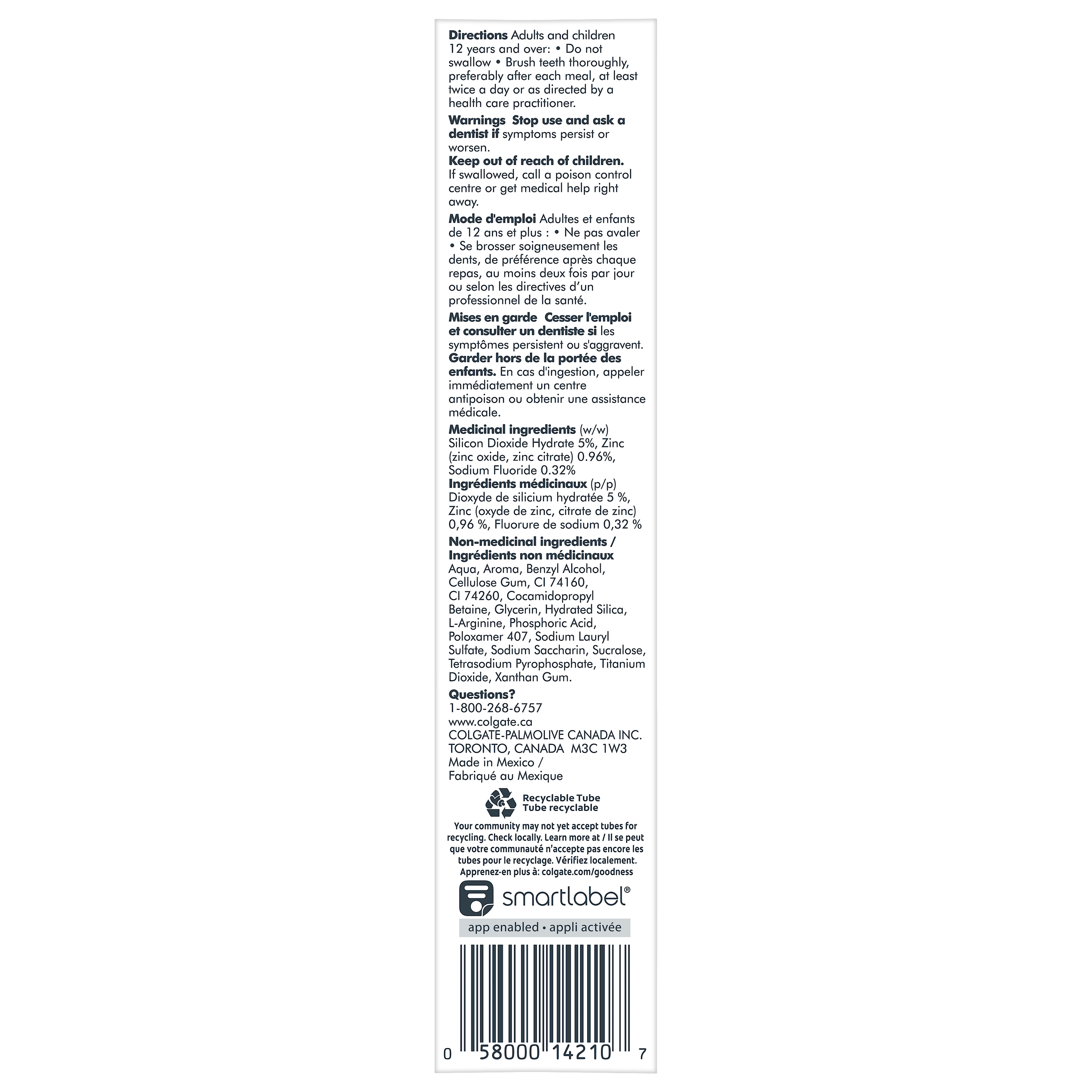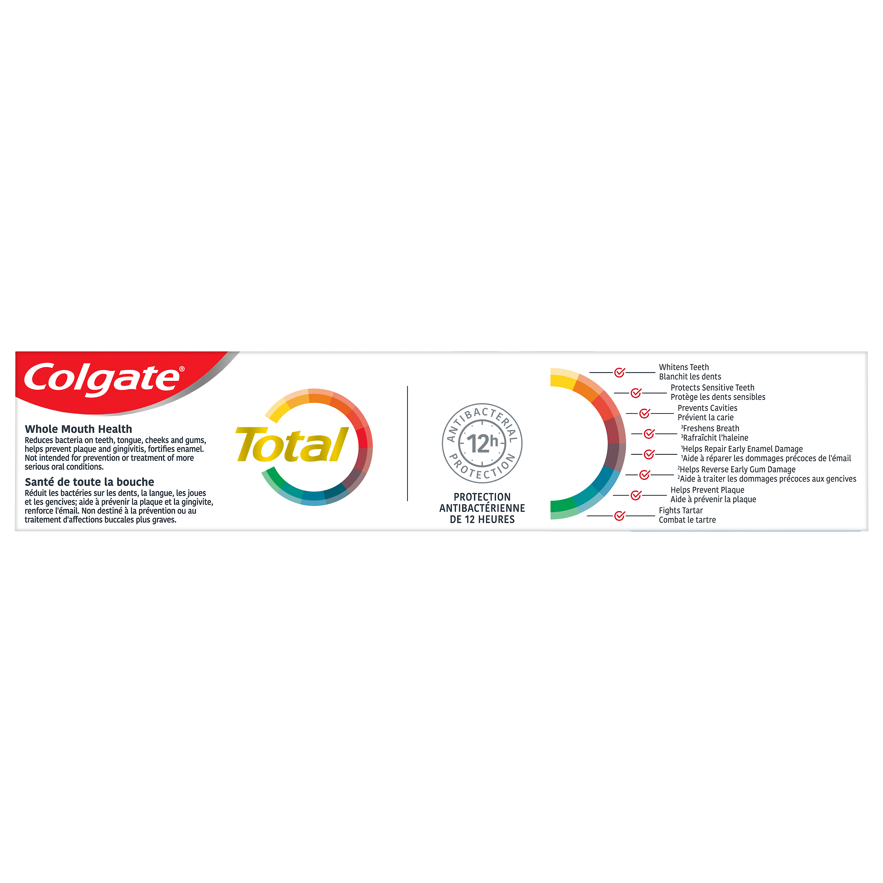 Product Title Colgate Total Whitening Toothpaste Gel, Multi-Benefit Teeth Whitening Toothpaste That Whitens Teeth, Freshens Breath & Protects Sensitive Teeth, 120 mL, 3 Pack SKU CA00839A SKU eCommerce Name Colgate Total Whitening Toothpaste Gel, Multi-Benefit Teeth Whitening Toothpaste That Whitens Teeth, Freshens Breath & Protects Sensitive Teeth, 120 mL, 3 Pack Consumer Unit - GTIN 00058000142435 Case - GTIN 10058000142432 Product Category Oral Care Product Sub Category Toothpaste Brand Colgate Product Sub Brand Colgate Total TP Consumer Unit Gross Weight 0.587 KG / 1.294 LB Consumer Unit Net Weight 0.464 KG / 1.023 LB Consumer Unit Length 196.000 MM / 7.717 IN Consumer Unit Width 42.000 MM / 1.654 IN Consumer Unit Height 152.000 MM / 5.984 IN Consumer Unit Volume 1.218 C8 / 0.043 CF Product Title Colgate Total Whitening Toothpaste Gel, Multi-Benefit Teeth Whitening Toothpaste That Whitens Teeth, Freshens Breath & Protects Sensitive Teeth, 120 mL, 3 Pack eCommerce Copy <bulletlist><bullet>Three 120 mL tubes of Colgate Total Whitening Toothpaste Gel</bullet> <bullet>New look, same great formula and flavor</bullet> <bullet>Colgate Total toothpaste is a multi-benefit toothpaste that whitens teeth, protects sensitive teeth, freshens breath, prevents cavities, and strengthens enamel</bullet> <bullet>Provides 12 hour antibacterial protection against germs that cause plaque and gingivitis</bullet> <bullet>Colgate Total is also a sensitive toothpaste that actively helps to prevent recurrent problems like sensitivity and gingivitis</bullet> <bullet>Help repair early enamel damage, help reverse early gum damage, and freshen breath with Colgate Total</bullet> <bullet>For a healthy mouth, brush with Colgate Total and reduce bacteria on teeth, tongue, cheeks and gums</bullet> <bullet>Mint gel toothpaste instantly neutralizes odours associated with bad breath</bullet> <bullet>Easily stock multiple bathrooms with this convenient toothpaste pack</bullet></bulletlist> eCommerce Copy- Long Description Colgate Total Whitening Toothpaste Gel, 120 mL, 3 Tubes