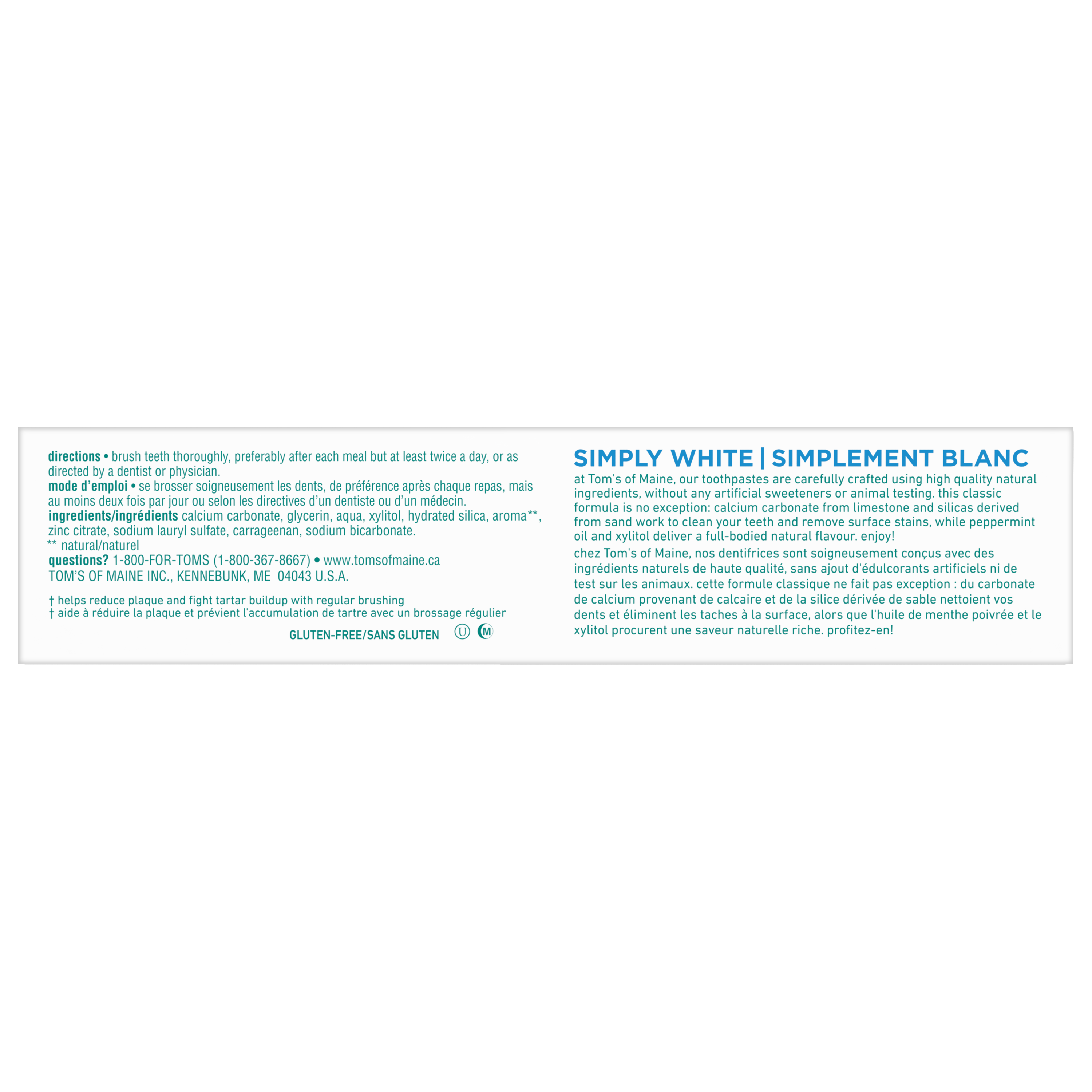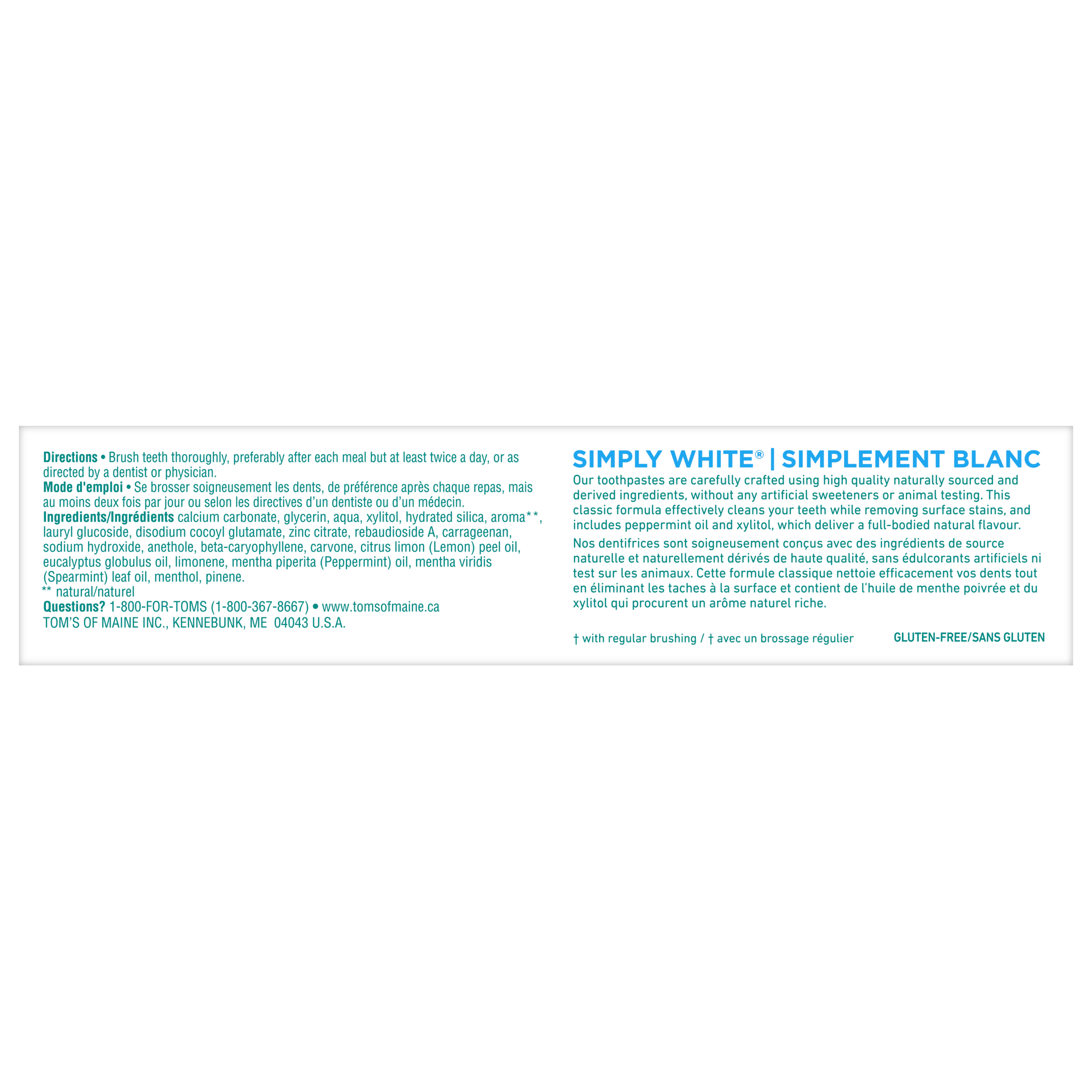 Product Title Tom's of Maine Simply White Fluoride-Free Natural Toothpaste, Peppermint, 85 mL (2 Pack) SKU CA00849A SKU eCommerce Name Tom's of Maine Simply White Fluoride-Free Natural Toothpaste, Peppermint, 85 mL (2 Pack) Consumer Unit - GTIN 00077326142622 Case - GTIN 10077326142629 Product Category Oral Care Product Sub Category Toothpaste Brand Tom's Product Sub Brand Tom's Simply White TP Consumer Unit Gross Weight 0.340 KG / 0.750 LB Consumer Unit Net Weight 0.262 KG / 0.578 LB Consumer Unit Length 37.000 MM / 1.457 IN Consumer Unit Width 110.000 MM / 4.331 IN Consumer Unit Height 166.000 MM / 6.535 IN Consumer Unit Volume 0.651 C8 / 0.023 CF Product Title Tom's of Maine Simply White Fluoride-Free Natural Toothpaste, Peppermint, 85 mL (2 Pack) eCommerce Copy Emballage de dentifrice sans fluorure Simplement blanc de Tom's of Maine, menthe poivrée, 170 mL Retrouvez la beauté naturelle de votre sourire avec l’emballage de dentifrice sans fluorure Simplement blanc de Tom's of Maine. Cet emballage double de dentifrice blanchissant naturel sans fluorure aide à blanchir les dents* et combat l’accumulation de tartre**. De plus, il est proposé dans une saveur rafraîchissante de dentifrice à la menthe poivrée pour que votre haleine reste fraîche pendant le brossage. *en éliminant les taches à la surface **avec un brossage régulier eCommerce Copy- Long Description Emballage de dentifrice sans fluorure Simplement blanc de Tom's of Maine, menthe poivrée, 170 mL Retrouvez la beauté naturelle de votre sourire avec l’emballage de dentifrice sans fluorure Simplement blanc de Tom's of Maine. Cet emballage double de dentifrice blanchissant naturel sans fluorure aide à blanchir les dents* et combat l’accumulation de tartre**. De plus, il est proposé dans une saveur rafraîchissante de dentifrice à la menthe poivrée pour que votre haleine reste fraîche pendant le brossage. Dentifrice sans fluorure pour le blanchiment dentaire Le dentifrice à la menthe Simplement blanc de Tom's of Maine est un dentifrice naturel qui aide à blanchir les dents en éliminant les taches à la surface. La formule spécialement conçue peut même aider à combattre l'accumulation de tartre avec un brossage régulier. Rafraîchissez l'haleine et aidez à blanchir les dents* avec le dentifrice sans fluorure Simplement blanc de Tom's of Maine. Un dentifrice dont on peut se réjouir Le dentifrice Simplement blanc de Tom's of Maine est un dentifrice sans gluten qui est exempt d’arômes, d’édulcorants et de colorants artificiels et qui n’a pas été testé sur les animaux. Voilà une chose dont on peut se réjouir. *en éliminant les taches à la surface **avec un brossage régulier Keywords (eCommerce) dentifrice à la menthe dentifrice blanchissant naturel dentifrice sans fluorure dentifrice blanchissant dentifrice à la menthe poivrée emballage de dentifrice OS Amazon Product Title Tom’s of Maine Simply White Fluoride Free Toothpaste Pack, Whitening Toothpaste Pack, Helps Whiten Teeth and Fights Tartar Buildup, Fluoride Free, Peppermint, 2 Pack, 170mL OS Amazon Product Description Bring back the natural beauty of your smile with the Tom’s of Maine Simply White Fluoride Free Toothpaste Pack. This twin pack of fluoride free natural whitening toothpaste helps whiten teeth* and fights tartar buildup**. Plus, it comes in a refreshing Peppermint toothpaste flavour to keep your breath minty fresh while you brush. Tom’s of Maine Simply White Mint Toothpaste is a natural toothpaste that helps whiten teeth by removing surface stains. The specially designed formula can even help fight tartar buildup with regular brushing. Freshen breath and help whiten teeth* with Tom’s of Maine Simply White Fluoride Free Toothpaste. Tom's of Maine Simply White Toothpaste is a gluten free toothpaste that is free from artificial flavours, sweeteners, dyes, and has not been tested on animals. Now that’s something you can feel good about. *by removing surface stains **with regular brushing OS Amazon Bullet 1 Includes two (2) 85mL tubes of Tom’s of Maine Simply White Fluoride Free Toothpaste, Peppermint Toothpaste OS Amazon Bullet 2 Natural whitening toothpaste helps whiten teeth by removing surface stains OS Amazon Bullet 3 Refreshing Peppermint flavour helps freshen your breath every time you brush with this mint toothpaste pack OS Amazon Bullet 4 Tom’s of Maine Simply White Fluoride Free Toothpaste fights tartar buildup with regular brushing OS Amazon Bullet 5 This teeth whitening toothpaste pack is formulated without fluoride and helps gently whiten teeth by removing surface stains when brushing OS Walmart Product Title Tom’s of Maine Simply White Fluoride Free Toothpaste, Peppermint, 2 Pack, 170mL OS Walmart Product Description Tom’s of Maine Simply White Fluoride Free Toothpaste, Peppermint, 2 Pack, 170mL Bring back the natural beauty of your smile with the Tom’s of Maine Simply White Fluoride Free Toothpaste Pack. This twin pack of fluoride free natural whitening toothpaste helps whiten teeth* and fights tartar buildup**. Plus, it comes in a refreshing Peppermint toothpaste flavour to keep your breath minty fresh while you brush. Fluoride Free Toothpaste for Whitening Teeth Tom’s of Maine Simply White Mint Toothpaste is a natural toothpaste that helps whiten teeth by removing surface stains. The specially designed formula can even help fight tartar buildup with regular brushing. Freshen breath and help whiten teeth* with Tom’s of Maine Simply White Fluoride Free Toothpaste. A Toothpaste You Can Feel Good About Tom's of Maine Simply White Toothpaste is a gluten free toothpaste that is free from artificial flavours, sweeteners, dyes, and has not been tested on animals. Now that’s something you can feel good about. *by removing surface stains **with regular brushing OS Walmart Bullet 1 Includes two (2) 85mL tubes of Tom’s of Maine Simply White Fluoride Free Toothpaste, Peppermint Toothpaste O