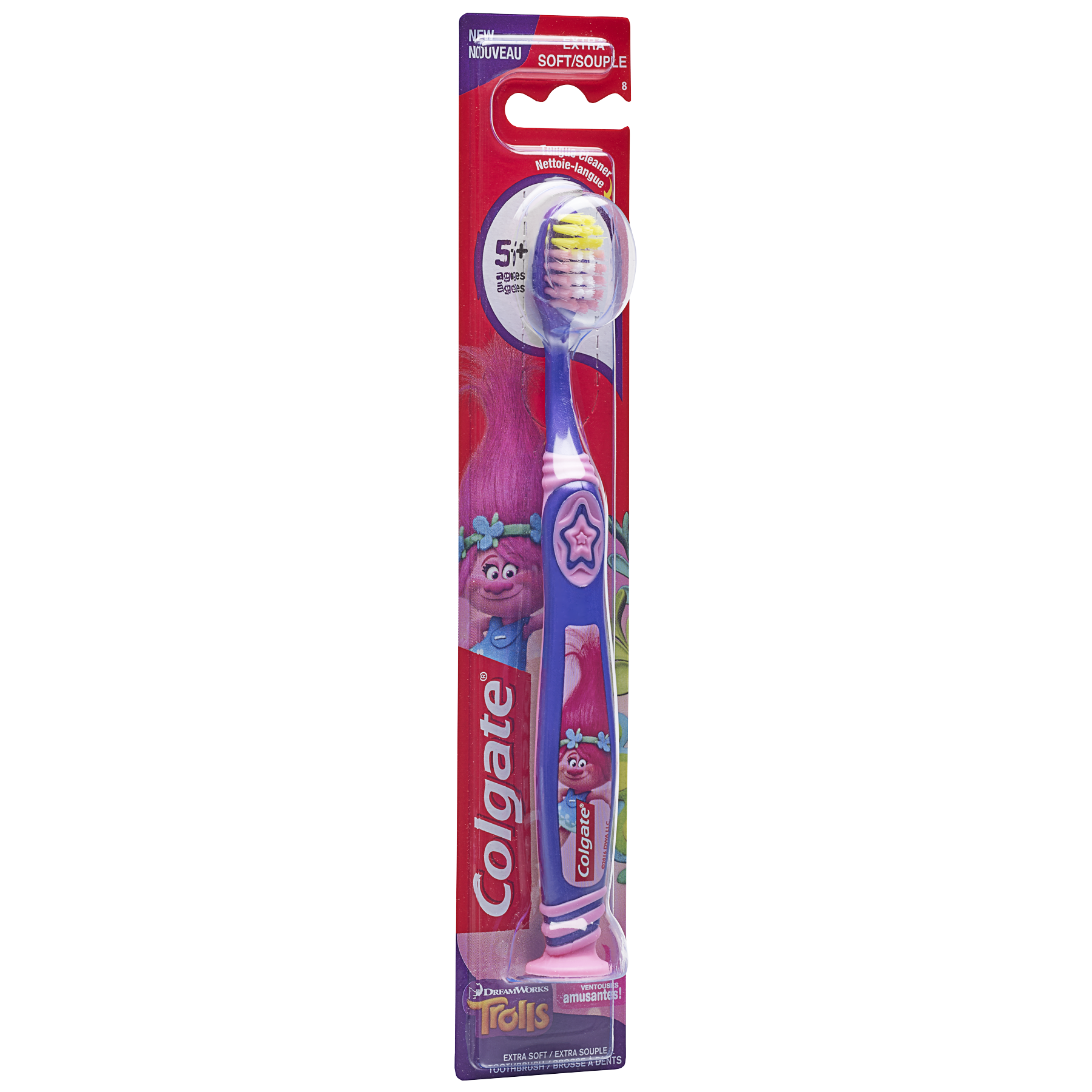 Product Title Colgate* Kids Trolls™ Toothbrush SKU CN05143A SKU eCommerce Name Colgate* Kids Trolls™ Toothbrush Consumer Unit - GTIN 00035000449917 Case - GTIN 10035000449914 Product Category Oral Care Product Sub Category Manual TB Brand Colgate Product Sub Brand Colgate Kids Man TB Consumer Unit Gross Weight 0.020 KG / 0.044 LB Consumer Unit Net Weight 0.016 KG / 0.035 LB Consumer Unit Length 15.000 MM / 0.591 IN Consumer Unit Width 42.000 MM / 1.654 IN Consumer Unit Height 229.000 MM / 9.016 IN Consumer Unit Volume 0.142 C8 / 0.005 CF Product Title Colgate* Kids Trolls™ Toothbrush eCommerce Copy Colgate* Kids Trolls™ Toothbrush is designed for children ages 5+ with both baby teeth and adult teeth. This toothbrush features extra soft bristles, a tongue cleaner, and a fun suction cup for upright storage! eCommerce Copy- Long Description Colgate* Kids Trolls™ Toothbrush is designed for children ages 5+ with both baby teeth and adult teeth. This toothbrush features extra soft, multi-height bristles to clean big and small teeth, and a raised tip to clean hard-to-reach back teeth. Plus, it features a unique soft tongue cleaner and a suction cup for easy and fun upright storage. Keywords (eCommerce) toothbrush, tooth, brush, tooth brush, brushing, gums, oral, care, clean, ultra soft, bristles, anti-cavity, nickelodeon, nick, child, childrens, sensitive, characters, cartoons, small head, safe, fun, toddler, boy, girl