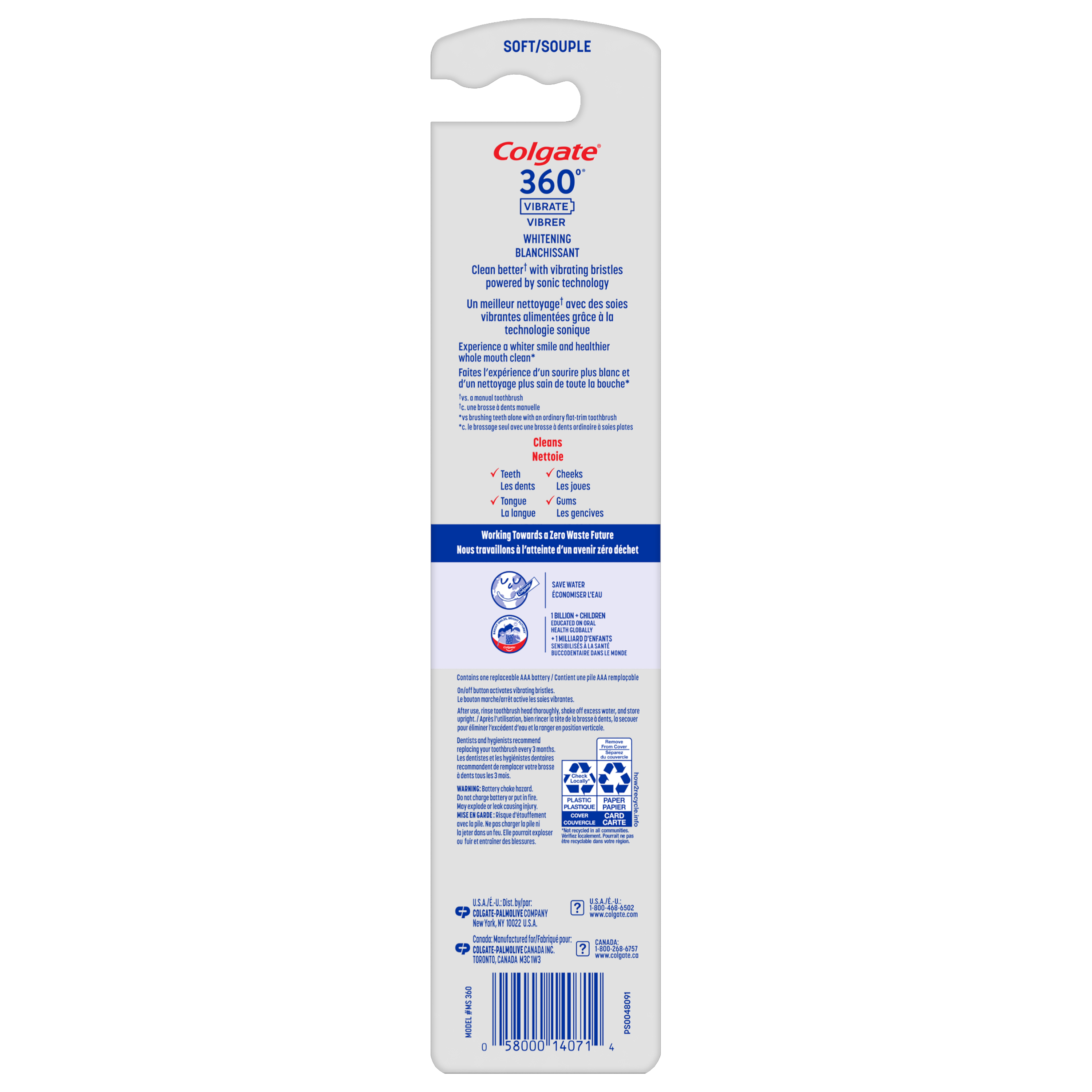 Product Title Colgate® 360°® Optic White® Sonic Power TM/MC SKU CN05776A SKU eCommerce Name Colgate® 360°® Optic White® Sonic Power TM/MC Consumer Unit - GTIN 00058000140714 Case - GTIN 10058000140711 Product Category Oral Care Product Sub Category Battery TB Brand Colgate Product Sub Brand Colgate 360 Hybrid BTB Consumer Unit Gross Weight 0.046 KG / 0.101 LB Consumer Unit Net Weight 0.036 KG / 0.079 LB Consumer Unit Length 25.000 MM / 0.984 IN Consumer Unit Width 51.000 MM / 2.008 IN Consumer Unit Height 230.000 MM / 9.055 IN Consumer Unit Volume 0.283 C8 / 0.010 CF Product Title Colgate® 360°® Optic White® Sonic Power TM/MC eCommerce Copy The Colgate 360⁰ Optic White Sonic Power toothbrush has 2X whitening action by whitening teeth in 2 ways. This powered toothbrush lets you activate 20,000 sonic strokes per minute with the simple touch of a button and includes a tongue and cheek cleaner. Battery is included. eCommerce Copy- Long Description Experience a whiter smile and a healthier whole mouth clean† with the new Colgate 360⁰ Optic White Sonic Power toothbrush. The Colgate 360⁰ Optic White Sonic Power toothbrush combines 20,000 strokes per minute with spiral bristles and polishing cups to help remove dental plaque and surface stains. This powered toothbrush includes a tongue & cheek cleaner to help remove bacteria for a healthier whole mouth clean.† Battery is included. †vs. brushing teeth alone with a flat-trim toothbrush Keywords (eCommerce) soft toothbrush bristles, colgate optic white teeth whitening, whitening, vibrating toothbrush, batteries aaa included, sonic power electric toothbrush, cheek tongue cleaner, toothbrushes OS Amazon Product Title Colgate 360 Vibrate Whitening Battery-Operated Toothbrush, Disposable Electric Toothbrush with 1 AAA Battery Included, Helps Whiten Teeth, Whole Mouth Clean, 1 Pack OS Amazon Product Description Colgate 360 Vibrate Whitening Battery-Operated Toothbrush combines the power of a battery-operated toothbrush with the familiarity of a manual toothbrush head for a brighter, whiter smile*. This full mouth vibrating toothbrush uses soft Floss Tip bristles** to clean between teeth. The whitening toothbrush is perfect for travel because it’s battery-powered, so it can be used wherever you go (1 AAA battery included). Experience a whiter smile* and a healthier whole mouth clean with just a press of a button with the Colgate 360 battery powered toothbrush. This disposable electric toothbrush cleans the teeth, cheeks, tongue, and gums so you can enjoy a whole mouth clean with every brush. The soft, vibrating toothbrush bristles deliver powerful cleaning using sonic technology. Clean better*** with vibrating bristles powered by sonic technology with the Colgate 360 disposable electric battery whitening toothbrush. *vs. brushing teeth alone with an ordinary flat trim toothbrush **does not replace flossing ***vs. a manual toothbrush OS Amazon Bullet 1 Includes one (1) Colgate 360 Vibrate Whitening Battery-Operated Toothbrush, 1 AAA battery included OS Amazon Bullet 2 Combines the familiarity of a manual soft toothbrush head with the power of a battery-operated toothbrush OS Amazon Bullet 3 Whitening toothbrush features soft Floss Tip bristles** that help clean between teeth (**does not replace flossing) OS Amazon Bullet 4 Powerful sonic technology delivers incredible cleaning power with a simple press of a button on the vibrating toothbrush OS Amazon Bullet 5 Battery powered toothbrush cleans the whole mouth including the teeth, cheeks, tongue, and gums so you can enjoy a whole mouth clean with every brush OS Amazon On Page Keywords manual toothbrush, vibrating toothbrush OS Walmart Product Title Colgate 360 Vibrate Whitening Battery-Operated Toothbrush with 1 AAA Battery OS Walmart Product Description ### Colgate 360 Vibrate Whitening Battery-Operated Toothbrush, 1 Pack Colgate 360 Vibrate Whitening Battery-Operated Toothbrush combines the power of a battery-operated toothbrush with the familiarity of a manual toothbrush head for a brighter, whiter smile*. This full mouth vibrating toothbrush uses soft Floss Tip bristles** to clean between teeth. The whitening toothbrush is perfect for travel because it’s battery-powered, so it can be used wherever you go (1 AAA battery included). ### Whitening Action With Just a Press of a Button ### Experience a whiter smile* and a healthier whole mouth clean with just a press of a button with the Colgate 360 battery powered toothbrush. This disposable electric toothbrush cleans the teeth, cheeks, tongue, and gums so you can enjoy a whole mouth clean with every brush. The soft, vibrating toothbrush bristles deliver powerful cleaning using sonic technology. Clean better*** with vibrating bristles powered by sonic technology with the Colgate 360 disposable electric battery whitening toothbrush. *vs. brushing teeth alone with an ordinary flat trim toothbrush **does not replace flossing ***vs. a manual toothbrush OS Walmart Bullet 1 Includes one (1) Colgate 360 Vibrate Whitening Battery-Operated Toothbrush, 1 AAA battery included OS Walmart Bullet 2 Combines the familiarity of a manual soft toothbrush head with the power of a battery-operated toothbrush OS Walmart Bullet 3 Whitening toothbrush features soft Floss Tip bristles** that help clean between teeth (**does not replace flossing) OS Walmart Bullet 4 Powerful sonic technology delivers incredible cleaning power with a simple press of a button on the vibrating toothbrush OS Walmart Bullet 5 Battery powered toothbrush cleans the whole mouth including the teeth, cheeks, tongue, and gums so you can enjoy a whole mouth clean with every brush OS Walmart Bullet 6 Clean better*** with vibrating bristles powered by sonic technology using the Colgate 360 Vibrate Whitening Toothbrush (***vs. a manual toothbrush) OS Walmart Bullet 7 Experience a whiter smile* with the Colgate 360 Vibrate Whitening Soft Toothbrush (*vs. brushing teeth alone with an ord