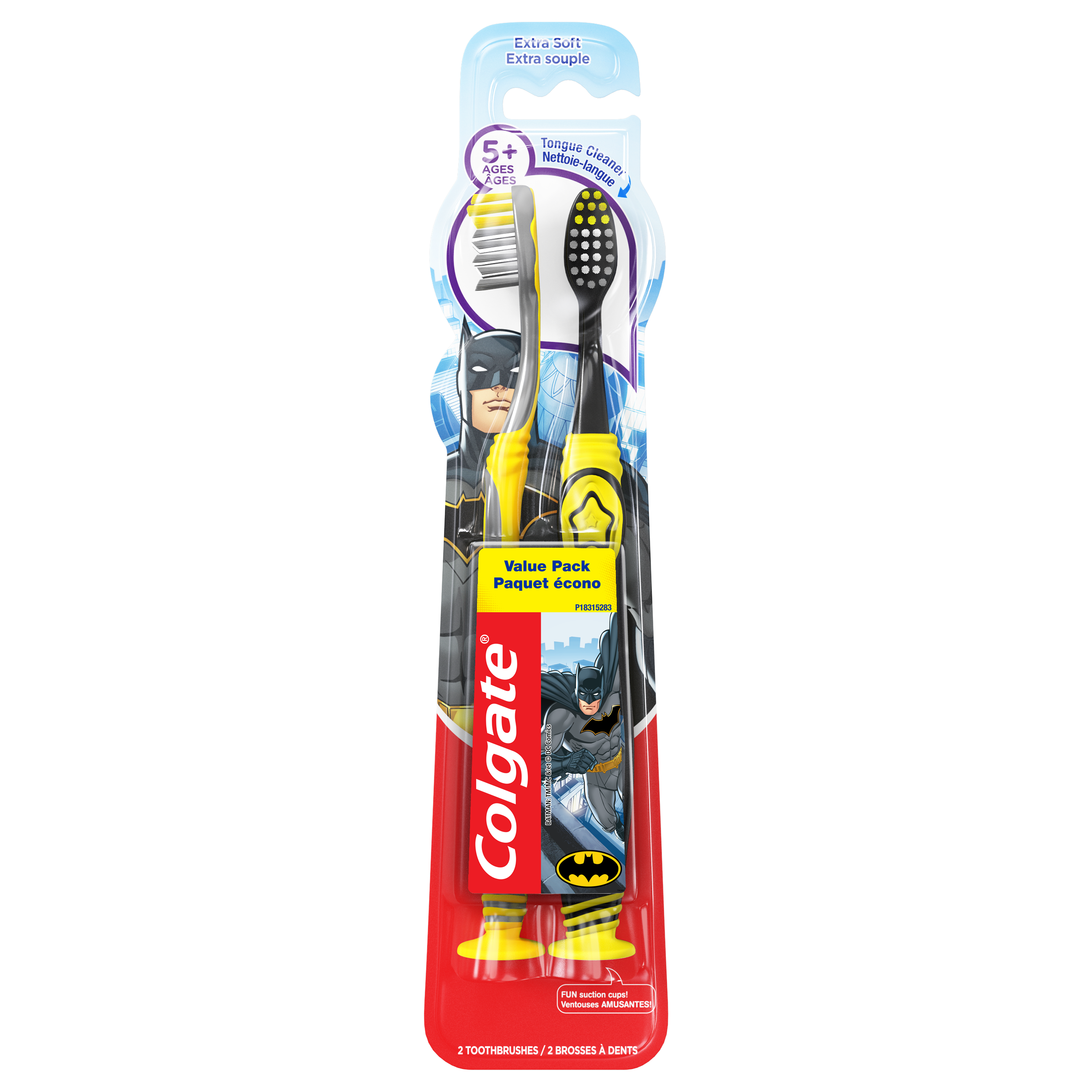 Product Title COLG KIDS MTB CS MU BATMAN 2PK SKU CN06970A Consumer Unit - GTIN 00035000467713 Case - GTIN 10035000467710 Product Category Oral Care Product Sub Category Manual TB Brand Colgate Product Sub Brand Colgate Kids Man TB Consumer Unit Gross Weight 0.060 KG / 0.132 LB Consumer Unit Net Weight 0.034 KG / 0.075 LB Consumer Unit Length 229.000 MM / 9.016 IN Consumer Unit Width 52.000 MM / 2.047 IN Consumer Unit Height 23.000 MM / 0.906 IN Consumer Unit Volume 0.274 C8 / 0.010 CF Product Title COLG KIDS MTB CS MU BATMAN 2PK OS Amazon Product Title Colgate Kids Extra Soft Toothbrush with Suction Cup, Twin Pack - Batman OS Amazon Product Description Colgate Kids Batman Extra Soft Manual Toothbrush is a fun way to encourage good oral care habits early on! This toothbrush is specially designed for children with both baby & adult teeth. It features a suction cup for easy and fun upright storage, a thumb grip and rounded handle for a comfortable grip, and the unique soft tongue cleaner on the back of the toothbrush head to clean beyond teeth. OS Amazon Bullet 1 Small head for easy access to a child's mouth OS Amazon Bullet 2 Thumb grip and rounded handle for a comfortable grip OS Amazon Bullet 3 Suction cup for easy and fun upright storage OS Amazon Bullet 4 For children ages 5+ with both baby teeth and adult teeth OS Walmart Product Title Colgate Kids Extra Soft Toothbrush with Suction Cup, Twin Pack - Batman OS Walmart Product Description Colgate Kids Batman Extra Soft Manual Toothbrush is designed for children with both baby & adult teeth. Our unique soft tongue cleaner on back of the head to encourage good oral care habits early on. OS Walmart Bullet 1 Small head for easy access to a child's mouth OS Walmart Bullet 2 Thumb grip and rounded handle for a comfortable grip OS Walmart Bullet 3 Suction cup for easy and fun upright storage OS Walmart Bullet 4 For children ages 5+ with both baby teeth and adult teeth Walmart Bullet 1 Small head for easy access to a child's mouth Walmart Bullet 2 Thumb grip and rounded handle for a comfortable grip Walmart Bullet 3 Suction cup for easy and fun upright storage Walmart Bullet 4 Specially designed for children 2 years and older with developing teeth