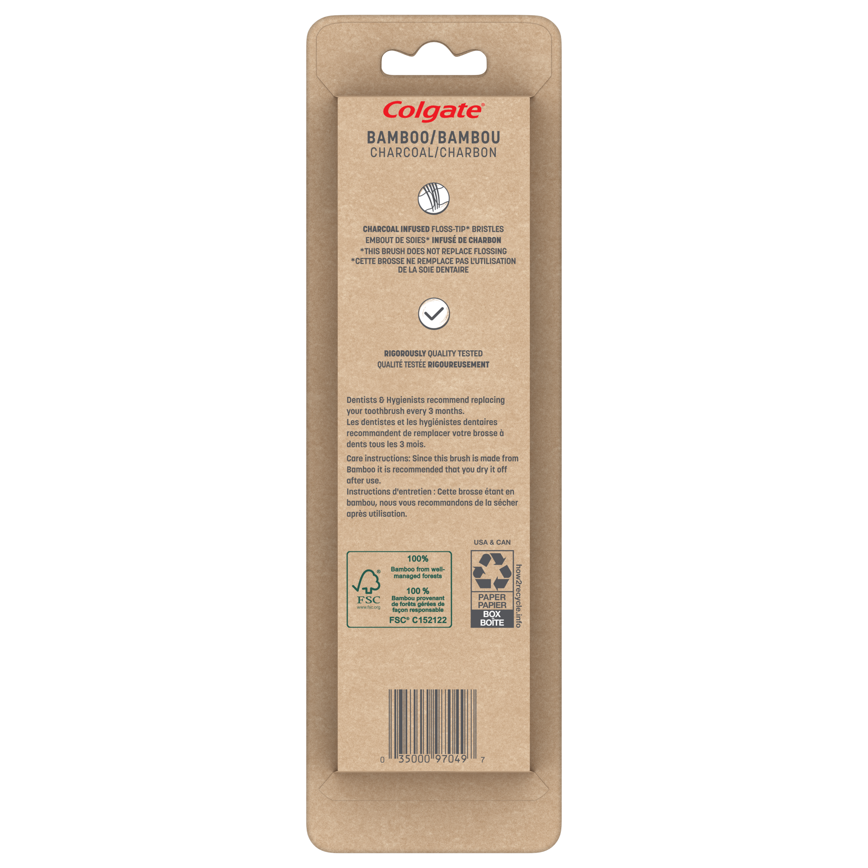 Product Title Colgate Bamboo Charcoal Toothbrush, Soft SKU CN07811A SKU eCommerce Name Colgate Bamboo Charcoal Toothbrush, Soft Consumer Unit - GTIN 00035000970497 Case - GTIN 10035000970494 Product Category Oral Care Product Sub Category Manual TB Brand Colgate Product Sub Brand Colgate Bamboo Man TB Consumer Unit Gross Weight 0.050 KG / 0.110 LB Consumer Unit Net Weight 0.018 KG / 0.040 LB Consumer Unit Length 229.000 MM / 9.016 IN Consumer Unit Width 70.000 MM / 2.756 IN Consumer Unit Height 18.000 MM / 0.709 IN Consumer Unit Volume 0.289 C8 / 0.010 CF Product Title Colgate Bamboo Charcoal Toothbrush, Soft eCommerce Copy The Colgate Bamboo Charcoal Toothbrush is good for you and good for the environment. eCommerce Copy- Long Description The Colgate Bamboo Charcoal Toothbrush is good for you and good for the environment. The handle of this soft bristle toothbrush is made from 100% natural, sustainably grown bamboo, and because it’s from Colgate, you know it’s been tested to meet our high standards. Keywords (eCommerce) bamboo toothbrush, high quality bamboo toothbrush, colgate bamboo toothbrush, bamboo charcoal, bamboo charcoal toothbrush, colgate bamboo charcoal