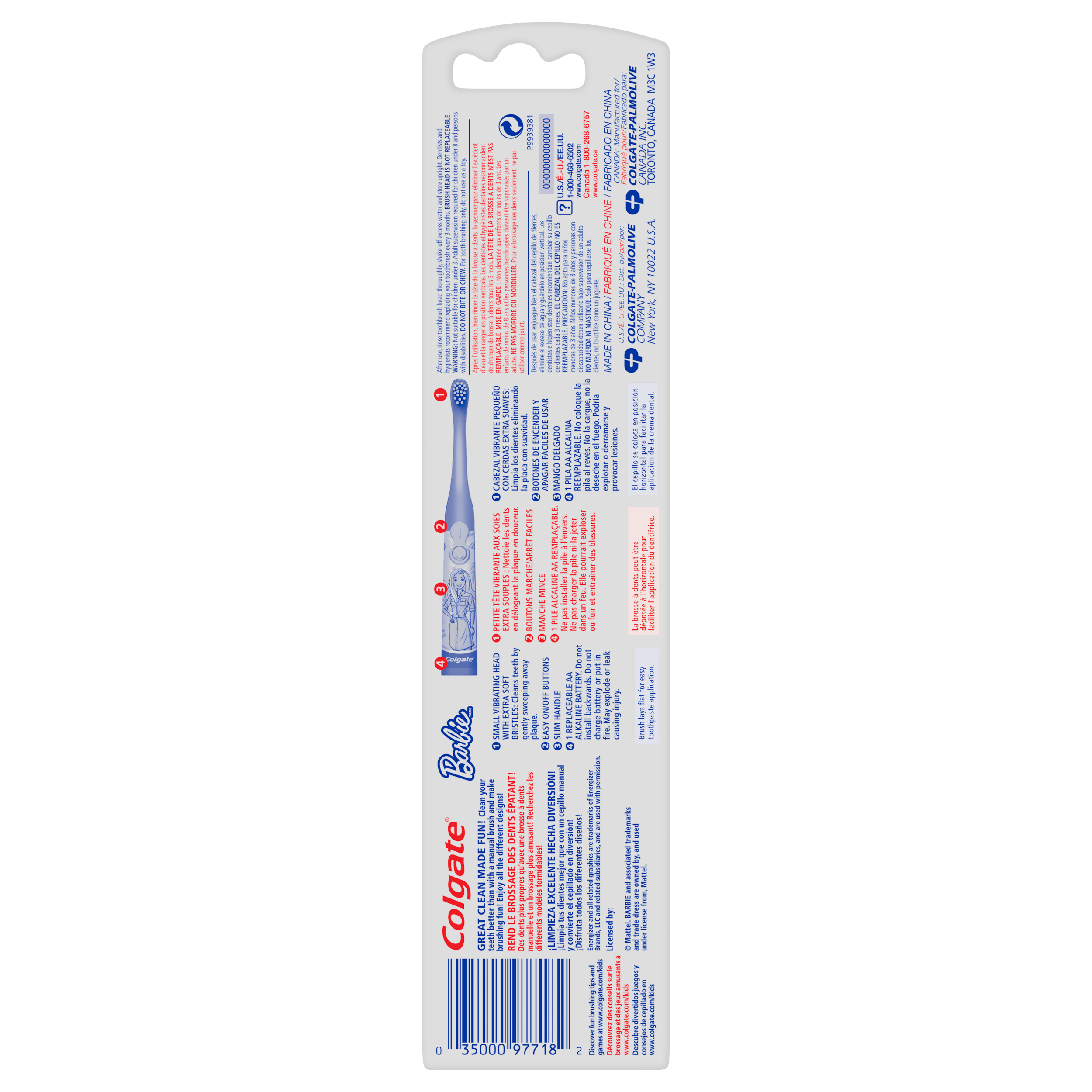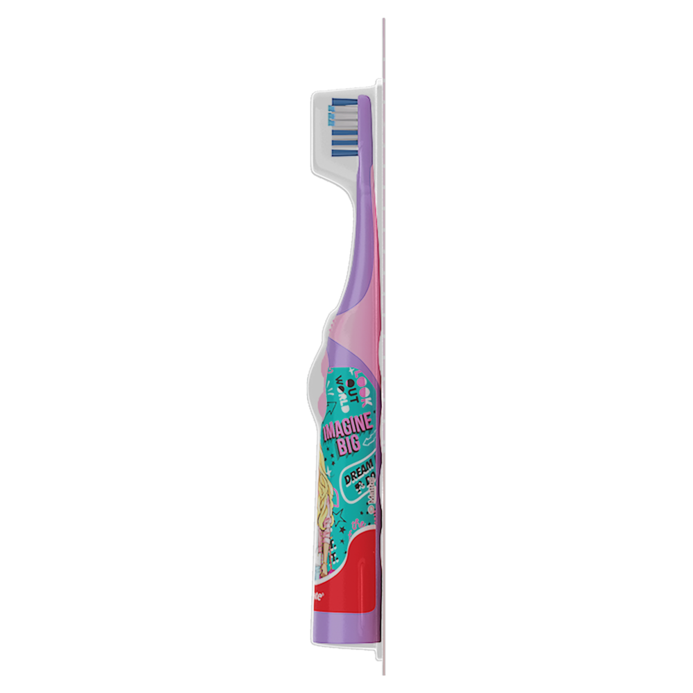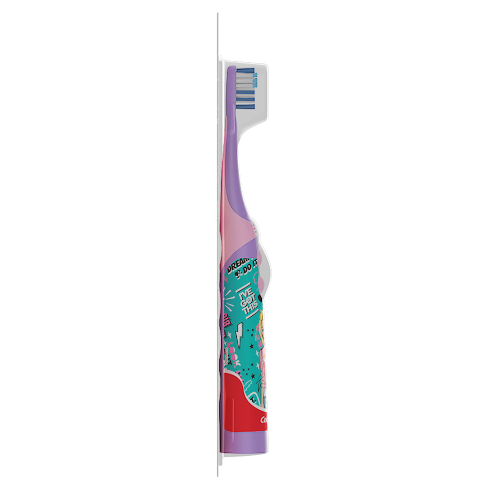 Product Title Colgate Kids Sonic Powered Battery Toothbrush, Barbie SKU CN08098A SKU eCommerce Name Colgate Kids Sonic Powered Battery Toothbrush, Barbie Consumer Unit - GTIN 00035000977182 Case - GTIN 10035000977189 Product Category Oral Care Product Sub Category Battery TB Brand Colgate Product Sub Brand Colgate Kids BTB Consumer Unit Gross Weight 0.071 KG / 0.157 LB Consumer Unit Net Weight 0.058 KG / 0.128 LB Consumer Unit Length 26.000 MM / 1.024 IN Consumer Unit Width 55.000 MM / 2.165 IN Consumer Unit Height 230.000 MM / 9.055 IN Consumer Unit Volume 0.311 C8 / 0.011 CF Product Title Colgate Kids Sonic Powered Battery Toothbrush, Barbie eCommerce Copy Colgate Kids Barbie Sonic Powered Battery Toothbrush has a small vibrating head that cleans teeth and gently sweeps away plaque. This kids toothbrush powered by sonic technology has extra soft bristles to gently clean teeth, a slim handle, and an easy on/off button. eCommerce Copy- Long Description Great clean made fun. Your little one will look forward to brushing more often with the Colgate Barbie Kids Sonic Powered Battery Toothbrush. The item is sure to make cleaning those pearly whites more fun. Its unique design features a small, vibrating head with extra-soft bristles and a slim handle that's easy for small hands to hold. This kids toothbrush powered by sonic technology lies flat to allow children to easily apply toothpaste. The item is available in different designs to encourage kids to take care of their teeth. Keywords (eCommerce) tooth brush, boys, girls, childrens, fun, gums, oral, care, clean, ultra soft, bristles, anti-cavity, child, children's, sensitive, characters, cartoons, small head, safe, fun, little hands, motion, vibrating, battery operated toothbrush, battery powered toothbrush, battery toothbrush, kids toothbrush, kids tooth brush, children's toothbrush, children's tooth brush, kid's toothbrush, kid's tooth brush, best electric toothbrush, best electric toothbrushes, best toothbrush, best toothbrushes, electric brushes, electric toothbrush, electric toothbrush best, electric toothbrushes, electric toothbrushes best, electric toothbrushes for kids, extra soft toothbrush, kids electric toothbrushes, powered toothbrush, soft toothbrush, the best toothbrush, tooth brushes, toothbrush, toothbrushes, toothbrushes electric, barbie