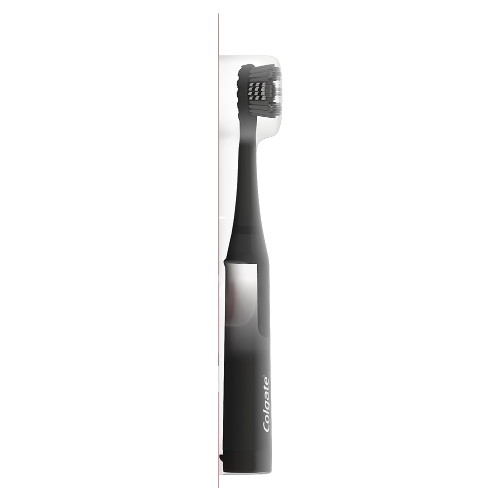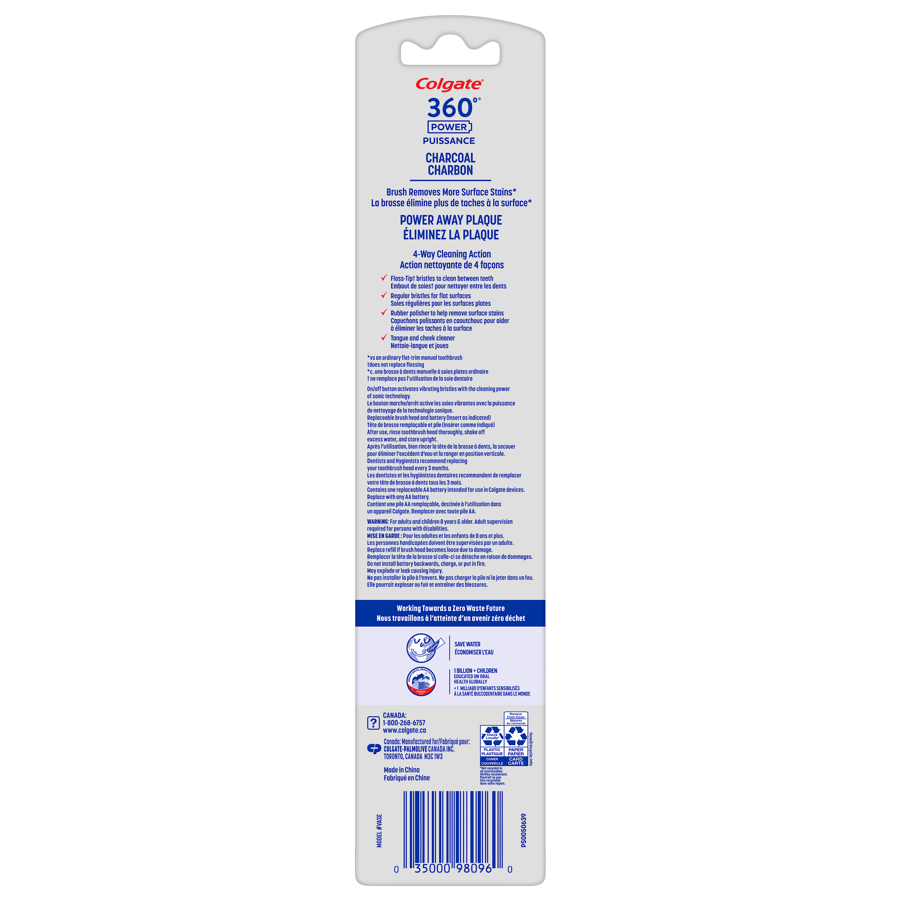Product Title Colgate 360 Charcoal Sonic Powered Battery Toothbrush SKU CN08145A SKU eCommerce Name Colgate 360 Charcoal Sonic Powered Battery Toothbrush Consumer Unit - GTIN 00035000980960 Case - GTIN 10035000980967 Product Category Oral Care Product Sub Category Battery TB Brand Colgate Product Sub Brand Colgate 360 BTB Consumer Unit Gross Weight 0.085 KG / 0.187 LB Consumer Unit Net Weight 0.072 KG / 0.159 LB Consumer Unit Length 30.000 MM / 1.181 IN Consumer Unit Width 55.000 MM / 2.165 IN Consumer Unit Height 247.000 MM / 9.724 IN Consumer Unit Volume 0.396 C8 / 0.014 CF Product Title Colgate 360 Charcoal Sonic Powered Battery Toothbrush eCommerce Copy The Colgate 360 Charcoal sonic powered toothbrush with antibacterial bristles helps prevent bacteria growth on bristles. Includes an ultra slim, lightweight handle, polishing cups to remove surface stains, and a cheek & tongue cleaner to remove odor-causing bacteria. eCommerce Copy- Long Description The Colgate 360 Charcoal sonic powered toothbrush helps keep your brush clean with antibacterial bristles**. The ultra slim, lightweight handle design provides sonic vibrations of 20,000 strokes per minute. The compact brush head includes Floss Tip† bristles and polishing cups to remove surface stains, and a cheek & tongue cleaner that removes odor-causing bacteria. **helps prevent bacteria growth on bristles, toothbrush does not kill bacteria in mouth †does not replace flossing Keywords (eCommerce) soft toothbrush bristles, colgate charcoal, charcoal, battery powered toothbrush aa batteries included, electric toothbrush to whiten teeth, antibacterial bristles, floss tip bristles, colgate toothbrush, toothbrushes, sonic toothbrush, sonic powered toothbrush, replacement heads, replacement brush heads, replacement powered toothbrush heads