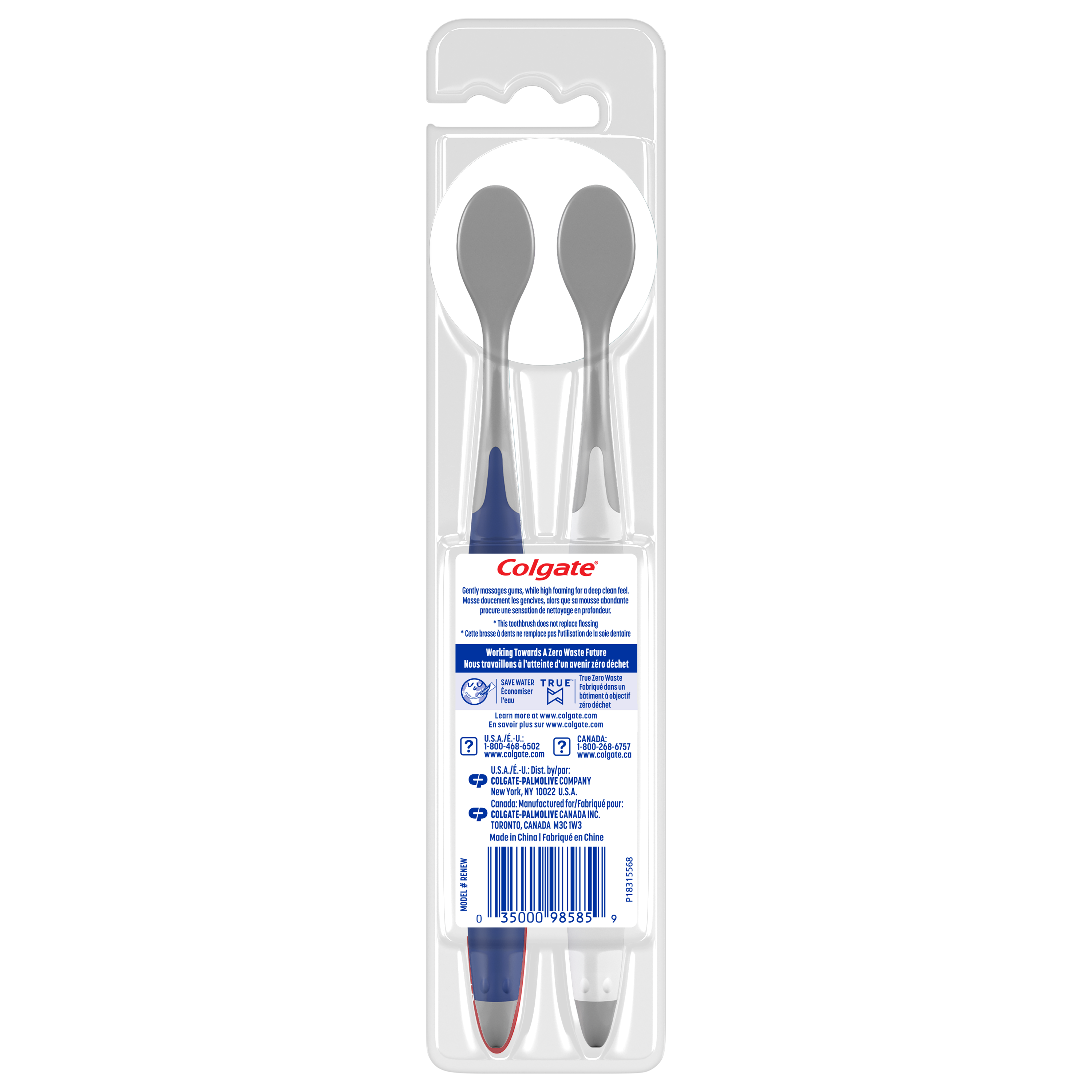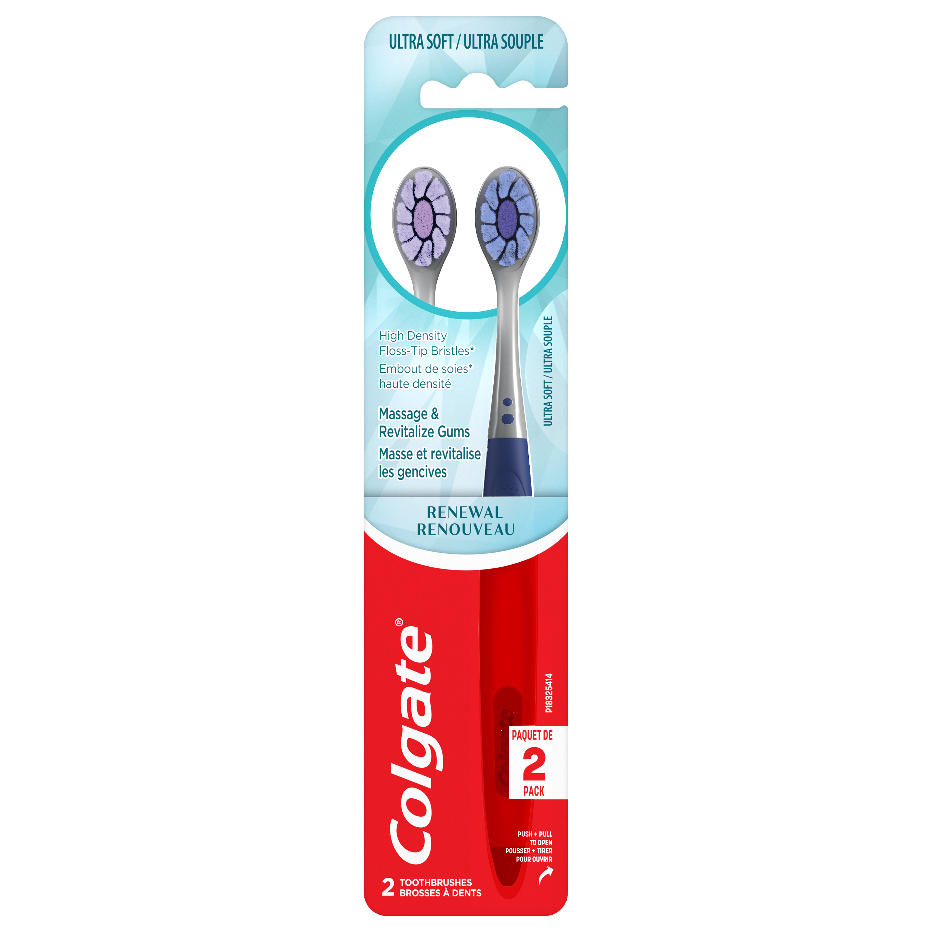 Product Title Colgate Renewal Manual Toothbrush - 2pk SKU CN08210A SKU eCommerce Name Colgate Renewal Manual Toothbrush - 2pk Consumer Unit - GTIN 00035000985859 Case - GTIN 10035000985856 Product Category Oral Care Product Sub Category Manual TB Brand Colgate Product Sub Brand Colgate Total Man TB Consumer Unit Gross Weight 0.060 KG / 0.132 LB Consumer Unit Net Weight 0.033 KG / 0.073 LB Consumer Unit Length 229.000 MM / 9.016 IN Consumer Unit Width 52.000 MM / 2.047 IN Consumer Unit Height 23.000 MM / 0.906 IN Consumer Unit Volume 0.274 C8 / 0.010 CF Product Title Colgate Renewal Manual Toothbrush - 2pk eCommerce Copy This adult full head toothbrush has ultra soft high density Floss-Tip bristles* that wrap around each tooth providing a deep clean along the gum line. *This brush does not replace flossing eCommerce Copy- Long Description The NEW Colgate Renewal Manual Toothbrush is a breakthrough! This adult full head toothbrush has a unique handle and ultra soft high density Floss-Tip bristles* that wrap around each tooth providing a deep clean along the gum line. *This brush does not replace flossing Keywords (eCommerce) toothbrushes, soft toothbrush, soft toothbrushes for adults, soft bristle toothbrush, extra soft toothbrush, ultra soft toothbrush, soft toothbrushes, toothbrush pack, manual toothbrushes, adult toothbrush, super soft toothbrush, extra soft toothbrushes, manual toothbrush, sensitive toothbrush, soft bristle toothbrush for sensitive teeth, extra soft toothbrush for sensitive gums, recyclable toothbrush, vegan toothbrush, round toothbrush, toothbrushes soft bristles, extra soft toothbrushes adult, extra soft toothbrushes adult sensitive teeth, soft toothbrush for gum recession, floss toothbrush