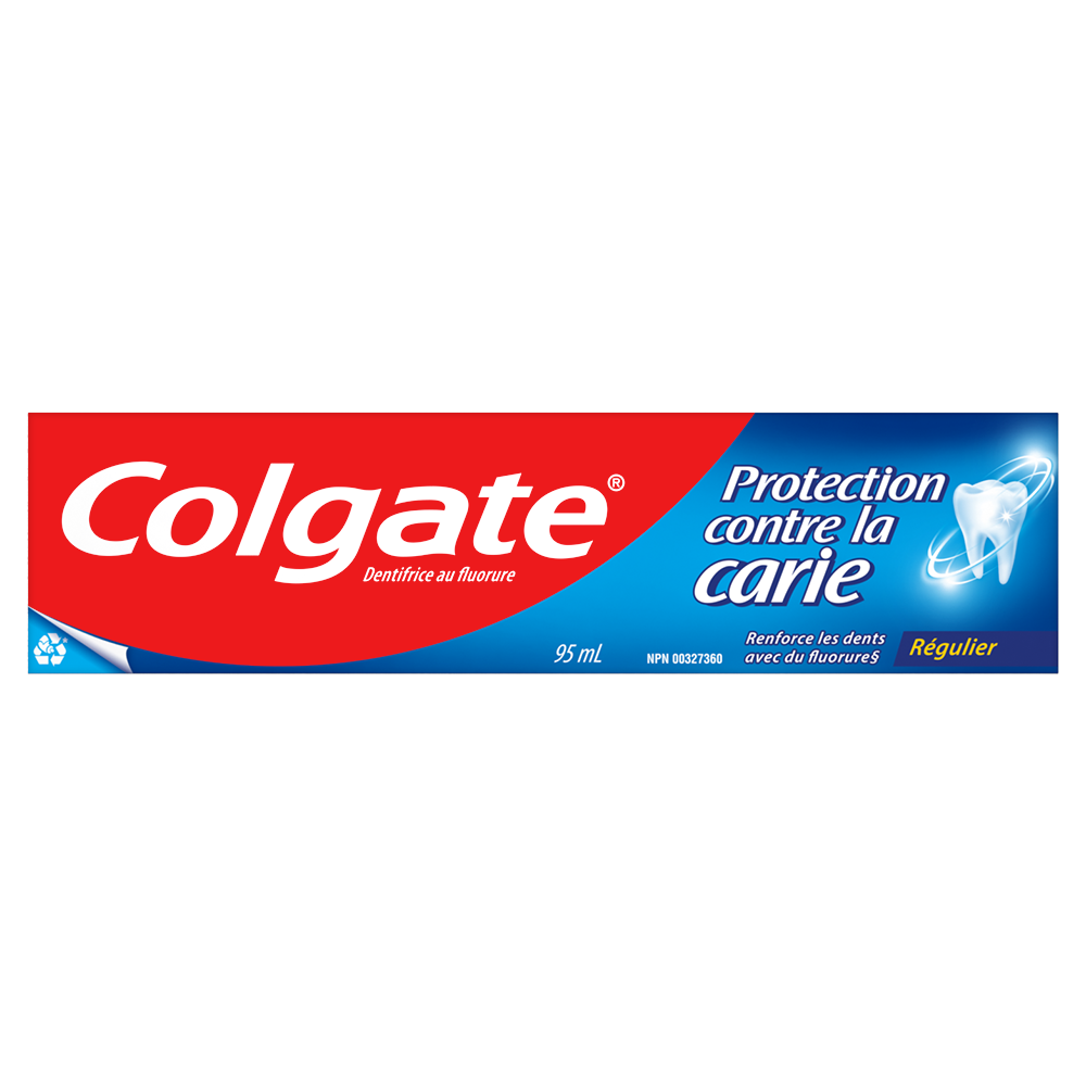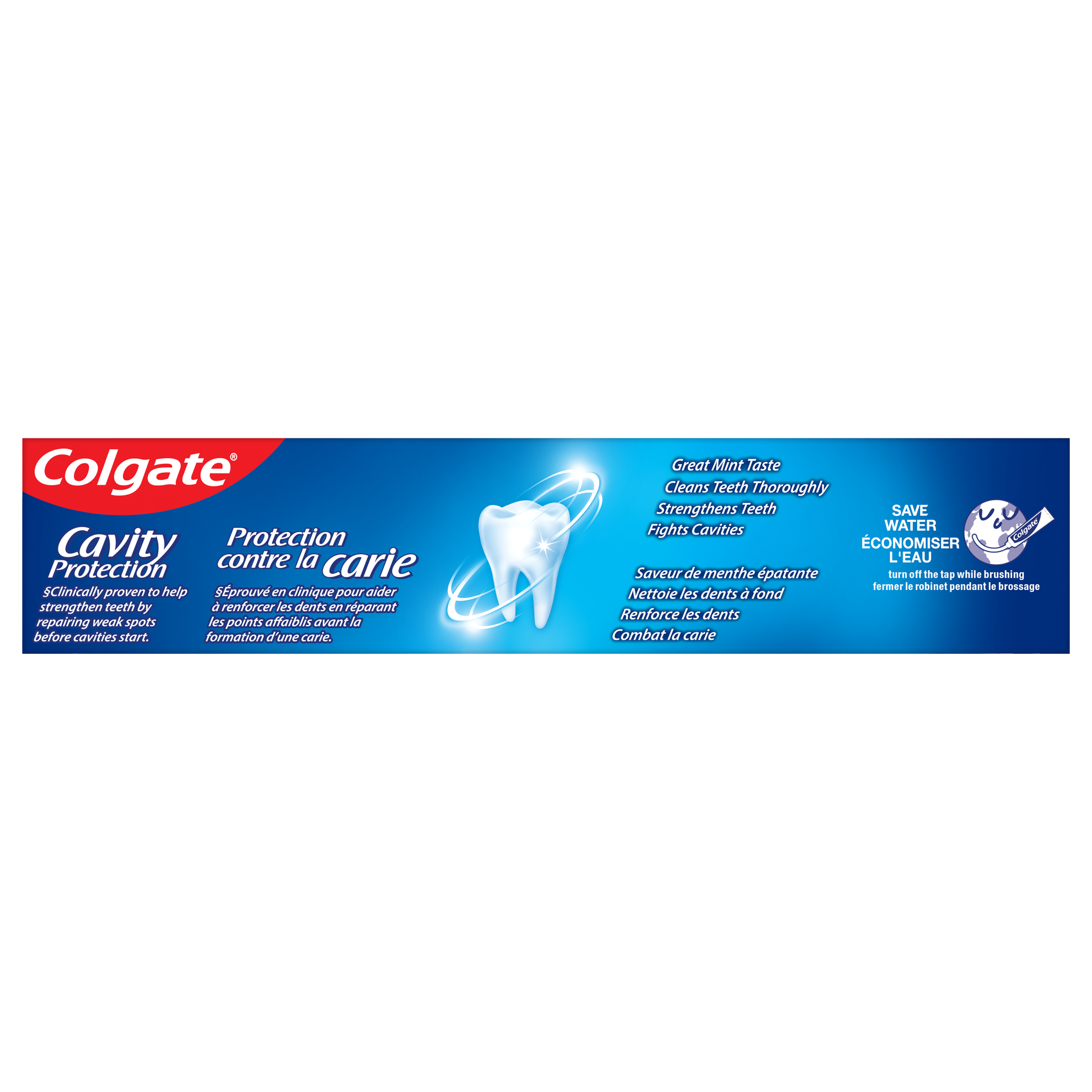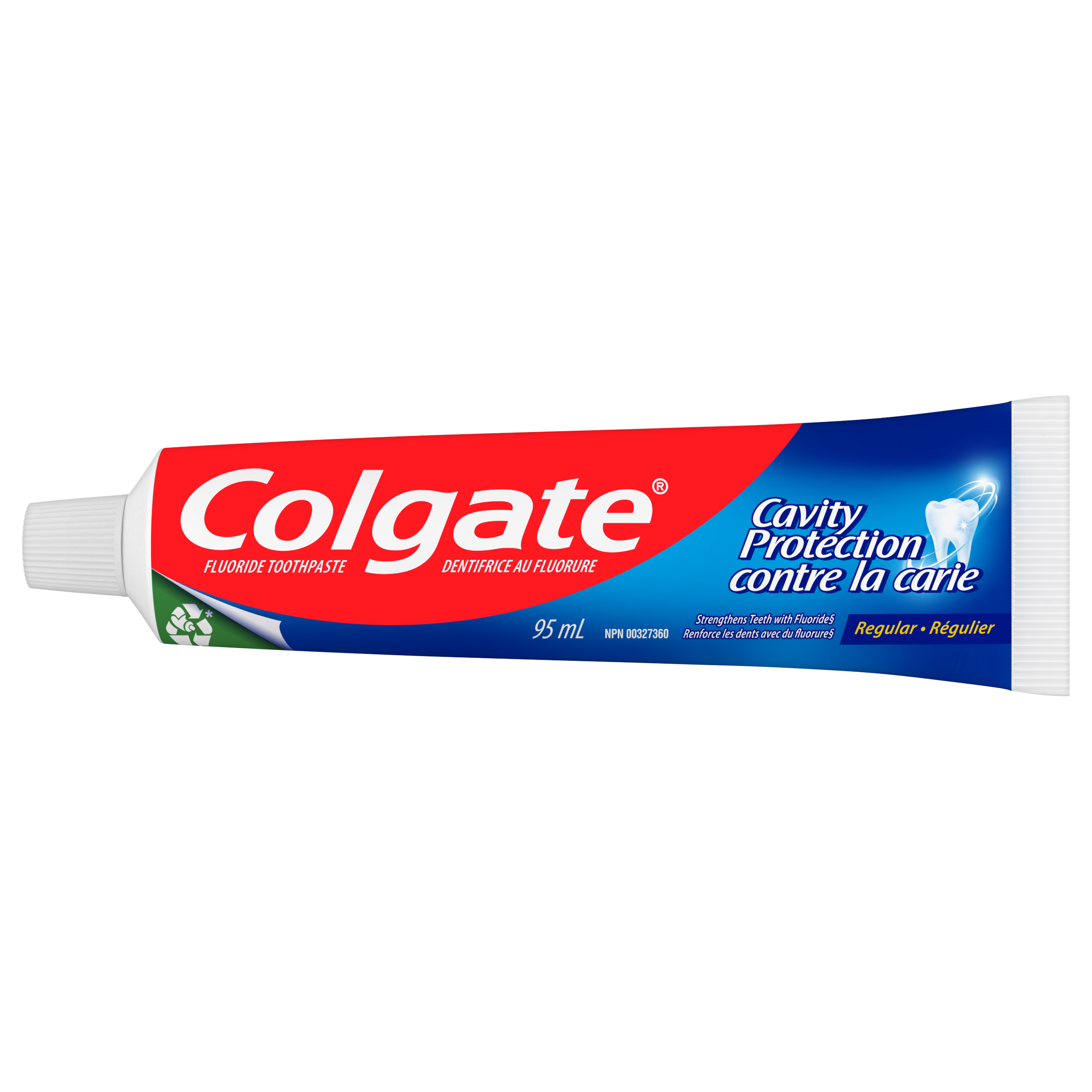 Product Title Colgate Cavity Protection Fluoride Toothpaste, Regular, 95 mL SKU MX03595A SKU eCommerce Name Colgate Cavity Protection Fluoride Toothpaste, Regular, 95 mL Consumer Unit - GTIN 00058000313194 Case - GTIN 10058000313191 Product Category Oral Care Product Sub Category Toothpaste Brand Colgate Product Sub Brand Colgate Maximum Cavity Protection TP Consumer Unit Gross Weight 0.161 KG / 0.355 LB Consumer Unit Net Weight 0.138 KG / 0.304 LB Consumer Unit Length 36.000 MM / 1.417 IN Consumer Unit Width 176.000 MM / 6.929 IN Consumer Unit Height 44.000 MM / 1.732 IN Consumer Unit Volume 0.279 C8 / 0.010 CF Product Title Colgate Cavity Protection Fluoride Toothpaste, Regular, 95 mL eCommerce Copy- Long Description Colgate Cavity Protection provides trusted cavity protection for the entire family. Formulated with fluoride, it is clinically proven to help strengthen teeth by repairing weak spots and leaves your mouth feeling fresh and clean. Plus, it comes with a great mint taste that the whole family will enjoy. Keywords (eCommerce) tooth paste, toothpastes, paste, best, odor, great taste, mint, halitosis, teeth, tooth wash, clean, foaming, stain removal, whitening, gumline, tartar control, fluoride, anticavity, adult, value, family, fresh breath, freshens, clean mouth, whitening, whiter teeth, stain removal