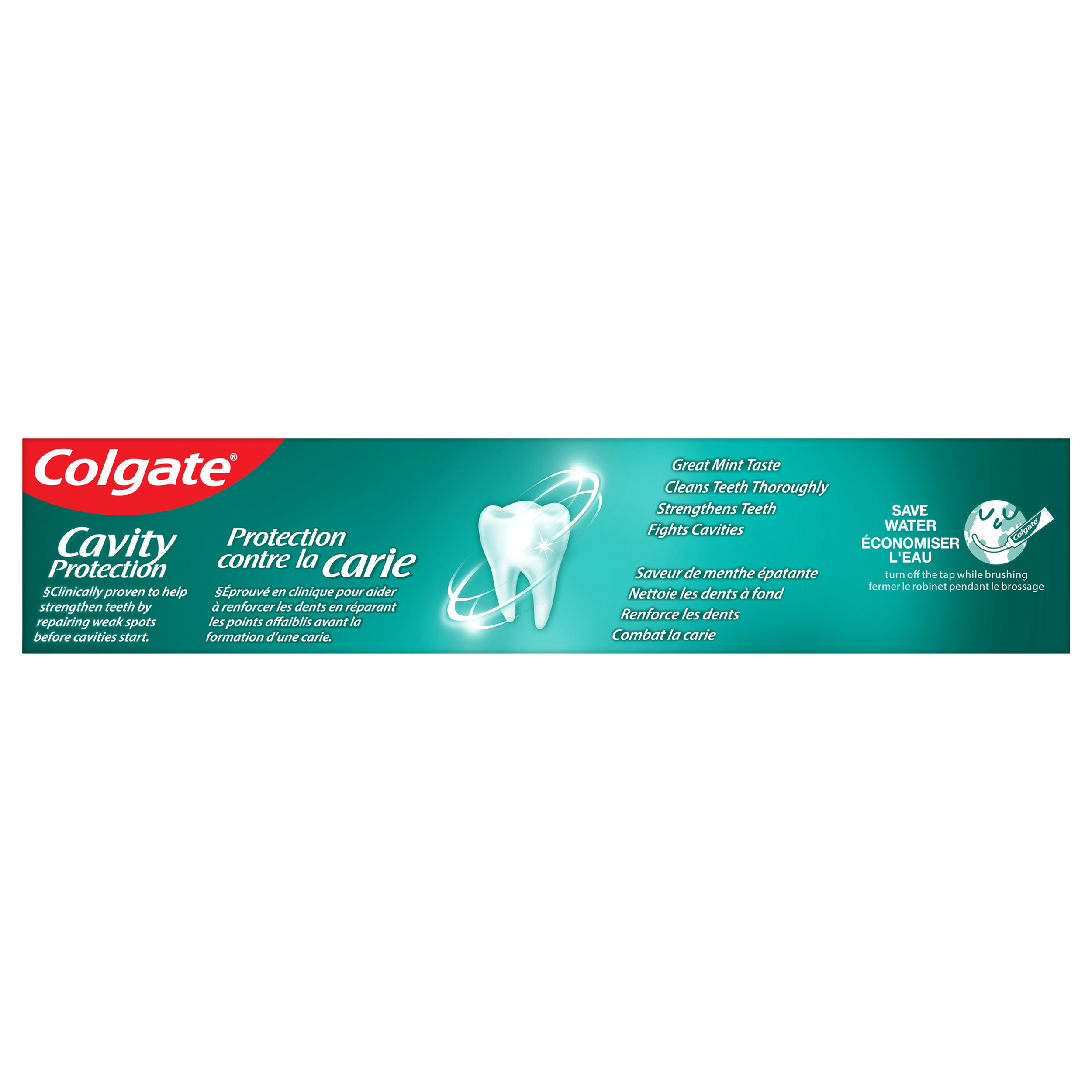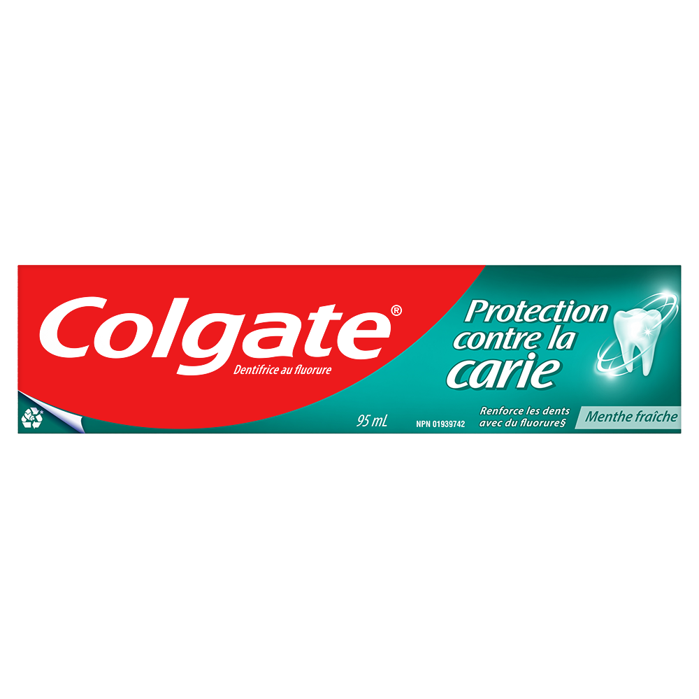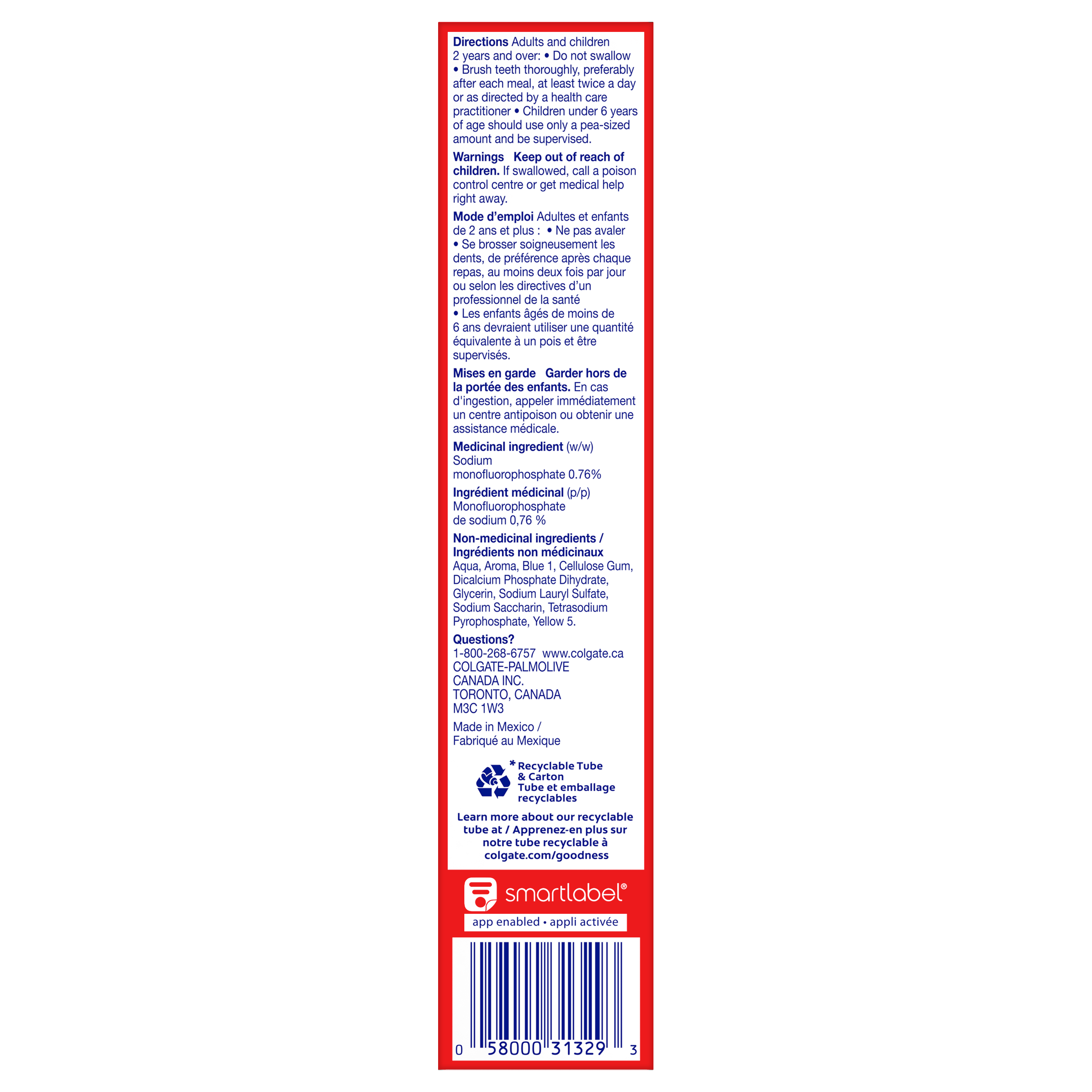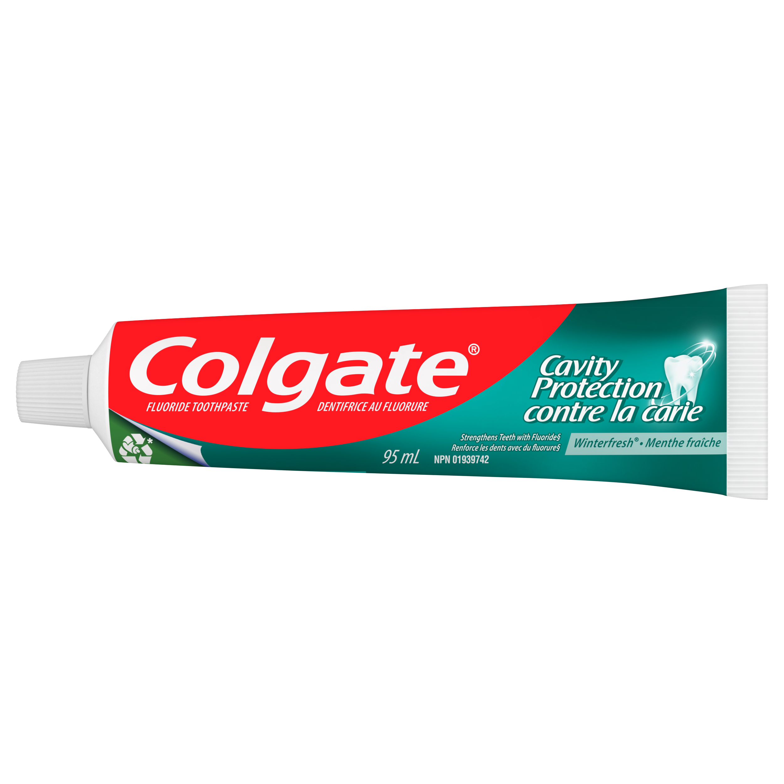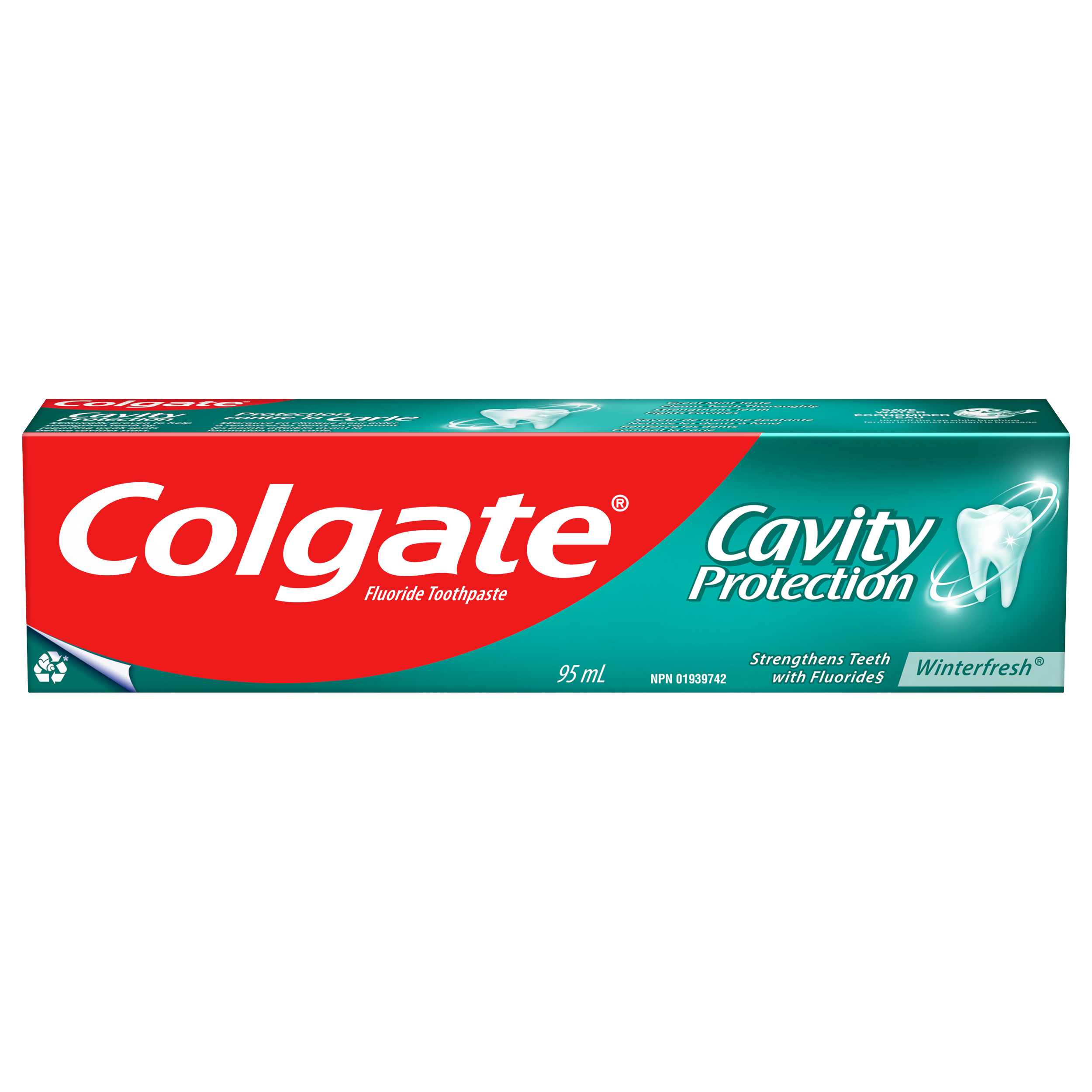 Product Title Colgate Cavity Protection Fluoride Toothpaste, Winterfresh, 95 mL SKU MX03596A SKU eCommerce Name Colgate Cavity Protection Fluoride Toothpaste, Winterfresh, 95 mL Consumer Unit - GTIN 00058000313293 Case - GTIN 10058000313290 Product Category Oral Care Product Sub Category Toothpaste Brand Colgate Product Sub Brand Colgate Maximum Cavity Protection TP Consumer Unit Gross Weight 0.161 KG / 0.355 LB Consumer Unit Net Weight 0.138 KG / 0.304 LB Consumer Unit Length 36.000 MM / 1.417 IN Consumer Unit Width 176.000 MM / 6.929 IN Consumer Unit Height 44.000 MM / 1.732 IN Consumer Unit Volume 0.279 C8 / 0.010 CF Product Title Colgate Cavity Protection Fluoride Toothpaste, Winterfresh, 95 mL eCommerce Copy- Long Description Colgate Cavity Protection provides trusted cavity protection for the entire family. Formulated with fluoride, it is clinically proven to help strengthen teeth by repairing weak spots and leaves your mouth feeling fresh and clean. Plus, it comes on a great winterfresh flavour that the whole family will enjoy. Keywords (eCommerce) tooth paste, toothpastes, paste, best, odor, great taste, mint, halitosis, teeth, tooth wash, clean, foaming, stain removal, whitening, gumline, tartar control, fluoride, anticavity, adult, value, family, fresh breath, freshens, clean mouth, whitening, whiter teeth, stain removal