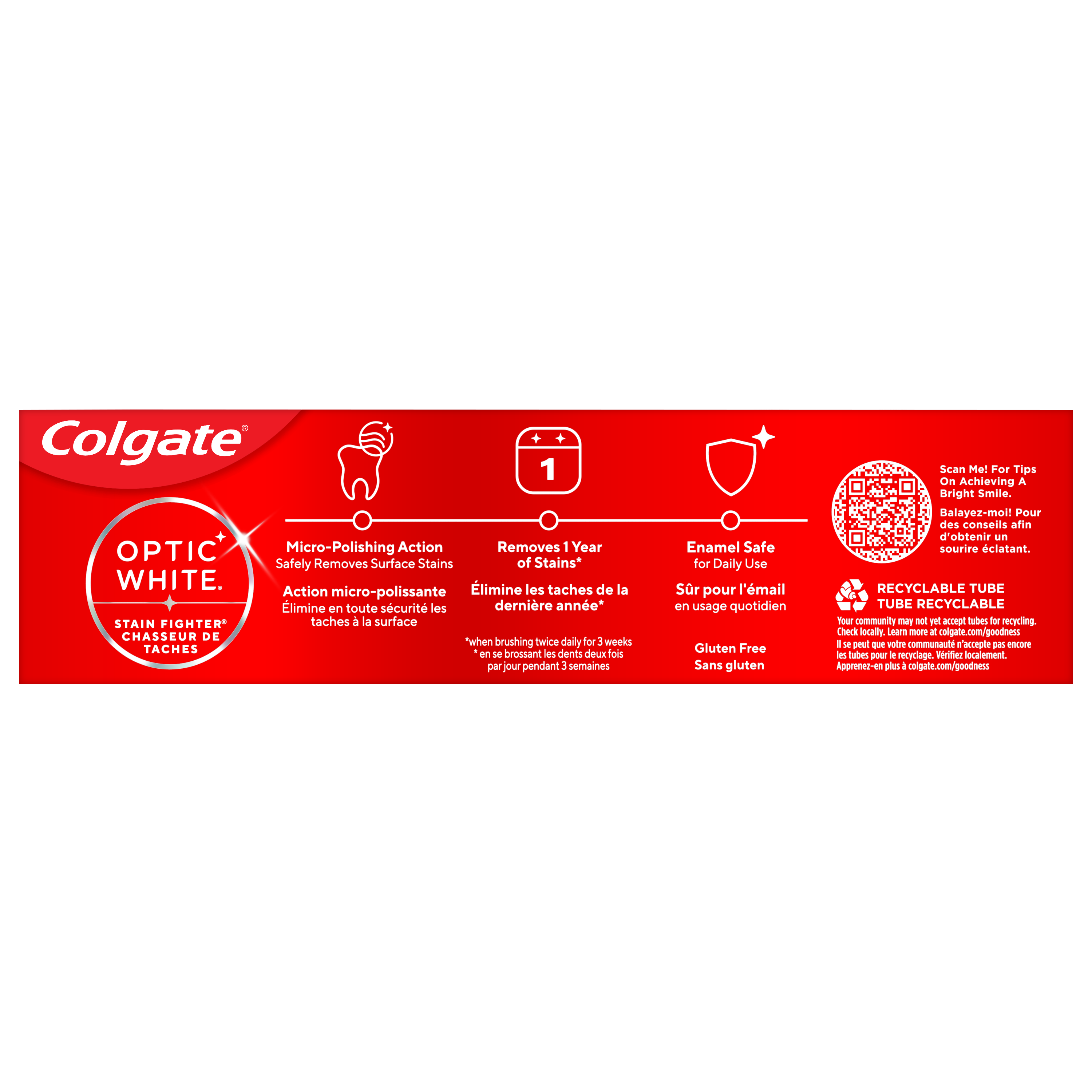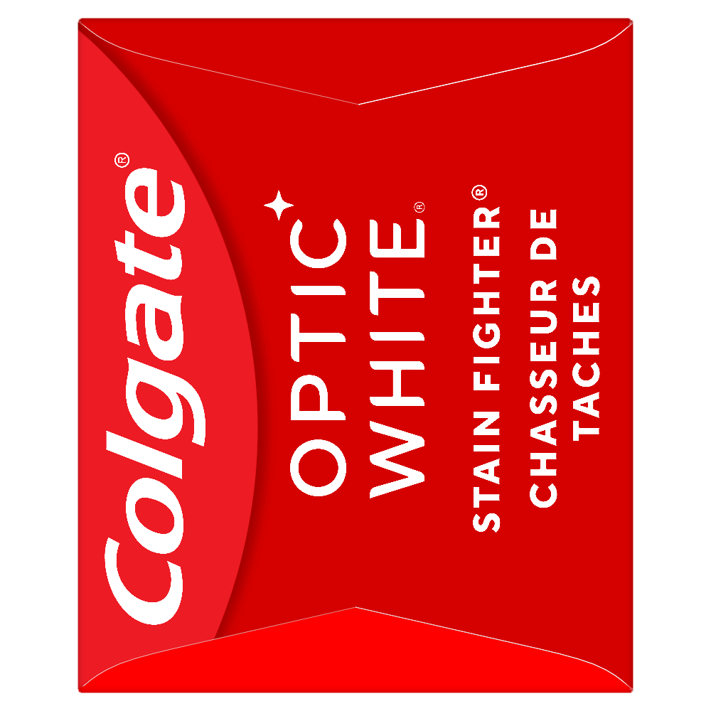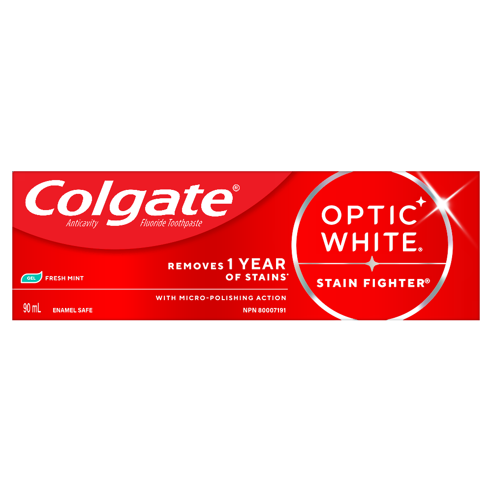 Product Title Colgate Optic White Stain Fighter Fresh Mint Teeth Whitening Toothpaste Gel, Anticavity Toothpaste Gel with Fluoride, 90 mL SKU MX06978A SKU eCommerce Name Colgate Optic White Stain Fighter Stain Removal Toothpaste, Fresh Mint Gel, 90 mL Consumer Unit - GTIN 00035000972538 Case - GTIN 10035000972535 Product Category Oral Care Product Sub Category Toothpaste Brand Colgate Product Sub Brand Colgate Optic White TP Consumer Unit Gross Weight 0.145 KG / 0.320 LB Consumer Unit Net Weight 0.123 KG / 0.271 LB Consumer Unit Length 41.000 MM / 1.614 IN Consumer Unit Width 159.000 MM / 6.260 IN Consumer Unit Height 50.000 MM / 1.969 IN Consumer Unit Volume 0.326 C8 / 0.012 CF Product Title Colgate Optic White Stain Fighter Fresh Mint Teeth Whitening Toothpaste Gel, Anticavity Toothpaste Gel with Fluoride, 90 mL Product Description Colgate Optic White Stain Fighter Fresh Mint Toothpaste Gel removes 1 year of stains* while freshening breath with its mint flavour. Its micro-polishing action safely removes 5X more surface stains**. Plus, Colgate Optic White Stain Fighter contains fluoride to fight cavities and is an enamel safe stain remover toothpaste gel. Get a refreshing clean with this effective teeth stain remover. Colgate Optic White Stain Fighter Toothpaste Gel uses a patented whitening formula for thorough, effective stain removal. The micropolishers in Colgate Optic White Stain Fighter Toothpaste don’t just brush away surface stains, they help prevent new ones from forming. The refreshing peppermint flavour of our toothpaste gel provides an invigorating clean that lasts from the first taste to the finish. Colgate Optic White Stain Fighter Fresh Mint Toothpaste Gel contains fluoride to fight cavities. This patented whitening formula removes 1 year of stains* and is enamel safe for daily use. *when brushing twice daily for 3 weeks **vs. ordinary, non-whitening toothpaste after 2 weeks of continued use eCommerce Copy Colgate Optic White Stain Fighter is a stain removal whitening toothpaste with micro-polishing action to remove 5X more surface stains*. This teeth stain remover toothpaste contains clinically proven technology that safely removes surface stains and the formula helps prevent new stains from forming, so your teeth stay whiter longer. Colgate Optic White toothpaste, Stain Fighter, is a mint gel toothpaste that has a fresh mint flavour that freshens breath. eCommerce Copy- Long Description Colgate Optic White Stain Fighter Whitening Toothpaste, Fresh Mint Gel, 90 mL Tube Colgate Optic White Stain Fighter is a stain removal whitening toothpaste with micro-polishing action to remove 5X more surface stains*. This teeth stain remover toothpaste contains clinically proven technology that safely removes surface stains and the formula helps prevent new stains from forming, so your teeth stay whiter longer. Colgate Optic White toothpaste, Stain Fighter, is a mint gel toothpaste that has a fresh mint flavour that freshens breath. *vs. ordinary non whitening toothpaste, after 2 weeks of continued use Whitening That Works Colgate Optic White Stain Fighter is a whitening toothpaste that is enamel-safe for daily use. Add this teeth stain removal toothpaste to your oral care routine for teeth whitening and stain fighting. Colgate Optic White Stain Fighter is also an anticavity fluoride toothpaste that helps to protect against cavities. For good hygiene, brush your teeth twice a day for two minutes. Optic White toothpaste is made by Colgate, the brand that knows the power of a healthy smile. *vs. ordinary non whitening toothpaste, after 2 weeks of continued use Healthy Smiles At Colgate, we make toothpaste that promotes healthy smiles. Not only because having a healthy smile is important to your overall health, but because when you have a healthy smile, you actually smile more – and that’s a powerful thing. Smiles are the simplest form of optimism, something we need now more than ever. That’s why we’re committed to raising oral healthcare standards everywhere. Bullet 1 One 90 mL tube of Colgate Optic White Stain Fighter Fresh Mint Teeth Whitening Toothpaste Gel Bullet 2 Removes 1 year of stains* (*when brushing twice daily for 3 weeks) Bullet 3 Safely removes 5X more surface stains with micro-polishing action** (**vs. ordinary, non-whitening toothpaste after 2 weeks of continued use) Bullet 4 Mint flavour provides instant freshness that lasts from the first taste to the finish Bullet 5 Enamel safe for daily use Bullet 6 Colgate Optic White Stain Fighter Toothpaste Gel contains fluoride to fight cavities Keywords (eCommerce) tooth paste, toothpastes, paste, best whitening, strips, cavity protection, great taste, halitosis, teeth, tooth wash, clean, stain removal, bleach, peroxide, healthy, hydrogen peroxide, affordable, at home, baking soda, bad breath, easy, fast, home remedies, do it yourself, dental stain removal, over the counter, noticeable, beautiful, long lasting, refreshing, lightens, freshen, keeps, gel, pearly, vegan toothpaste, fluoride toothpaste OS Amazon Product Title Colgate Optic White Stain Fighter Fresh Mint Teeth Whitening Toothpaste Gel, Anticavity Toothpaste Gel with Fluoride, Enamel Safe Teeth Stain Remover, 90 mL OS Amazon Product Description Colgate Optic White Stain Fighter Fresh Mint Toothpaste Gel removes 1 year of stains* while freshening breath with its mint flavour. Its micro-polishing action safely removes 5X more surface stains**. Plus, Colgate Optic White Stain Fighter contains fluoride to fight cavities and is an enamel safe stain remover toothpaste gel. Get a refreshing clean with this effective teeth stain remover. Colgate Optic White Stain Fighter Toothpaste Gel uses a patented whitening formula for thorough, effective stain removal. The micropolishers in Colgate Optic White Stain Fighter Toothpaste don’t just brush away surface stains, they help prevent new ones from forming. The refreshing peppermint flavour of our toothpaste gel provides