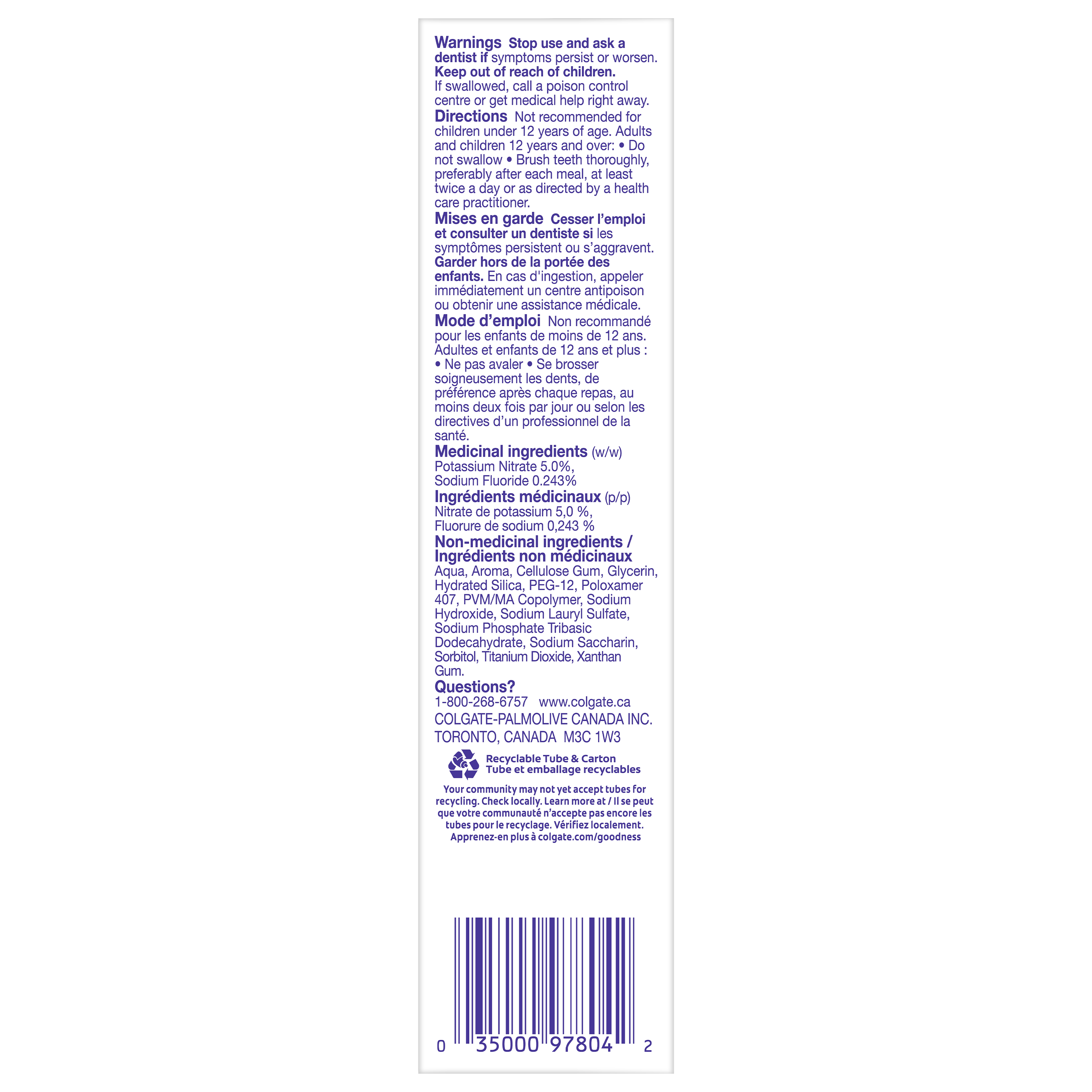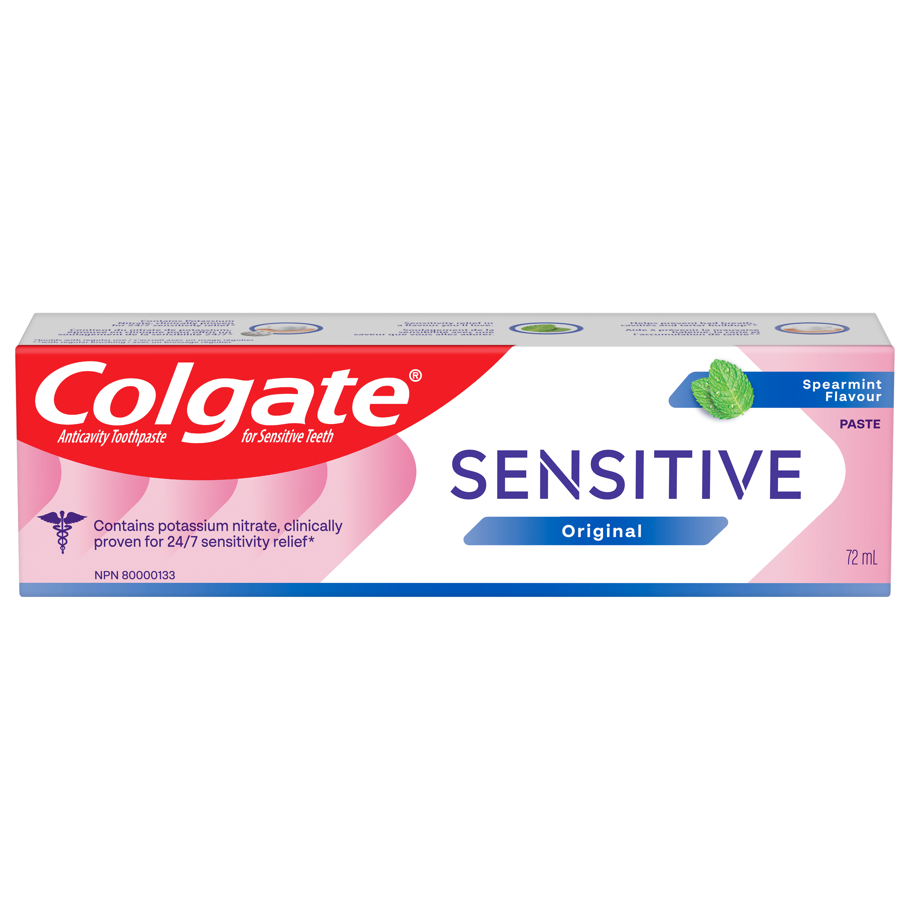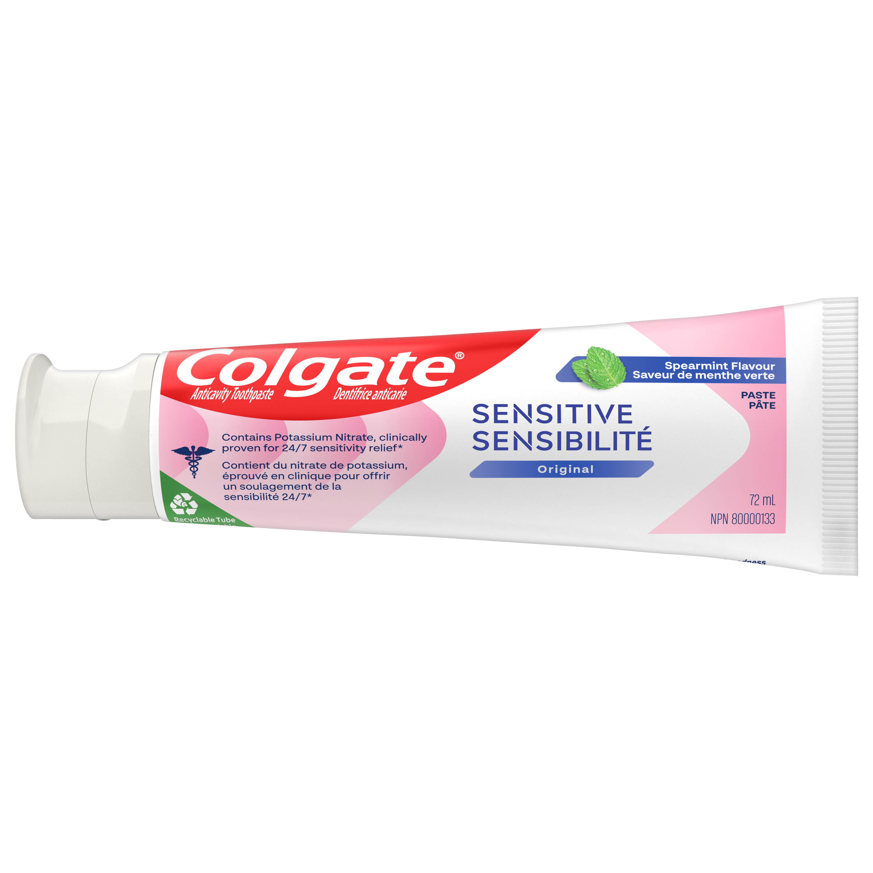 Product Title Colgate Sensitive Original Fluoride Toothpaste 72mL SKU MX07092A SKU eCommerce Name Colgate Sensitive Original Fluoride Toothpaste 72mL Consumer Unit - GTIN 00035000978042 Case - GTIN 10035000978049 Product Category Oral Care Product Sub Category Toothpaste Brand Colgate Product Sub Brand Colgate Sensitive TP Consumer Unit Gross Weight 0.119 KG / 0.262 LB Consumer Unit Net Weight 0.094 KG / 0.207 LB Consumer Unit Length 39.000 MM / 1.535 IN Consumer Unit Width 161.000 MM / 6.339 IN Consumer Unit Height 47.000 MM / 1.850 IN Consumer Unit Volume 0.283 C8 / 0.010 CF Product Title Colgate Sensitive Original Fluoride Toothpaste 72mL eCommerce Copy Colgate Sensitive Original fluoride toothpaste contains potassium nitrate, clinically proven to soothe the nerves in exposed dentin for sensitivity relief within 2 weeks. With regular use and brushing, Colgate Sensitive Original provides long term relief and fights tartar, plaque and cavities. eCommerce Copy- Long Description Colgate Sensitive Original fluoride toothpaste contains potassium nitrate, clinically proven to soothe the nerves in exposed dentin for sensitivity relief within 2 weeks. With regular use and brushing, Colgate Sensitive Original toothpaste provides long term relief and fights tartar, plaque and cavities. Plus it has the freshness you trust from Colgate. Keywords (eCommerce) hypersensitivity, antisensitivity, tooth paste, toothpastes, toohpaste, best, great taste, cavity protection, safe, stain removing, strengthen, brightening, bad breath, dentist recommended, tooth pain, sensitivity, tooth paste, toothpastes, toothpaste for sensitive teeth, at home teeth whitening toothpaste, anticavity fluoride toothpaste, gel toothpaste, colgate, toothpaste OS Amazon Product Title Colgate Original Sensitive Toothpaste, Mint, 72 mL OS Amazon Product Description Colgate Original Sensitive Toothpaste is a sensitive teeth toothpaste that offers daily sensitivity relief and strong cavity protection. This sensitivity toothpaste contains potassium nitrate which is clinically proven to soothe the nerves in exposed dentin for sensitivity relief within 2 weeks. With twice-daily brushing, Colgate Original Sensitive Toothpaste can provide 24/7 sensitivity protection. Colgate Original Sensitive Toothpaste builds protection against painful tooth sensitivity like cold, heat, acids, sweets, or contact. This sensitive teeth toothpaste also uses fluoride to protect against cavities and helps remineralize tooth enamel. Help slow the tooth decay process at the earliest stage before it can become a cavity using this Colgate Sensitive Fluoride Toothpaste. Colgate Original Sensitive Toothpaste soothes the nerves and gradually builds a protective shield to provide relief from sudden shocks of pain caused by sensitive teeth. Plus it has a great mint toothpaste flavor so you can breathe fresh and smile with confidence. OS Amazon Bullet 1 Includes one (1) 72 mL tube of Colgate Original Sensitive Toothpaste OS Amazon Bullet 2 This sensitivity toothpaste contains potassium nitrate which is clinically proven to soothe the nerves for sensitivity relief within two weeks OS Amazon Bullet 3 This sensitive teeth toothpaste provides 24/7 sensitivity protection with twice-daily brushing OS Amazon Bullet 4 Builds protection against painful tooth sensitivity to cold, heat, acids, sweets, and contact using this Colgate toothpaste for sensitive teeth OS Amazon Bullet 5 The minty fluoride toothpaste formula helps protect against cavities and can penetrate the tooth enamel to rebuild weak spots OS Walmart Product Title Colgate Original Sensitive Toothpaste, Mint, 72 mL OS Walmart Product Description Colgate Original Sensitive Toothpaste, Mint, 72 mL Colgate Original Sensitive Toothpaste is a sensitive teeth toothpaste that offers daily sensitivity relief and strong cavity protection. This sensitivity toothpaste contains potassium nitrate which is clinically proven to soothe the nerves in exposed dentin for sensitivity relief within 2 weeks. With twice-daily brushing, Colgate Original Sensitive Toothpaste can provide 24/7 sensitivity protection. Builds Protection Against Painful Sensitivity Colgate Original Sensitive Toothpaste builds protection against painful tooth sensitivity like cold, heat, acids, sweets, or contact. This sensitive teeth toothpaste also uses fluoride to protect against cavities and helps remineralize tooth enamel. Help slow the tooth decay process at the earliest stage before it can become a cavity using this Colgate Sensitive Fluoride Toothpaste. Smile with Confidence Colgate Original Sensitive Toothpaste soothes the nerves and gradually builds a protective shield to provide relief from sudden shocks of pain caused by sensitive teeth. Plus it has a great mint toothpaste flavor so you can breathe fresh and smile with confidence. OS Walmart Bullet 1 Includes one (1) 72 mL tube of Colgate Original Sensitive Toothpaste OS Walmart Bullet 2 This sensitivity toothpaste contains potassium nitrate which is clinically proven to soothe the nerves for sensitivity relief within two weeks OS Walmart Bullet 3 This sensitive teeth toothpaste provides 24/7 sensitivity protection with twice-daily brushing OS Walmart Bullet 4 Builds protection against painful tooth sensitivity to cold, heat, acids, sweets, and contact using this Colgate toothpaste for sensitive teeth OS Walmart Bullet 5 The minty fluoride toothpaste formula helps protect against cavities and can penetrate the tooth enamel to rebuild weak spots OS Loblaws Product Title Original Sensitive Toothpaste, Mint OS Loblaws Product Description Colgate Original Sensitive Toothpaste is a sensitive teeth toothpaste that offers daily sensitivity relief and strong cavity protection. This sensitivity toothpaste contains potassium nitrate which is clinically proven to soothe the nerves in exposed dentin for sensitivity relief within 2 weeks. With twice-daily brushing, Colgate Original Sensitive Toothpaste can provide