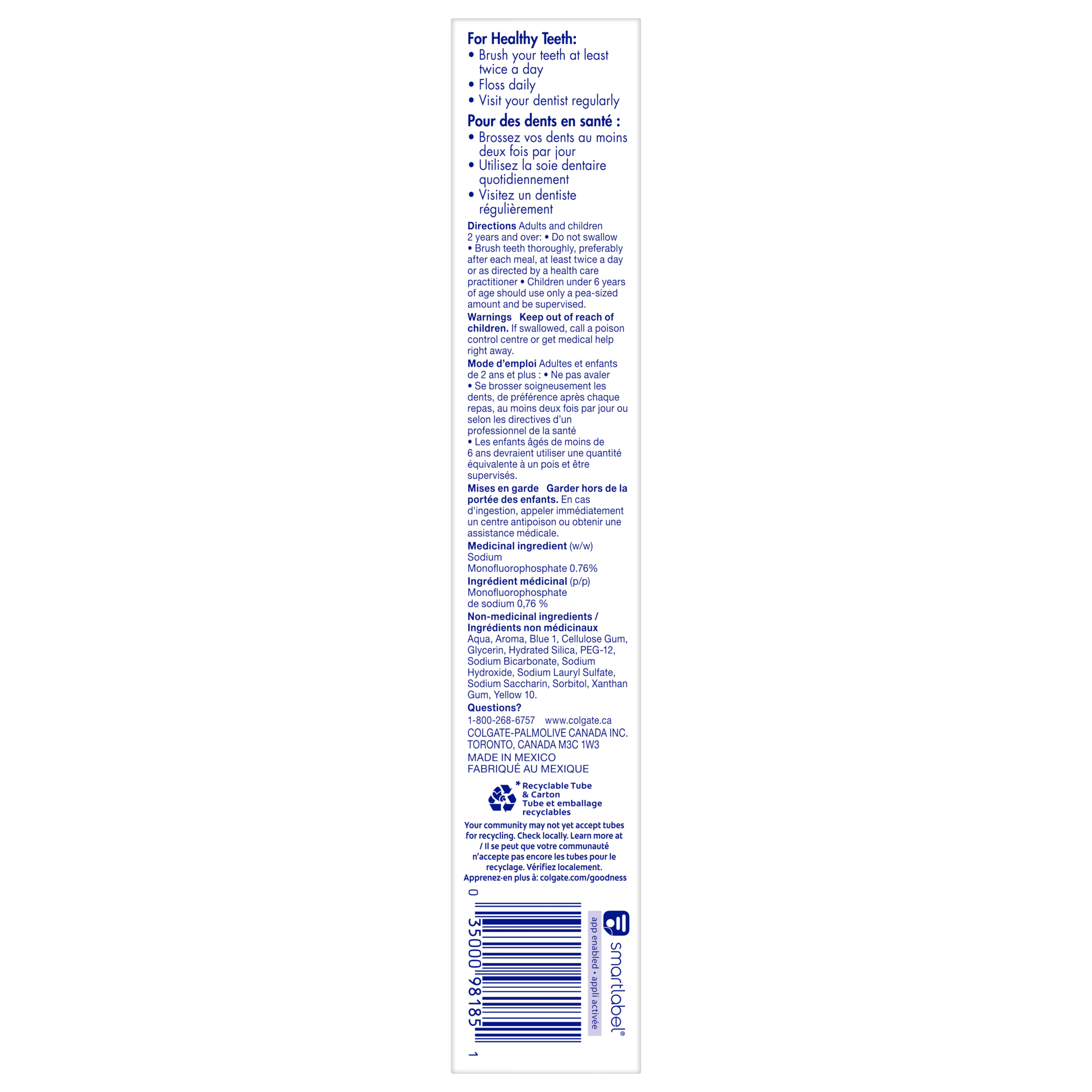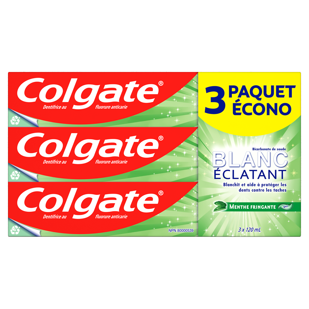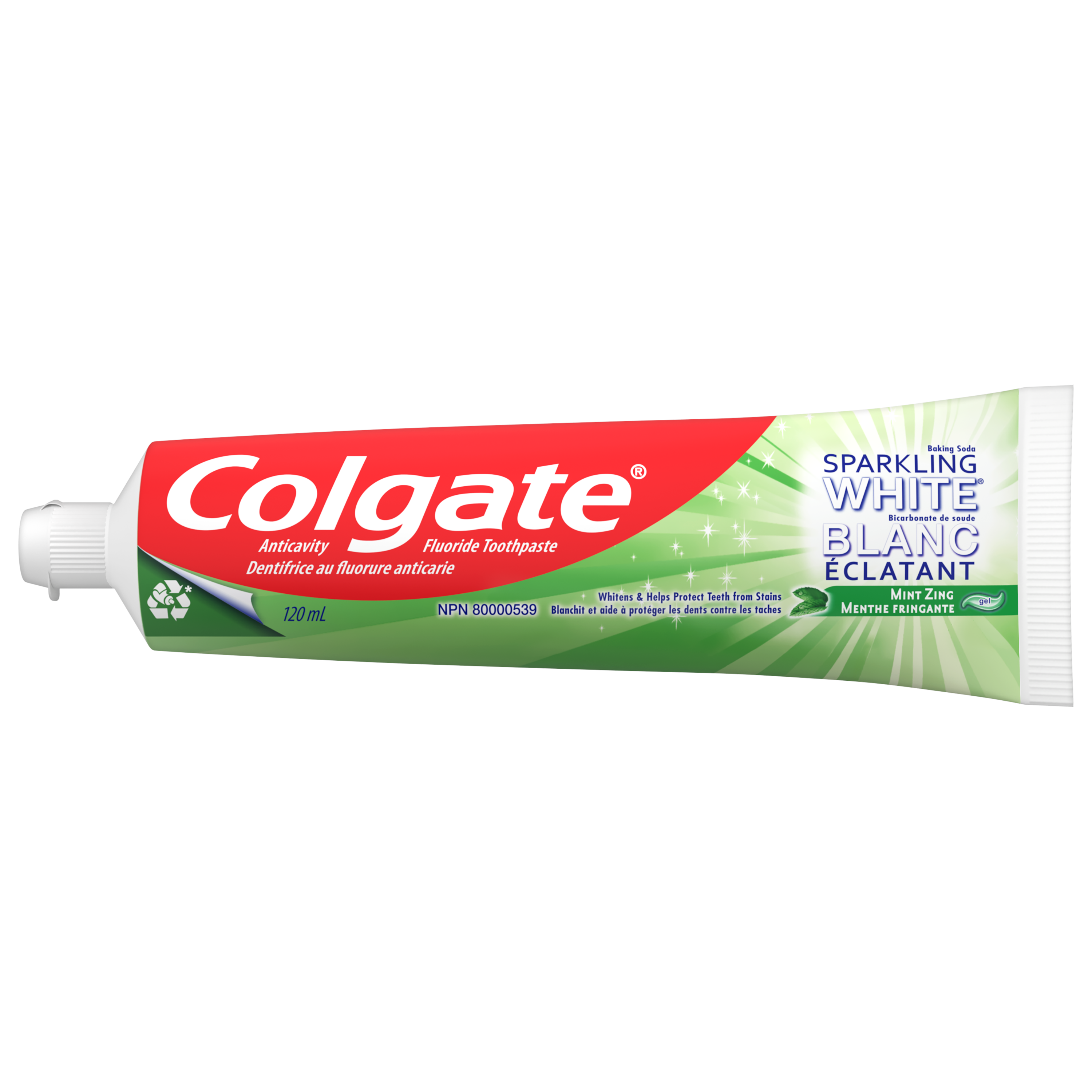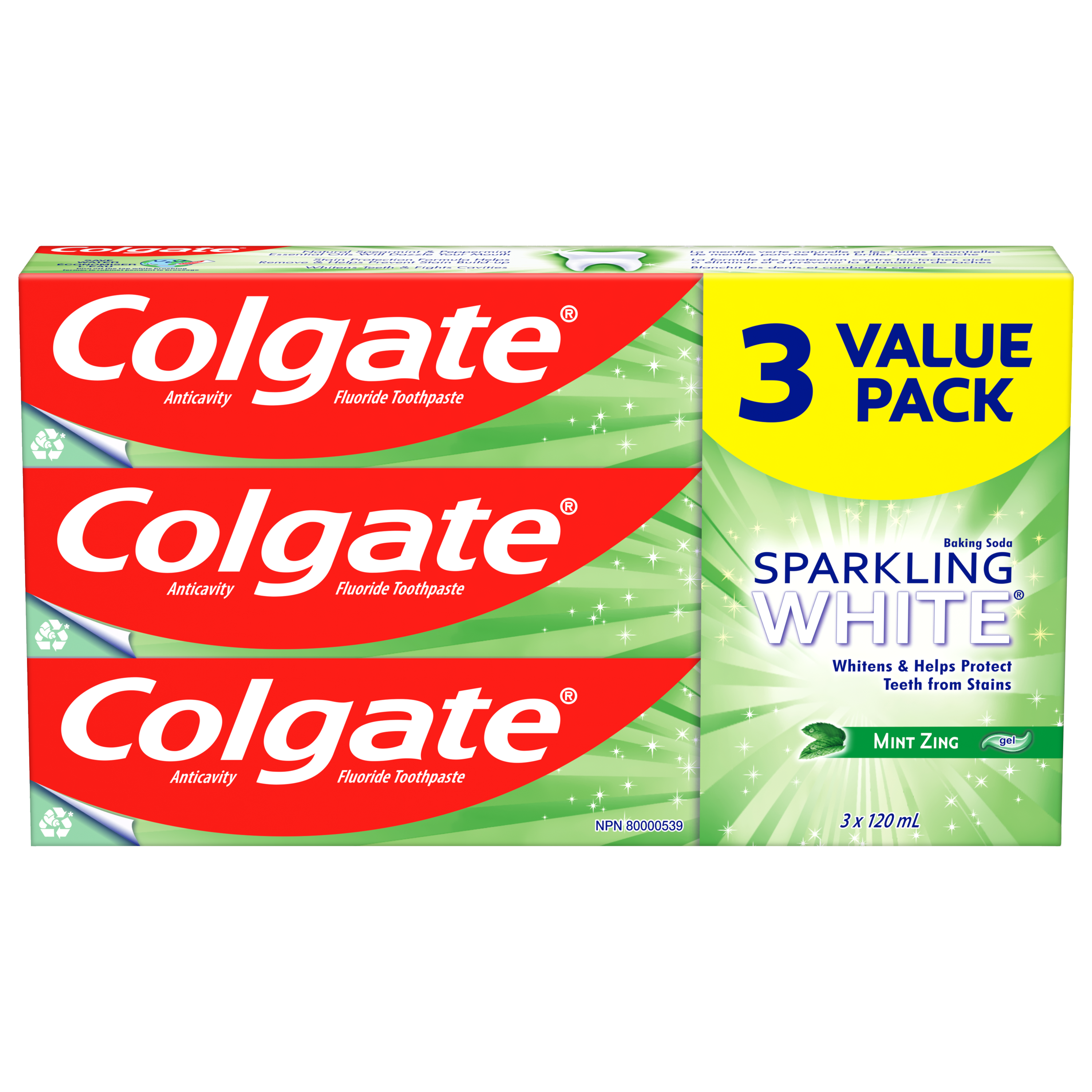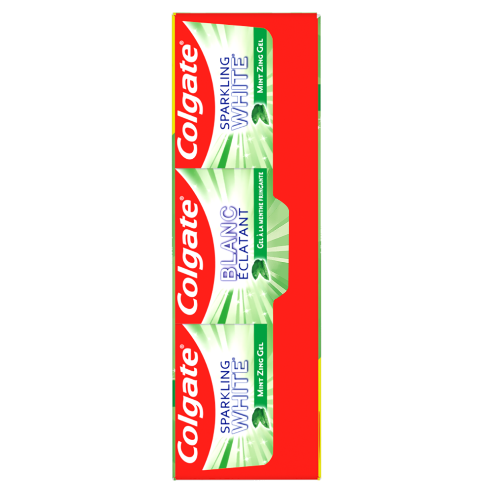 Product Title Colgate Sparkling White Whitening Toothpaste, Mint Zing - 120ml, 3 Pack SKU MX07129A SKU eCommerce Name Colgate Sparkling White Whitening Toothpaste, Mint Zing - 120ml, 3 Pack Consumer Unit - GTIN 00035000981851 Case - GTIN 10035000981858 Product Category Oral Care Product Sub Category Toothpaste Brand Colgate Product Sub Brand Colgate Sparkling TP Consumer Unit Gross Weight 0.544 KG / 1.200 LB Consumer Unit Net Weight 0.497 KG / 1.096 LB Consumer Unit Length 39.000 MM / 1.535 IN Consumer Unit Width 214.000 MM / 8.425 IN Consumer Unit Height 120.000 MM / 4.724 IN Consumer Unit Volume 0.988 C8 / 0.035 CF Product Title Colgate Sparkling White Whitening Toothpaste, Mint Zing - 120ml, 3 Pack eCommerce Copy Colgate Sparkling White Whitening Toothpaste, with a great Mint Zing flavor, fights cavities and helps remove stains to whiten teeth and prevent future stain build-up. eCommerce Copy- Long Description Colgate Sparkling White Whitening Toothpaste, with a great Mint Zing flavor, is formulated with spearmint and peppermint essential oils that will dazzle your mouth. This stain protection formula with baking soda whitens teeth and helps prevent stain build-up. Plus, it fights cavities accompanied by a unique flavor experience for a sparkling, healthy and whiter smile. Keywords (eCommerce) tooth paste, toothpastes, paste, best, odor, gum care, baking soda, great taste, mint, halitosis, teeth, tooth wash, clean, foaming, stain removal, whitening, gums, gumline, tartar control, fluoride, anticavity, adult, value, family, fresh breath, freshens, clean mouth, whitening, whiter teeth, stain removal