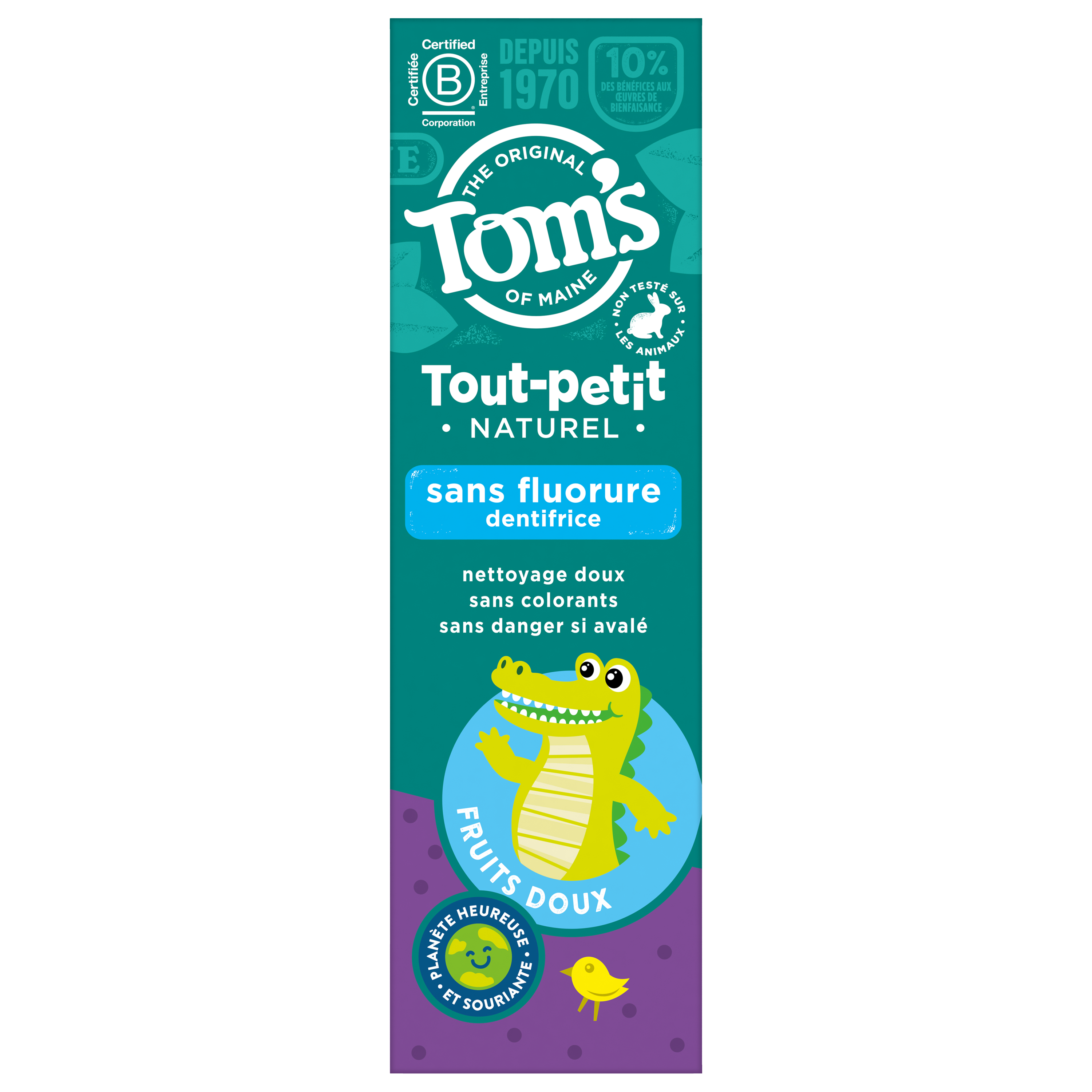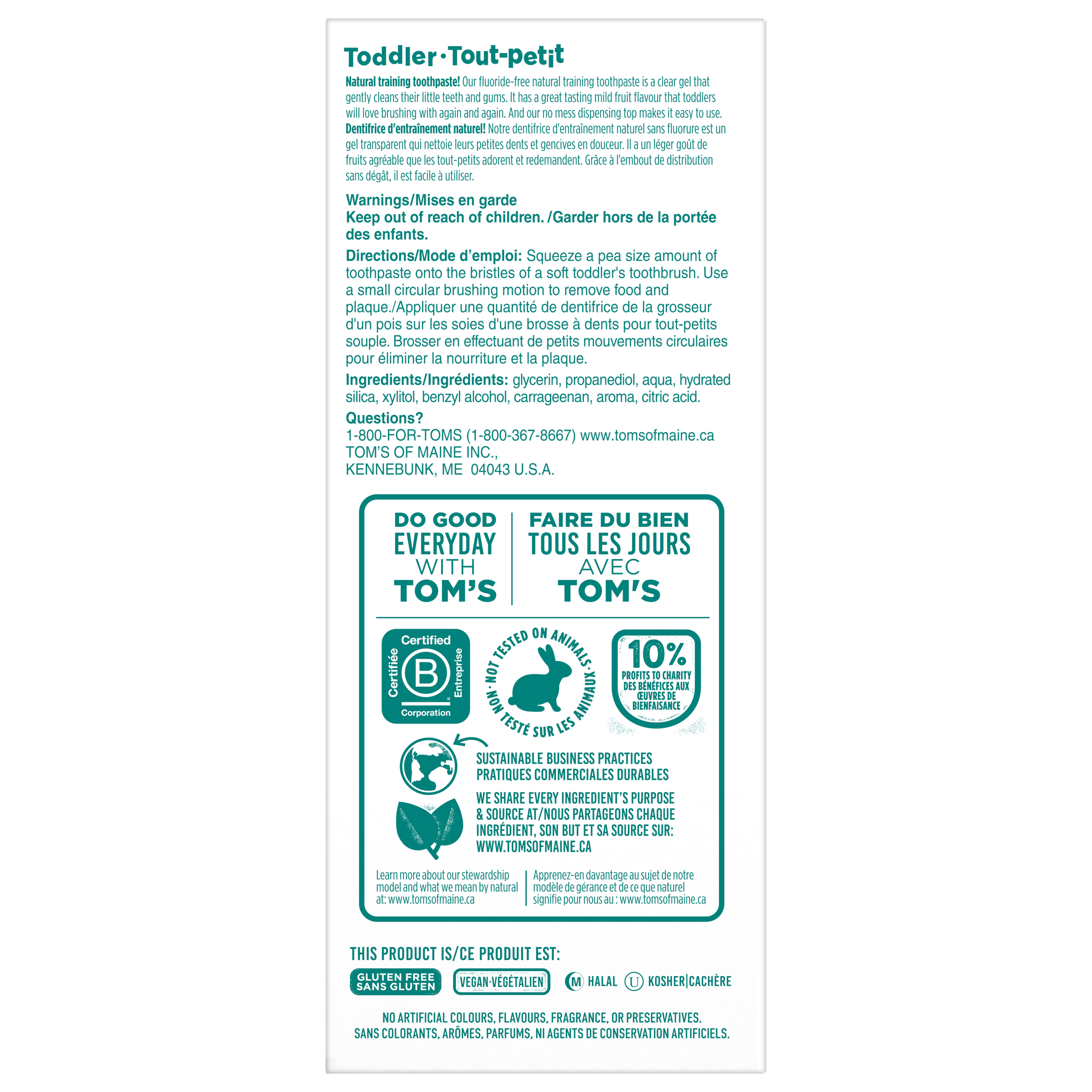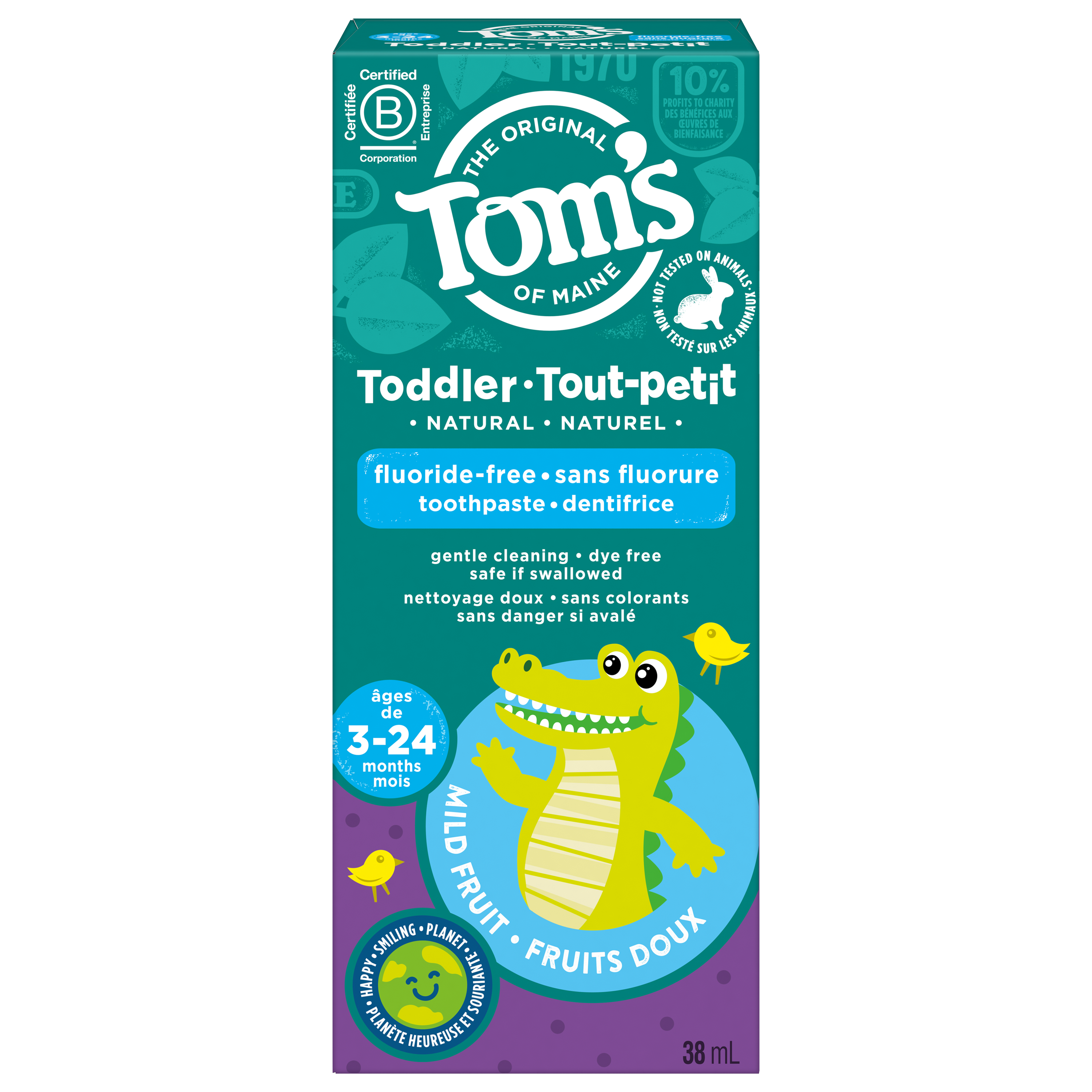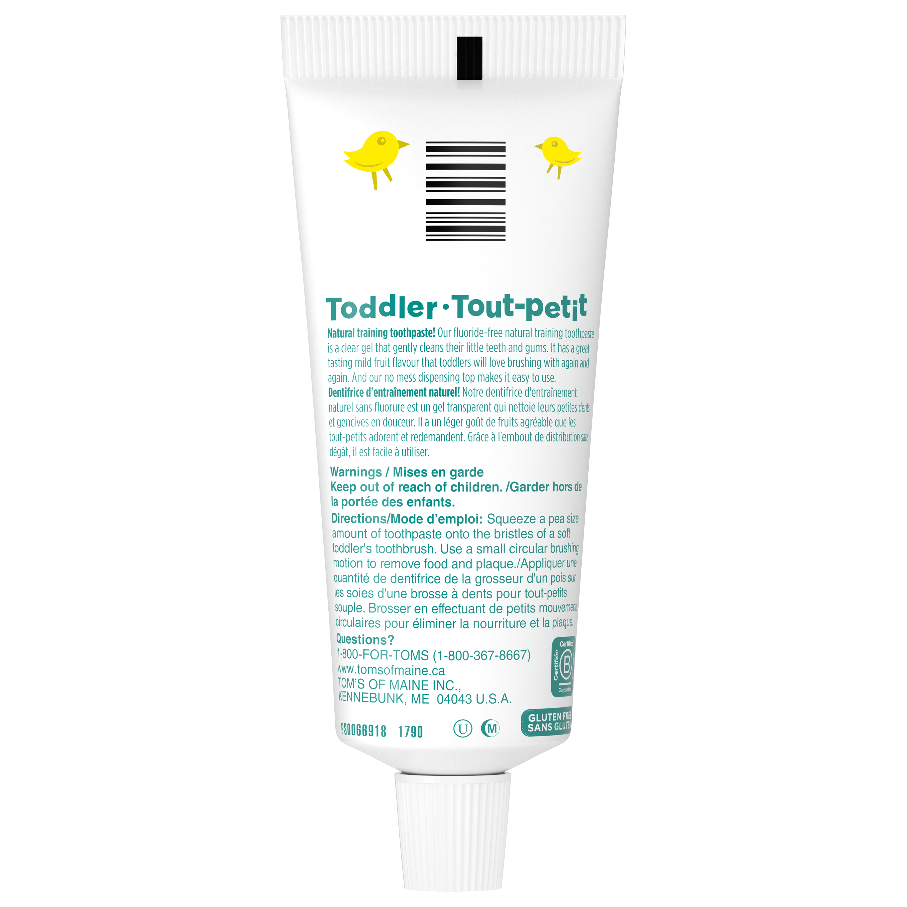 Product Title Tom's of Maine Toddler Fluoride-Free Natural Training Toothpaste 38 mL, Mild fruit SKU US04167A SKU eCommerce Name Tom's of Maine Toddler Fluoride-Free Natural Training Toothpaste 38 mL, Mild fruit Consumer Unit - GTIN 00077326449783 Case - GTIN 10077326449780 Product Category Oral Care Product Sub Category Toothpaste Brand Tom's of Maine Product Sub Brand Tom's Kids TP Consumer Unit Gross Weight 0.078 KG / 0.172 LB Consumer Unit Net Weight 0.050 KG / 0.110 LB Consumer Unit Length 40.000 MM / 1.575 IN Consumer Unit Width 56.000 MM / 2.205 IN Consumer Unit Height 134.000 MM / 5.276 IN Consumer Unit Volume 2.832 C8 / 0.100 CF Product Title Tom's of Maine Toddler Fluoride-Free Natural Training Toothpaste 38 mL, Mild fruit OS Amazon Product Title Tom’s of Maine Fluoride Free Toddler Training Toothpaste, Mild Fruit Gel, 1.75 oz OS Amazon Product Description Introduce your little one to good brushing habits with the Tom’s of Maine Fluoride Free Toddler Training Toothpaste. Tom’s of Maine Fluoride Free Training Toothpaste for Toddlers is designed for children ages 3 months to 24 months and gently cleans your little one’s teeth without using fluoride. Plus, it’s a safe if swallowed toddler toothpaste which means less worries if more toothpaste ends up in their tummy than the sink. When it comes to oral hygiene for kids, it’s important to encourage them to begin brushing early and frequently. Tom’s of Maine Mild Fruit Gel Toddler Toothpaste has a great tasting mild fruit flavor that toddlers will love brushing with again and again. With Tom’s of Maine Fluoride Free Toddler Training Toothpaste, you can feel confident knowing your child’s toddler toothpaste contains toothpaste ingredients that are naturally sourced and naturally derived. With no artificial sweeteners, flavors, dyes, or preservatives this kids natural toothpaste is fun for kids to brush with and effective enough for parents. Plus, this Toms training toothpaste is vegan, gluten free, and not tested on animals. OS Amazon Bullet 1 Includes one (1) 1.75 oz tube of Tom’s of Maine Fluoride Free Toddler Training Toothpaste OS Amazon Bullet 2 This safe if swallowed, fluoride free kids toothpaste gel comes in a Mild Fruit flavor that toddlers will love brushing with again and again OS Amazon Bullet 3 The toddler toothpaste is safe for kids ages 3 months to 2 years old and is free of dyes, artificial sweeteners, flavours, and preservatives OS Amazon Bullet 4 The fluoride free training toothpaste gel formula helps gently clean teeth without using fluoride to help brighten little smiles OS Amazon Bullet 5 Tom’s of Maine Fluoride Free Toddler Training Toothpaste features an easy to dispense, no-mess toothpaste top to help make brushing time even easier OS Amazon On Page Keywords kids toothpaste, toddler toothpaste, training toothpaste, training toothpaste for toddlers, toddler training toothpaste, natural toothpaste, kids natural toothpaste, fluoride free kids toothpaste, Toms training toothpaste OS Walmart Product Title Tom’s of Maine Fluoride Free Toddler Training Toothpaste, Mild Fruit Gel, 1.75oz OS Walmart Product Description Introduce your little one to good brushing habits with the Tom’s of Maine Fluoride Free Toddler Training Toothpaste. Tom’s of Maine Fluoride Free Training Toothpaste for Toddlers is designed for children ages 3 months to 24 months and gently cleans your little one’s teeth without using fluoride. Plus, it’s a safe if swallowed toddler toothpaste which means less worries if more toothpaste ends up in their tummy than the sink. When it comes to oral hygiene for kids, it’s important to encourage them to begin brushing early and frequently. Tom’s of Maine Mild Fruit Gel Toddler Toothpaste has a great tasting mild fruit flavor that toddlers will love brushing with again and again. In addition to the great taste, the clear fluoride free kids toothpaste gel is safe if swallowed and comes with an easy to dispense, no-mess top to help make brushing even easier for kids ages 3 months to 2 years old. With Tom’s of Maine Fluoride Free Toddler Training Toothpaste, you can feel confident knowing your child’s toddler toothpaste contains toothpaste ingredients that are naturally sourced and naturally derived. With no artificial sweeteners, flavors, dyes, or preservatives this kids natural toothpaste is fun for kids to brush with and effective enough for parents. Plus, this Toms training toothpaste is vegan, gluten free, and not tested on animals. OS Walmart Bullet 1 Includes one (1) 1.75 oz tube of Tom’s of Maine Fluoride Free Toddler Training Toothpaste OS Walmart Bullet 2 This safe if swallowed, fluoride free kids toothpaste gel comes in a Mild Fruit flavor that toddlers will love brushing with again and again OS Walmart Bullet 3 The toddler toothpaste is safe for kids ages 3 months to 2 years old and is free of dyes, artificial sweeteners, flavours, and preservatives OS Walmart Bullet 4 The fluoride free training toothpaste gel formula helps gently clean teeth without using fluoride to help brighten little smiles OS Walmart Bullet 5 Tom’s of Maine Fluoride Free Toddler Training Toothpaste features an easy to dispense, no-mess toothpaste top to help make brushing time even easier OS Walmart Bullet 6 Make brushing time a fun activity for kids with this Mild Fruit flavored kids toothpaste that tastes great OS Walmart Bullet 7 Encourage good brushing habits early on with the Tom’s of Maine Fluoride Free Training Toothpaste for Toddlers OS Walmart On Page Keywords kids toothpaste, toddler toothpaste, training toothpaste, training toothpaste for toddlers, toddler training toothpaste, natural toothpaste, kids natural toothpaste, fluoride free kids toothpaste, Toms training toothpaste Walmart Bullet 1 Includes one (1) 1.75 oz tube of Tom’s of Maine Fluoride Free Toddler Training Toothpaste Walmart Bullet 2 This safe if swallowed, fluoride free kids toothpaste gel comes in a Mild 