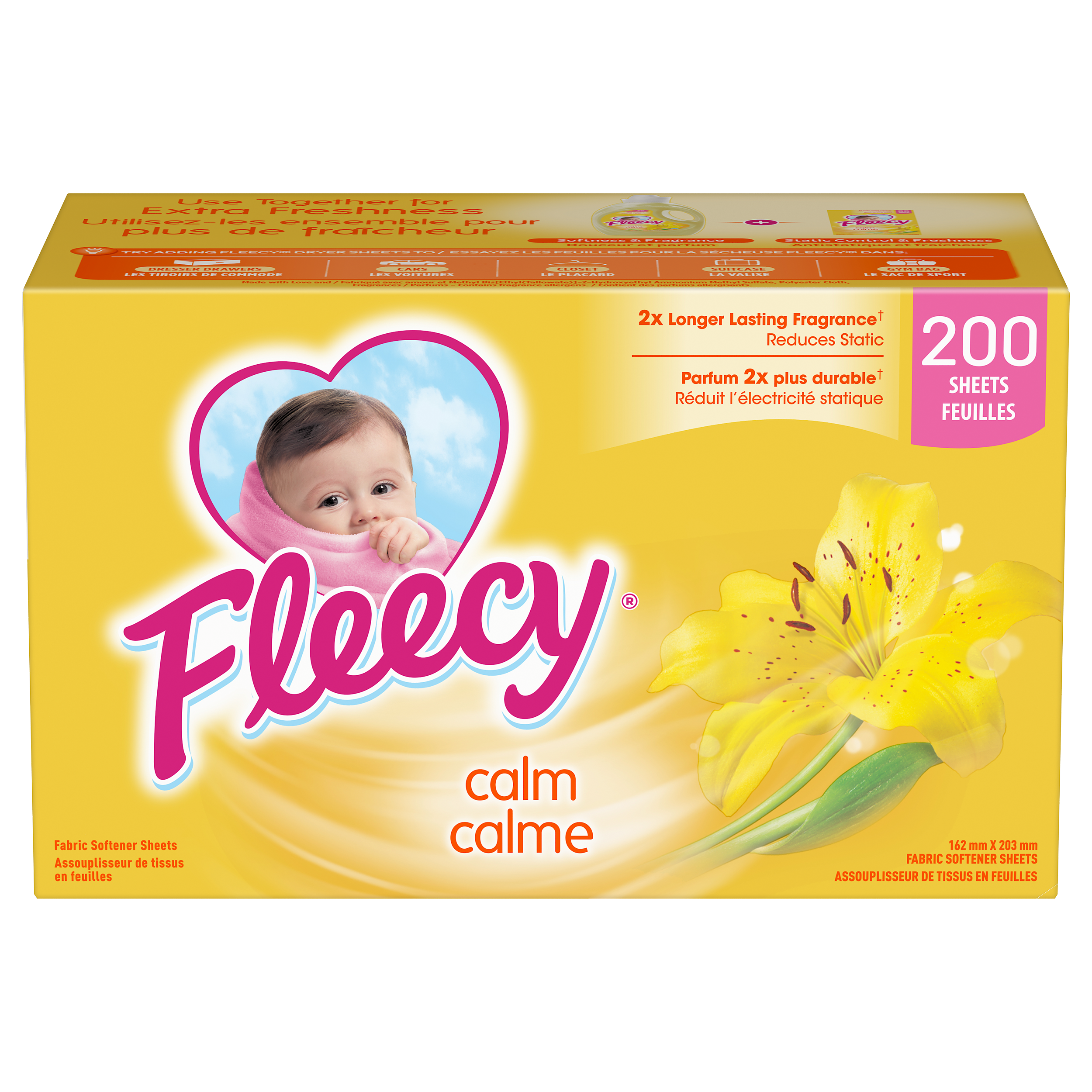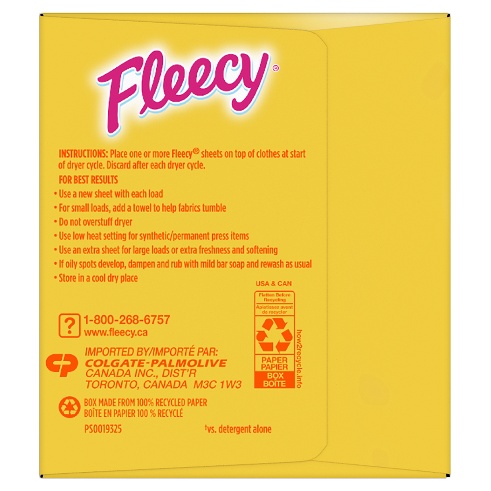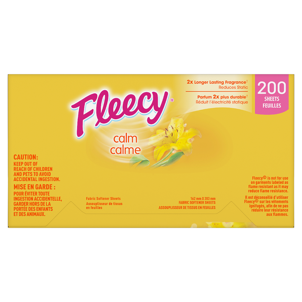 Product Title Fleecy Aroma Therapy Fabric Softener Dryer Sheets, Calm, 200 sheets SKU US04643A SKU eCommerce Name Fleecy Aroma Therapy Fabric Softener Dryer Sheets, Calm, 200 sheets Consumer Unit - GTIN 00058000140554 Case - GTIN 10058000140551 Product Category Home Care Product Sub Category FC Sheets Brand Fleecy Product Sub Brand Fleecy Aroma Therapy Sheets FC Consumer Unit Gross Weight 430.000 GR / 0.430 Consumer Unit Net Weight 0.388 KG / 0.856 LB Consumer Unit Length 96.000 MM / 3.780 IN Consumer Unit Width 178.000 MM / 7.008 IN Consumer Unit Height 108.000 MM / 4.252 IN Consumer Unit Volume 1.841 C8 / 0.065 CF Product Title Fleecy Aroma Therapy Fabric Softener Dryer Sheets, Calm, 200 sheets eCommerce Copy- Long Description Fleecy Aroma Therapy Calm envelops your laundry with the scent of vanilla and honey lotus to calm your senses while it softens. Fleecy Aroma Therapy Calm dryer sheets combine softness and static control with a warming and calming scent. Keywords (eCommerce) fleecy, flecy, fleecie, fleece, laundry, loads, softner, laundry, best, softness, freshness, best fragrance, softening, laundry, laundry detergent, laundry supplies, bedding, aroma, value, softens, bed sheets, towels, great smell, soothing, long lasting, sensitive, skin, washer, clothes, flowery OS Amazon Product Title Fleecy Aroma Therapy Calm Dryer Sheets, Fabric Softener, Vanilla and Honey Lotus Scent, 200 Sheets OS Amazon Product Description Experience the soothing allure of Fleecy Dryer Sheets in Vanilla and Honey Lotus Scent. Each box comes with 200 sheets, crafted to give your family's laundry an irresistible softness and leave a scent of vanilla and honey lotus fragrance. These dryer sheets help control static, repel lint & hair, and soften your fabrics. Our innovative formula softens your clothes while infusing them 2X longer-lasting fragrance. For comprehensive fabric care, use both Fleecy liquid and Fleecy dryer sheets for freshness and added static control (1). This combination enhances both freshness and static control, maximizing the comfort and scent of your garments. Opt for Fleecy Dryer Sheets for a more enjoyable and scent-enhanced laundry routine, where the essence of nature enhances the comfort of your home. (1) when used with Fleecy Liquid Fabric Softener OS Amazon Bullet 1 One 200 count box of Fleecy Aroma Therapy Calm Dryer Sheets, Fabric Conditioner OS Amazon Bullet 2 Crafted to give your family's laundry an irresistible softness and leave a scent of vanilla and honey lotus fragrance OS Amazon Bullet 3 These dryer sheets help control static, repel lint & hair, and soften your fabrics OS Amazon Bullet 4 For comprehensive fabric care, use both Fleecy liquid and Fleecy dryer sheets for freshness and added static control (1) OS Amazon Bullet 5 Keep your fabrics feeling new longer with Fleecy Dryer Sheets that extend fabric life by reducing wear from static and lint OS Walmart Product Title Fleecy Aroma Therapy Calm Dryer Sheets, Vanilla and Honey Lotus, 200 Sheets OS Walmart Product Description Experience the soothing allure of Fleecy Dryer Sheets in Vanilla and Honey Lotus Scent. Each box comes with 200 sheets, crafted to give your family's laundry an irresistible softness and leave a scent of vanilla and honey lotus fragrance. These dryer sheets help control static, repel lint & hair, and soften your fabrics. Our innovative formula softens your clothes while infusing them 2X longer-lasting fragrance. For comprehensive fabric care, use both Fleecy liquid and Fleecy dryer sheets for freshness and added static control (1). This combination enhances both freshness and static control, maximizing the comfort and scent of your garments. Opt for Fleecy Dryer Sheets for a more enjoyable and scent-enhanced laundry routine, where the essence of nature enhances the comfort of your home. (1) when used with Fleecy Liquid Fabric Softener OS Walmart Bullet 1 One 200 count box of Fleecy Aroma Therapy Calm Dryer Sheets, Fabric Conditioner OS Walmart Bullet 2 Crafted to give your family's laundry an irresistible softness and leave a scent of vanilla and honey lotus fragrance OS Walmart Bullet 3 These dryer sheets help control static, repel lint & hair, and soften your fabrics OS Walmart Bullet 4 For comprehensive fabric care, use both Fleecy liquid and Fleecy dryer sheets for freshness and added static control (1) OS Walmart Bullet 5 Keep your fabrics feeling new longer with Fleecy Dryer Sheets that extend fabric life by reducing wear from static and lint OS Walmart Bullet 6 Our innovative formula softens your fabrics while infusing them 2X longer-lasting fragrance OS Walmart Bullet 7 Opt for Fleecy Dryer Sheets for a more enjoyable and scent-enhanced laundry routine, where the essence of nature enhances the comfort of your home Walmart Bullet 1 Gives your family’s laundry an irresistible softness Walmart Bullet 2 Leaves a scent of vanilla and honey lotus fragrance Walmart Bullet 3 Fleecy Sheets also help control static, repel lint & hair, soften your fabrics Walmart Bullet 4 Use both Fleecy® liquid and Fleecy® dryer sheets for freshness and added static control.† OS Loblaws Product Title Aroma Therapy Calm Dryer Sheets, 200 Sheets OS Loblaws Product Description Experience the soothing allure of Fleecy Dryer Sheets in Vanilla and Honey Lotus Scent. Each box comes with 200 sheets, crafted to give your family's laundry an irresistible softness and leave a scent of vanilla and honey lotus fragrance. These dryer sheets help control static, repel lint & hair, and soften your fabrics. Our innovative formula softens your clothes while infusing them 2X longer-lasting fragrance. For comprehensive fabric care, use both Fleecy liquid and Fleecy dryer sheets for freshness and added static control (1). This combination enhances both freshness and static control, maximizing the comfort and scent of your garments. (1) when used with Fleecy Liquid Fabric Softener OS Loblaws Bullet 1 One 200 count box of Fleecy Aroma 