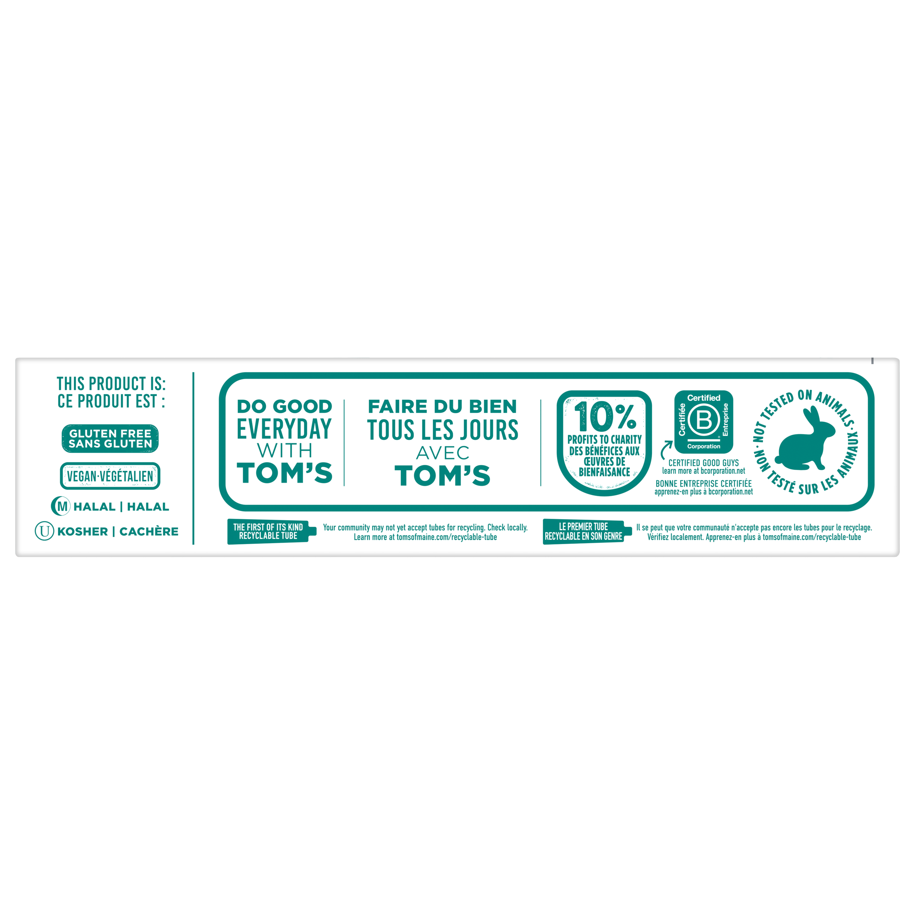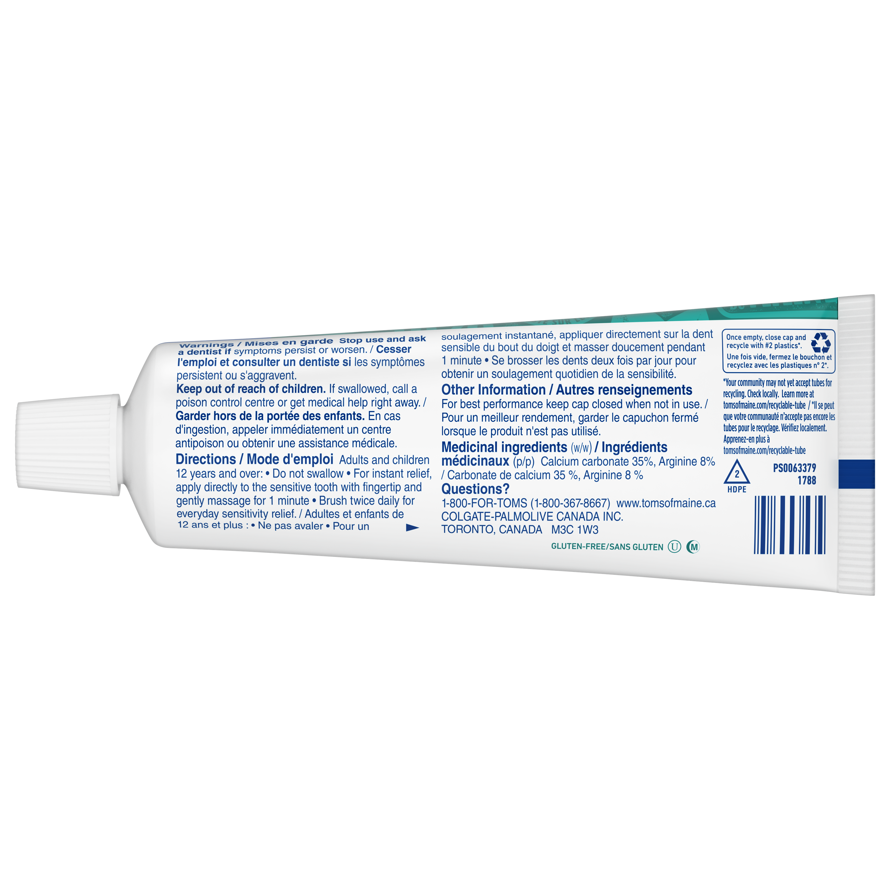 Product Title Tom's of Maine Fresh Mint Rapid Relief Sensitive Natural Paste, Fresh Mint, 76 mL SKU US04869A SKU eCommerce Name Tom's of Maine Fresh Mint Rapid Relief Sensitive Natural Paste, Fresh Mint, 76 mL Consumer Unit - GTIN 00077326455562 Case - GTIN 10077326455569 Product Category Oral Care Product Sub Category Toothpaste Brand Tom's of Maine Product Sub Brand Tom's Rapid Relief TP Consumer Unit Gross Weight 0.151 KG / 0.333 LB Consumer Unit Net Weight 0.118 KG / 0.260 LB Consumer Unit Length 37.000 MM / 1.457 IN Consumer Unit Width 56.000 MM / 2.205 IN Consumer Unit Height 166.000 MM / 6.535 IN Consumer Unit Volume 0.311 C8 / 0.011 CF Product Title Tom's of Maine Fresh Mint Rapid Relief Sensitive Natural Paste, Fresh Mint, 76 mL eCommerce Copy Dentifrice sans fluorure pour dents sensibles Soulagement rapide de Tom’s of Maine, menthe fraîche, 76 mL Aidez à protéger vos dents sensibles de la douleur causée par la sensibilité avec le dentifrice sans fluorure pour dents sensibles Soulagement Rapide de Tom’s of Maine. Le dentifrice pour dents sensibles Soulagement rapide de Tom’s of Maine protège instantanément contre la douleur causée par la sensibilité* pour aider à soulager les dents sensibles. Utilisé régulièrement, ce dentifrice naturel crée un écran protecteur qui agit comme un scellement protecteur contre la sensibilité. *lorsque utilisé selon le mode d’emploi (après l’apparition de la douleur) eCommerce Copy- Long Description Dentifrice sans fluorure pour dents sensibles Soulagement rapide de Tom’s of Maine, menthe fraîche, 76 mL Aidez à protéger vos dents sensibles de la douleur causée par la sensibilité avec le dentifrice sans fluorure pour dents sensibles Soulagement Rapide de Tom’s of Maine. Le dentifrice pour dents sensibles Soulagement rapide de Tom’s of Maine protège instantanément contre la douleur causée par la sensibilité* pour aider à soulager les dents sensibles. Utilisé régulièrement, ce dentifrice naturel crée un écran protecteur qui agit comme un scellement protecteur contre la sensibilité. Un dentifrice pour dents sensibles Le dentifrice pour dents sensibles Soulagement rapide de Tom’s of Maine est un dentifrice sans fluorure pour dents sensibles. De plus, le dentifrice est offert en saveur rafraîchissante de menthe fraîche pour aider à rafraîchir votre haleine à chaque brossage. Utilisez ce dentifrice pour dents sensibles mentholé pour les dents sensibles et une haleine fraîche. Des ingrédients de soins buccodentaires mélangés soigneusement Tom's of Maine utilise des ingrédients naturellement dérivés et d’origine naturelle pour créer des produits de soins buccodentaires qui fonctionnent. La formule de dentifrice sans fluorure comprend de l’arginine et du carbonate de calcium naturellement dérivés qui bouchent les passages menant aux nerfs pour aider à bloquer la douleur. Ce dentifrice pour dents sensibles est exempt de gluten ainsi que d’arômes, d’édulcorants et de colorants artificiels, et n’a pas été testé sur les animaux. Voilà une chose dont on peut se réjouir. *lorsque utilisé selon le mode d’emploi (après l’apparition de la douleur) Keywords (eCommerce) dentifrice antisensibilité dentifrice contre la sensibilité dentifrice naturel dentifrice sans fluorure dentifrice à la menthe dentifrice pour dents sensibles dentifrice végétalien OS Amazon Product Title Tom’s of Maine Rapid Relief Sensitive Toothpaste, Fluoride Free Toothpaste for Sensitive Teeth, Helps Shield from Sensitivity Pain and Freshens Breath, Fresh Mint, 76mL OS Amazon Product Description Help shield sensitive teeth from sensitivity pain with the Tom’s of Maine Rapid Relief Fluoride Free Sensitive Toothpaste. Tom’s of Maine Rapid Relief Sensitive Toothpaste instantly shields from sensitivity pain* to help relieve sensitive teeth. With regular use, this natural toothpaste builds a protective barrier that acts like a seal against sensitivity. Tom’s of Maine Rapid Relief Sensitive Toothpaste is a fluoride free toothpaste for sensitive teeth. Plus, the toothpaste comes in a refreshing Fresh Mint flavour to help freshen your breath every time you brush. Use this minty sensitivity toothpaste for sensitive teeth and fresh breath. Tom's of Maine uses naturally derived and naturally sourced ingredients to create oral care products that work. The fluoride free toothpaste formula includes the naturally derived Arginine and Calcium Carbonate that seal pathways to the nerves to help seal-out pain. This sensitive toothpaste is gluten free and free from artificial flavours, sweeteners, and dyes, and has not been tested on animals. Now that’s something you can feel good about. *when used as directed OS Amazon Bullet 1 Includes one (1) 76mL tube of Tom’s of Maine Rapid Relief Sensitive Toothpaste, Fluoride Free Toothpaste OS Amazon Bullet 2 This sensitive toothpaste instantly shields from sensitivity pain* (*when used as directed) OS Amazon Bullet 3 The sensitivity toothpaste uses naturally derived amino acids like Arginine and Calcium Carbonate to help seal-out pain* OS Amazon Bullet 4 The revitalizing Fresh Mint toothpaste flavour helps freshen your breath every time you brush OS Amazon Bullet 5 **For instant relief, apply directly to the sensitive tooth with fingertip and gently massage for 1 minute OS Walmart Product Title Tom’s of Maine Rapid Relief Sensitive Toothpaste, Fluoride Free, Mint, 76mL OS Walmart Product Description Tom’s of Maine Rapid Relief Sensitive Toothpaste, Fluoride Free, Fresh Mint, 76mL Help shield sensitive teeth from sensitivity pain with the Tom’s of Maine Rapid Relief Fluoride Free Sensitive Toothpaste. Tom’s of Maine Rapid Relief Sensitive Toothpaste instantly shields from sensitivity pain* to help relieve sensitive teeth. With regular use, this natural toothpaste builds a protective barrier that acts like a seal against sensitivity. A Toothpaste for Sensitive Tee