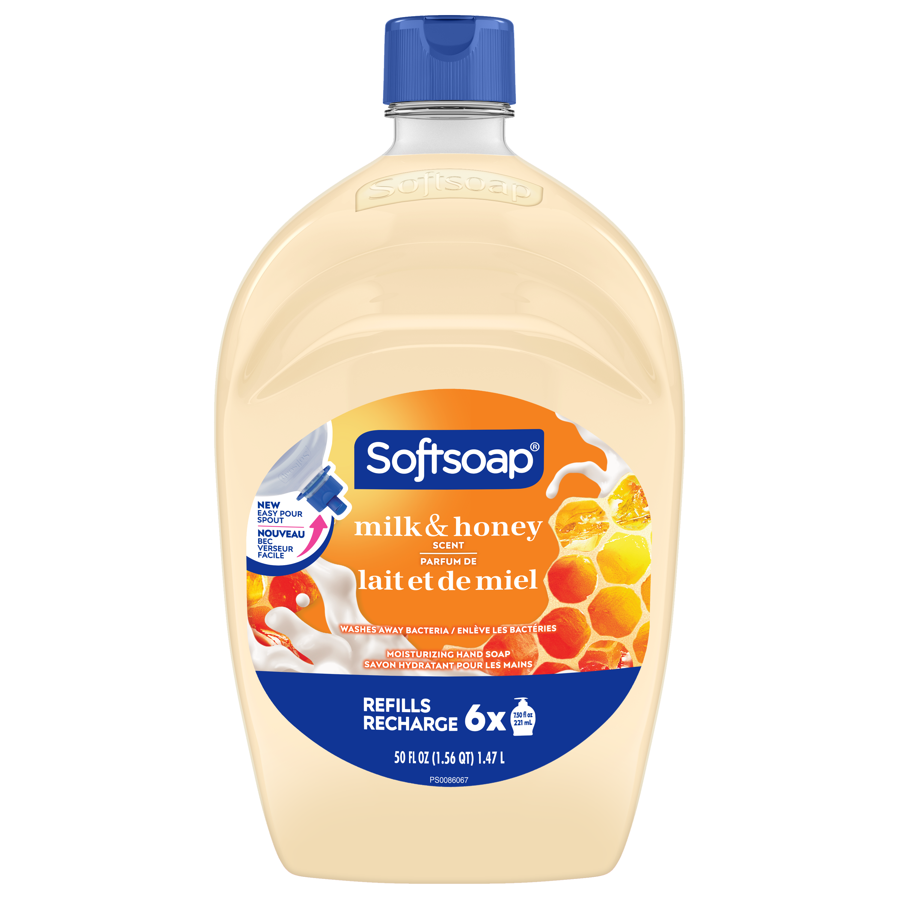 Product Title Softsoap Moisturizing Liquid Hand Soap Refill, Milk & Golden Honey - 1.47 L SKU US05263A SKU eCommerce Name Softsoap Moisturizing Liquid Hand Soap Refill, Milk & Golden Honey - 1.47 L Consumer Unit - GTIN 00074182463298 Case - GTIN 10074182463295 Product Category Personal Care Product Sub Category Liquid Hand Wash Brand Softsoap Product Sub Brand Softsoap LHW Consumer Unit Gross Weight 1.572 KG / 3.466 LB Consumer Unit Net Weight 1.508 KG / 3.325 LB Consumer Unit Length 79.000 MM / 3.110 IN Consumer Unit Width 141.000 MM / 5.551 IN Consumer Unit Height 238.000 MM / 9.370 IN Consumer Unit Volume 2.605 C8 / 0.092 CF Product Title Softsoap Moisturizing Liquid Hand Soap Refill, Milk & Golden Honey - 1.47 L Product Description Keep your favorite Softsoap Moisturizing Liquid Hand Soap stocked and ready for use. As the #1 liquid hand soap brand (1), Softsoap delivers an uplifting experience with each use. Whether this soap is used in the kitchen or as a bathroom hand soap, you’ll love that this moisturizing soap leaves your hands feeling soft and smooth. This liquid hand soap is formulated with extracts of milk protein and sweet honey. It washes away bacteria so you can confidently clean your hands, aligning with health care recommendations to wash hands with soap and clean running water for 20 seconds. Proudly formulated without parabens or phthalates so you can feel good about washing your hands. Let Softsoap's Milk & Honey scented liquid hand soap infuse a little bit of fun into your daily routine and transform every handwashing moment into a delightful one. (1) Based in part on data reported by Nielsen through its Market Track Service for the Liquid Hand Soap Category for the 52 week period ending 02/14/25, for the All Outlet market. Copyright © 2025 Nielsen. eCommerce Copy Softsoap Moisturizing Liquid Hand Soap, Milk & Golden Honey, helps leave your hands feeling soft and smooth. Indulge in an unforgettable hand washing experience with milk protein and honey extracts. Bring a moment of joy to your day. eCommerce Copy- Long Description From the #1 liquid hand soap* brand comes a moisturizing hand soap refill in a Milk & Honey scent, that will leave your skin feeling soft and smooth.This 1.47 L bottle refills over six 221 mL bottles. This liquid hand soap effectively washes away bacteria for clean and fresh hands. Feel the joy of clean with Softsoap hand soap! *Based in part on data reported by Nielsen through its Market Track Service for the Liquid Hand Soap Category for the 52 week period ending 1/1/22, for the All Outlet market. Copyright © 2022 Nielsen. Great Clean. For Everyone. Confidently wash your hands with Softsoap while enjoying fragrant scents and fun labels that will bring you joy. For everyone, every mood, and every sink, Softsoap hand soap is designed to make you feel joyfully clean. Use Softsoap Milk & Honey liquid hand soap in the bathroom or the kitchen to uplift every small moment while keeping your hands clean. Feel Good About Washing Your Hands This liquid hand soap washes away bacteria and is an effective way to keep hands clean. Plus, this liquid soap is paraben free and formulated without phthalates, uses 48% less plastic* and retains skin’s natural moisture, so you can feel good about washing your hands. *per mL vs. 221 mL pumps Feel the Joy of Clean We believe that the little moments throughout your day should be fun! With delightful bubbles and fragrant scents, every trip to the sink and every shower leaves you feeling uplifted. Enjoy those small moments of joy, get brilliantly clean with our liquid hand soaps and body washes—now, you’re ready to take on the world! Bullet 1 One 1.47 L refill bottle of Softsoap Moisturizing Liquid Hand Soap, Milk & Honey Scent Bullet 2 Softsoap is the #1 liquid hand soap brand (1) Bullet 3 This liquid hand soap is formulated with extracts of milk protein and sweet honey Bullet 4 Our hand soap refill is mess free making it versatile to use in the bathroom or as a kitchen hand soap Bullet 5 Proudly formulated without parabens or phthalates, this dermatologist-tested hand soap will keep your hands clean and fresh Bullet 6 This hand soap washes away bacteria so you can confidently clean your hands, aligning with health care recommendations to wash hands with soap and clean running water for 20 seconds Keywords (eCommerce) handsoap, hand wash, best, hydrating, nice smell, protection, colds, virus, sensitive skin, allergies, non-irritating, bar soap, non-drying, easy rinse, illness, infection, lather, environmentally friendly, value, quality, premium, safe, children, kids, schools, fresh scent, lightly scented, milk, golden honey, moisturizing OS Amazon Product Title Softsoap Moisturizing Liquid Hand Soap, Kitchen and Bathroom Hand Soap, Milk & Honey Scent, 1.47 L Refill OS Amazon Product Description Keep your favorite Softsoap Moisturizing Liquid Hand Soap stocked and ready for use. As the #1 liquid hand soap brand (1), Softsoap delivers an uplifting experience with each use. Whether this soap is used in the kitchen or as a bathroom hand soap, you’ll love that this moisturizing soap leaves your hands feeling soft and smooth. This liquid hand soap is formulated with extracts of milk protein and sweet honey. It washes away bacteria so you can confidently clean your hands, aligning with health care recommendations to wash hands with soap and clean running water for 20 seconds. Proudly formulated without parabens or phthalates so you can feel good about washing your hands. Let Softsoap's Milk & Honey scented liquid hand soap infuse a little bit of fun into your daily routine and transform every handwashing moment into a delightful one. (1) Based in part on data reported by Nielsen through its Market Track Service for the Liquid Hand Soap Category for the 52 week period ending 02/14/25, for the All Outlet market. Copyright © 2025 Nielsen. OS Amazon Bullet 1 One 1.47 L refill bottle of Softsoap Moisturizing Liquid Ha