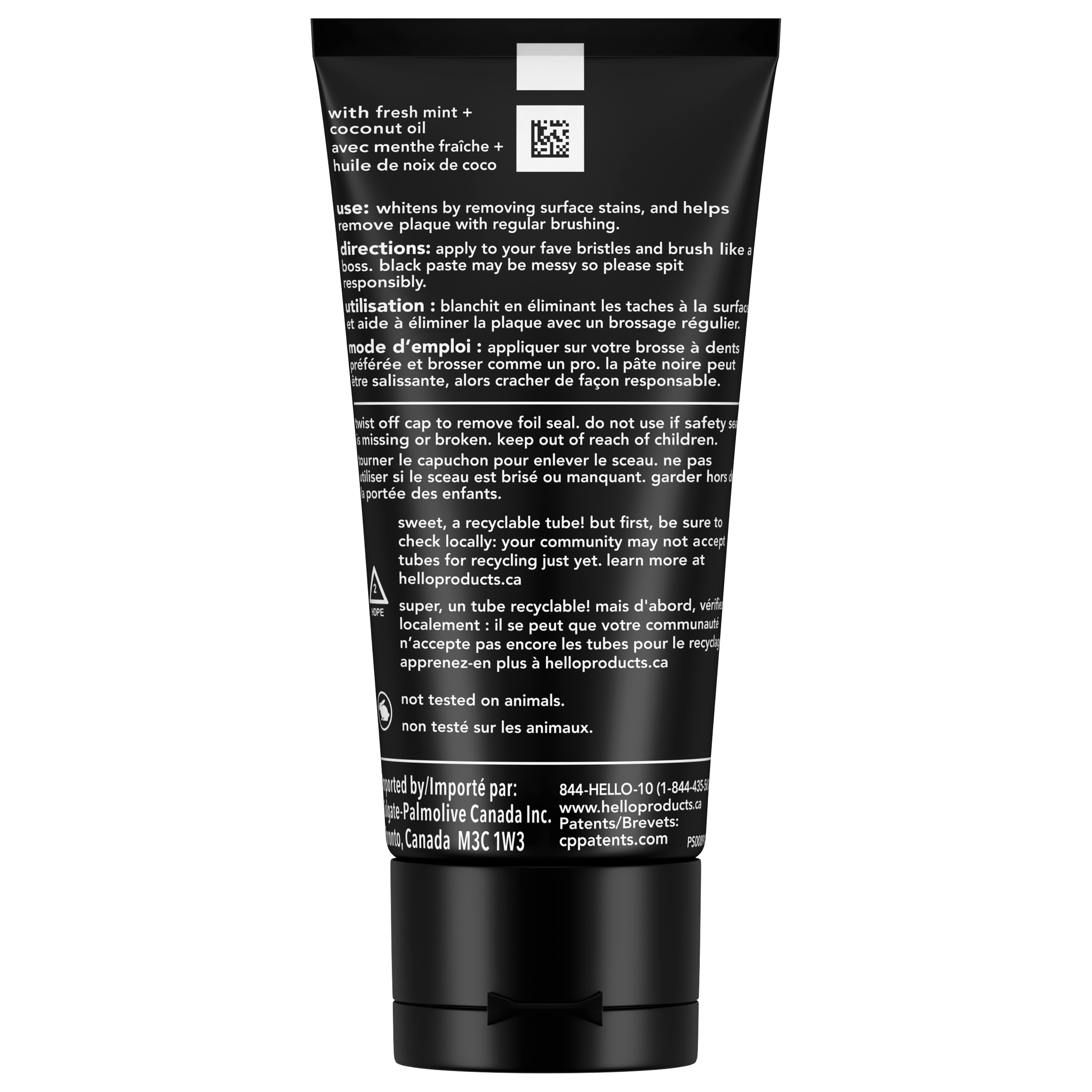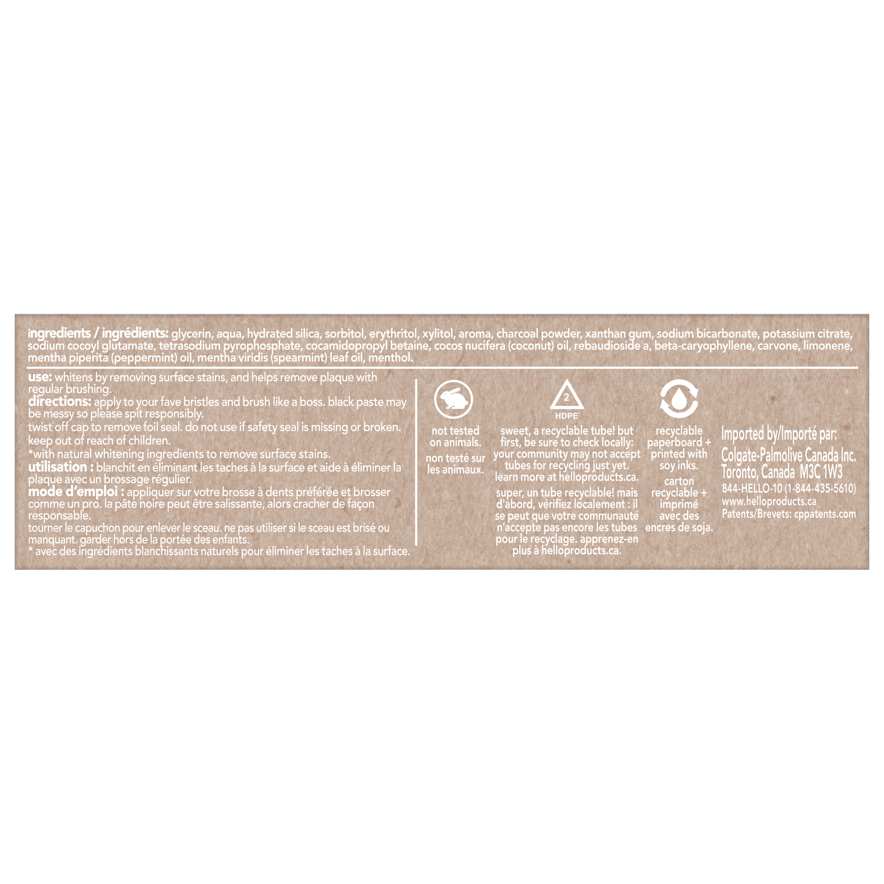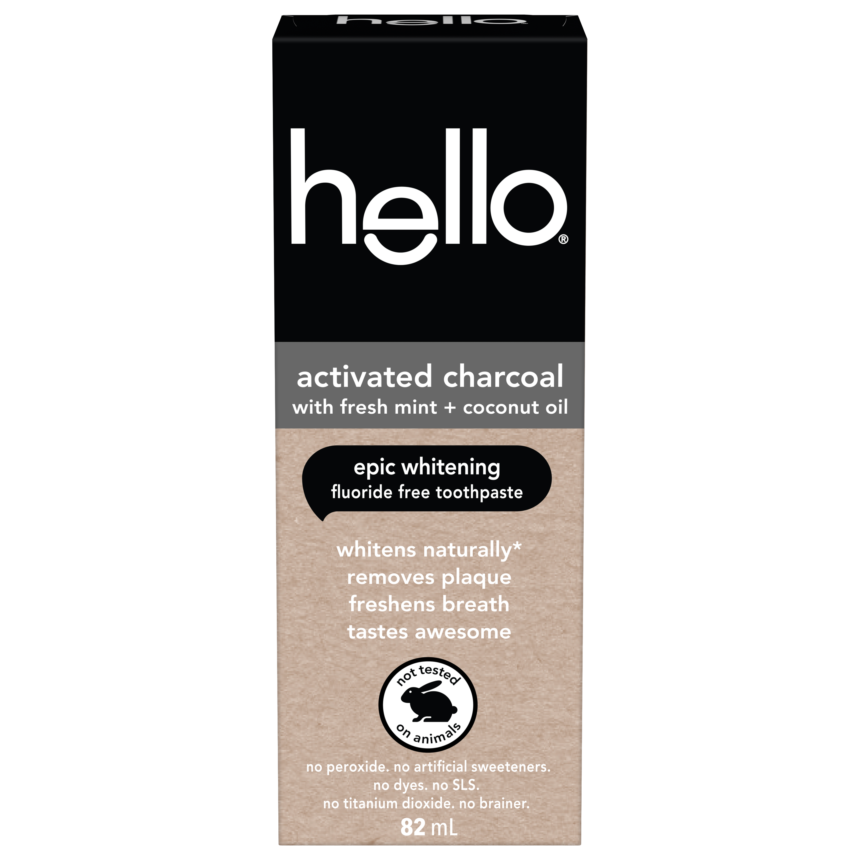 Product Title hello Epic Whitening Fluoride Free Activated Charcoal Toothpaste, Fresh Mint, 82 mL SKU US07412A SKU eCommerce Name hello Epic Whitening Fluoride Free Activated Charcoal Toothpaste, Fresh Mint, 82 mL Consumer Unit - GTIN 00035000987112 Case - GTIN 10035000987119 Product Category Oral Care Product Sub Category Toothpaste Brand Hello Product Sub Brand Hello Adult TP Consumer Unit Gross Weight 0.139 KG / 0.306 LB Consumer Unit Net Weight 0.112 KG / 0.247 LB Consumer Unit Length 44.000 MM / 1.732 IN Consumer Unit Width 55.000 MM / 2.165 IN Consumer Unit Height 147.000 MM / 5.787 IN Consumer Unit Volume 0.356 C8 / 0.013 CF Product Title hello Epic Whitening Fluoride Free Activated Charcoal Toothpaste, Fresh Mint, 82 mL Product Description Say hello to a friendly teeth whitening toothpaste with hello Epic Whitening Activated Charcoal Toothpaste. This fluoride free toothpaste is thoughtfully formulated with quality ingredients like fresh mint, coconut oil, and activated charcoal that is safe for enamel and freshens your breath like nobody’s business. Made with activated charcoal, this black toothpaste might look weird but it works brilliantly and tastes awesome. This minty charcoal whitening toothpaste whitens naturally* by polishing and cleaning surface stains on your teeth to help with a whiter smile and fresher breath. But buckle-up, there's more goodness to this charcoal toothpaste. hello Epic Whitening Charcoal Toothpaste is a fluoride free toothpaste that contains no artificial sweeteners, no artificial flavours, no peroxide, no titanium dioxide, no dyes, no SLS, and this fresh mint toothpaste is vegan. As if that weren't enough magic for one tube, hello toothpaste is also not tested on animals. We're serious about being friendly. *with natural whitening ingredients to remove surface stains eCommerce Copy Say hello to a friendly teeth whitening toothpaste with hello Epic Whitening Activated Charcoal Toothpaste. This fluoride free toothpaste is thoughtfully formulated with quality ingredients like fresh mint, coconut oil, and activated charcoal that is safe for enamel and freshens your breath like nobody’s business. Made with activated charcoal, this black toothpaste might look weird but it works brilliantly and tastes awesome. eCommerce Copy- Long Description hello Epic Whitening Fluoride Free Activated Charcoal Toothpaste, Fresh Mint, 82 mL Say hello to a friendly teeth whitening toothpaste with hello Epic Whitening Activated Charcoal Toothpaste. This fluoride free toothpaste is thoughtfully formulated with quality ingredients like fresh mint, coconut oil, and activated charcoal that is safe for enamel and freshens your breath like nobody’s business. Made with activated charcoal, this black toothpaste might look weird but it works brilliantly and tastes awesome. Whitens Teeth This minty charcoal whitening toothpaste whitens naturally* by polishing and cleaning surface stains on your teeth to help with a whiter smile and fresher breath. But buckle-up, there's more goodness to this charcoal toothpaste. Only The Good Stuff Allowed hello Epic Whitening Charcoal Toothpaste is a fluoride free toothpaste that contains no artificial sweeteners, no artificial flavours, no peroxide, no titanium dioxide, no dyes, no SLS, and this fresh mint toothpaste is vegan. As if that weren't enough magic for one tube, hello toothpaste is also not tested on animals. We're serious about being friendly. *with natural whitening ingredients to remove surface stains Bullet 1 Includes one (1) 82 mL tube of hello Epic Whitening Activated Charcoal Toothpaste, Fluoride Free Whitening Toothpaste Bullet 2 This fresh mint toothpaste with activated charcoal tastes awesome and whitens naturally* while also helping remove plaque when brushing Bullet 3 This activated charcoal toothpaste is specially formulated with fresh mint, coconut oil, and activated charcoal and is safe on enamel Bullet 4 This hello toothpaste is fluoride free, peroxide free, SLS free and has no artificial sweeteners or flavours, no dyes, no parabens, no-brainer Bullet 5 hello Epic Whitening Activated Charcoal Toothpaste is a vegan toothpaste and is not tested on animals Keywords (eCommerce) whitening toothpaste, fluoride free toothpaste, vegan toothpaste, activated charcoal toothpaste, charcoal toothpaste, fresh mint toothpaste, black toothpaste, OS Amazon Product Title hello Epic Whitening Activated Charcoal Toothpaste, Fluoride Free Toothpaste with Charcoal and Coconut Oil, Whitens Naturally, Helps Remove Plaque, SLS Free, Fresh Mint, 82 mL Tube OS Amazon Product Description Say hello to a friendly teeth whitening toothpaste with hello Epic Whitening Activated Charcoal Toothpaste. This fluoride free toothpaste is thoughtfully formulated with quality ingredients like fresh mint, coconut oil, and activated charcoal that is safe for enamel and freshens your breath like nobody’s business. Made with activated charcoal, this black toothpaste might look weird but it works brilliantly and tastes awesome. This minty charcoal whitening toothpaste whitens naturally* by polishing and cleaning surface stains on your teeth to help with a whiter smile and fresher breath. But buckle-up, there's more goodness to this charcoal toothpaste. hello Epic Whitening Charcoal Toothpaste is a fluoride free toothpaste that contains no artificial sweeteners, no artificial flavours, no peroxide, no titanium dioxide, no dyes, no SLS, and this fresh mint toothpaste is vegan. As if that weren't enough magic for one tube, hello toothpaste is also not tested on animals. We're serious about being friendly. *with natural whitening ingredients to remove surface stains OS Amazon Bullet 1 WHAT I’M GETTING: One (1) 82 mL tube of hello Epic Whitening Activated Charcoal Toothpaste, Fluoride Free Whitening Toothpaste OS Amazon Bullet 2 WHITENS NATURALLY*: This fresh mint toothpaste with activated charcoal tastes awesome and whitens naturally* while also helping remove plaq