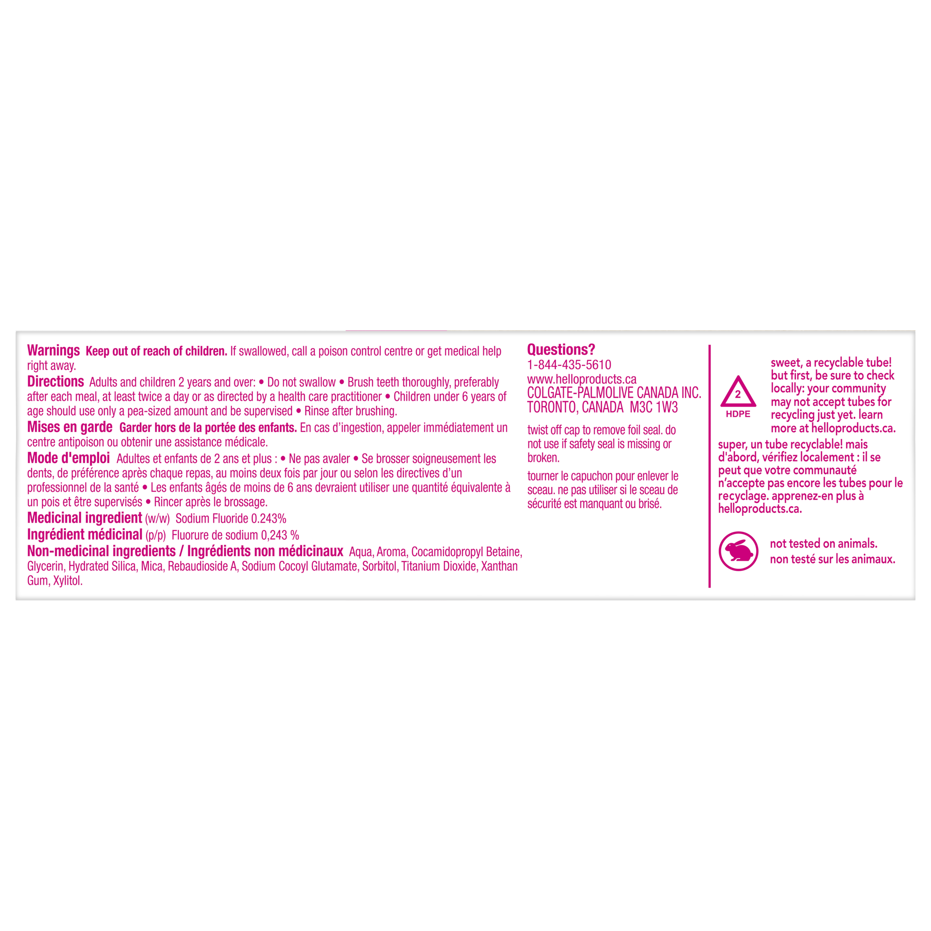 OS Walmart Bullet 1 WHAT I’M GETTING: Includes one (1) 199 g tube of hello Unicorn Sparkle Kids Toothpaste with Fluoride, Bubble Gum Toothpaste for Kids OS Walmart Bullet 2 FIGHTS CAVITIES: This kids fluoride toothpaste is safe for children ages 2 and up, helps prevent cavities and strengthens growing teeth using fluoride OS Walmart Bullet 3 MAGICALLY BRILLIANT: The unicorn toothpaste tastes like bubblegum and works brilliantly to build good brushing habits and help brush away plaque OS Walmart Bullet 4 UNICORN APPROVED: hello Unicorn Sparkle Kids Toothpaste is formulated with natural flavour and also helps polish and brighten little smiles OS Walmart Bullet 5 NO BRAINER: This gluten-free kids toothpaste is made with no SLS, preservatives, parabens, dyes, spicy mint, artificial sweeteners or flavours Walmart Bullet 1 WHAT I’M GETTING: Includes one (1) 199 g tube of hello Unicorn Sparkle Kids Toothpaste with Fluoride, Bubble Gum Toothpaste for Kids Walmart Bullet 2 FIGHTS CAVITIES: This kids fluoride toothpaste is safe for children ages 2 and up and helps prevent cavities and strengthens growing teeth using fluoride Walmart Bullet 3 MAGICALLY BRILLIANT: The unicorn toothpaste tastes like bubblegum and works brilliantly as a children’s toothpaste to build good brushing habits and help brush away plaque Walmart Bullet 4 UNICORN APPROVED: hello Unicorn Sparkle Kids Toothpaste is formulated with natural flavour and also helps polish and brighten little smiles Walmart Bullet 5 NO BRAINER: This gluten-free kids toothpaste is made with no SLS, preservatives, parabens, dyes, spicy mint, artificial sweeteners or artificial flavours OS Loblaws Product Title Unicorn Sparkle Kids Toothpaste with Fluoride, Tube OS Loblaws Product Description Celebrate more everyday yay with hello Unicorn Sparkle Kids Toothpaste with Fluoride. This unicorn sparkle children’s toothpaste tastes like rainbows and sparkles and works brilliantly. This kids fluoride toothpaste is safe for kids ages 2 and up and the magical bubble gum toothpaste flavour is a fun way to encourage regular brushing habits at an early age. hello Unicorn Sparkle Kids Toothpaste with Fluoride is thoughtfully formulated with natural flavour, sparkles, and high quality sweeteners like xylitol and stevia. This children’s toothpaste can also help prevent cavities and strengthen enamel, all while brushing away plaque. This kids toothpaste contains no artificial sweeteners, artificial flavours, preservatives, SLS, parabens, dyes, spicy mint, and that is gluten free. OS Loblaws Bullet 1 WHAT I’M GETTING: Includes one (1) 199 g tube of hello Unicorn Sparkle Kids Toothpaste with Fluoride, Bubble Gum Toothpaste for Kids OS Loblaws Bullet 2 FIGHTS CAVITIES: This kids fluoride toothpaste is safe for children ages 2 and up, helps prevent cavities and strengthens growing teeth using fluoride OS Loblaws Bullet 3 MAGICALLY BRILLIANT: The unicorn toothpaste tastes like bubblegum and works brilliantly to build good brushing habits and help brush away plaque OS Loblaws Bullet 4 UNICORN APPROVED: hello Unicorn Sparkle Kids Toothpaste is formulated with natural flavour and also helps polish and brighten little smiles OS Loblaws Bullet 5 NO BRAINER: This gluten-free kids toothpaste is made with no SLS, preservatives, parabens, dyes, spicy mint, artificial sweeteners or flavours