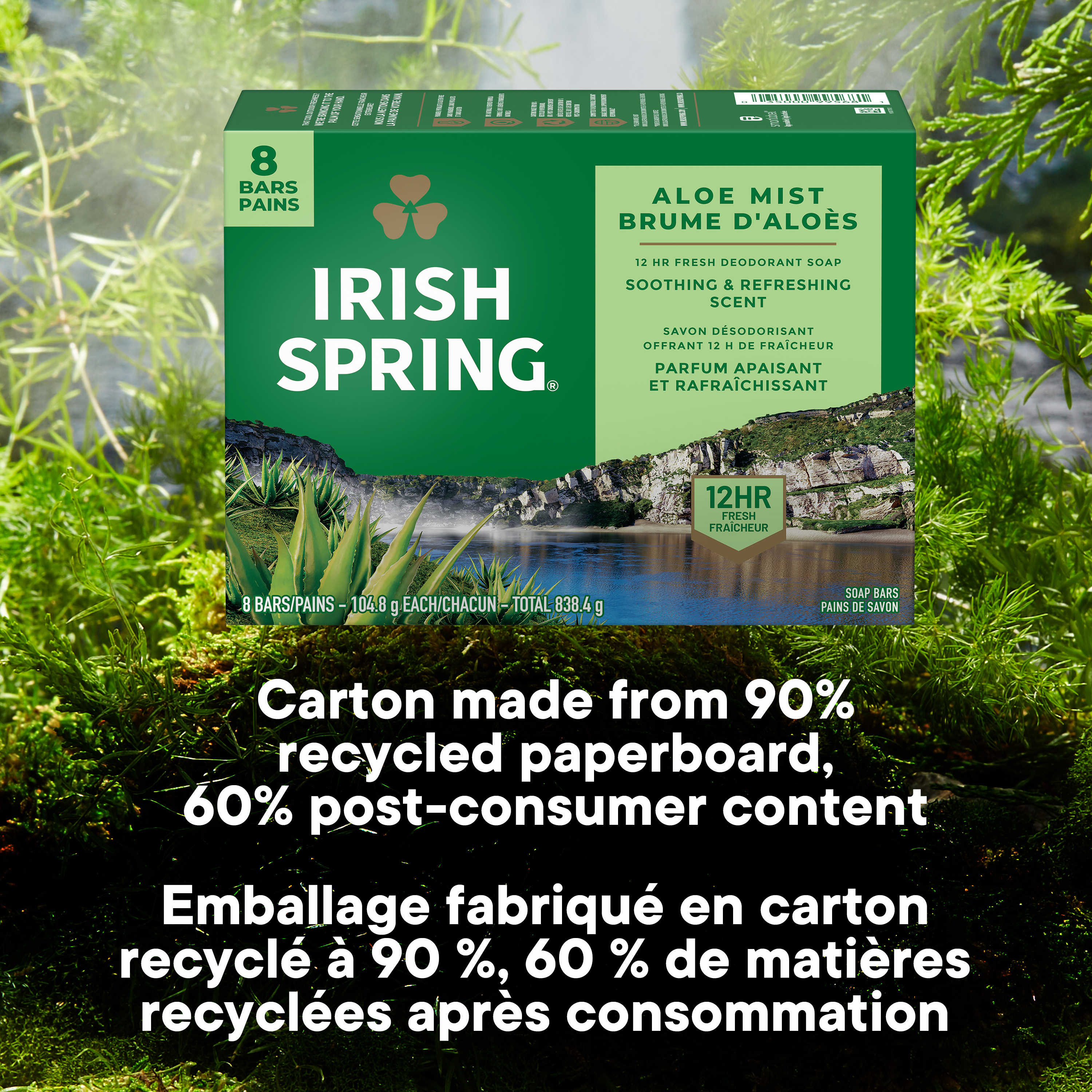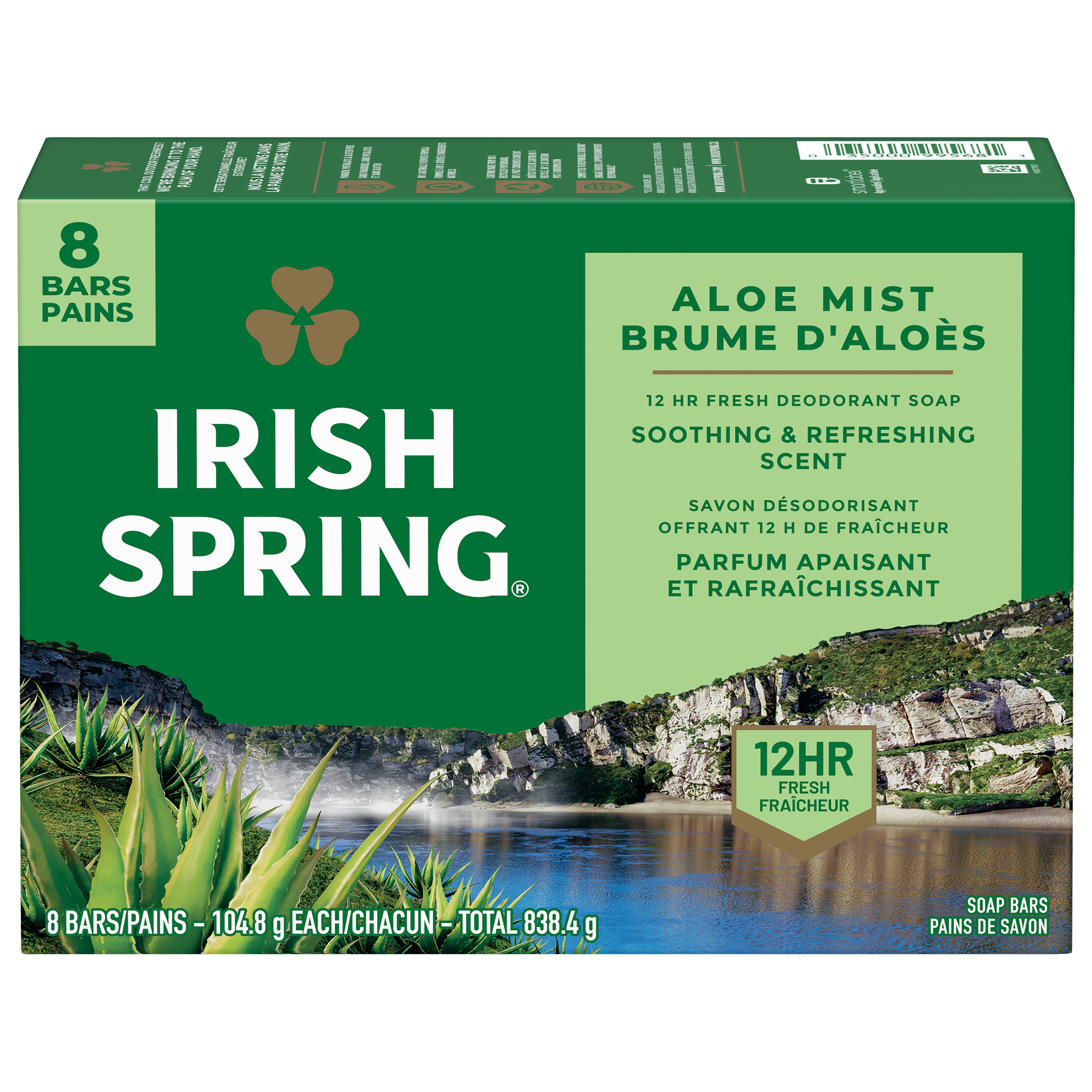 Pain de savon désodorisant Irish Spring Aloe Mist pour homme, Savon désodorisant offrant 12 heures de fraîcheur, Pain de 104,8 g (lot de 8)