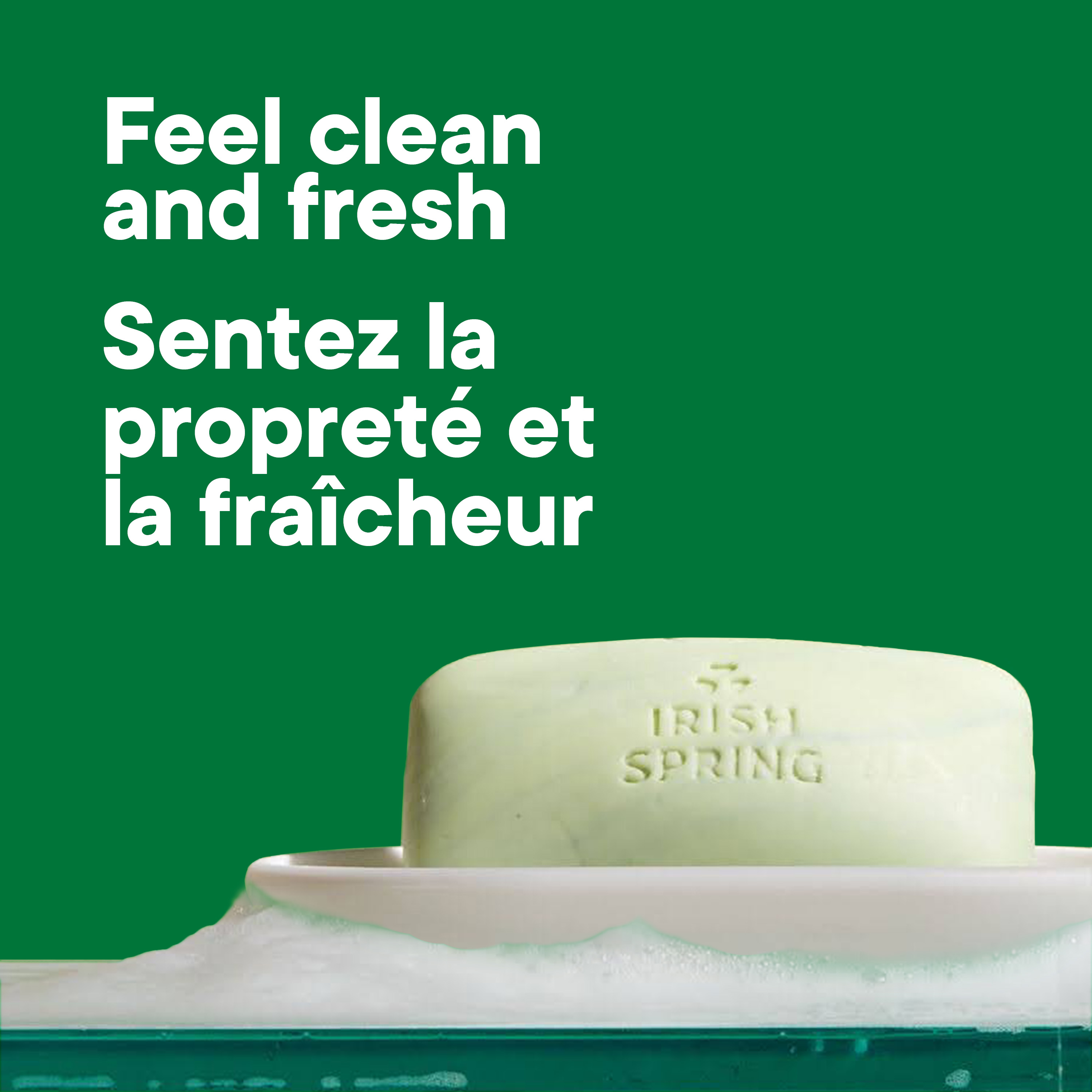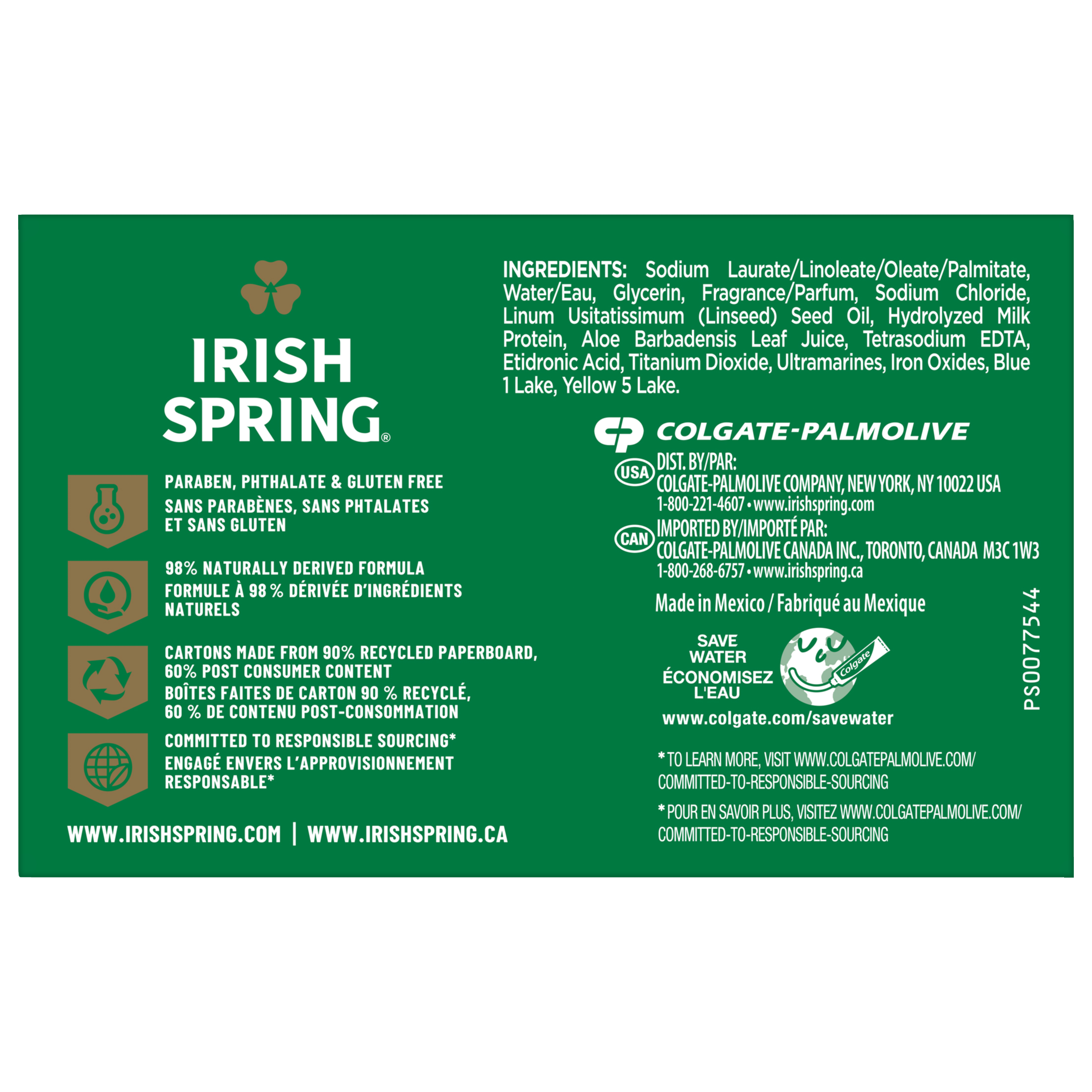 Product Title Pain de savon désodorisant Irish Spring Aloe Mist pour homme, Savon désodorisant offrant 12 heures de fraîcheur, Pain de 104,8 g (lot de 8) SKU 114170 Consumer Unit - GTIN 00035000141187 Case - GTIN 00035000141705 Product Category Personal Care Product Sub Category Bar Soap Brand Irish Spring Product Sub Brand Irish Spring BS Consumer Unit Gross Weight 1.018 KG / 2.245 LB Consumer Unit Net Weight 0.839 KG / 1.850 LB Consumer Unit Length 63.000 MM / 2.480 IN Consumer Unit Width 154.000 MM / 6.063 IN Consumer Unit Height 222.000 MM / 8.740 IN Consumer Unit Volume 2.154 C8 / 0.076 CF Product Title Pain de savon désodorisant Irish Spring Aloe Mist pour homme, Savon désodorisant offrant 12 heures de fraîcheur, Pain de 104,8 g (lot de 8) Product Description Comptez sur le pain de savon Irish Spring Aloe Mist pour laisser une sensation de propreté sur votre peau. Notre pain de savon désodorisant pour homme est composé à 98 % d’ingrédients d’origine naturelle. Il vous permet de rester frais pendant 12 heures et convient à tous les types de peau. Pour une peau profondément hydratée, le pain de savon Irish Spring Aloe Mist aide à attirer et à retenir l’humidité. Notre pain de savon peut être utilisé comme savon pour les mains ou comme nettoyant pour le visage. Ce pain de savon convient à tous les types de peau, y compris les peaux normales, grasses et sèches, et garantit un nettoyage doux mais efficace. Il est également exempt de parabènes, de phtalates et de gluten. Ajoutez un peu d’aventure à votre vie quotidienne avec toute la gamme Irish Spring de gels douche et pains de savon pour hommes. Bullet 1 Contenu : Huit pains de 104,8 g de savon désodorisant Irish Spring Aloe Mist pour homme Bullet 2 Savon désodorisant : Savon désodorisant offrant 12 heures de fraîcheur qui vous laisse une sensation de propreté, de fraîcheur et de confiance tout au long de la journée Bullet 3 Utilisation polyvalente : Le pain de savon Irish Spring mousse et peut être utilisé comme savon pour les mains ou comme nettoyant pour le visage Bullet 4 Ingrédients naturels : formule à 98 % d'ingrédients d'origine naturelle, sans gluten, sans paraben et sans phtalates Bullet 5 Emballage durable : Carton fabriqué à partir de 90 % de carton recyclé, 60 % de contenu post-consommation Bullet 6 Parfum apaisant et rafraîchissant : Cette fraîcheur extérieure? Nous l’apportons au creux de votre main OS Amazon Product Title Pain de savon désodorisant Irish Spring Aloe Mist pour homme, Savon désodorisant offrant 12 heures de fraîcheur, Pain de 104,8 g (lot de 8) OS Amazon Product Description Comptez sur le pain de savon Irish Spring Aloe Mist pour laisser une sensation de propreté sur votre peau. Notre pain de savon désodorisant pour homme est composé à 98 % d’ingrédients d’origine naturelle. Il vous permet de rester frais pendant 12 heures et convient à tous les types de peau. Pour une peau profondément hydratée, le pain de savon Irish Spring Aloe Mist aide à attirer et à retenir l’humidité. Notre pain de savon peut être utilisé comme savon pour les mains ou comme nettoyant pour le visage. Ce pain de savon convient à tous les types de peau, y compris les peaux normales, grasses et sèches, et garantit un nettoyage doux mais efficace. Il est également exempt de parabènes, de phtalates et de gluten. Ajoutez un peu d’aventure à votre vie quotidienne avec toute la gamme Irish Spring de gels douche et pains de savon pour hommes. OS Amazon Bullet 1 Contenu : Huit pains de 104,8 g de savon désodorisant Irish Spring Aloe Mist pour homme OS Amazon Bullet 2 Savon désodorisant : Savon désodorisant offrant 12 heures de fraîcheur qui vous laisse une sensation de propreté, de fraîcheur et de confiance tout au long de la journée OS Amazon Bullet 3 Utilisation polyvalente : Le pain de savon Irish Spring mousse et peut être utilisé comme savon pour les mains ou comme nettoyant pour le visage OS Amazon Bullet 4 Ingrédients naturels : formule à 98 % d'ingrédients d'origine naturelle, sans gluten, sans paraben et sans phtalates OS Amazon Bullet 5 Emballage durable : Carton fabriqué à partir de 90 % de carton recyclé, 60 % de contenu post-consommation OS Amazon On Page Keywords hand soap, body wash, deodorant, bar soap, flaxseed oil, mens bar soap, bar soaps, body washes, aloe, deodorant soap OS Walmart Product Title Pain de savon désodorisant Irish Spring Aloe Mist pour homme, Pain de 104,8 g (lot de 8) OS Walmart Product Description Comptez sur le pain de savon Irish Spring Aloe Mist pour laisser une sensation de propreté sur votre peau. Notre pain de savon désodorisant pour homme est composé à 98 % d’ingrédients d’origine naturelle. Il vous permet de rester frais pendant 12 heures et convient à tous les types de peau. Pour une peau profondément hydratée, le pain de savon Irish Spring Aloe Mist aide à attirer et à retenir l’humidité. Notre pain de savon peut être utilisé comme savon pour les mains ou comme nettoyant pour le visage. Ce pain de savon convient à tous les types de peau, y compris les peaux normales, grasses et sèches, et garantit un nettoyage doux mais efficace. Il est également exempt de parabènes, de phtalates et de gluten. Ajoutez un peu d’aventure à votre vie quotidienne avec toute la gamme Irish Spring de gels douche et pains de savon pour hommes. OS Walmart Bullet 1 Contenu : Huit pains de 104,8 g de savon désodorisant Irish Spring Aloe Mist pour homme OS Walmart Bullet 2 Savon désodorisant : Savon désodorisant offrant 12 heures de fraîcheur qui vous laisse une sensation de propreté, de fraîcheur et de confiance tout au long de la journée OS Walmart Bullet 3 Utilisation polyvalente : Le pain de savon Irish Spring mousse et peut être utilisé comme savon pour les mains ou comme nettoyant pour le visage OS Walmart Bullet 4 Ingrédients naturels : formule à 98 % d'ingrédients d'origine naturelle