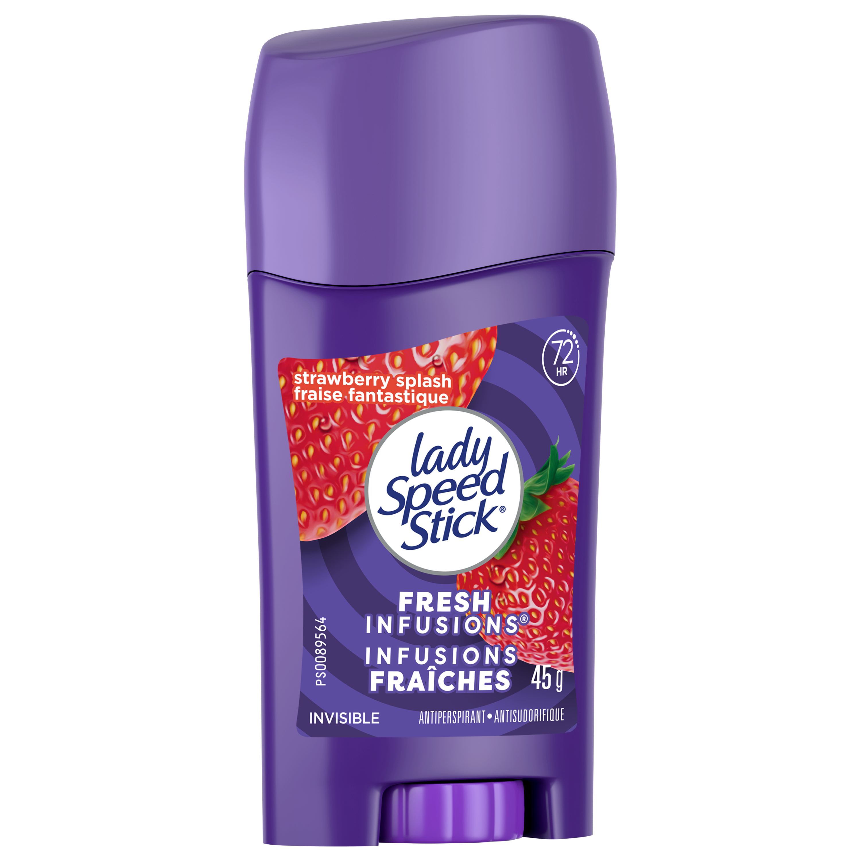 Product Title Déodorant antisudorifique Lady Speed Stick Fresh Infusions pour femmes, protection de 72 heures contre les odeurs et la transpiration, Invisible Dry, parfum Fraise fantastique, bâton de 45 g SKU 312522 Consumer Unit - GTIN 00058000006812 Case - GTIN 10058000006819 Product Category Personal Care Product Sub Category AP > Deo Brand Lady Speed Stick Product Sub Brand Lady Speed Stick Fresh Infusion AP/Deo Consumer Unit Gross Weight 0.091 KG / 0.201 LB Consumer Unit Net Weight 0.045 KG / 0.099 LB Consumer Unit Length 31.000 MM / 1.220 IN Consumer Unit Width 57.000 MM / 2.244 IN Consumer Unit Height 114.000 MM / 4.488 IN Consumer Unit Volume 0.198 C8 / 0.007 CF Product Title Déodorant antisudorifique Lady Speed Stick Fresh Infusions pour femmes, protection de 72 heures contre les odeurs et la transpiration, Invisible Dry, parfum Fraise fantastique, bâton de 45 g Product Description Le bâton déodorant antisudorifique Lady Speed Stick Fresh Infusions est votre solution de confiance pour une protection et une assurance tout au long de la journée. Conçu spécialement pour les femmes, cet antisudorifique offre une protection de 72 heures contre les odeurs et la transpiration, avec un parfum fruité de fraise fantastique qui vous permet de vous sentir au sec et en confiance tout au long de la journée. Conçu pour offrir confort et contrôle, l’applicateur Protection confort unique en son genre assure à chaque fois une application fluide et précise et une couvrance optimale. Grâce à sa protection invisible contre la transpiration, le déodorant Lady Speed Stick vous permet de rester au sec et en confiance sans résidus désagréables, afin que vous puissiez vous concentrer sur votre journée sans vous soucier des marques de transpiration. Que vous soyez au bureau, au gym ou en 5 à 7, le déodorant Lady Speed Stick vous offre des performances exceptionnelles sur lesquelles vous pouvez compter. Améliorez votre routine de soins personnels grâce à la protection déodorante antisudorifique qui vous aide à vous sentir en confiance en toutes circonstances avec le déodorant Lady Speed Stick pour femmes. Bullet 1 Comprend un bâton de 45 g de déodorant antisudorifique Speed Stick Fresh Infusions pour femmes, parfum Fraise fantastique Bullet 2 Découvrez un parfum fruité de fraise fantastique qui vous procure une sensation de propreté et de confiance Bullet 3 Grâce à sa protection antisudorifique longue durée, ce bâton solide offre une protection de 72 heures contre les odeurs et la transpiration Bullet 4 Bénéficiez d’une protection invisible contre l’humidité qui vous permet de porter les vêtements de votre choix, quand vous le souhaitez, sans vous soucier des marques de transpiration Bullet 5 Cet antisudorifique pour femmes est doté d’un applicateur Protection confort unique en son genre, garantissant une application en douceur Bullet 6 Des performances fiables pour vos séances au gym, vos journées de travail chargées et vos sorties nocturnes. Conçu pour les femmes, ce déodorant est idéal pour les modes de vie actifs OS Amazon Product Title Déodorant antisudorifique Lady Speed Stick Fresh Infusions pour femmes, protection de 72 heures contre les odeurs et la transpiration, Invisible Dry, parfum Fraise fantastique, bâton de 45 g OS Amazon Product Description Le bâton déodorant antisudorifique Lady Speed Stick Fresh Infusions est votre solution de confiance pour une protection et une assurance tout au long de la journée. Conçu spécialement pour les femmes, cet antisudorifique offre une protection de 72 heures contre les odeurs et la transpiration, avec un parfum fruité de fraise fantastique qui vous permet de vous sentir au sec et en confiance tout au long de la journée. Conçu pour offrir confort et contrôle, l’applicateur Protection confort unique en son genre assure à chaque fois une application fluide et précise et une couvrance optimale. Grâce à sa protection invisible contre la transpiration, le déodorant Lady Speed Stick vous permet de rester au sec et en confiance sans résidus désagréables, afin que vous puissiez vous concentrer sur votre journée sans vous soucier des marques de transpiration. Que vous soyez au bureau, au gym ou en 5 à 7, le déodorant Lady Speed Stick vous offre des performances exceptionnelles sur lesquelles vous pouvez compter. Améliorez votre routine de soins personnels grâce à la protection déodorante antisudorifique qui vous aide à vous sentir en confiance en toutes circonstances avec le déodorant Lady Speed Stick pour femmes. OS Amazon Bullet 1 CONTENU : Deux bâtons de 65 g de déodorant antisudorifique Speed Stick Fresh Infusions pour femmes, parfum Fraise fantastique OS Amazon Bullet 2 SEC ET FRAIS : Bénéficiez d’une protection invisible et sèche au parfum de Fraise fantastique en portant ce qu'il vous plaît toute la journée tout en vous sentant propre et en confiance OS Amazon Bullet 3 PROTECTION 72 HEURES : Grâce à sa protection antisudorifique longue durée, ce bâton solide offre une protection de 72 heures contre les odeurs et la transpiration OS Amazon Bullet 4 APPLICATION EN DOUCEUR : Cet antisudorifique pour femmes est doté d’un applicateur Protection confort unique en son genre qui assure une application en douceur, vous permettant ainsi de suivre votre routine de soins avec aisance OS Amazon Bullet 5 PRÊT POUR TOUS LES JOURS : Des performances fiables pour vos séances au gym, vos journées de travail chargées et vos sorties nocturnes. Conçu pour les femmes, ce déodorant est idéal pour les modes de vie actifs OS Walmart Product Title Déodorant antisudorifique Lady Speed Stick Fresh Infusions pour femmes, protection de 72 heures contre les odeurs et la transpiration, Invisible Dry, parfum Fraise fantastique, bâton de 45 g OS Walmart Product Description Le bâton déodorant antisudorifique Lady Speed Stick Fresh Infusions est votre solution de confiance pour une 
