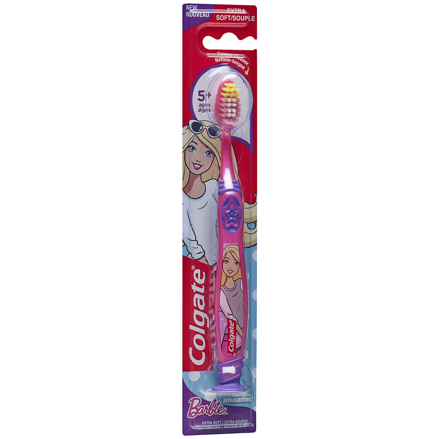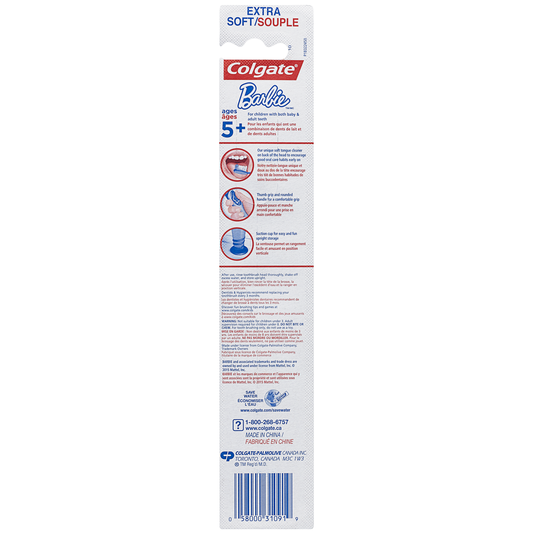 Product Title Brosse à dents extra souple pour enfants Colgate Barbie SKU 313449 SKU eCommerce Name Brosse à dents extra souple pour enfants Colgate Barbie Consumer Unit - GTIN 00058000310919 Product Category Oral Care Product Sub Category Manual TB Brand Colgate Product Sub Brand Colgate Kids Man TB Consumer Unit Gross Weight 0.032 KG / 0.071 LB Consumer Unit Net Weight 0.032 KG / 0.071 LB Consumer Unit Length 2.188 MM / 0.086 IN Consumer Unit Width 4.200 MM / 0.165 IN Consumer Unit Height 229.000 MM / 9.016 IN Consumer Unit Volume 0.210 C8 / 0.007 CF Product Title Brosse à dents extra souple pour enfants Colgate Barbie eCommerce Copy- Long Description La brosse à dents manuelle pour enfants Colgate est une façon amusante d'encourager très tôt de bonnes habitudes de soins buccodentaires! Elle a été spécialement conçue pour les enfants âgés de 5 ans et plus qui présentent une combinaison de dents de lait et de dents d'adulte. Cette brosse à dents est dotée de notre nettoie-langue doux unique au dos de la tête de la brosse afin de nettoyer davantage que les dents, d'un appuie-pouce et d'un manche arrondi pour une prise en main confortable, ainsi que d'une ventouse pour un rangement facile et amusant en position verticale. Keywords (eCommerce) brosse à dent, dent, brosse, brosse à dents, soies, manuelle, langue, nettoyant, nettoyer, nettoie-langue, meilleure, recommandée par les dentistes, douce, nettoie en douceur, nettoie doucement, non électrique, soins de la bouche, manche, soins buccodentaires, soins bucco-dentaires, soins buccaux, enfants, garçon, fille, fillette, personnages, dessin animé, enfant, souple, petite tête, sans danger, sûre, sécuritaire, plaisir, amusante,