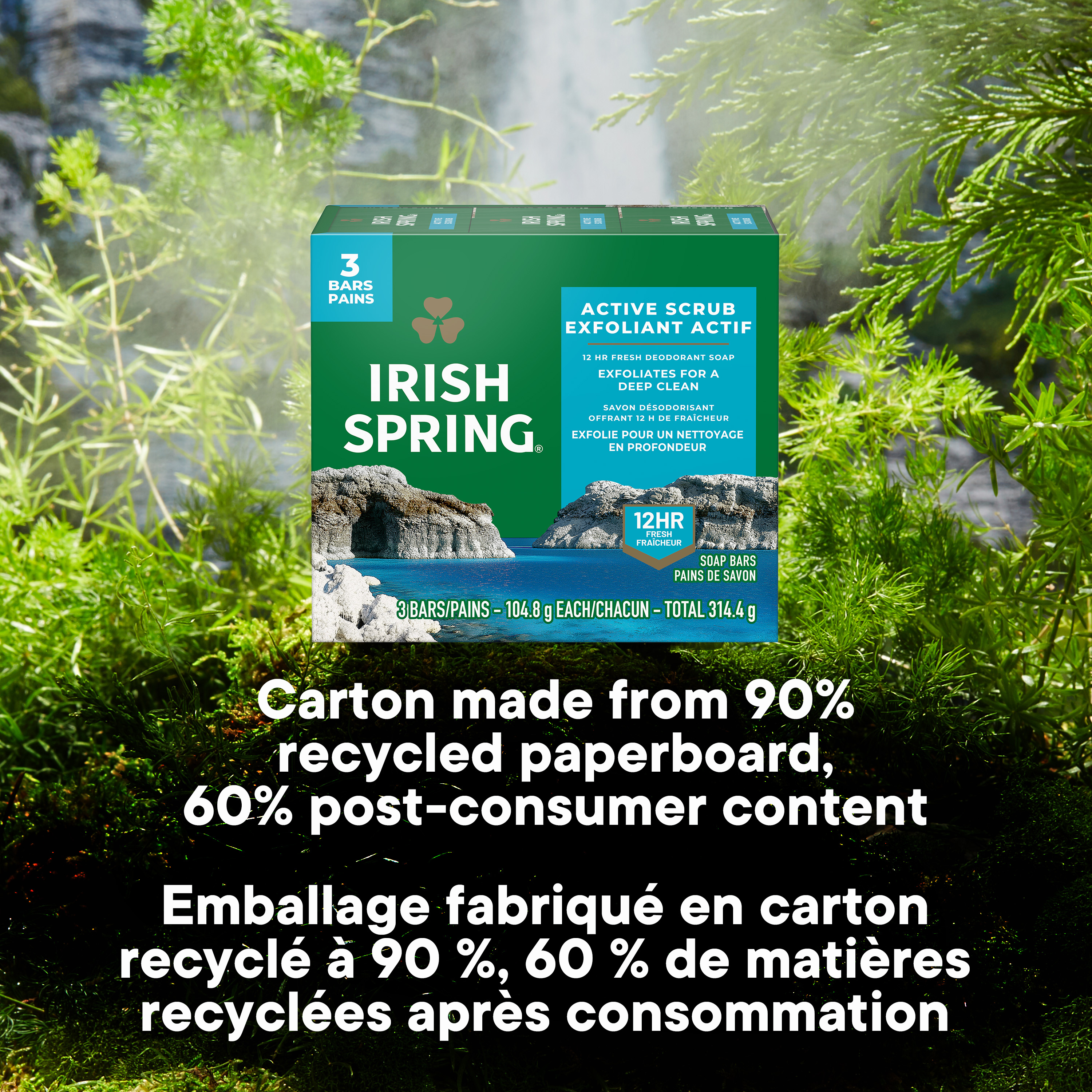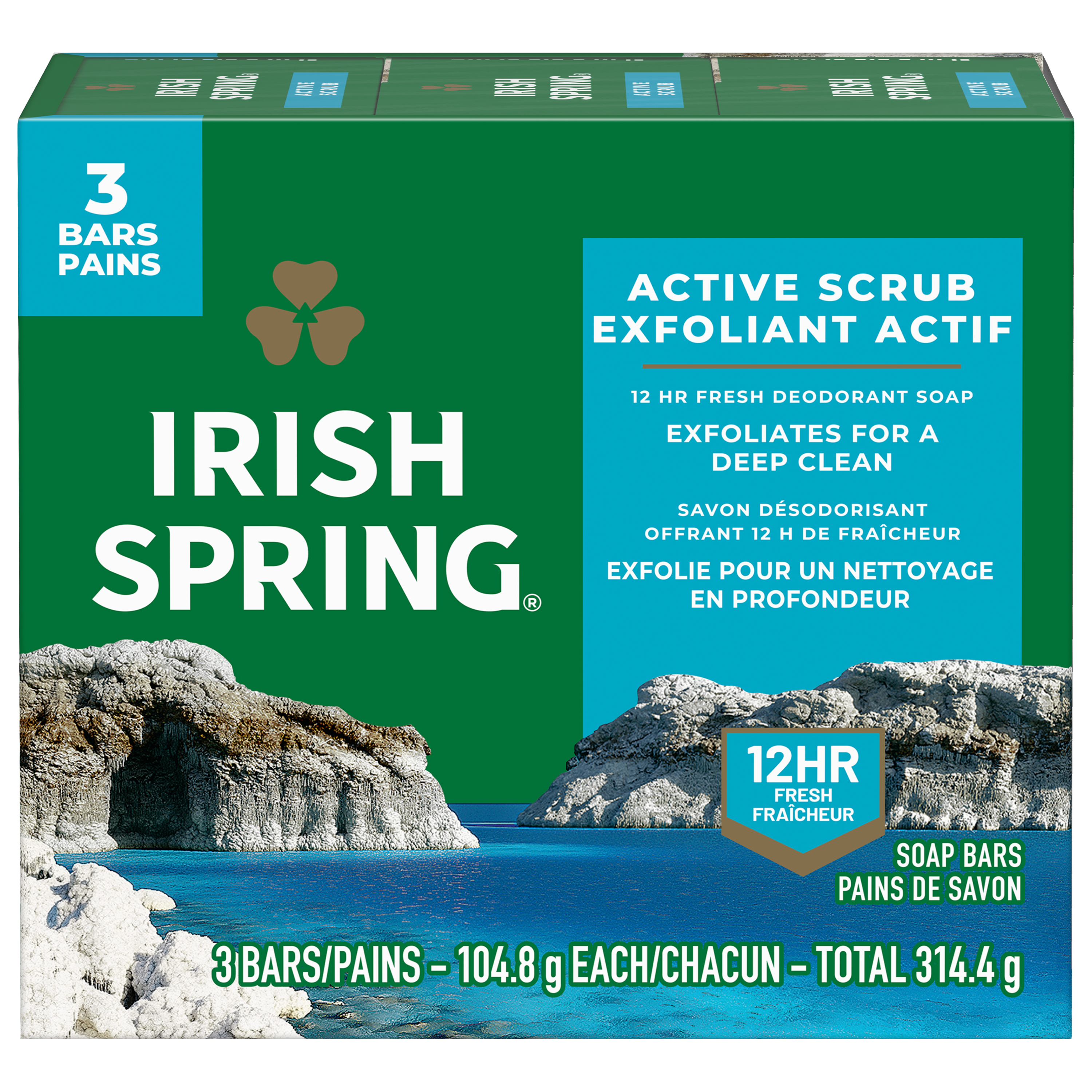 Pain de savon exfoliant Irish Spring Active Scrub pour homme, Avec huile de lin, Savon désodorisant offrant 12 heures de fraîcheur, Pain de 104,8 g (lot de 3)