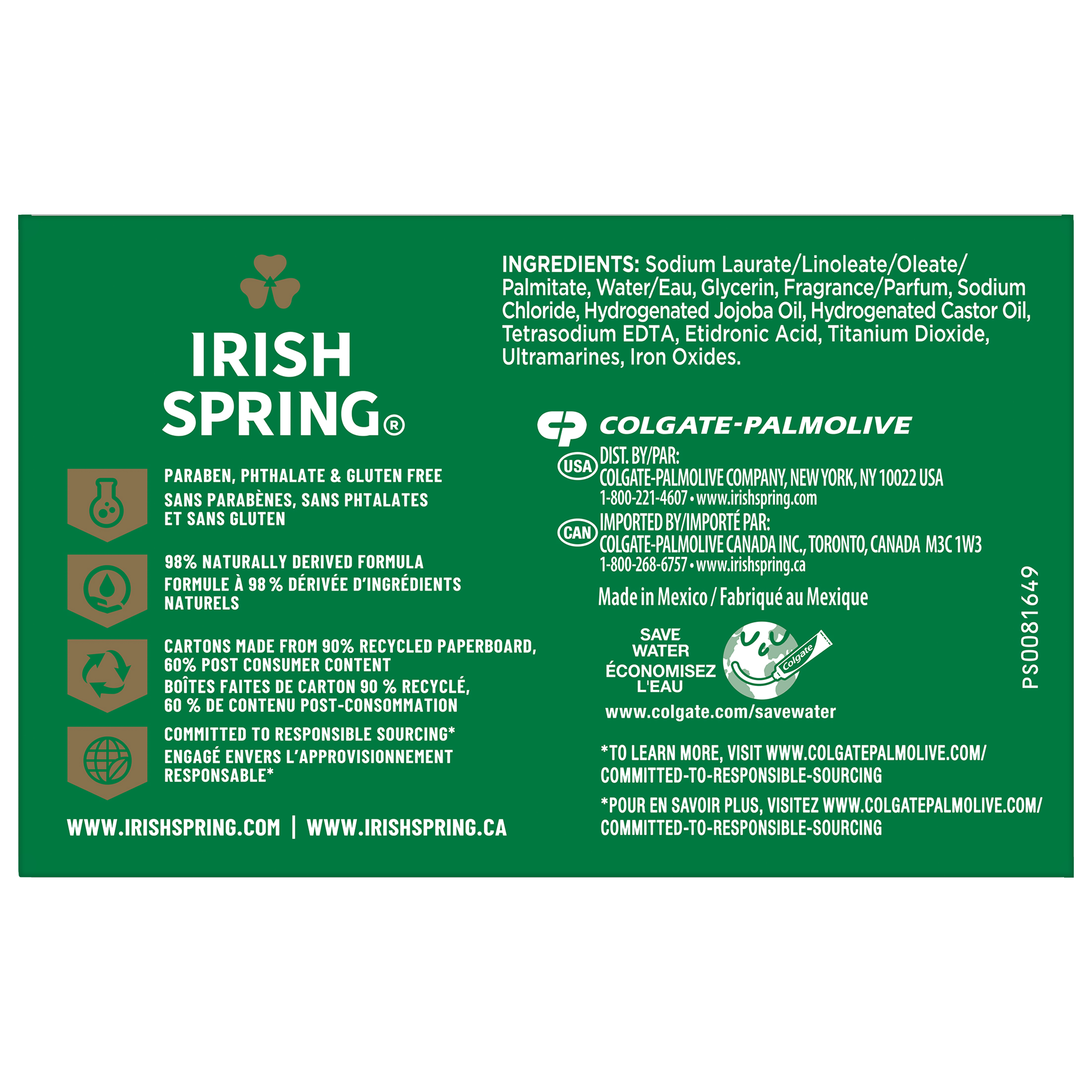 Product Title Pain de savon exfoliant Irish Spring Active Scrub pour homme, Avec huile de lin, Savon désodorisant offrant 12 heures de fraîcheur, Pain de 104,8 g (lot de 3) SKU 61013377 Consumer Unit - GTIN 00035000148940 Case - GTIN 10035000144253 Product Category Personal Care Product Sub Category Bar Soap Brand Irish Spring Product Sub Brand Irish Spring BS Consumer Unit Gross Weight 0.378 KG / 0.833 LB Consumer Unit Net Weight 0.314 KG / 0.692 LB Consumer Unit Length 63.000 MM / 2.480 IN Consumer Unit Width 116.000 MM / 4.567 IN Consumer Unit Height 101.000 MM / 3.976 IN Consumer Unit Volume 0.738 C8 / 0.026 CF Product Title Pain de savon exfoliant Irish Spring Active Scrub pour homme, Avec huile de lin, Savon désodorisant offrant 12 heures de fraîcheur, Pain de 104,8 g (lot de 3) Product Description Comptez sur le pain de savon Irish Spring Active Scrub pour laisser une sensation de propreté sur votre peau. Notre pain de savon désodorisant pour homme est composé à 98 % d’ingrédients d’origine naturelle. Il vous permet de rester frais pendant 12 heures et convient à tous les types de peau. Notre pain de savon mousse et peut être utilisé comme savon pour les mains ou comme nettoyant pour le visage. Ce pain de savon exfoliant convient à tous les types de peau, y compris les peaux normales, grasses et sèches, et garantit un nettoyage efficace. Il ne contient ni parabène, ni phtalate, ni gluten et contient de l’huile de lin. Ajoutez un peu d’aventure à votre vie quotidienne avec toute la gamme Irish Spring de gels douche et pains de savon pour hommes. Bullet 1 Contenu : Trois pains de 104,8 g de savon exfoliant Irish Spring Active Scrub pour homme Bullet 2 Savon exfoliant : Savon désodorisant offrant 12 heures de fraîcheur qui vous laisse une sensation de propreté Bullet 3 Utilisation polyvalente : Le pain de savon Irish Spring mousse et peut être utilisé comme savon pour les mains ou comme nettoyant pour le visage Bullet 4 Infusé d’huile de lin : Notre pain de savon à l’huile de lin aide à protéger la barrière d’hydratation de la peau Bullet 5 Ingrédients : formule à 98 % d'ingrédients d'origine naturelle, sans gluten, sans paraben et sans phtalates Bullet 6 Emballage durable : Carton fabriqué à partir de 90 % de carton recyclé, 60 % de contenu post-consommation OS Amazon Product Title Pain de savon exfoliant Irish Spring Active Scrub pour homme, Avec huile de lin, Savon désodorisant offrant 12 heures de fraîcheur, Pain de 104,8 g (lot de 3) OS Amazon Product Description Comptez sur le pain de savon Irish Spring Active Scrub pour laisser une sensation de propreté sur votre peau. Notre pain de savon désodorisant pour homme est composé à 98 % d’ingrédients d’origine naturelle. Il vous permet de rester frais pendant 12 heures et convient à tous les types de peau. Notre pain de savon mousse et peut être utilisé comme savon pour les mains ou comme nettoyant pour le visage. Ce pain de savon exfoliant convient à tous les types de peau, y compris les peaux normales, grasses et sèches, et garantit un nettoyage efficace. Il ne contient ni parabène, ni phtalate, ni gluten et contient de l’huile de lin. Ajoutez un peu d’aventure à votre vie quotidienne avec toute la gamme Irish Spring de gels douche et pains de savon pour hommes. OS Amazon Bullet 1 Contenu : Trois pains de 104,8 g de savon exfoliant Irish Spring Active Scrub pour homme OS Amazon Bullet 2 Savon exfoliant : Savon désodorisant offrant 12 heures de fraîcheur qui vous laisse une sensation de propreté OS Amazon Bullet 3 Utilisation polyvalente : Le pain de savon Irish Spring mousse et peut être utilisé comme savon pour les mains ou comme nettoyant pour le visage OS Amazon Bullet 4 Infusé d’huile de lin : Notre pain de savon à l’huile de lin aide à protéger la barrière d’hydratation de la peau OS Amazon Bullet 5 Ingrédients : formule à 98 % d'ingrédients d'origine naturelle, sans gluten, sans paraben et sans phtalates OS Amazon On Page Keywords hand soap, body wash, bar soap, bar soap for men, body washes, bar soap for, bar soap packs, exfoliating bar soap, mens bar soap, Deodorant Bar Soap OS Walmart Product Title Pain de savon exfoliant Irish Spring Active Scrub pour homme, Avec huile de lin, Pain de 104,8 g (lot de 3) OS Walmart Product Description Comptez sur le pain de savon Irish Spring Active Scrub pour laisser une sensation de propreté sur votre peau. Notre pain de savon désodorisant pour homme est composé à 98 % d’ingrédients d’origine naturelle. Il vous permet de rester frais pendant 12 heures et convient à tous les types de peau. Notre pain de savon mousse et peut être utilisé comme savon pour les mains ou comme nettoyant pour le visage. Ce pain de savon exfoliant convient à tous les types de peau, y compris les peaux normales, grasses et sèches, et garantit un nettoyage efficace. Il ne contient ni parabène, ni phtalate, ni gluten et contient de l’huile de lin. Ajoutez un peu d’aventure à votre vie quotidienne avec toute la gamme Irish Spring de gels douche et pains de savon pour hommes. OS Walmart Bullet 1 Contenu : Trois pains de 104,8 g de savon exfoliant Irish Spring Active Scrub pour homme OS Walmart Bullet 2 Savon exfoliant : Savon désodorisant offrant 12 heures de fraîcheur qui vous laisse une sensation de propreté OS Walmart Bullet 3 Utilisation polyvalente : Le pain de savon Irish Spring mousse et peut être utilisé comme savon pour les mains ou comme nettoyant pour le visage OS Walmart Bullet 4 Infusé d’huile de lin : Notre pain de savon à l’huile de lin aide à protéger la barrière d’hydratation de la peau OS Walmart Bullet 5 Ingrédients : formule à 98 % d'ingrédients d'origine naturelle, sans gluten, sans paraben et sans phtalates OS Walmart Bullet 6 Emballage durable : Carton fabriqué à partir de 90 % de carton recyclé, 60 % de contenu post-consommation OS Walmart Bullet 7 Sentez la fraîch