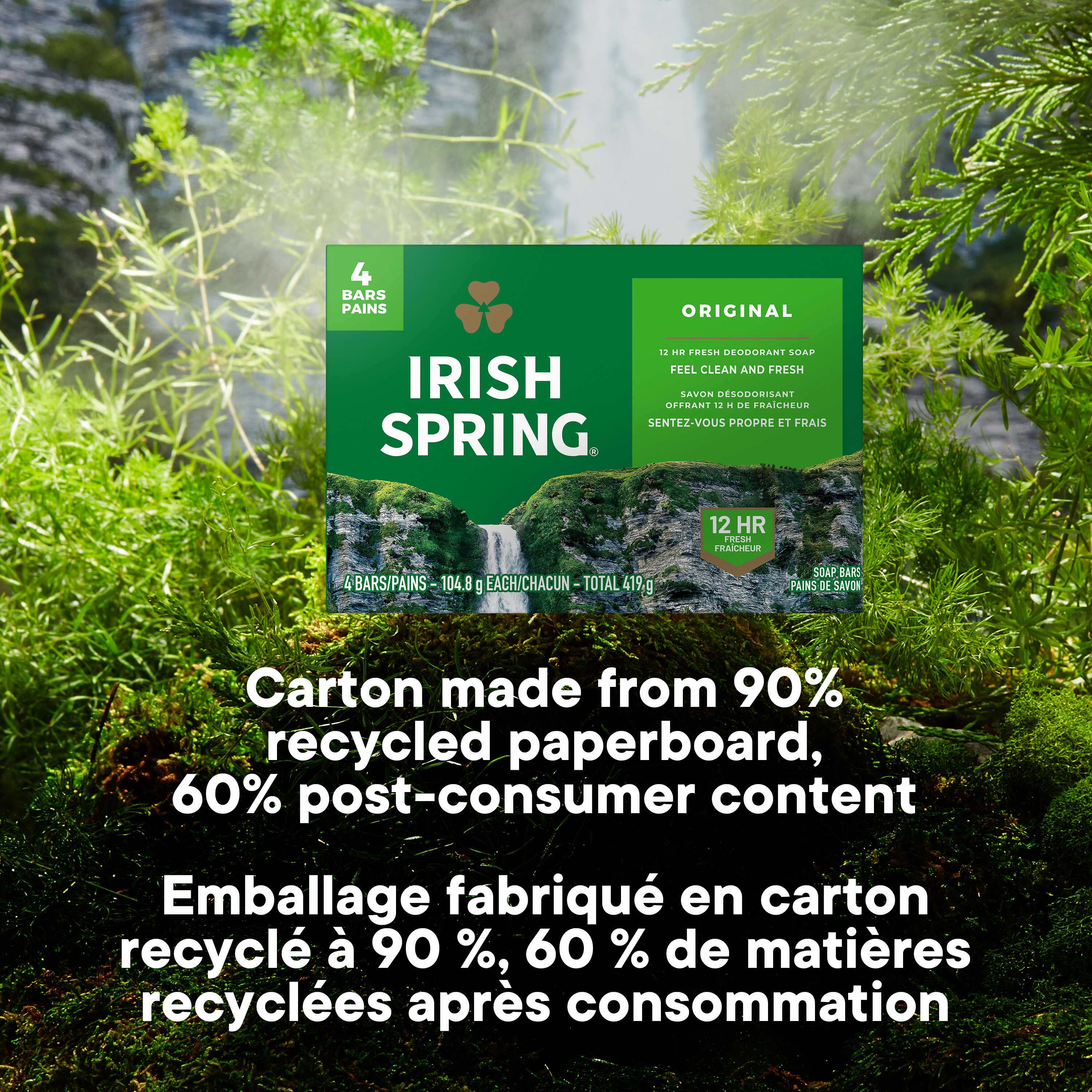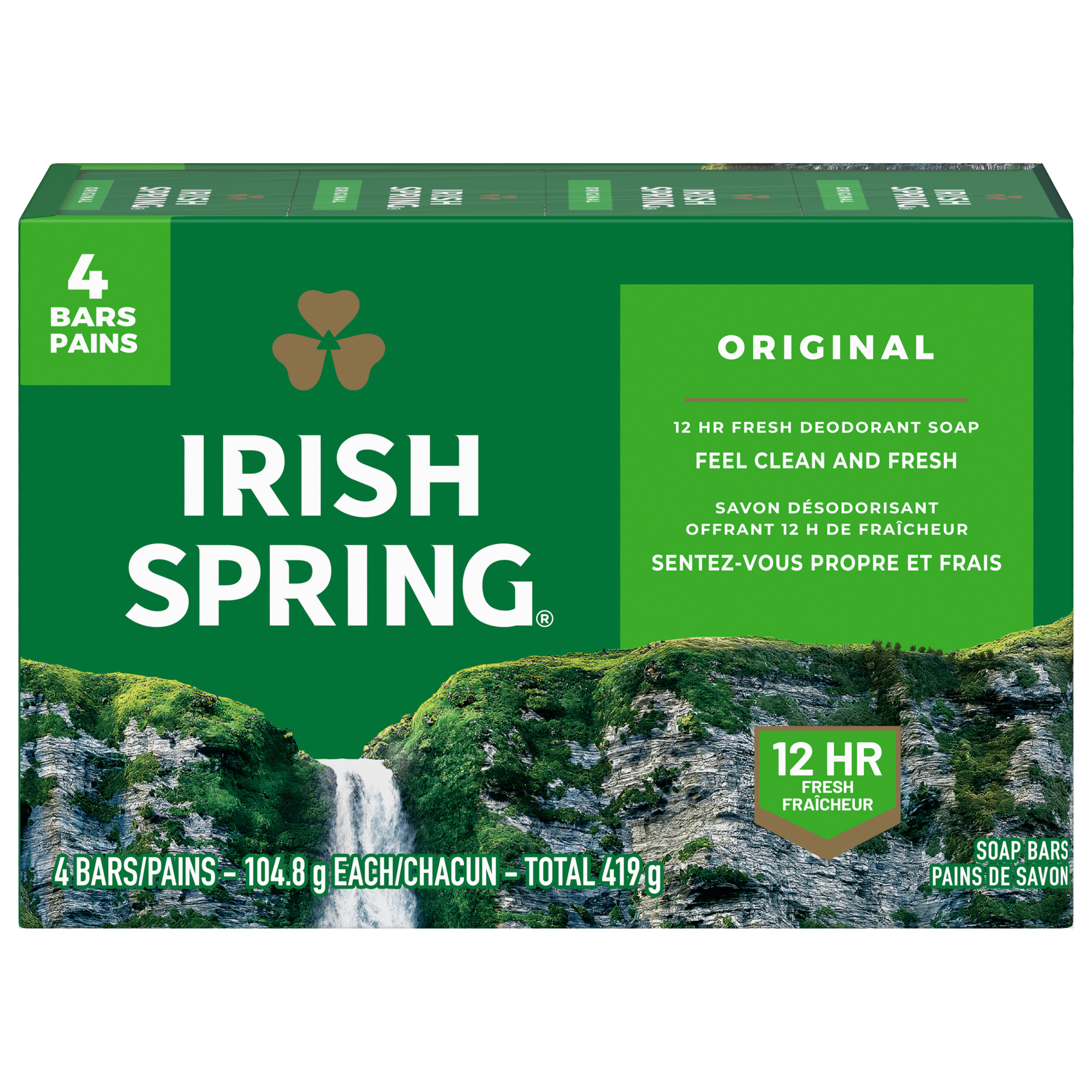 Pain de savon désodorisant Irish Spring Original pour homme, Avec huile de lin, Savon désodorisant offrant 12 heures de fraîcheur, Pain de 104,8 g (lot de 4)