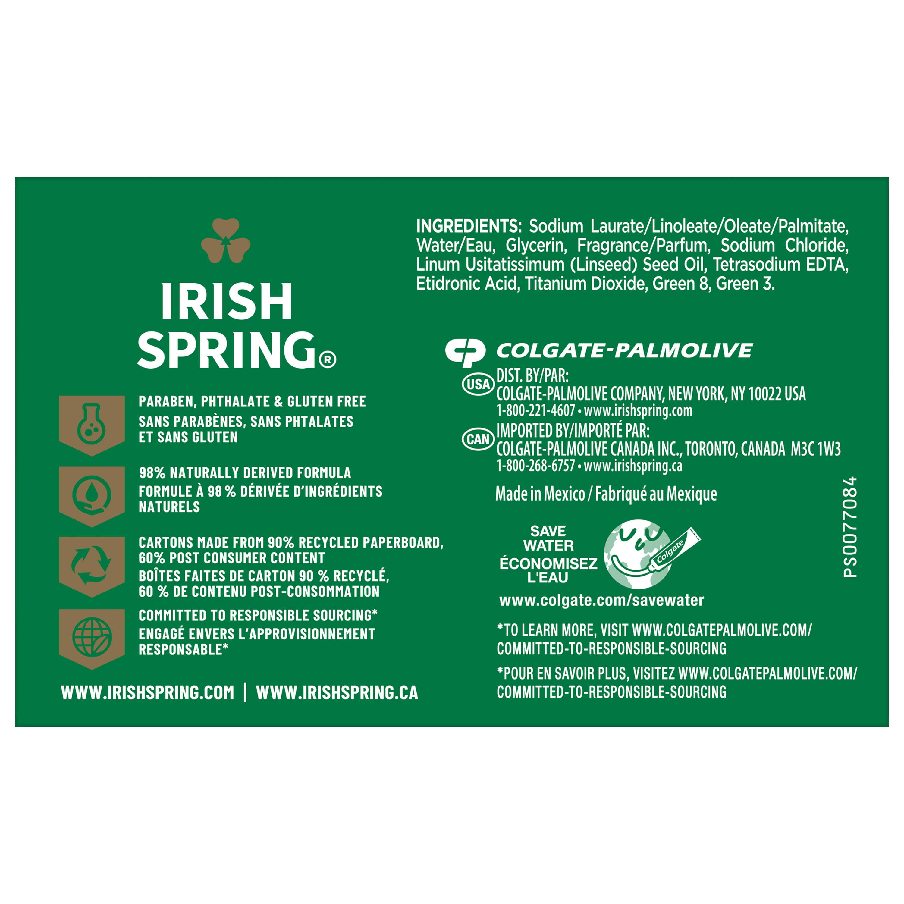 Product Title Pain de savon désodorisant Irish Spring Original pour homme, Avec huile de lin, Savon désodorisant offrant 12 heures de fraîcheur, Pain de 104,8 g (lot de 4) SKU 61018668 Consumer Unit - GTIN 00035000995636 Case - GTIN 10035000995633 Product Category Personal Care Product Sub Category Bar Soap Brand Irish Spring Product Sub Brand Irish Spring BS Consumer Unit Gross Weight 0.513 KG / 1.131 LB Consumer Unit Net Weight 0.420 KG / 0.926 LB Consumer Unit Length 38.000 MM / 1.496 IN Consumer Unit Width 100.000 MM / 3.937 IN Consumer Unit Height 62.000 MM / 2.441 IN Consumer Unit Volume 0.236 C8 / 0.008 CF Product Title Pain de savon désodorisant Irish Spring Original pour homme, Avec huile de lin, Savon désodorisant offrant 12 heures de fraîcheur, Pain de 104,8 g (lot de 4) Product Description Comptez sur le pain de savon Irish Spring Original pour laisser sur votre peau une sensation propre et fraîche. Notre pain de savon désodorisant pour homme est composé à 98 % d’ingrédients d’origine naturelle. Il vous permet de rester frais pendant 12 heures et convient à tous les types de peau. Le pain de savon Irish Spring Original peut être utilisé comme savon pour les mains ou comme nettoyant pour le visage. Ce pain de savon convient à tous les types de peau, y compris les peaux normales, grasses et sèches, et garantit un nettoyage efficace. Il ne contient ni parabène, ni phtalate, ni gluten et contient de l’huile de lin. Ajoutez un peu d’aventure à votre vie quotidienne avec toute la gamme Irish Spring de gels douche et pains de savon pour homme. Bullet 1 Contenu : Quatre pains de 104,8 g de savon désodorisant Irish Spring Original pour homme Bullet 2 Savon désodorisant : Notre pain de savon laisse une sensation de propreté sur votre peau Bullet 3 Utilisation polyvalente : Le pain de savon Irish Spring peut être utilisé comme savon pour les mains ou comme nettoyant pour le visage Bullet 4 Infusé d’huile de lin : Ce pain de savon est fabriqué avec de l’huile de lin Bullet 5 Ingrédients naturels : formule à 98 % d'ingrédients d'origine naturelle, sans gluten, sans paraben et sans phtalates Bullet 6 Emballage durable : Carton fabriqué à partir de 90 % de carton recyclé, 60 % de contenu post-consommation OS Amazon Product Title Pain de savon désodorisant Irish Spring Original pour homme, Avec huile de lin, Savon désodorisant offrant 12 heures de fraîcheur, Pain de 104,8 g (lot de 4) OS Amazon Product Description Comptez sur le pain de savon Irish Spring Original pour laisser sur votre peau une sensation propre et fraîche. Notre pain de savon désodorisant pour homme est composé à 98 % d’ingrédients d’origine naturelle. Il vous permet de rester frais pendant 12 heures et convient à tous les types de peau. Le pain de savon Irish Spring Original peut être utilisé comme savon pour les mains ou comme nettoyant pour le visage. Ce pain de savon convient à tous les types de peau, y compris les peaux normales, grasses et sèches, et garantit un nettoyage efficace. Il ne contient ni parabène, ni phtalate, ni gluten et contient de l’huile de lin. Ajoutez un peu d’aventure à votre vie quotidienne avec toute la gamme Irish Spring de gels douche et pains de savon pour homme. OS Amazon Bullet 1 Contenu : Quatre pains de 104,8 g de savon désodorisant Irish Spring Original pour homme OS Amazon Bullet 2 Savon désodorisant : Notre pain de savon laisse une sensation de propreté sur votre peau OS Amazon Bullet 3 Utilisation polyvalente : Le pain de savon Irish Spring peut être utilisé comme savon pour les mains ou comme nettoyant pour le visage OS Amazon Bullet 4 Infusé d’huile de lin : Ce pain de savon est fabriqué avec de l’huile de lin OS Amazon Bullet 5 Ingrédients naturels : formule à 98 % d'ingrédients d'origine naturelle, sans gluten, sans paraben et sans phtalates OS Walmart Product Title Pain de savon désodorisant Irish Spring Original pour homme, Avec huile de lin, Pain de 104,8 g (lot de 4) OS Walmart Product Description Comptez sur le pain de savon Irish Spring Original pour laisser sur votre peau une sensation propre et fraîche. Notre pain de savon désodorisant pour homme est composé à 98 % d’ingrédients d’origine naturelle. Il vous permet de rester frais pendant 12 heures et convient à tous les types de peau. Le pain de savon Irish Spring Original peut être utilisé comme savon pour les mains ou comme nettoyant pour le visage. Ce pain de savon convient à tous les types de peau, y compris les peaux normales, grasses et sèches, et garantit un nettoyage efficace. Il ne contient ni parabène, ni phtalate, ni gluten et contient de l’huile de lin. Ajoutez un peu d’aventure à votre vie quotidienne avec toute la gamme Irish Spring de gels douche et pains de savon pour homme. OS Walmart Bullet 1 Contenu : Quatre pains de 104,8 g de savon désodorisant Irish Spring Original pour homme OS Walmart Bullet 2 Savon désodorisant : Notre pain de savon laisse une sensation de propreté sur votre peau OS Walmart Bullet 3 Utilisation polyvalente : Le pain de savon Irish Spring peut être utilisé comme savon pour les mains ou comme nettoyant pour le visage OS Walmart Bullet 4 Infusé d’huile de lin : Ce pain de savon est fabriqué avec de l’huile de lin OS Walmart Bullet 5 Ingrédients naturels : formule à 98 % d'ingrédients d'origine naturelle, sans gluten, sans paraben et sans phtalates OS Walmart Bullet 6 Emballage durable : Carton fabriqué à partir de 90 % de carton recyclé, 60 % de contenu post-consommation OS Walmart Bullet 7 Parfum rafraîchissant : Cette fraîcheur extérieure? Nous l’apportons au creux de votre main Walmart Bullet 1 What’s Included: Four 3.7 oz soap bars of Irish Spring Original Deodorant Bar Soap for Men Walmart Bullet 2 Deodorant Soap: Our bar soap leaves your skin feeling clean Walmart Bullet 3 Versatile Use: Irish Spring bar soap can be used as a hand soap or a face wash Walmar
