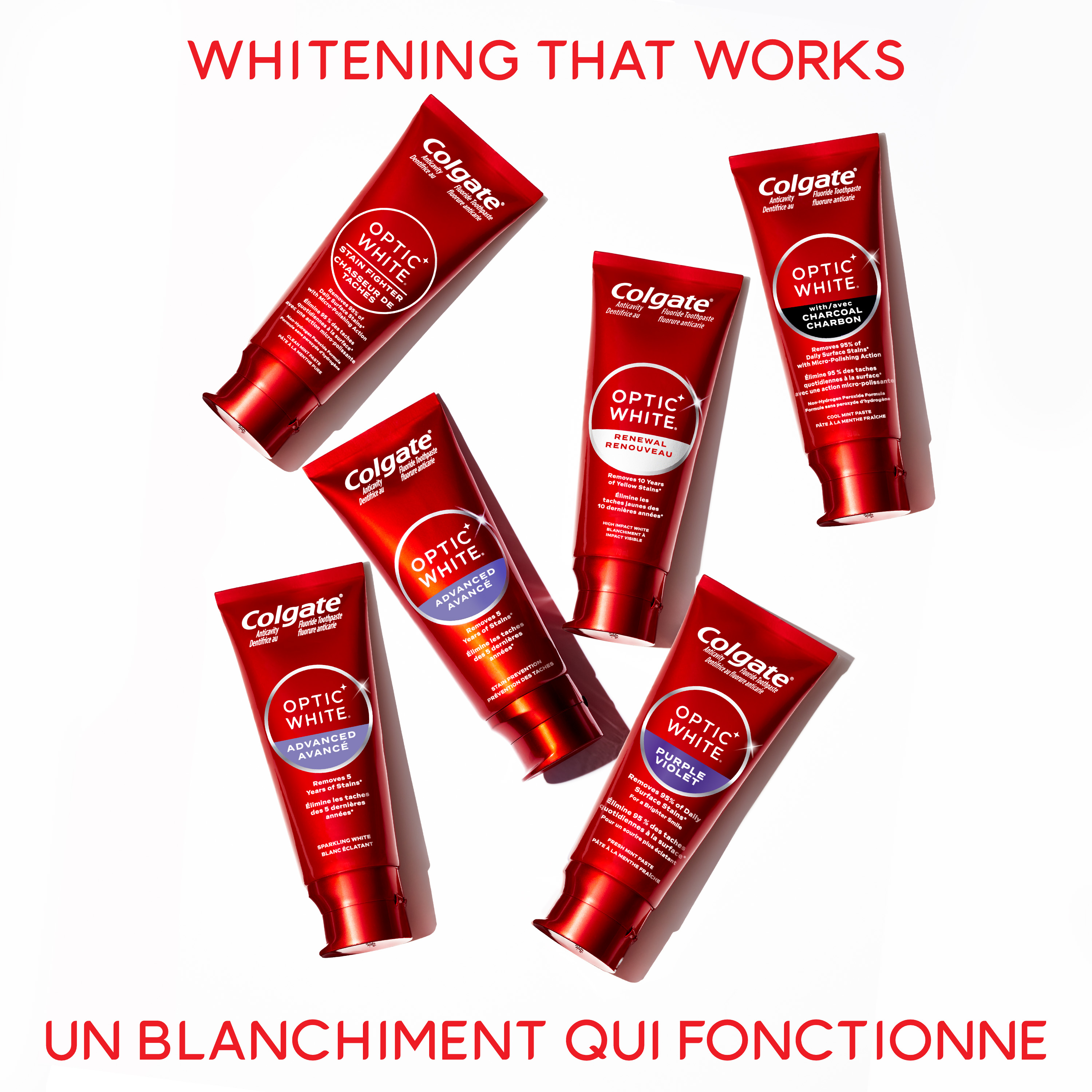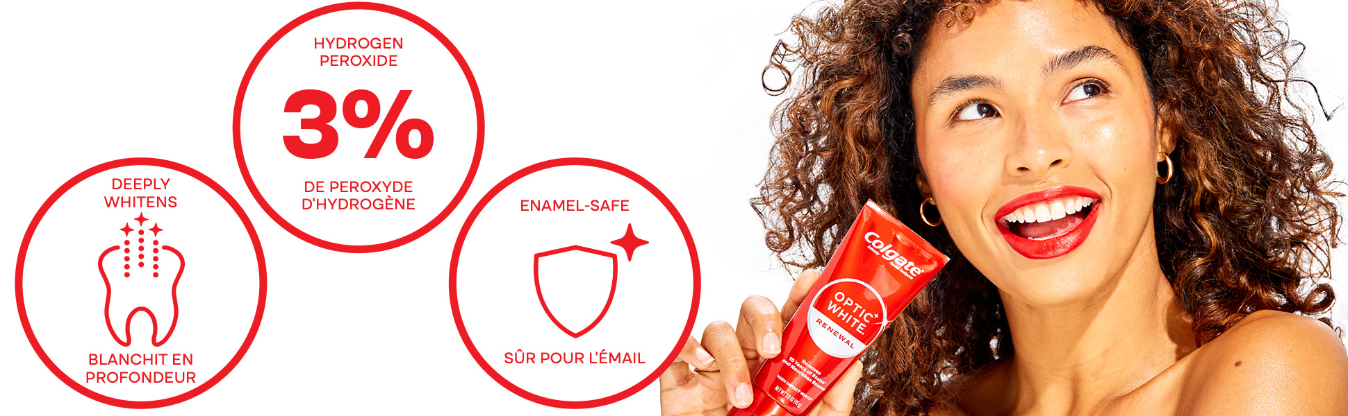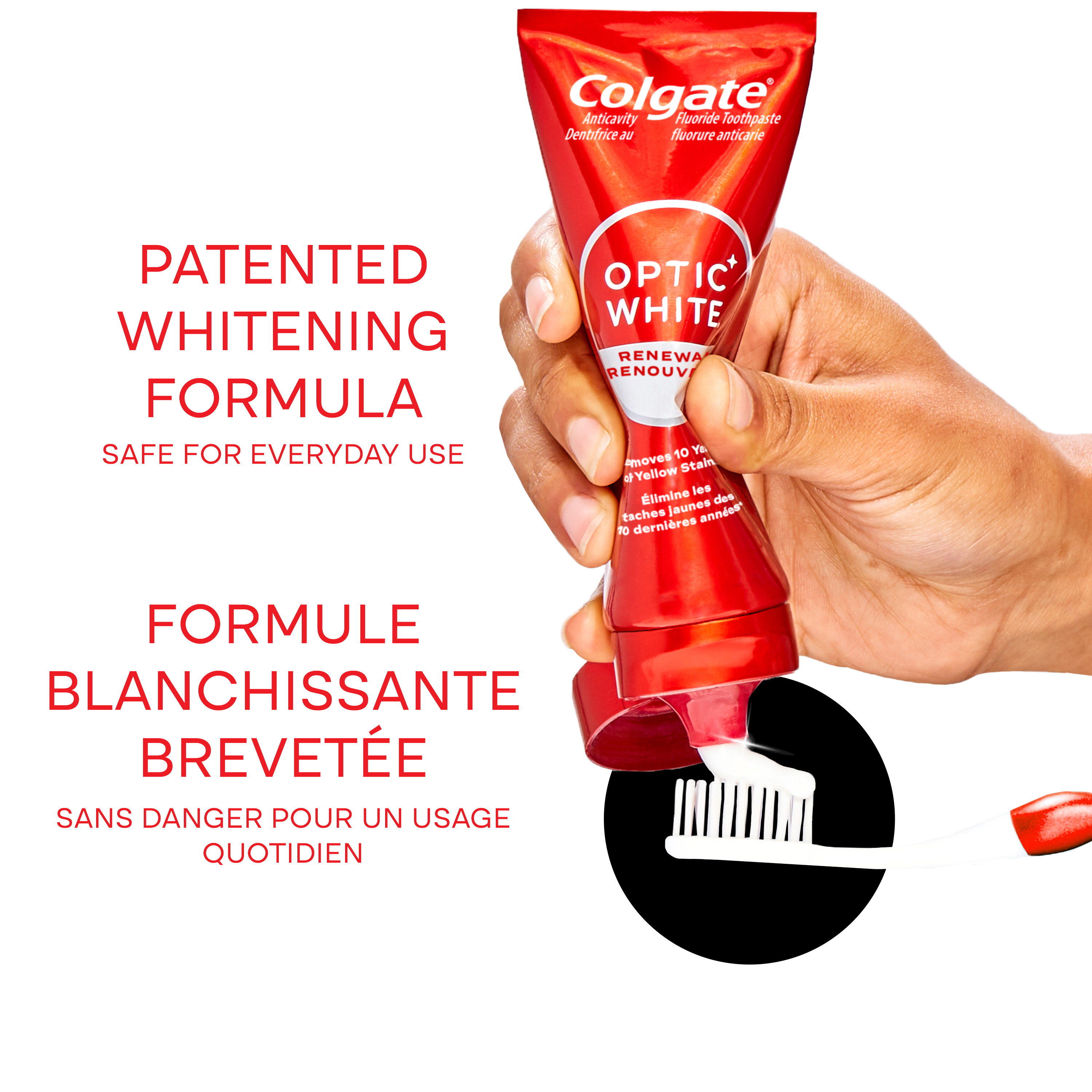 Product Title Dentifrice blanchissant Colgate Optic White Renewal avec 3 % de peroxyde d’hydrogène, dentifrice anti-caries blanchissant à fort impact avec du fluorure, lot de 2, 70 ml SKU 61019183 SKU eCommerce Name TP OW Renewal High Impact 70ml 2pk Consumer Unit - GTIN 00035000996268 Case - GTIN 10035000996265 Product Category Oral Care Product Sub Category Toothpaste Brand Colgate Product Sub Brand Colgate Optic White TP Consumer Unit Gross Weight 0.222 KG / 0.490 LB Consumer Unit Net Weight 0.171 KG / 0.377 LB Consumer Unit Length 41.000 MM / 1.614 IN Consumer Unit Width 159.000 MM / 6.260 IN Consumer Unit Height 99.000 MM / 3.898 IN Consumer Unit Volume 0.645 C8 / 0.023 CF Product Title Dentifrice blanchissant Colgate Optic White Renewal avec 3 % de peroxyde d’hydrogène, dentifrice anti-caries blanchissant à fort impact avec du fluorure, lot de 2, 70 ml Product Description Alimenté par le complexe HP, notre formule blanchissante à base de peroxyde d’hydrogène, le dentifrice Colgate Optic White Renewal élimine 10 ans de taches incrustées pour des dents visiblement plus blanches*. Ce lot de deux dentifrices utilise une formule de blanchiment cliniquement prouvée, qui contient du peroxyde d’hydrogène, le même ingrédient de blanchiment utilisé par les dentistes. Pour ceux qui souhaitent obtenir des dents visiblement plus blanches* sans sensibilité dentaire, ce dentifrice blanchissant à fort impact élimine les taches incrustées sans affaiblir l’émail. Le dentifrice Colgate Optic White Renewal est un dentifrice au fluorure anti-caries qui blanchit les dents avec du peroxyde d’hydrogène à 3 %. Contrairement à la plupart des dentifrices blanchissants** qui ne s’attaquent qu’aux taches en surface, la formule blanchissante double action du dentifrice Colgate Optic White, avec le complexe HP, se diffuse doucement sous la surface des dents pour éliminer les taches incrustées, tandis que les micro-polisseurs brossent la surface pour la nettoyer. Grâce à son action profondément oxygénante, le dentifrice Colgate Optic White Renewal élimine en douceur les taches accumulées au fil des années. Ce lot de deux tubes de dentifrice élimine les taches incrustées sans affaiblir l’émail ni provoquer de sensibilité. En effet, ce dentifrice blanchissant à fort impact au fluorure contribue à protéger l’émail tout en éliminant les taches. Obtenez des dents visiblement plus blanches* sans sensibilité dentaire. * avec un brossage des dents deux fois par jour pendant 4 semaines ** sans peroxyde d’hydrogène Bullet 1 Deux tubes de 70 ml de dentifrice Colgate Optic White Renewal Bullet 2 Le dentifrice Colgate Optic White Renewal élimine les taches incrustées depuis 10 ans* grâce à sa teneur en peroxyde d’hydrogène à 3 % (* lors d’un brossage deux fois par jour pendant 4 semaines) Bullet 3 Notre formule exclusive de blanchiment avec le complexe HP contient du peroxyde d’hydrogène pour un blanchiment en profondeur au-delà des taches en surface Bullet 4 Ce lot de deux dentifrices est sans danger pour l’émail et convient à un usage quotidien. Il élimine les taches incrustées sans affaiblir l’émail* (* lorsqu’il est utilisé deux fois par jour pendant 4 semaines) Bullet 5 Obtenez des dents visiblement plus blanches* sans sensibilité dentaire (* avec une utilisation continue) Bullet 6 Son action oxygénante en profondeur élimine en douceur les taches accumulées au fil des années* (* avec une utilisation quotidienne) OS Amazon Product Title Dentifrice blanchissant Colgate Optic White Renewal avec 3 % de peroxyde d’hydrogène, lot de 2, dentifrice anti-caries blanchissant à fort impact avec du fluorure, 70 ml OS Amazon Product Description Alimenté par le complexe HP, notre formule blanchissante à base de peroxyde d’hydrogène, le dentifrice Colgate Optic White Renewal élimine 10 ans de taches incrustées pour des dents visiblement plus blanches*. Ce lot de deux dentifrices utilise une formule de blanchiment cliniquement prouvée, qui contient du peroxyde d’hydrogène, le même ingrédient de blanchiment utilisé par les dentistes. Pour ceux qui souhaitent obtenir des dents visiblement plus blanches* sans sensibilité dentaire, ce dentifrice blanchissant à fort impact élimine les taches incrustées sans affaiblir l’émail. Le dentifrice Colgate Optic White Renewal est un dentifrice au fluorure anti-caries qui blanchit les dents avec du peroxyde d’hydrogène à 3 %. Contrairement à la plupart des dentifrices blanchissants** qui ne s’attaquent qu’aux taches en surface, la formule blanchissante double action du dentifrice Colgate Optic White, avec le complexe HP, se diffuse doucement sous la surface des dents pour éliminer les taches incrustées, tandis que les micro-polisseurs brossent la surface pour la nettoyer. Grâce à son action profondément oxygénante, le dentifrice Colgate Optic White Renewal élimine en douceur les taches accumulées au fil des années. Ce lot de deux tubes de dentifrice élimine les taches incrustées sans affaiblir l’émail ni provoquer de sensibilité. En effet, ce dentifrice blanchissant à fort impact au fluorure contribue à protéger l’émail tout en éliminant les taches. Obtenez des dents visiblement plus blanches* sans sensibilité dentaire. * avec un brossage des dents deux fois par jour pendant 4 semaines ** sans peroxyde d’hydrogène OS Amazon Bullet 1 CONTENU : Un tube de 70 ml de dentifrice Colgate Optic White Renewal OS Amazon Bullet 2 ÉLIMINE LES TACHES EN PROFONDEUR : Le dentifrice Colgate Optic White Renewal élimine les taches incrustées depuis 10 ans* (* lors d’un brossage deux fois par jour pendant 4 semaines) OS Amazon Bullet 3 PEROXYDE D’HYDROGÈNE À 3 % : Notre formule exclusive de blanchiment avec le complexe HP est alimentée par du peroxyde d’hydrogène - le même ingrédient de blanchiment utilisé par les dentistes - pour blanchir en profondeu