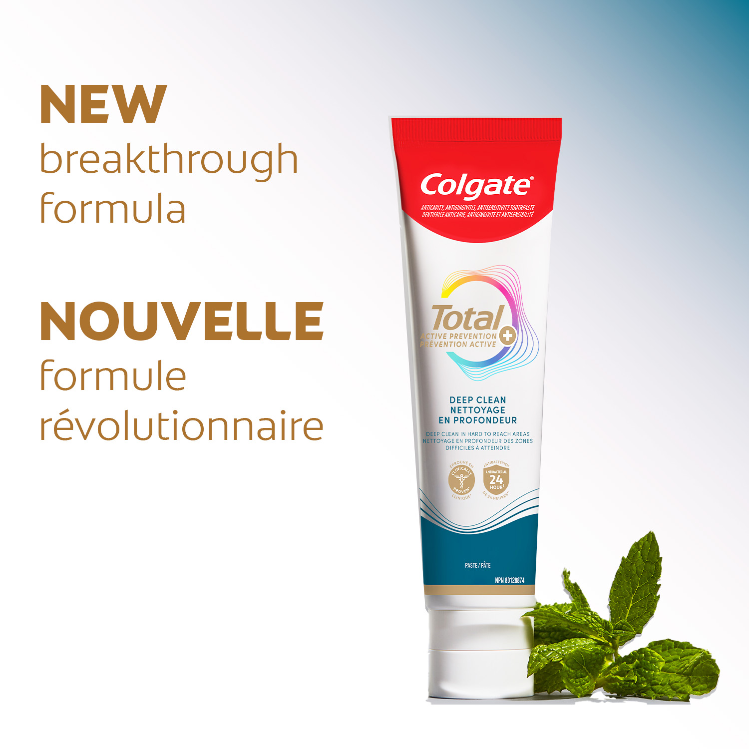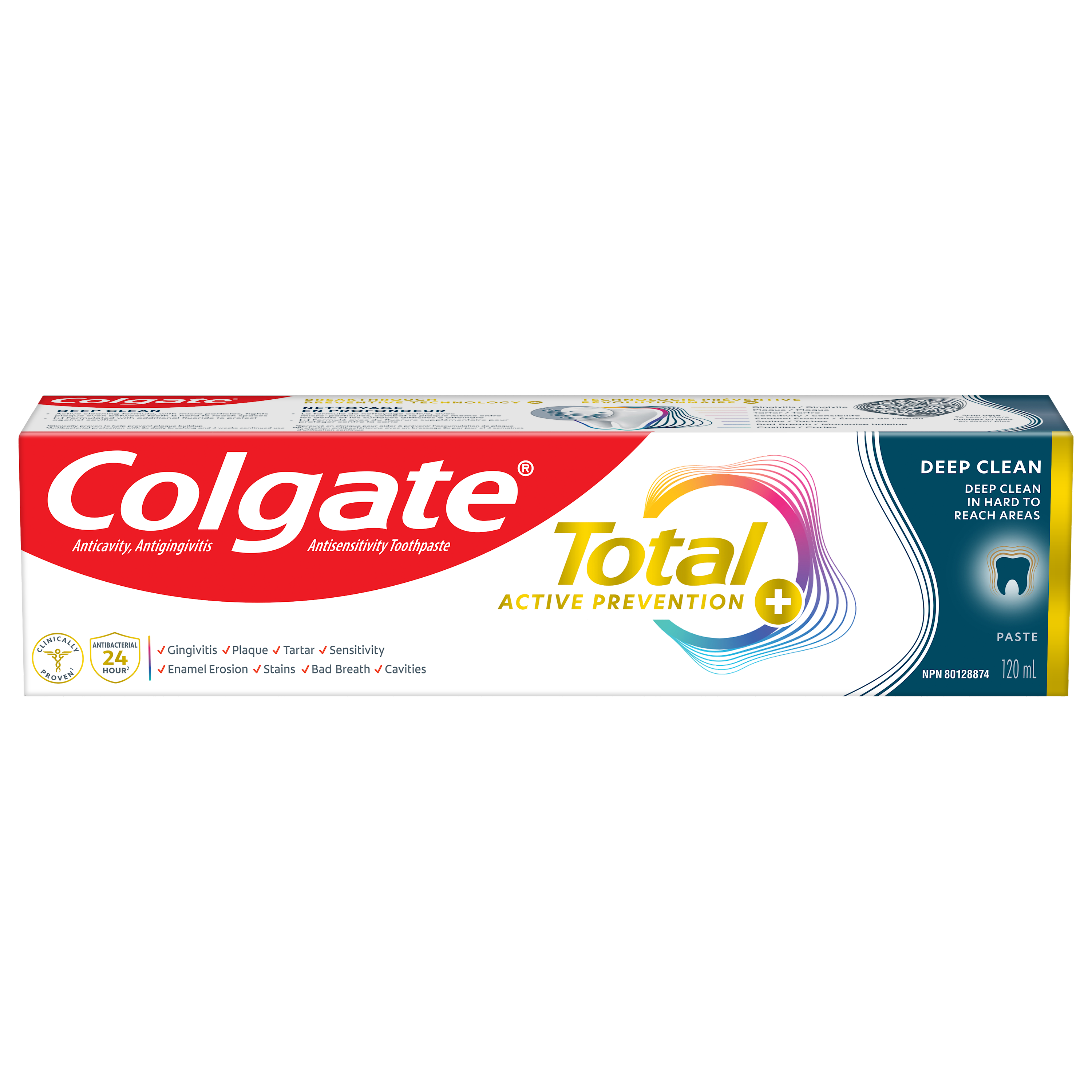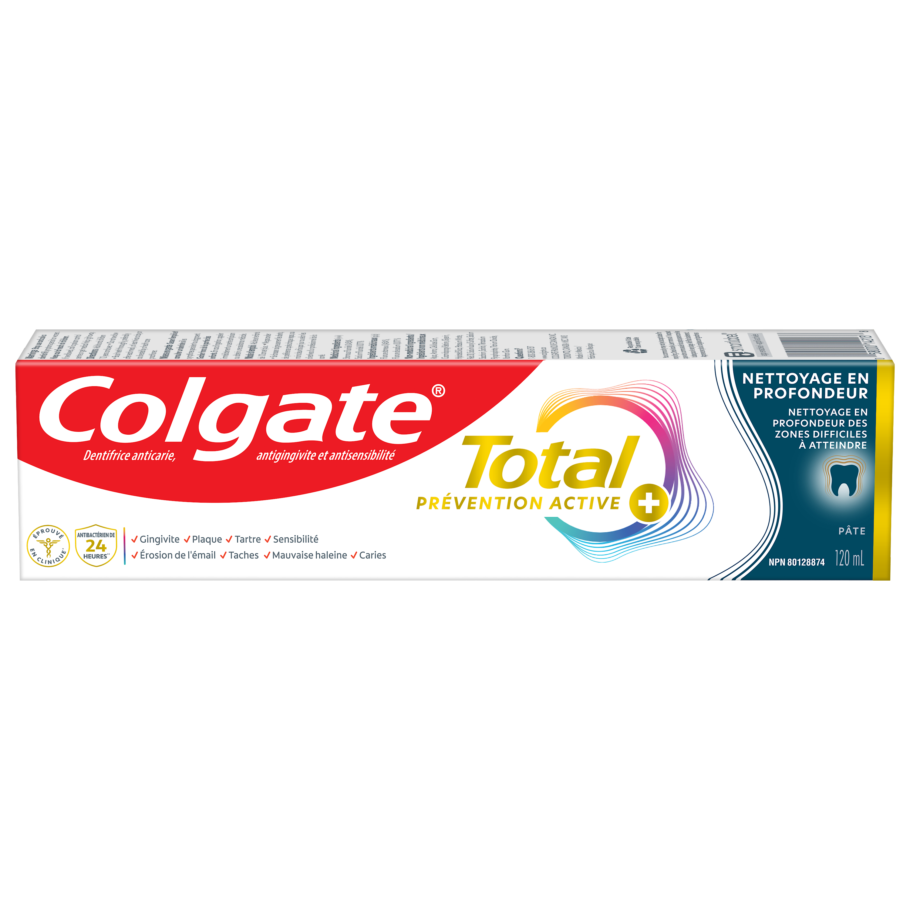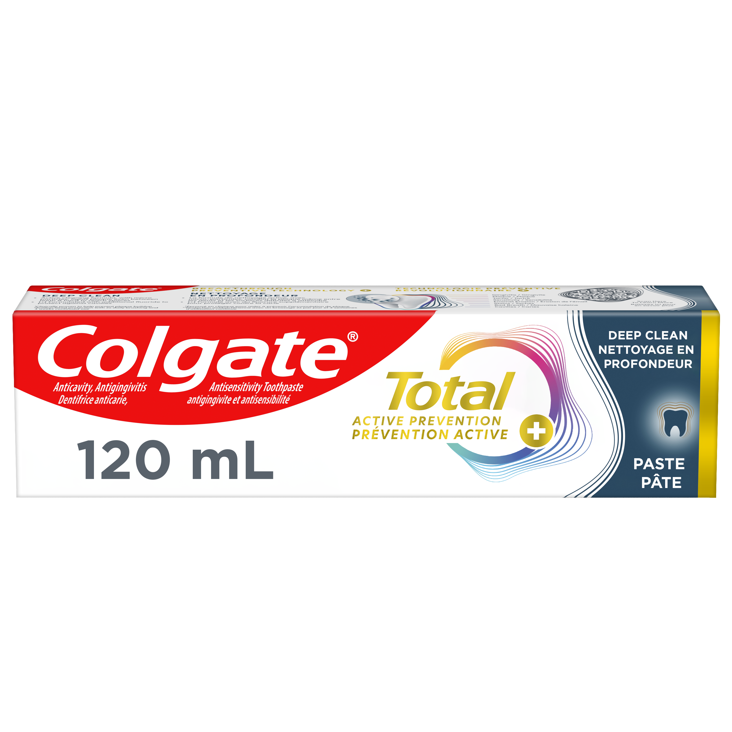 Product Title Dentifrice Colgate Total Prévention active plus Nettoyage en profondeur, saveur de menthe, 120 mL SKU 61044255 SKU eCommerce Name Dentifrice Colgate Total Prévention active plus Nettoyage en profondeur, saveur de menthe, 120 mL Consumer Unit - GTIN 00058000142138 Case - GTIN 10058000142135 Product Category Oral Care Product Sub Category Toothpaste Brand Colgate Product Sub Brand Colgate Total TP Consumer Unit Gross Weight 0.187 KG / 0.412 LB Consumer Unit Net Weight 0.158 KG / 0.348 LB Consumer Unit Length 41.000 MM / 1.614 IN Consumer Unit Width 196.000 MM / 7.717 IN Consumer Unit Height 50.000 MM / 1.969 IN Consumer Unit Volume 0.402 C8 / 0.014 CF Product Title Dentifrice Colgate Total Prévention active plus Nettoyage en profondeur, saveur de menthe, 120 mL eCommerce Copy <bulletlist><bullet>Comprend un (1) tube de 120 mL de dentifrice Colgate Total Prévention active plus Nettoyage en profondeur</bullet> <bullet>Ce dentifrice à la menthe qui nettoie en profondeur est doté d’une formule de nettoyage active avec des micro-particules pour aider à combattre la plaque entre les dents et dans les surfaces difficiles à atteindre</bullet> <bullet>Le nouveau Colgate Total combat la cause à l’origine des problèmes de santé buccodentaire courants comme la carie, la gingivite, la plaque, l'érosion de l'émail, la sensibilité et le tartre</bullet> <bullet>Ce dentifrice au fluorure conçu par des experts est formulé avec du fluorure supplémentaire pour protéger contre la carie</bullet> <bullet>Aidez à prévenir les problèmes de soins buccodentaires courants* avant qu’ils ne surviennent avec ce dentifrice qui nettoie en profondeur (*comme la carie et la gingivite)</bullet> <bullet>Prévention proactive contre la carie, la sensibilité, la plaque, le tartre, la gingivite</bullet> </bulletlist> eCommerce Copy- Long Description Dentifrice Colgate Total Prévention active plus Nettoyage en profondeur, 120 mL