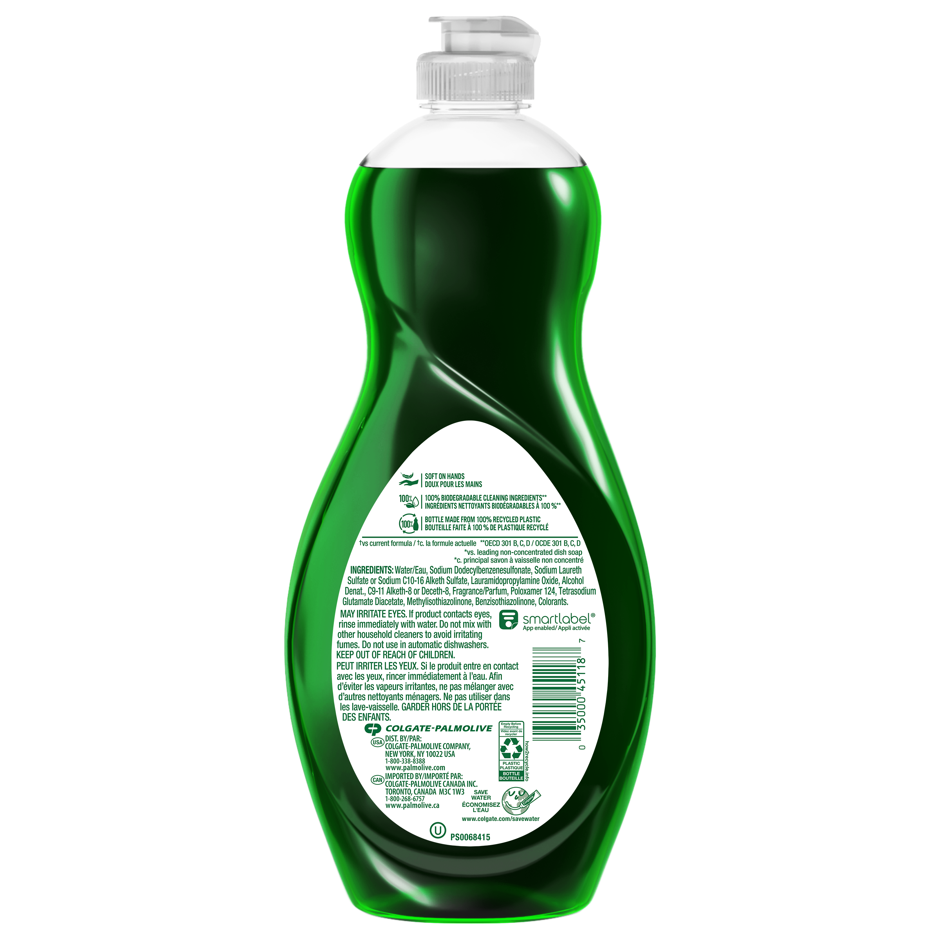 Product Title POL ULT 20F/591ML CS SP ORIGINAL SKU 61046296 SKU eCommerce Name Savon à vaisselle liquide Palmolive Ultra Strength, Original vert - 591 mL Consumer Unit - GTIN 00035000451187 Case - GTIN 10035000451184 Product Category Home Care Product Sub Category Dish Hand Brand Palmolive Product Sub Brand Palmolive Ultra HD Consumer Unit Gross Weight 0.652 KG / 1.438 LB Consumer Unit Net Weight 0.613 KG / 1.352 LB Consumer Unit Length 50.000 MM / 1.969 IN Consumer Unit Width 105.000 MM / 4.134 IN Consumer Unit Height 244.000 MM / 9.606 IN Consumer Unit Volume 1.341 C8 / 0.047 CF Product Title POL ULT 20F/591ML CS SP ORIGINAL Product Description Le liquide vaisselle Palmolive Ultra Strength est le liquide vaisselle vert signature et le liquide vaisselle de confiance pour tous les foyers. Ce liquide vaisselle dégage un parfum frais et offre un pouvoir nettoyant supérieur ; il élimine 99,9 % des graisses et 99,9 % des résidus alimentaires collants, ce qui en fait un liquide vaisselle très efficace pour éliminer les résidus alimentaires. Il agit par contact pour éliminer la graisse et la saleté. Sans trempage nécessaire, cette formule de liquide vaisselle sans trempage vous permet de réaliser le travail en une seule fois. Il s’agit d’un liquide vaisselle sans parabènes et sans phtalates, parfait pour les familles et la vaisselle quotidienne. Grâce à sa polyvalence en tant que nettoyant, vous pouvez l’utiliser comme nettoyant pour grillades, nettoyant pour pneus de voiture, ou comme détachant de prétraitement pour le linge, en plus de la vaisselle, des verres, des casseroles, des poêles et de la plupart des ustensiles de cuisine. Il est également puissant sur les plastiques, garantissant que même vos récipients en plastique, vos boîtes à lunch et vos couvercles de rangement en ressortent étincelants de propreté. Le liquide vaisselle Palmolive Ultra Strength est la solution pour tous vos besoins de nettoyage de la cuisine. eCommerce Copy Le savon à vaisselle liquide concentré Palmolive Ultra Strength est le dégraisseur original que vous connaissez et auquel vous faites confiance depuis plus 50 ans. Notre formule principale verte déloge instantanément la graisse et fonctionne de 10 façons pour combattre la graisse dans votre cuisine et plus encore. eCommerce Copy- Long Description L’authentique : Palmolive Original vert.